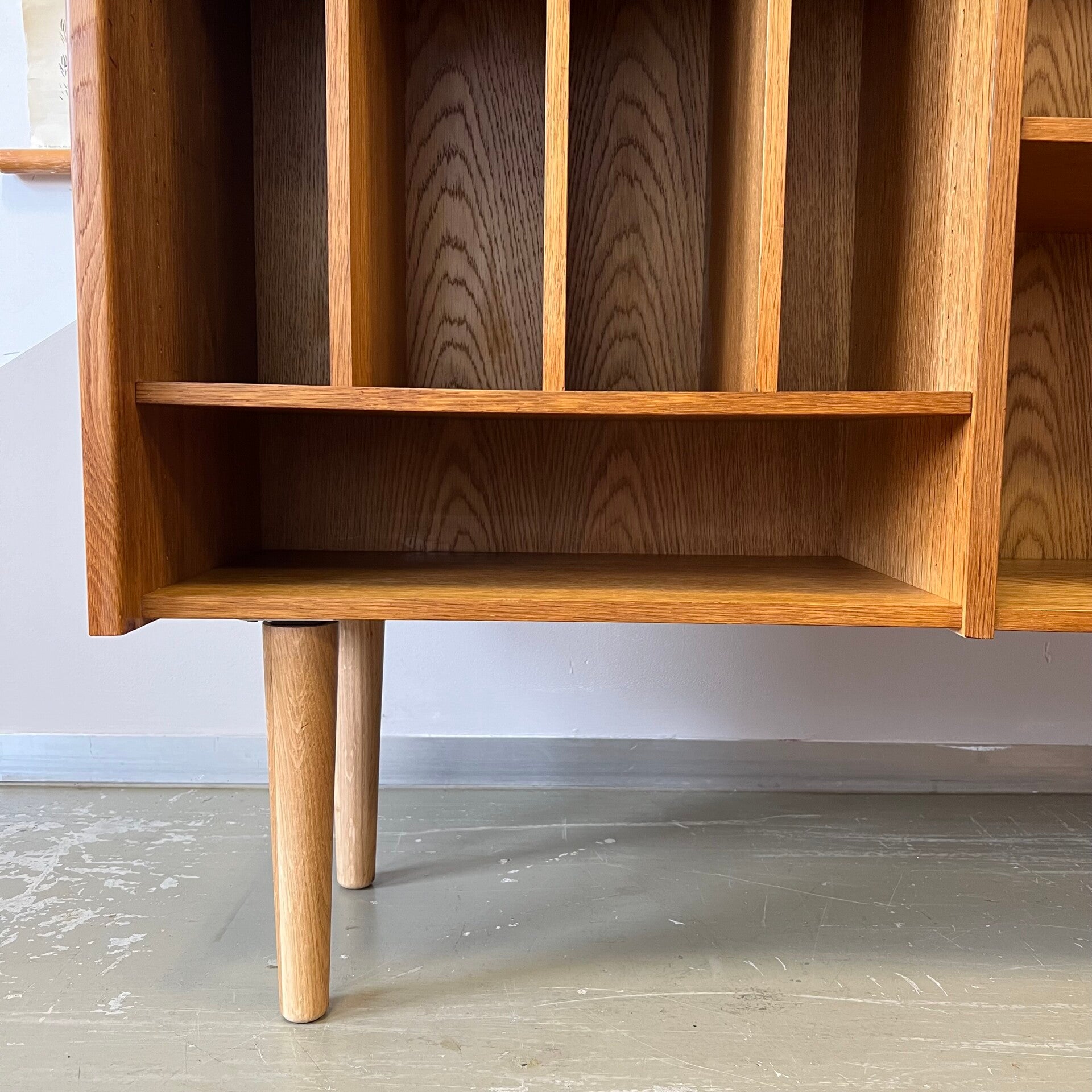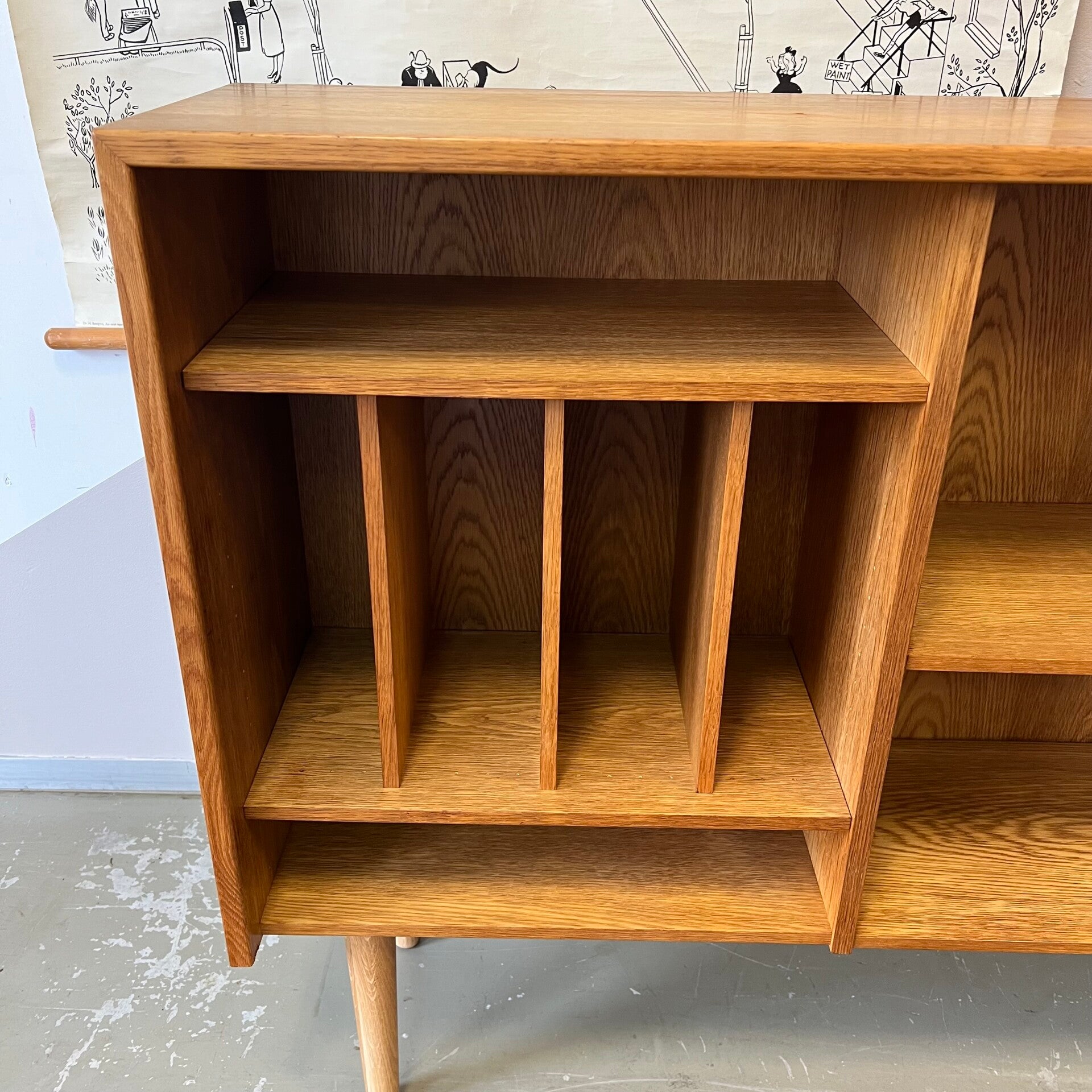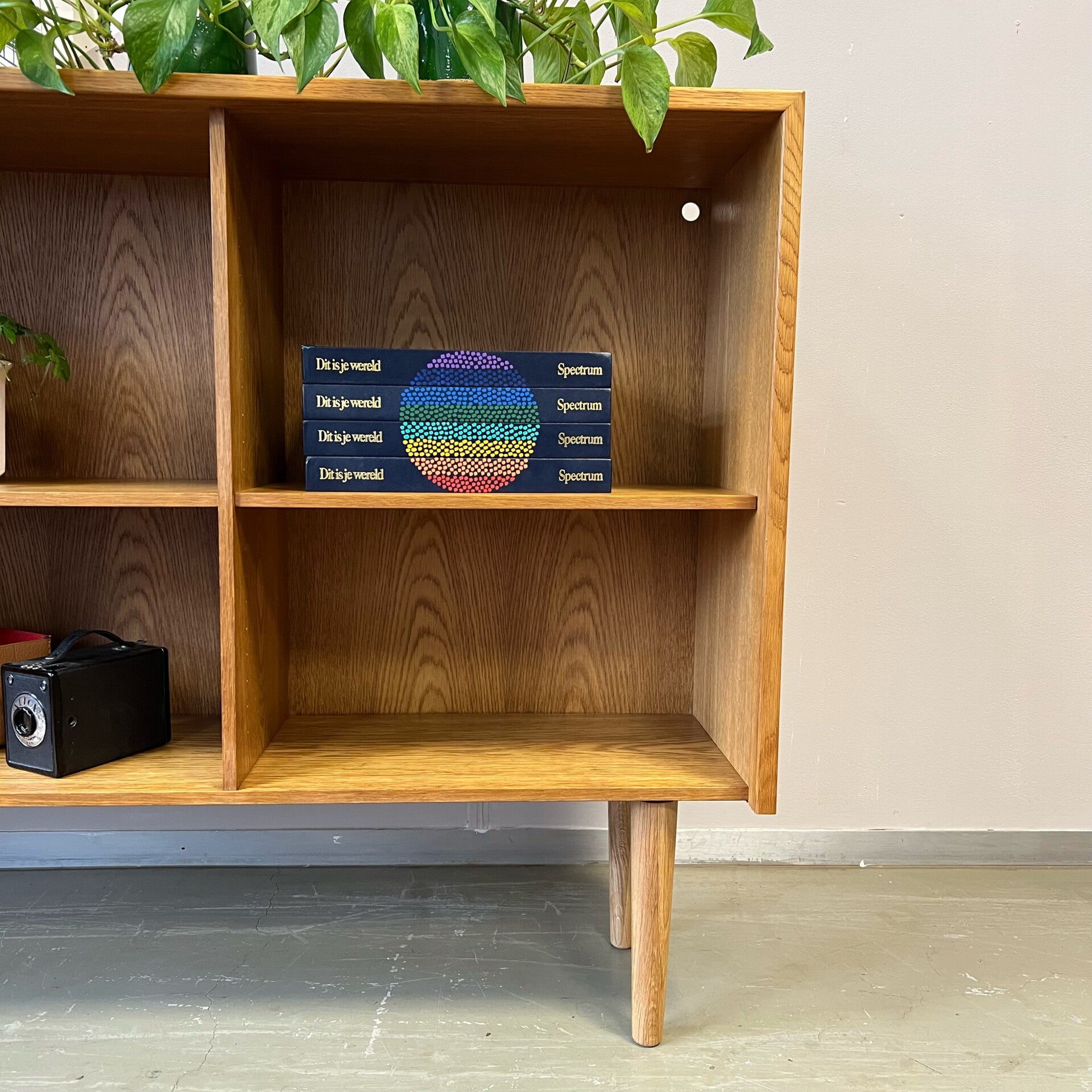 Het meubel heeft links 2 legplanken met ertussen 3 staande planken voor het plaatsen van platen of boeken.