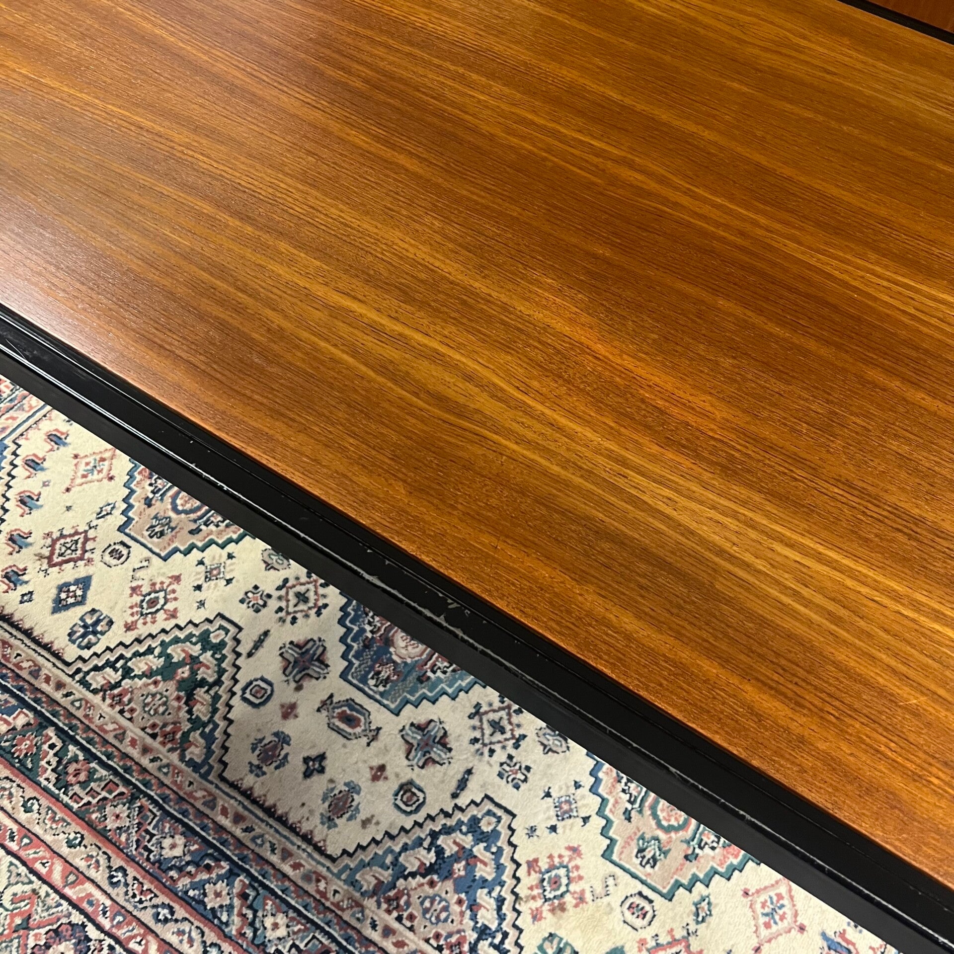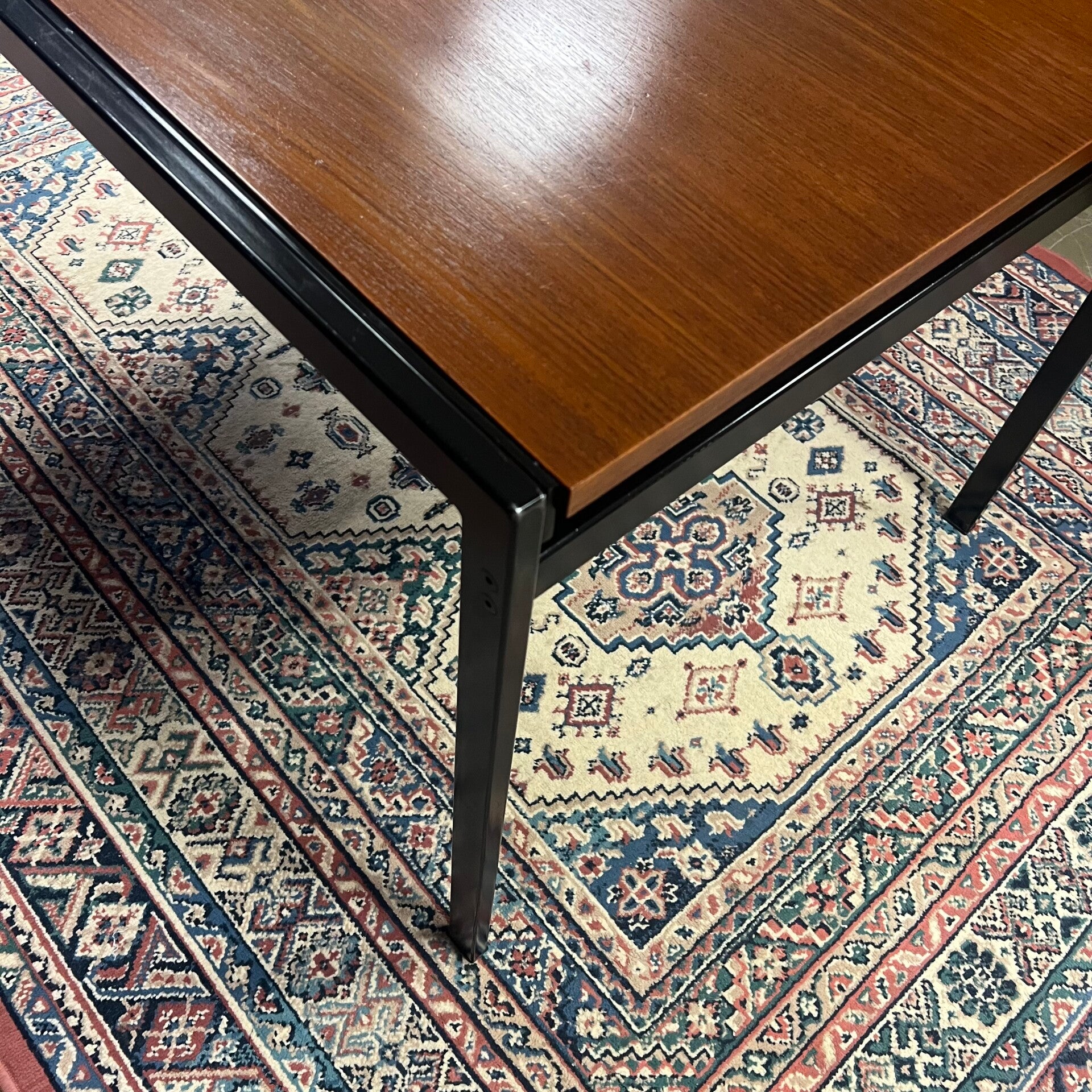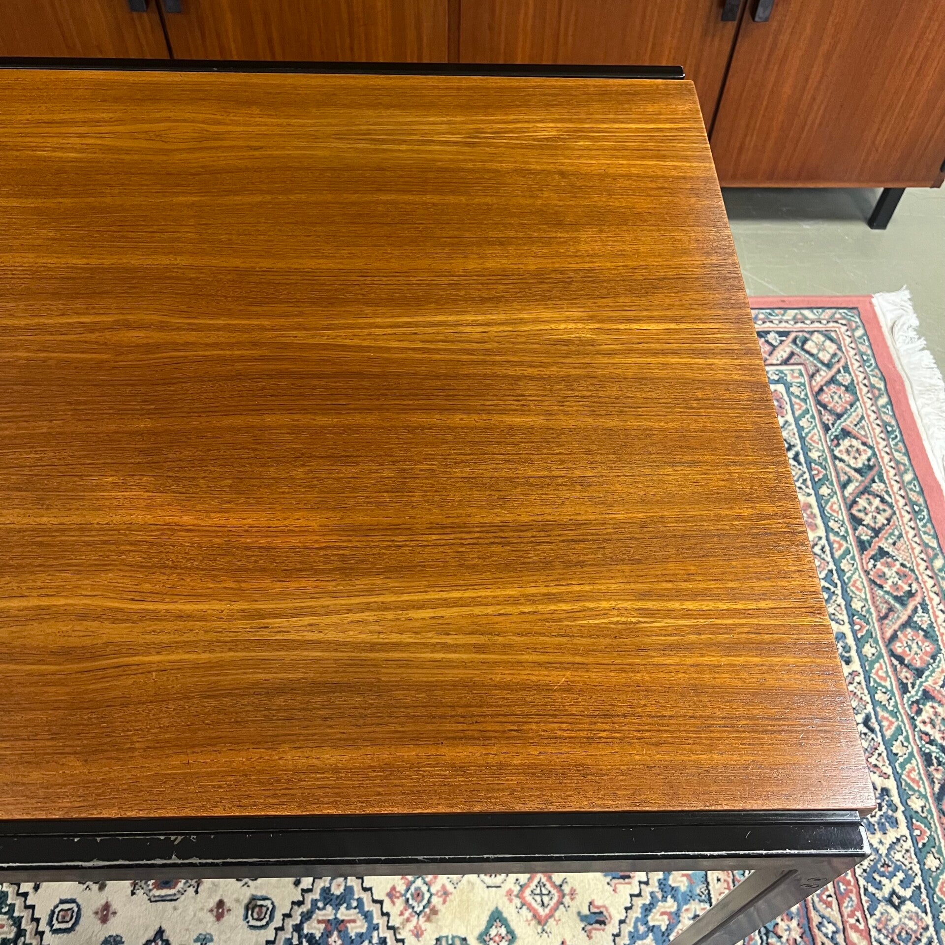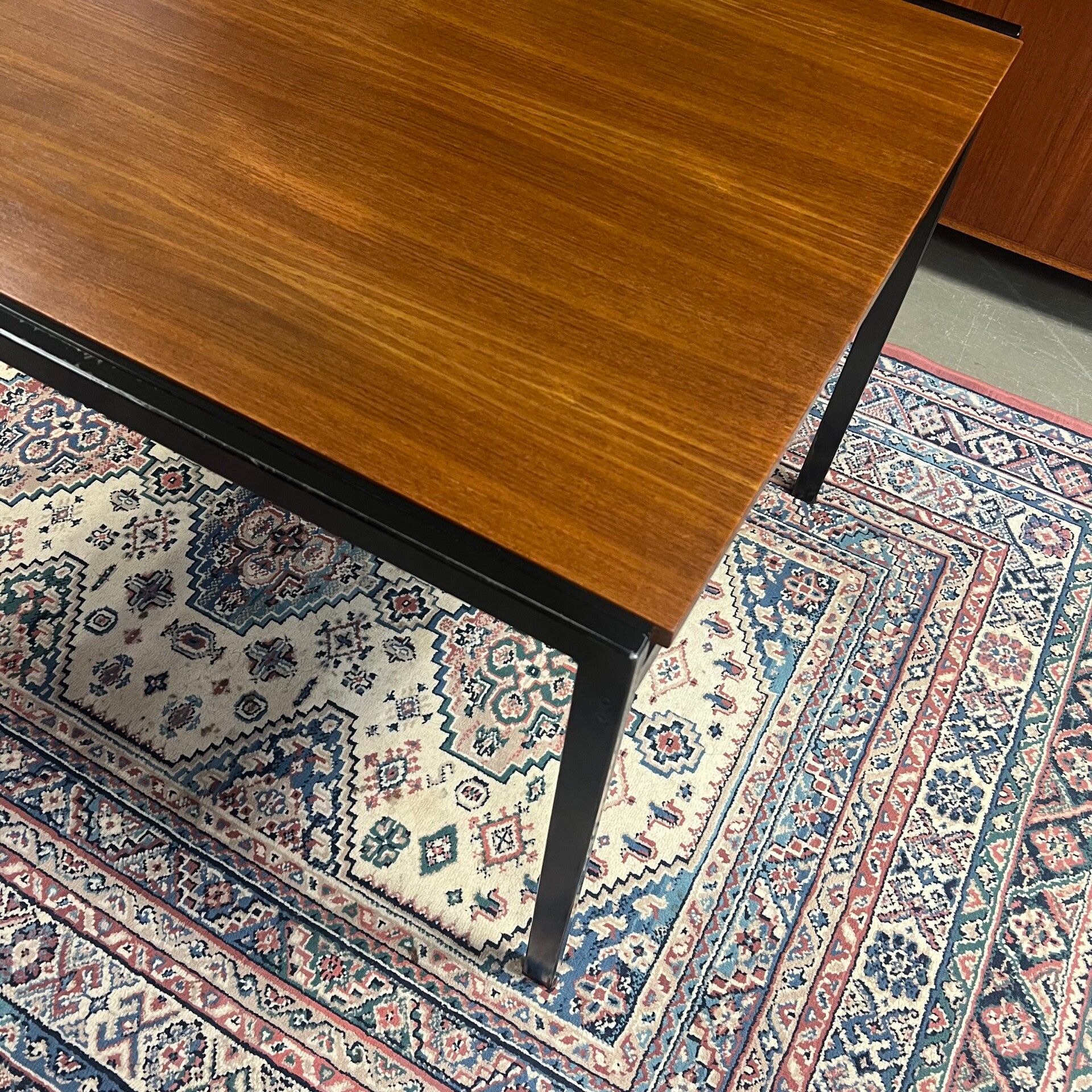 Uitgevoerd in teak (fineer) met zwart stalen poten.