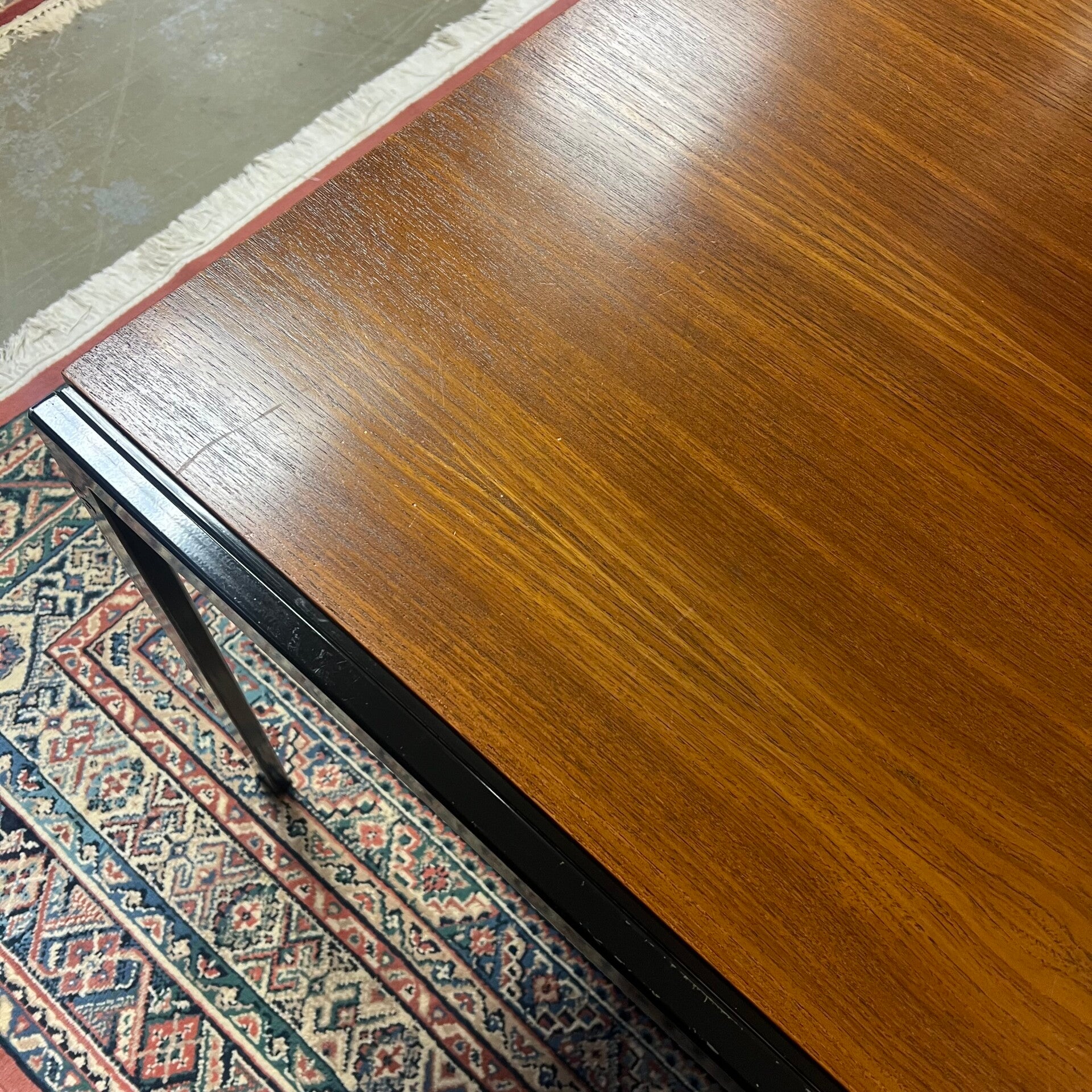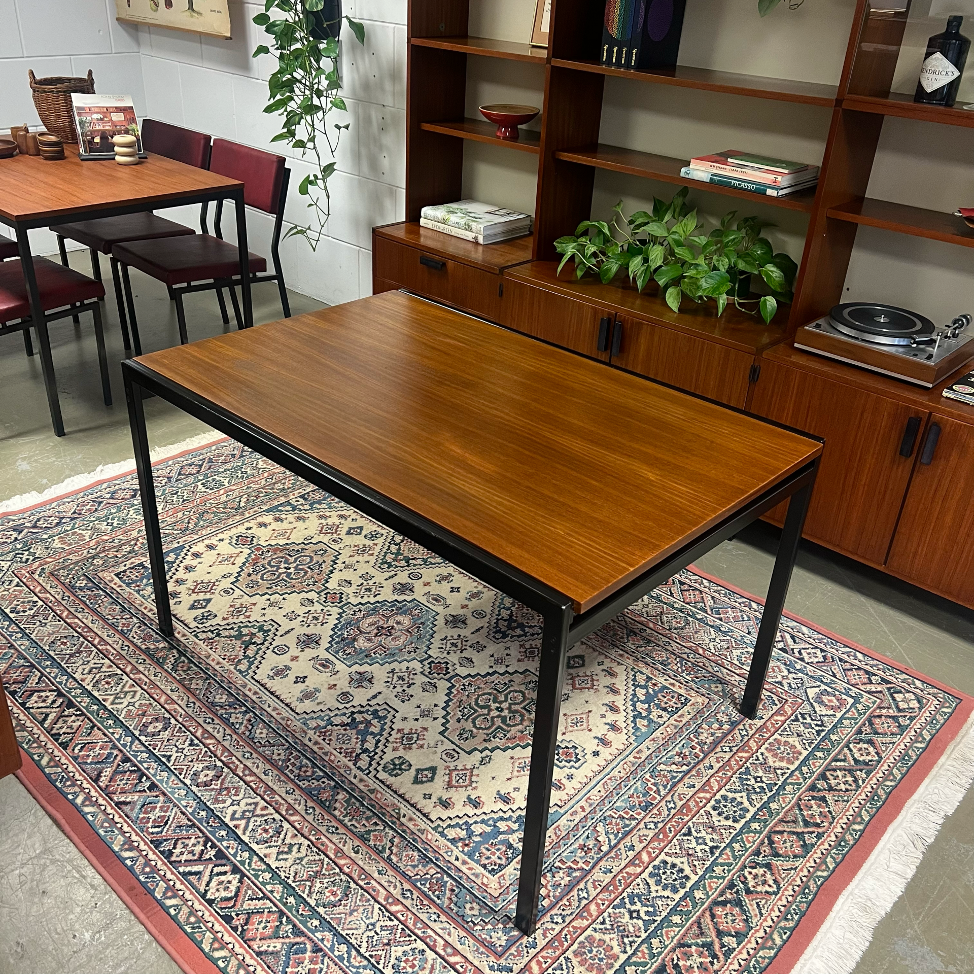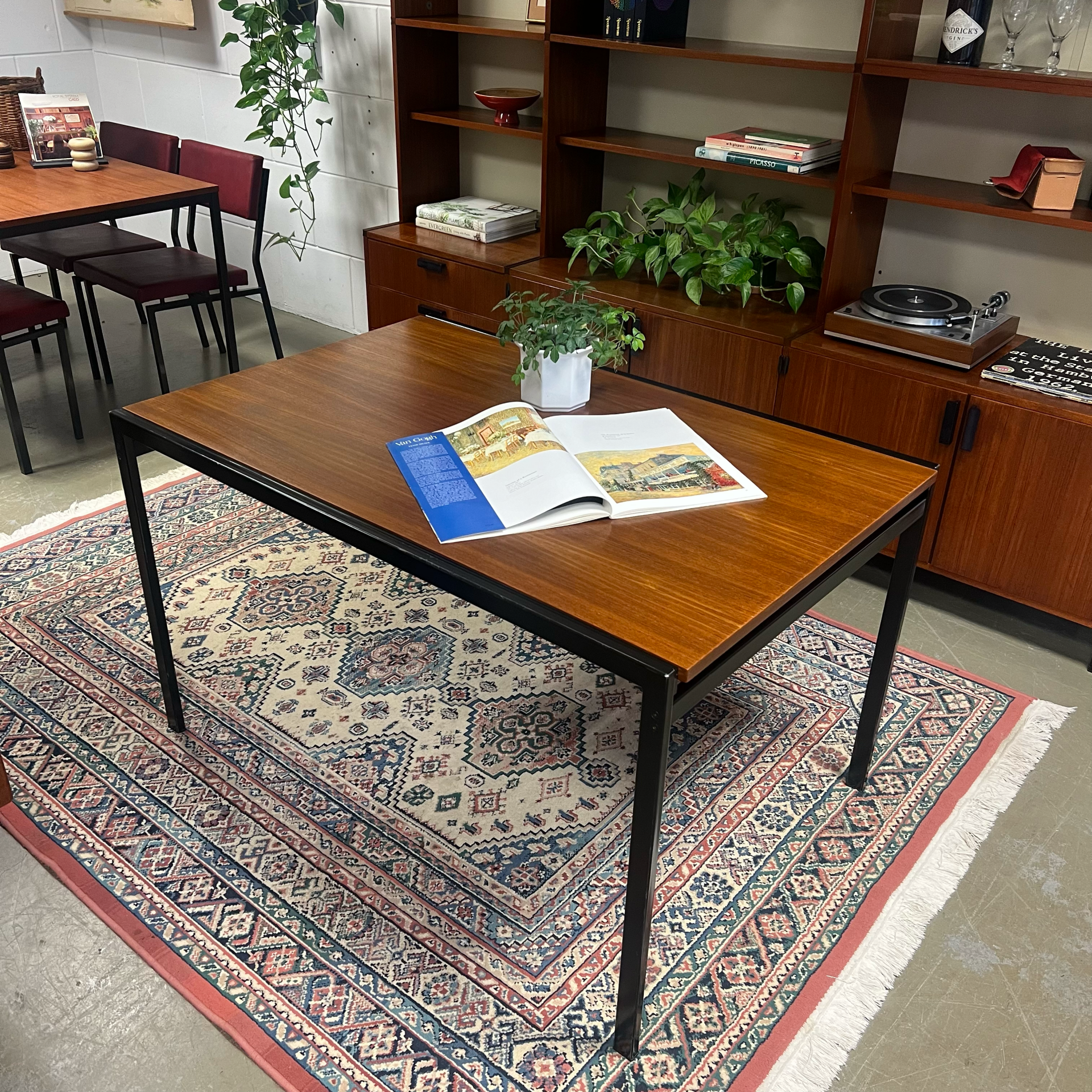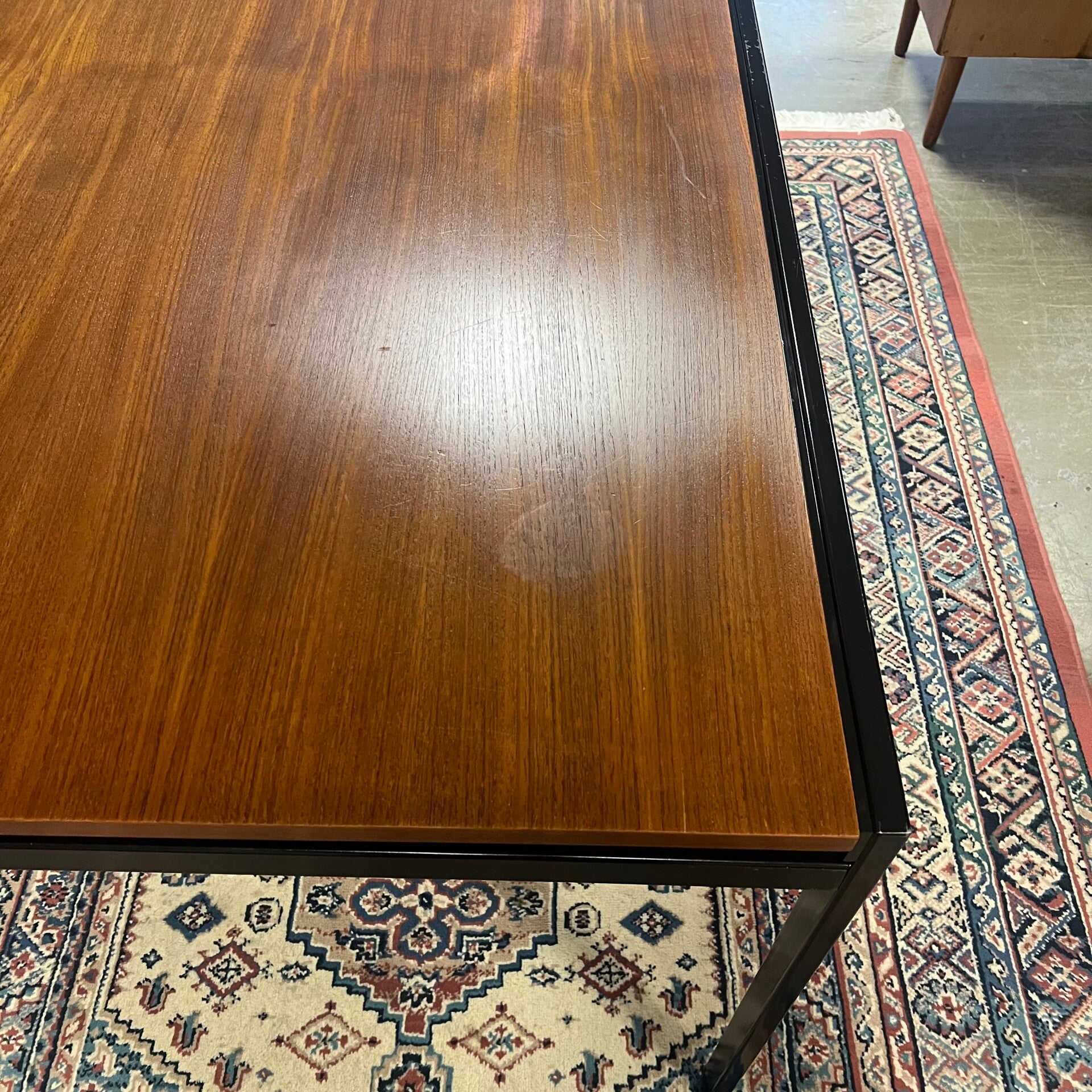 Uitgevoerd in teak (fineer) met zwart stalen poten.