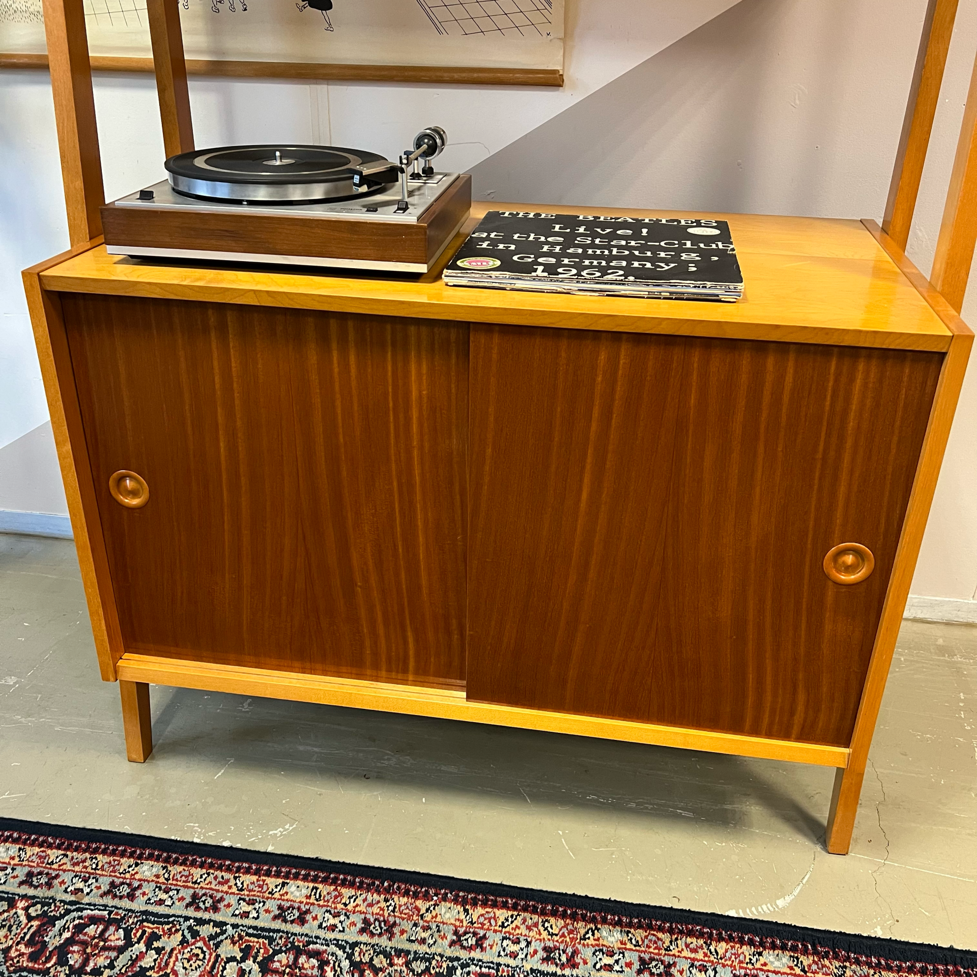 Het meubel heeft bovenin een plank, eronder een schuifdeurkastje met uitneembare plank.