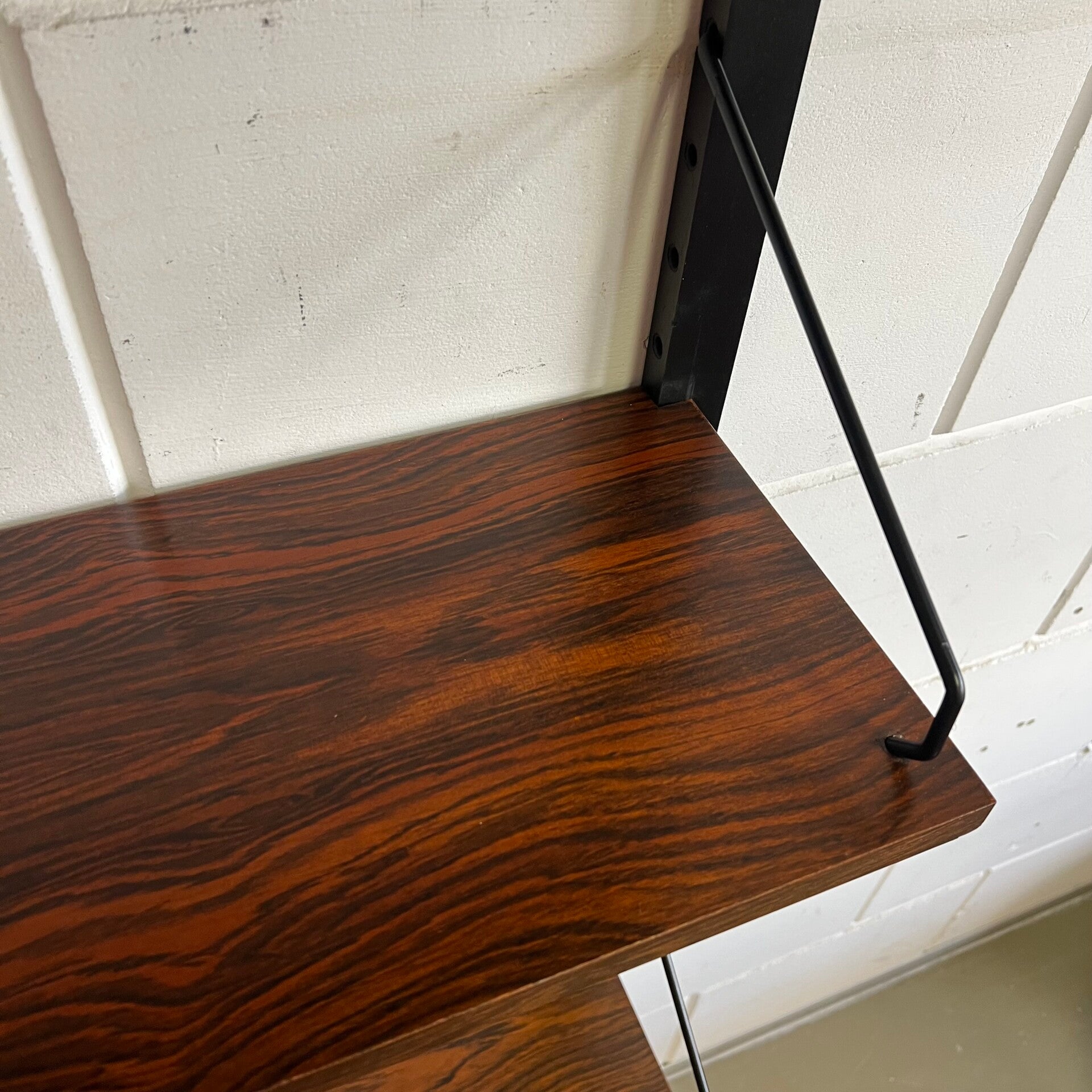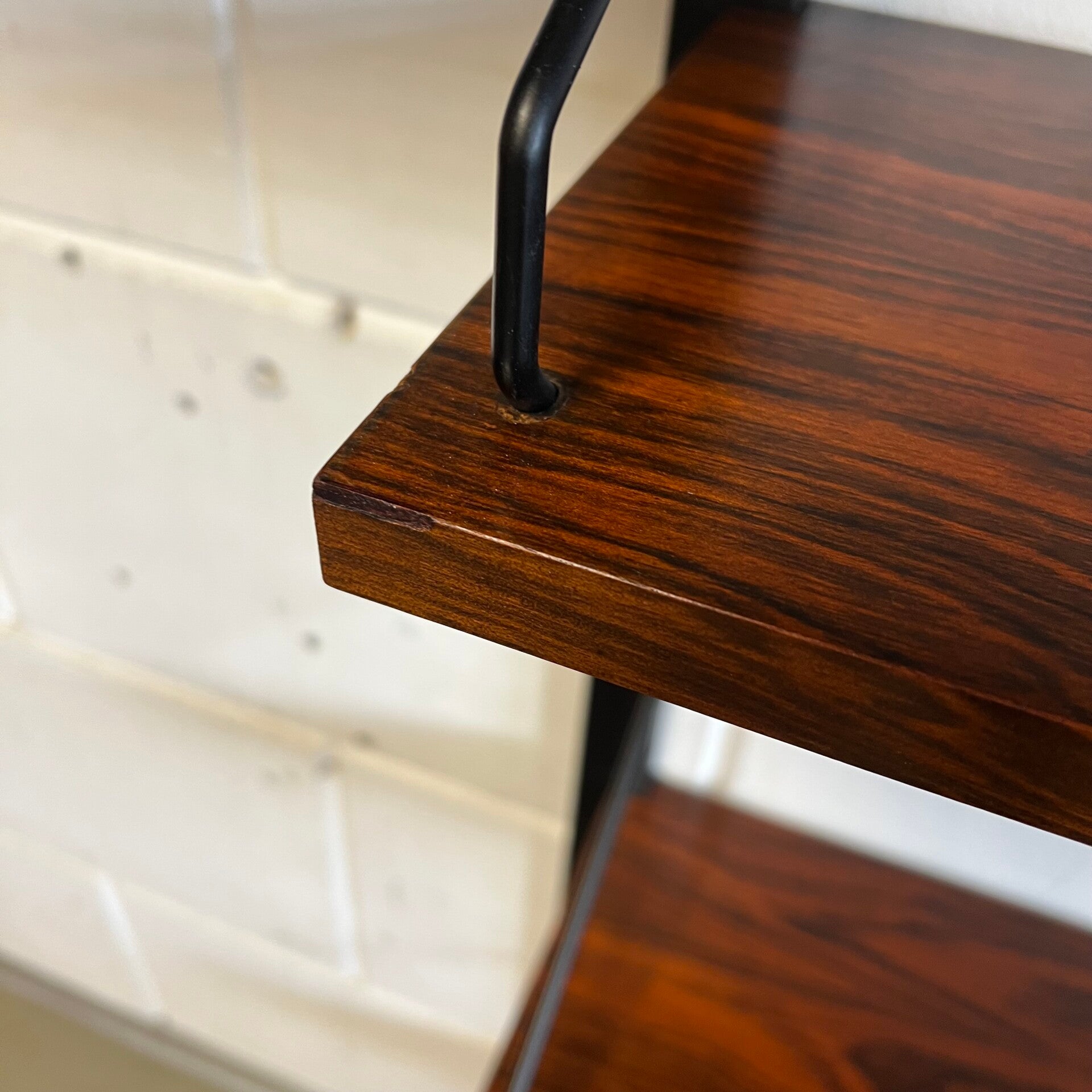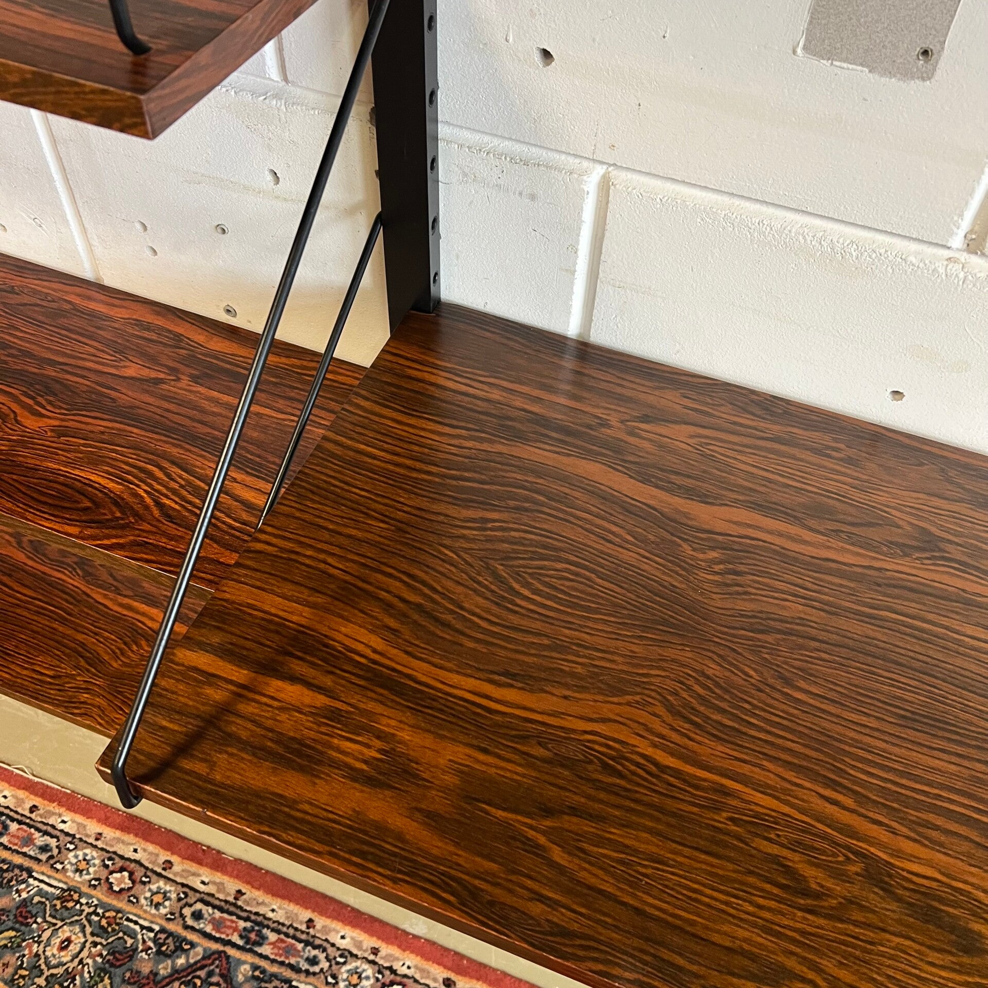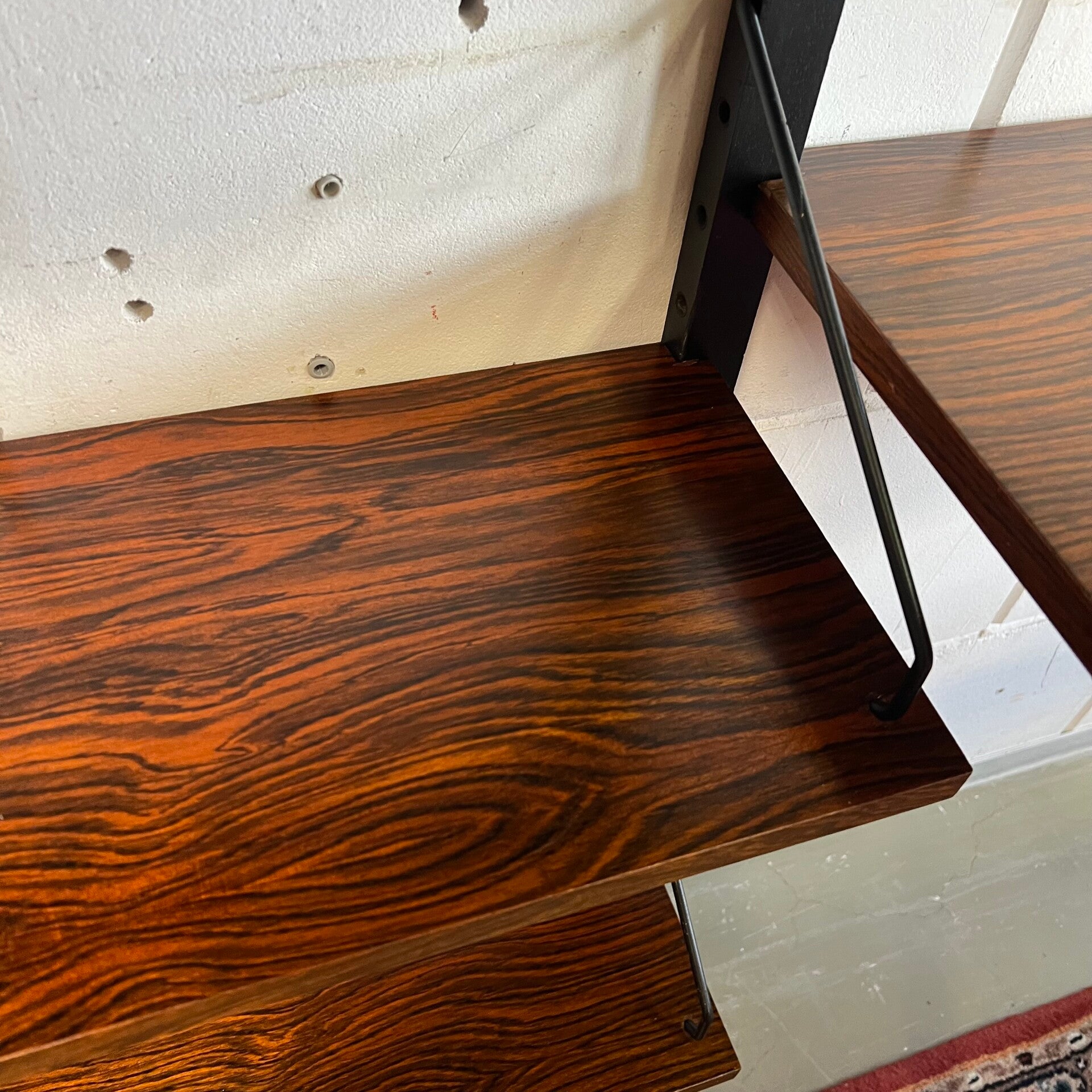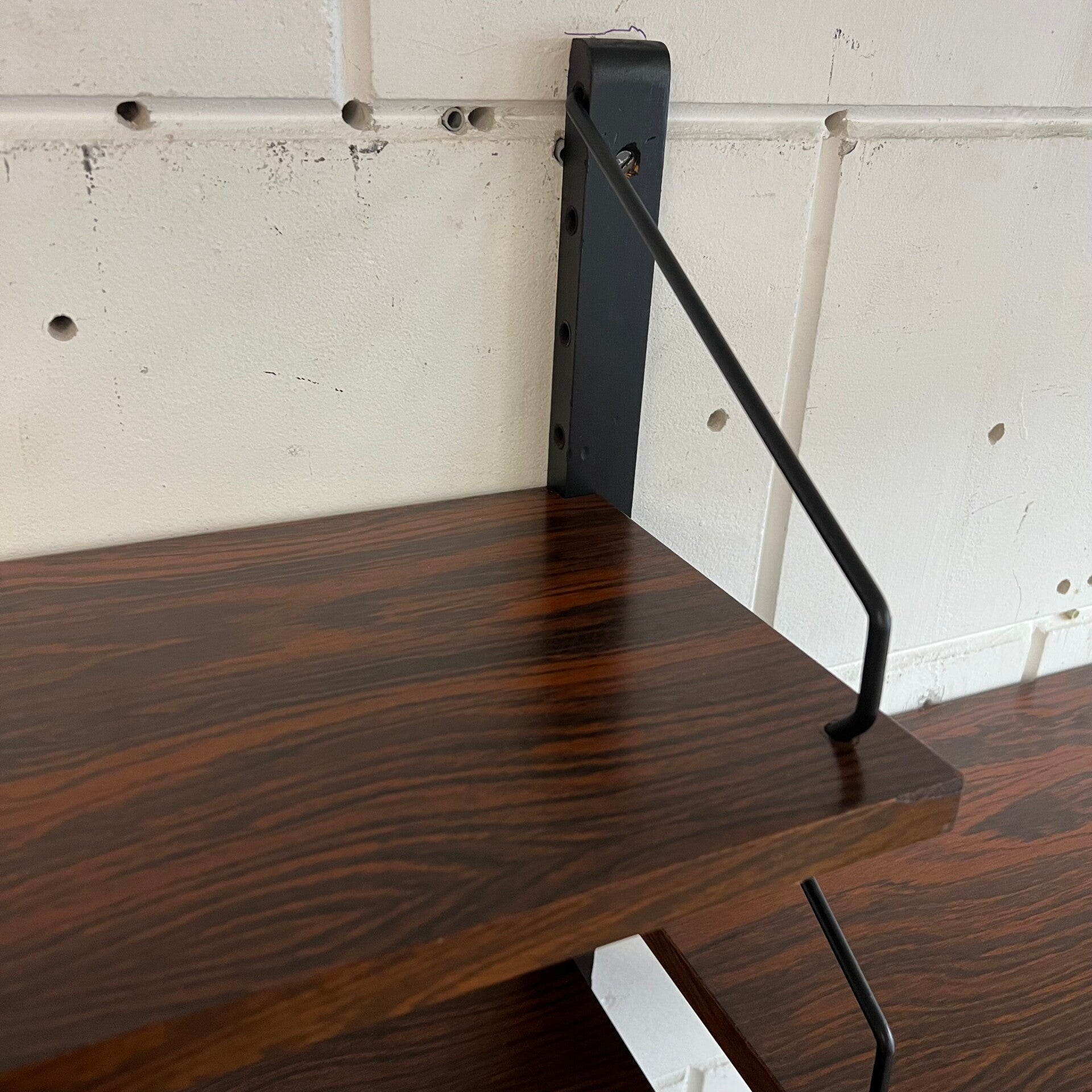 Mooi vintage wandmeubel, wall unit uitgevoerd in rosewood (fineer) met zwart metalen beugels en zwart houten wandlatten.