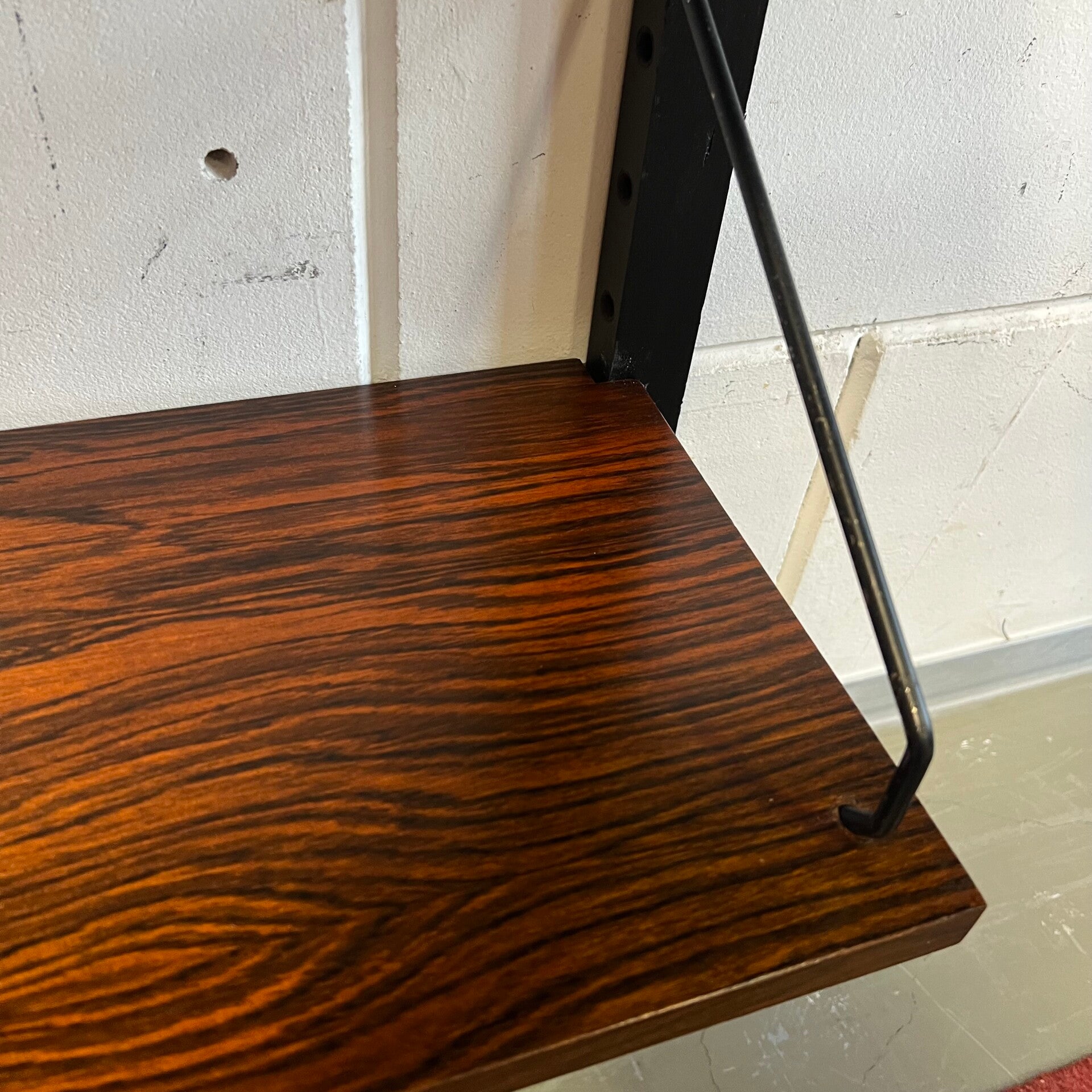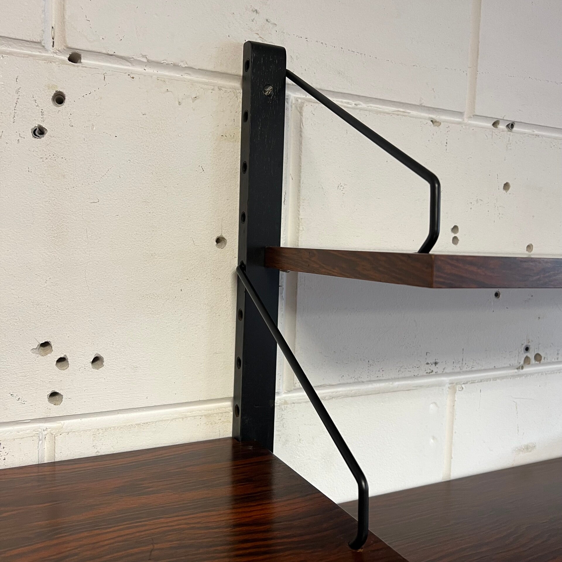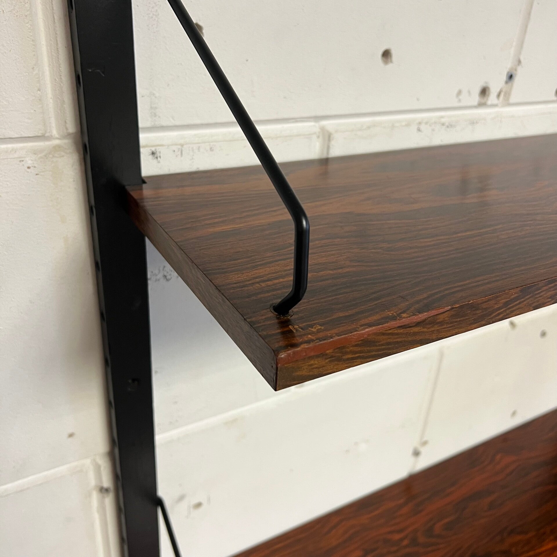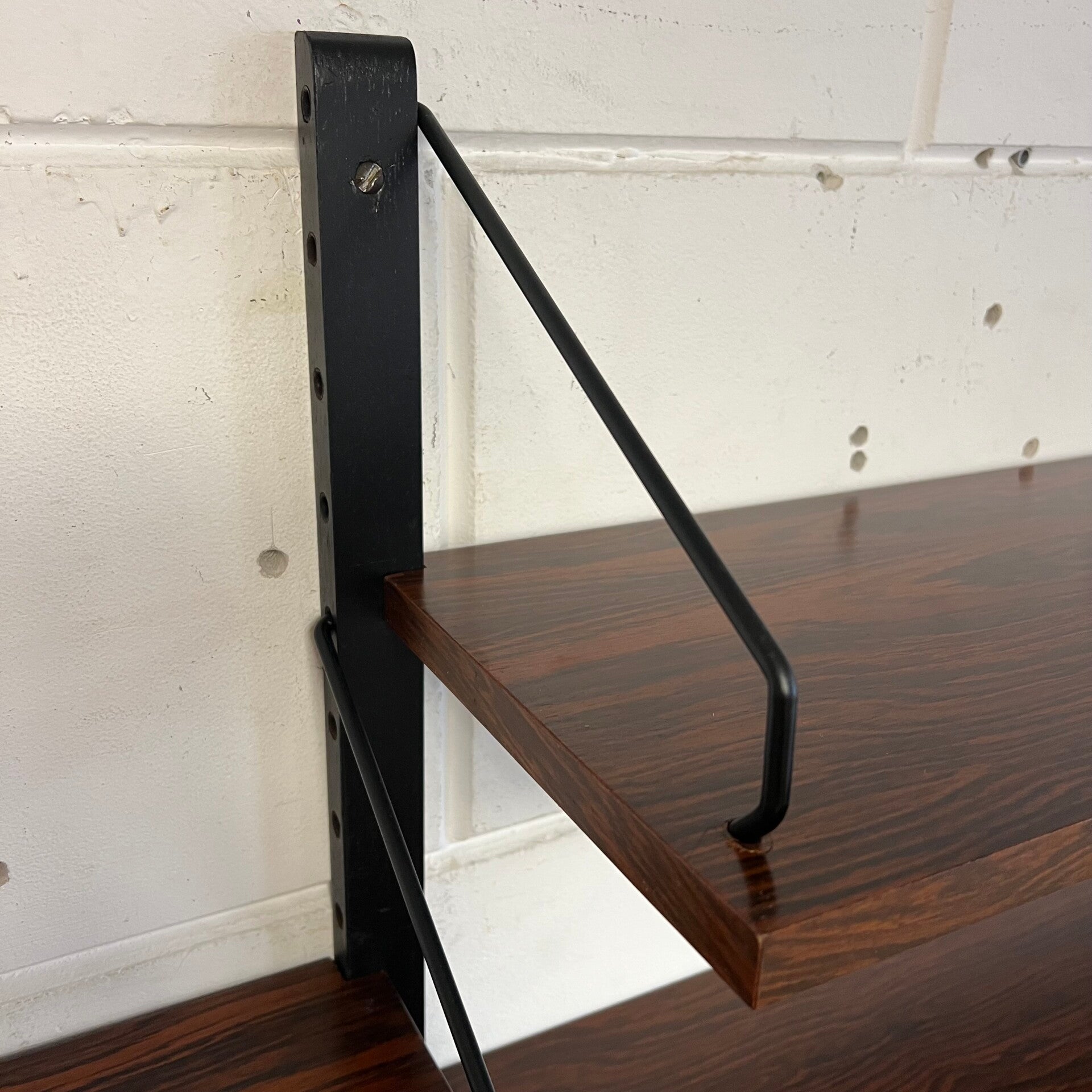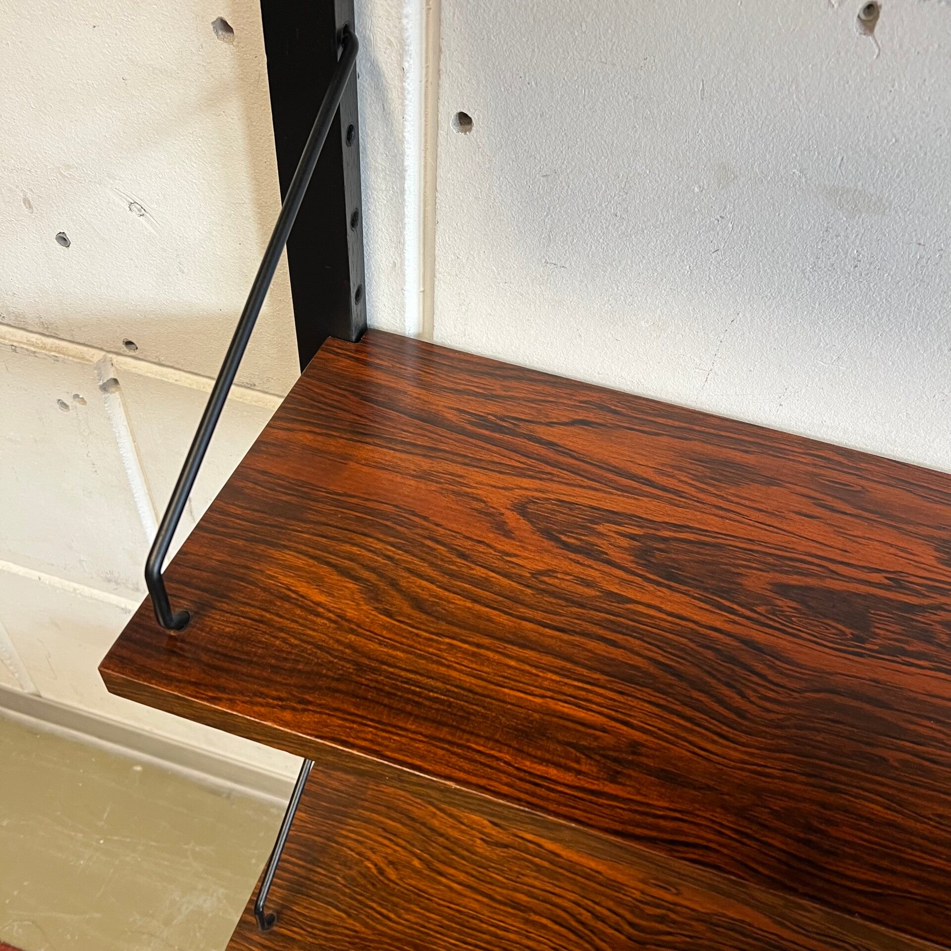 Mooi vintage wandmeubel, wall unit uitgevoerd in rosewood (fineer) met zwart metalen beugels en zwart houten wandlatten.