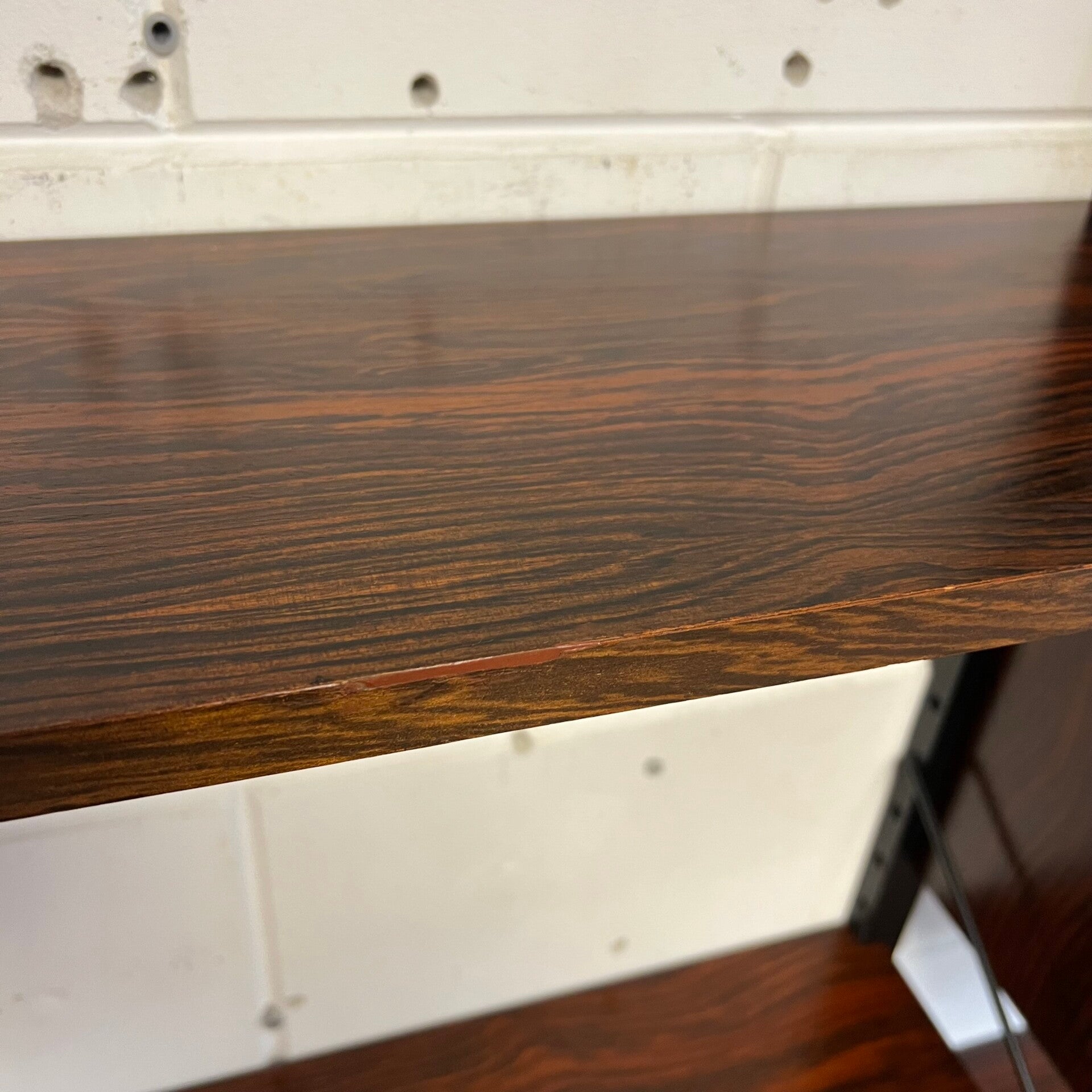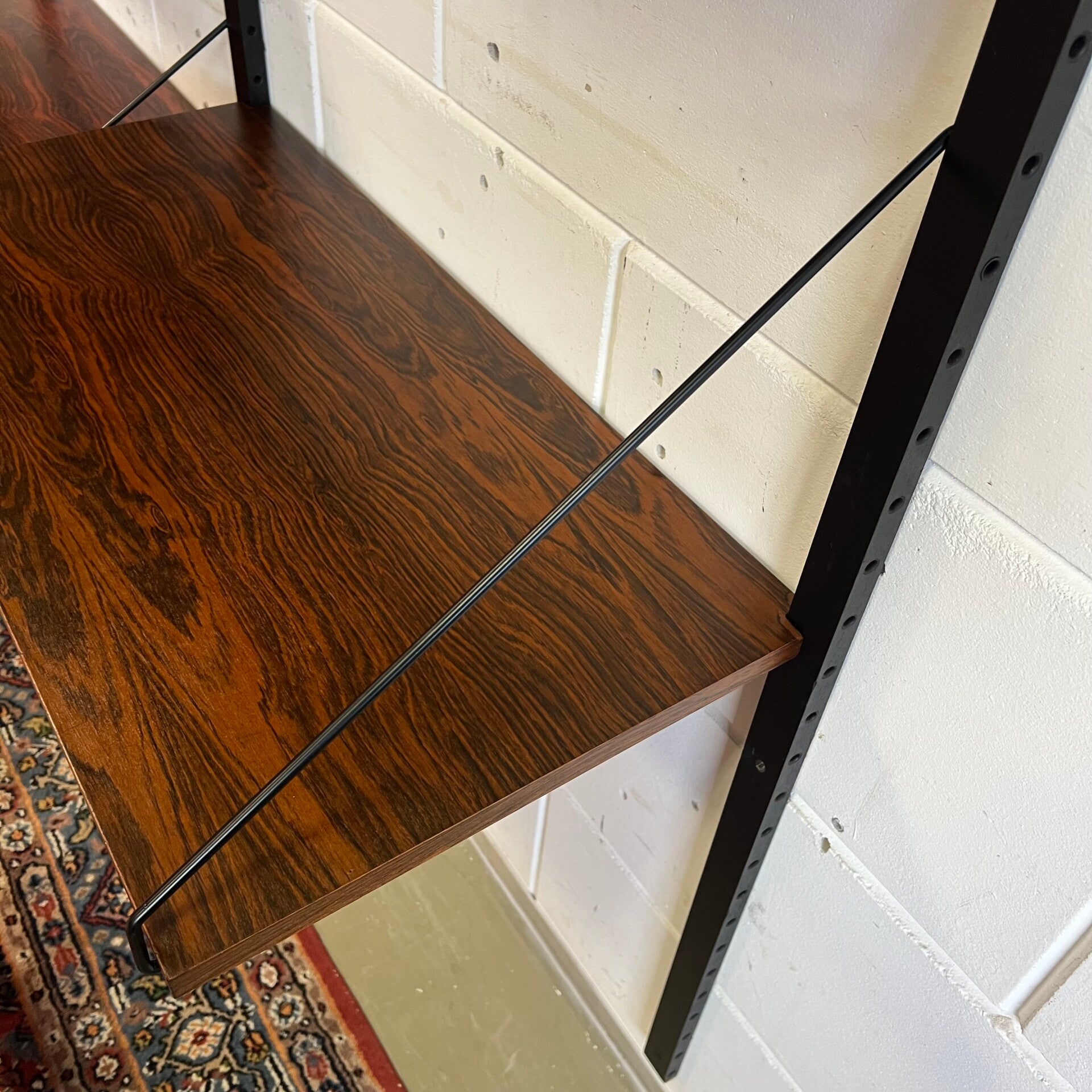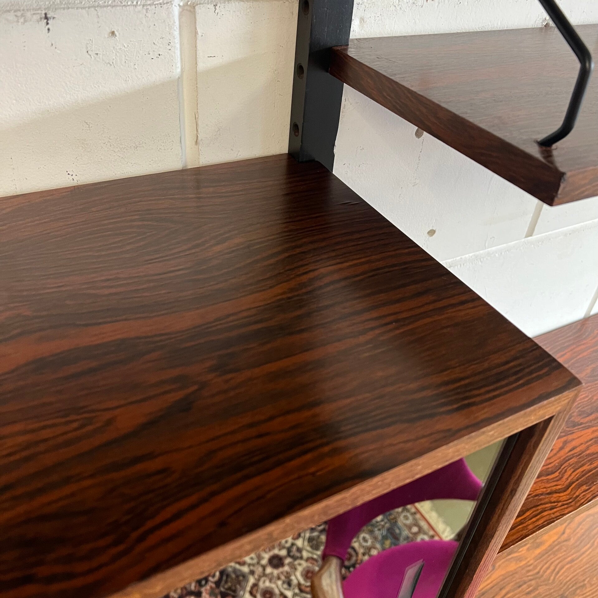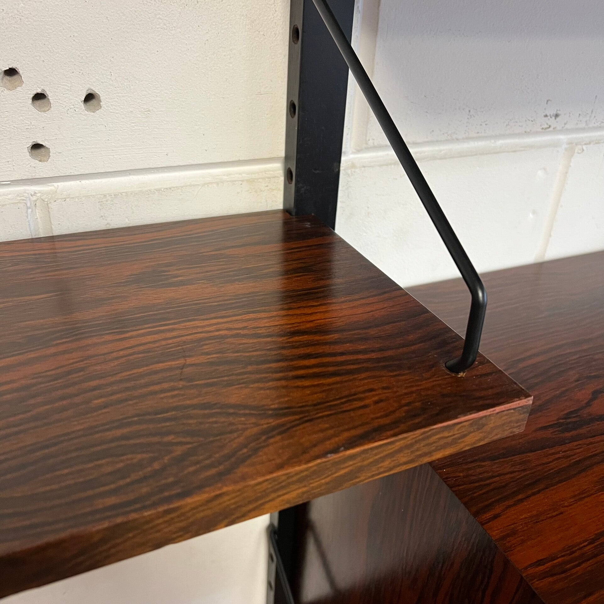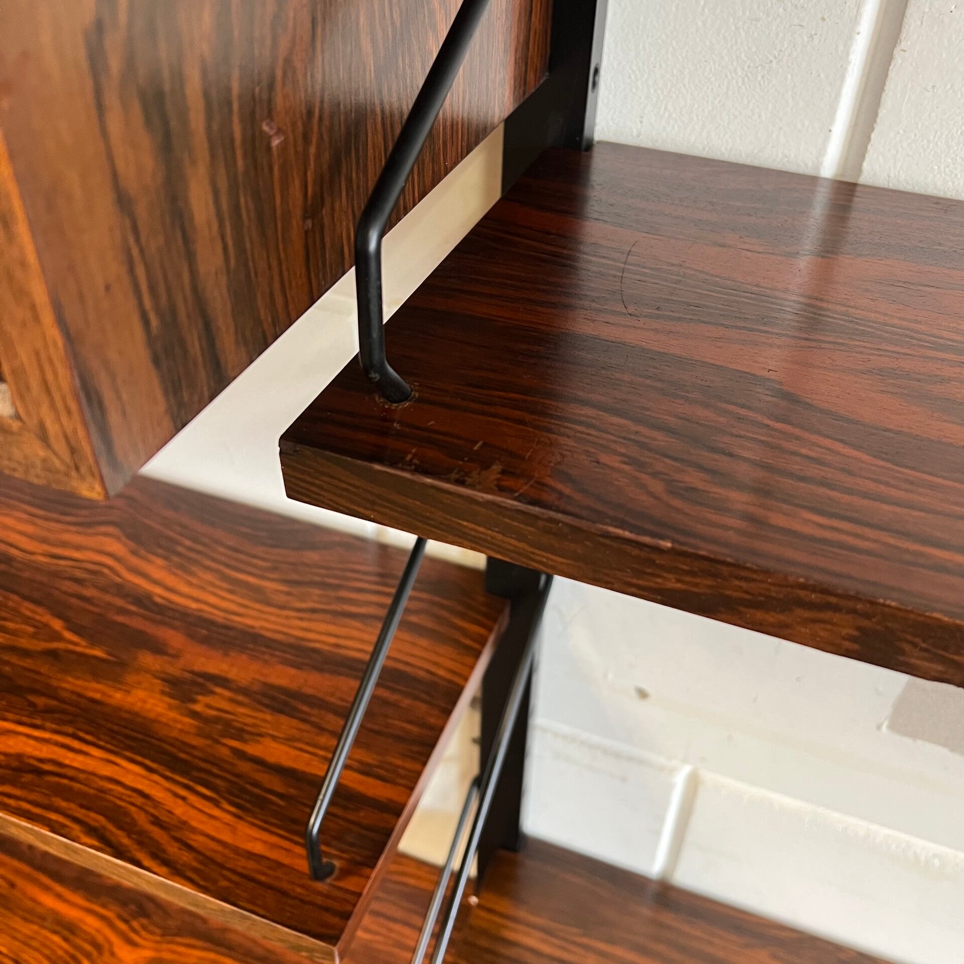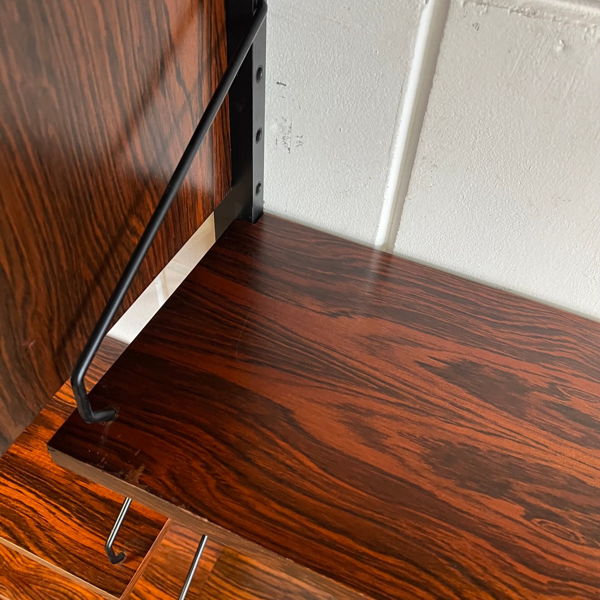 Mooi vintage wandmeubel, wall unit uitgevoerd in rosewood (fineer) met zwart metalen beugels en zwart houten wandlatten.