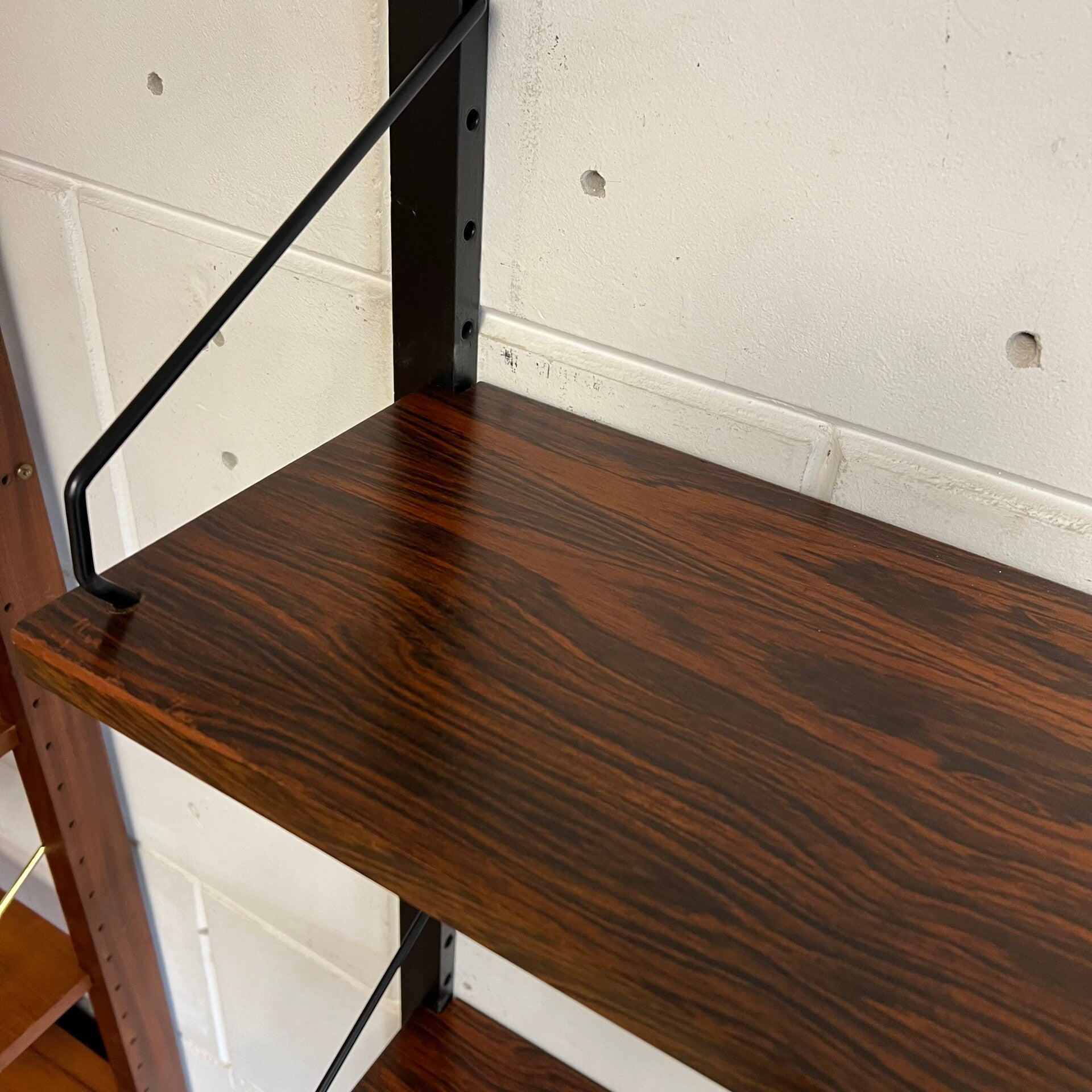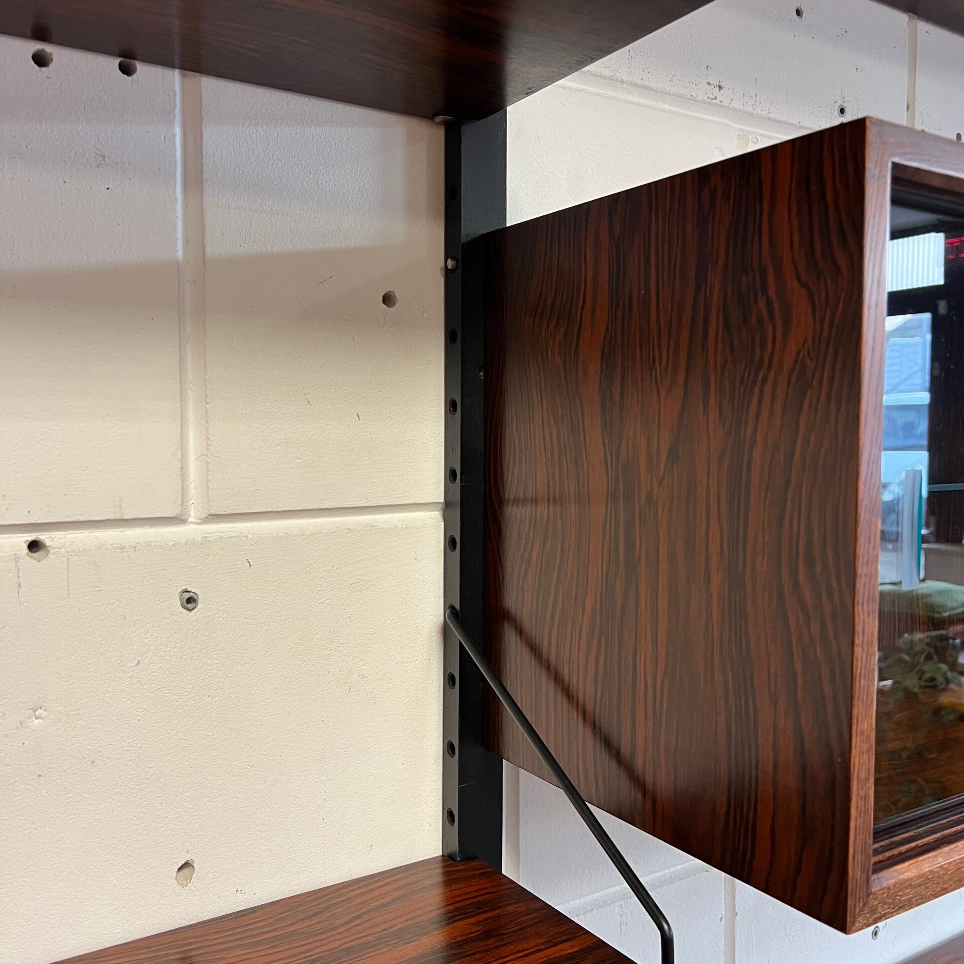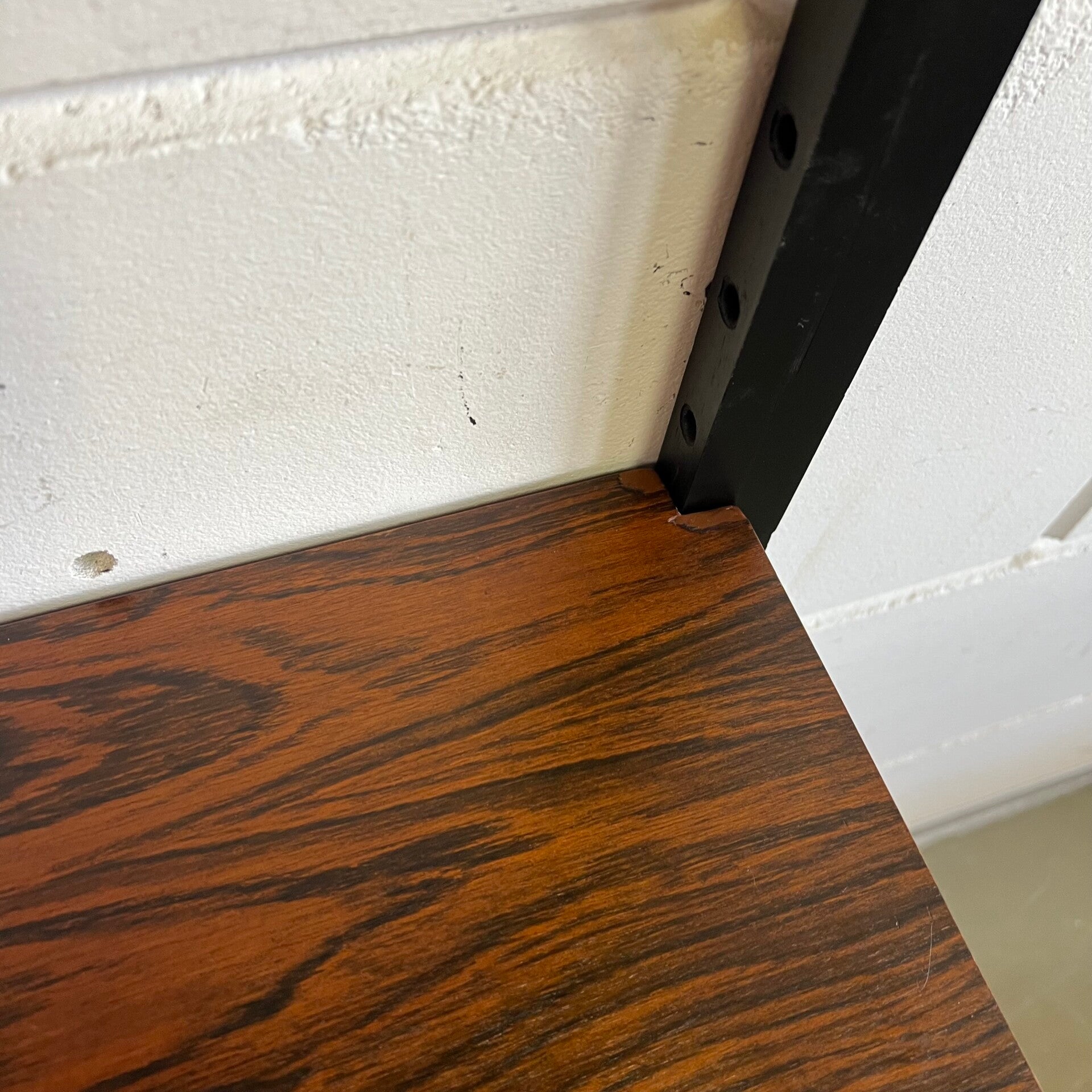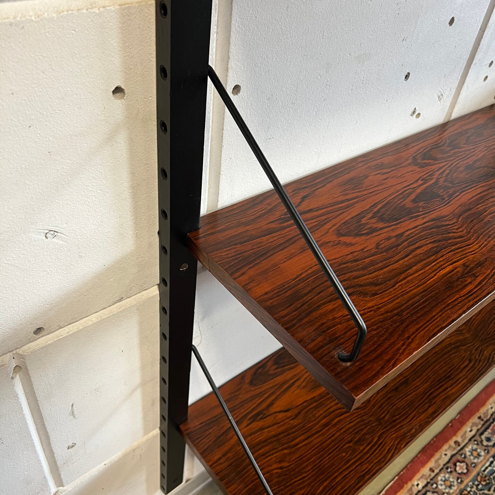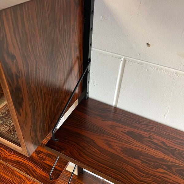 Mooi vintage wandmeubel, wall unit uitgevoerd in rosewood (fineer) met zwart metalen beugels en zwart houten wandlatten.