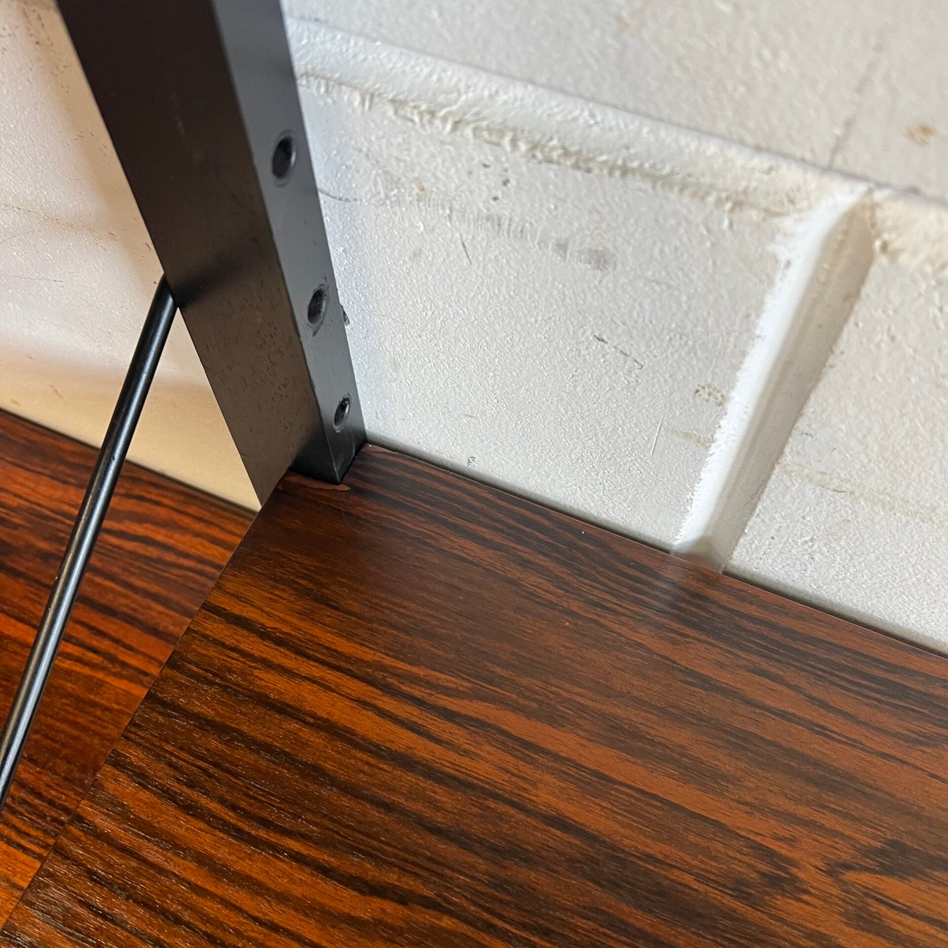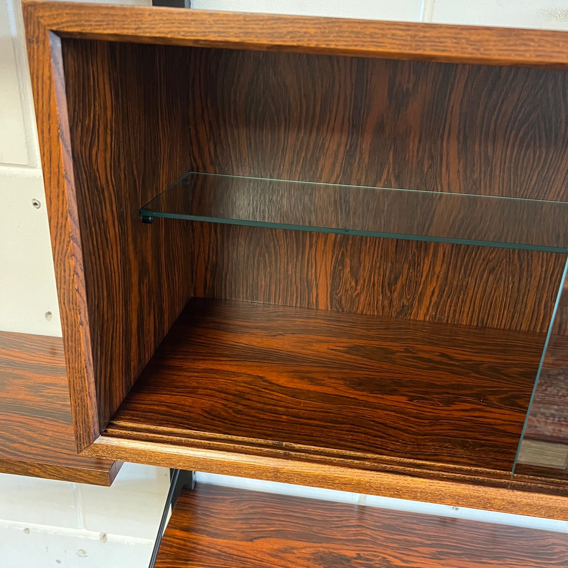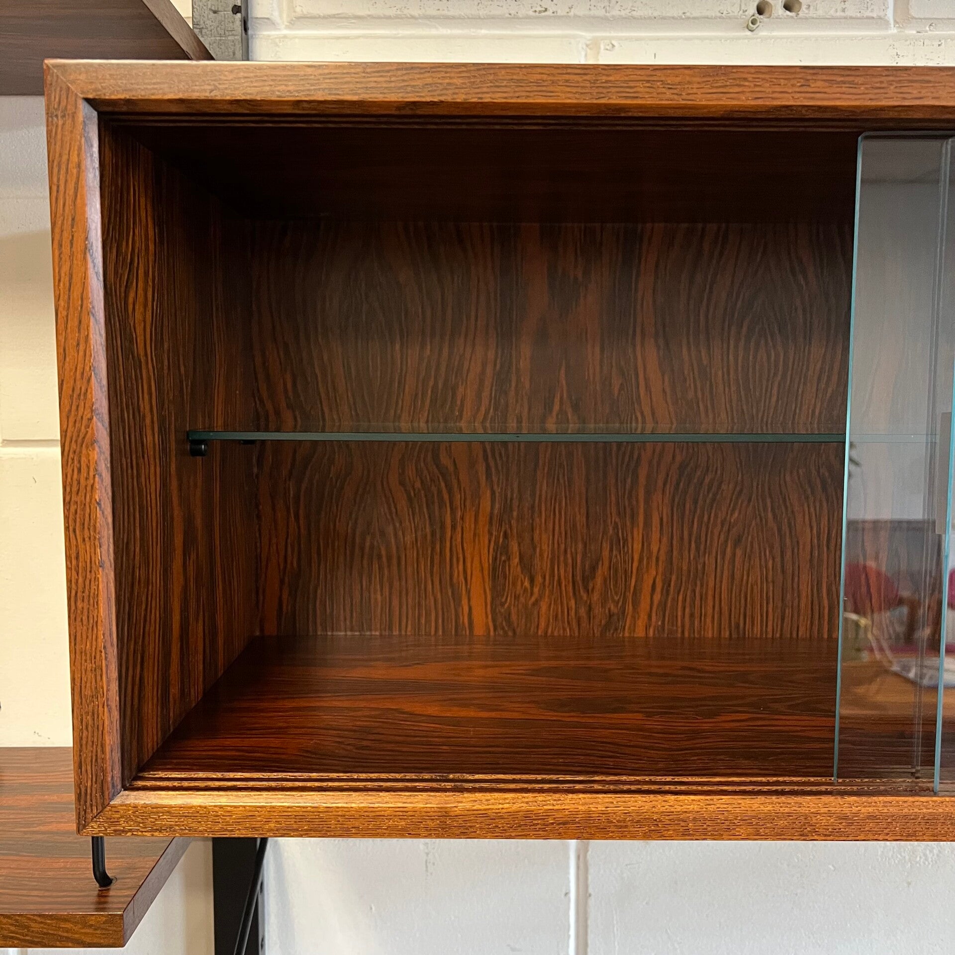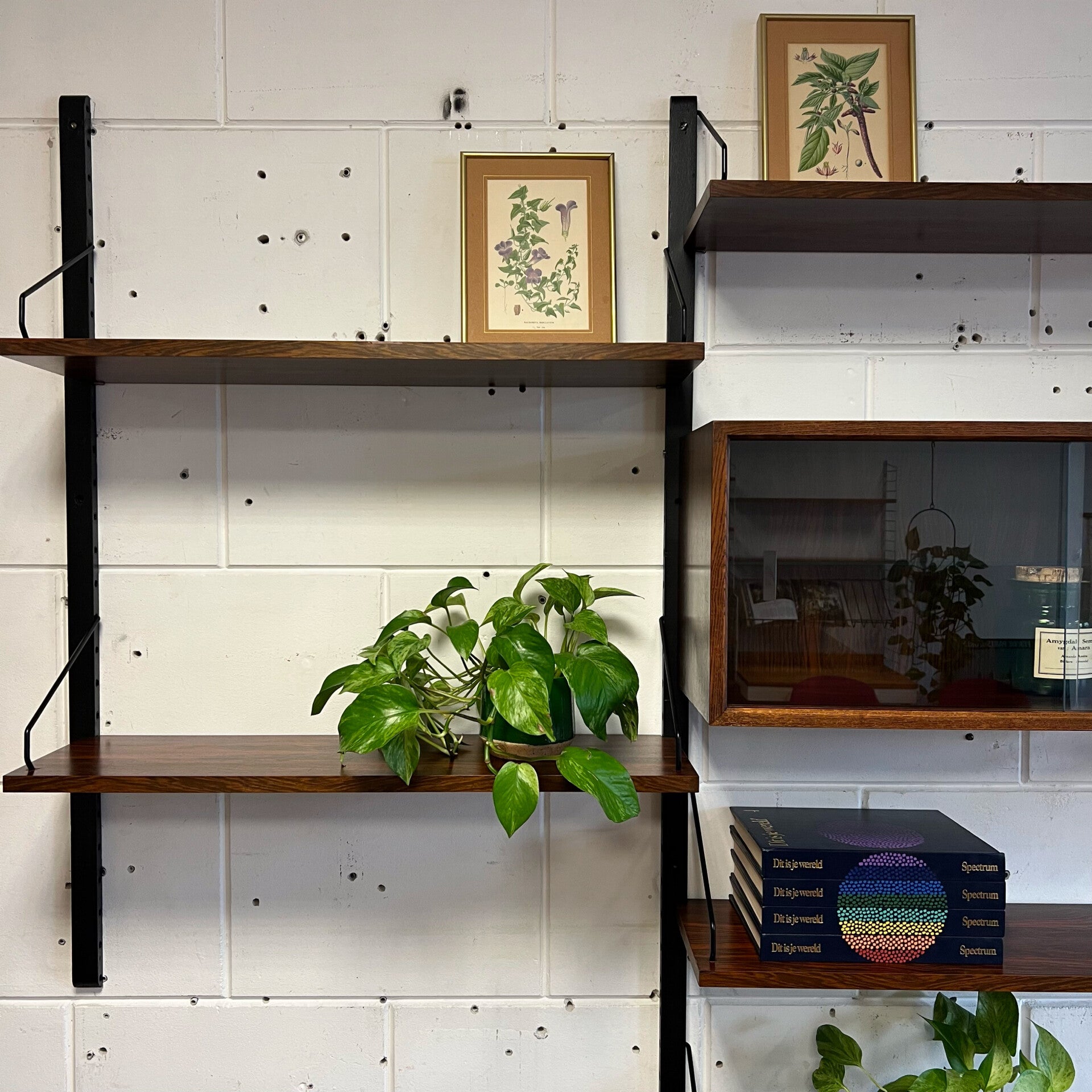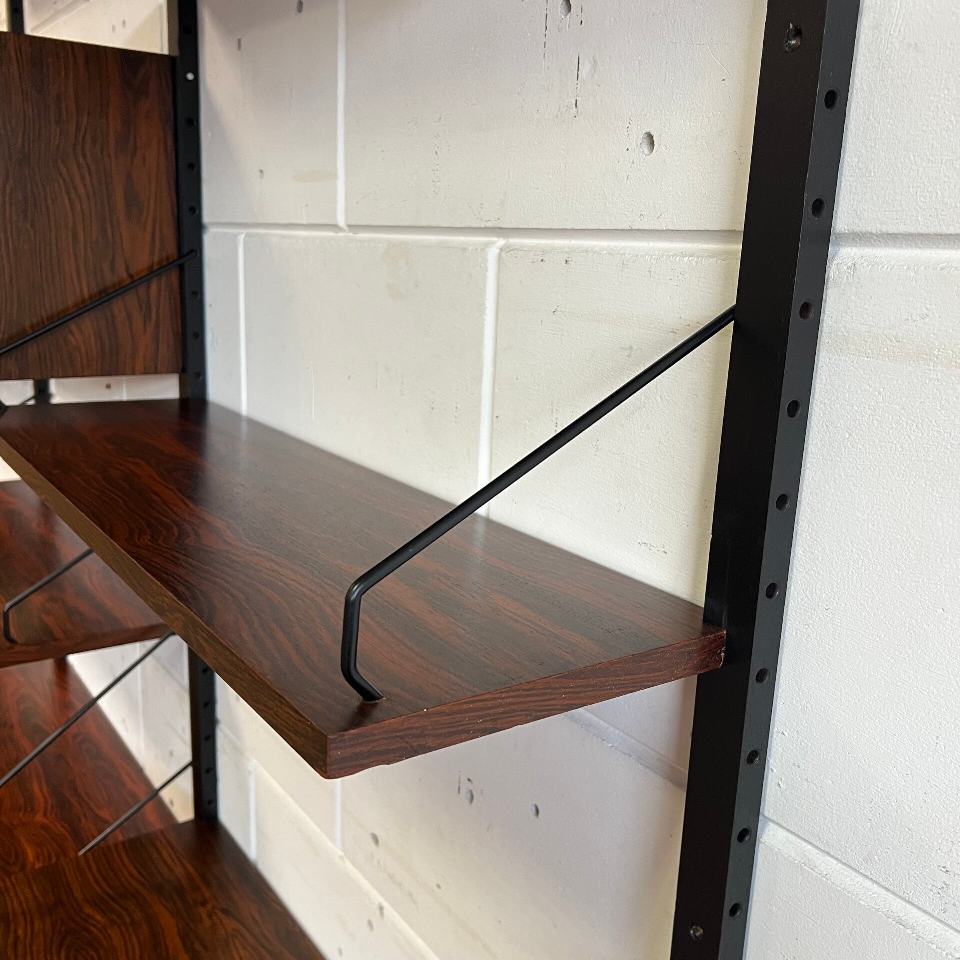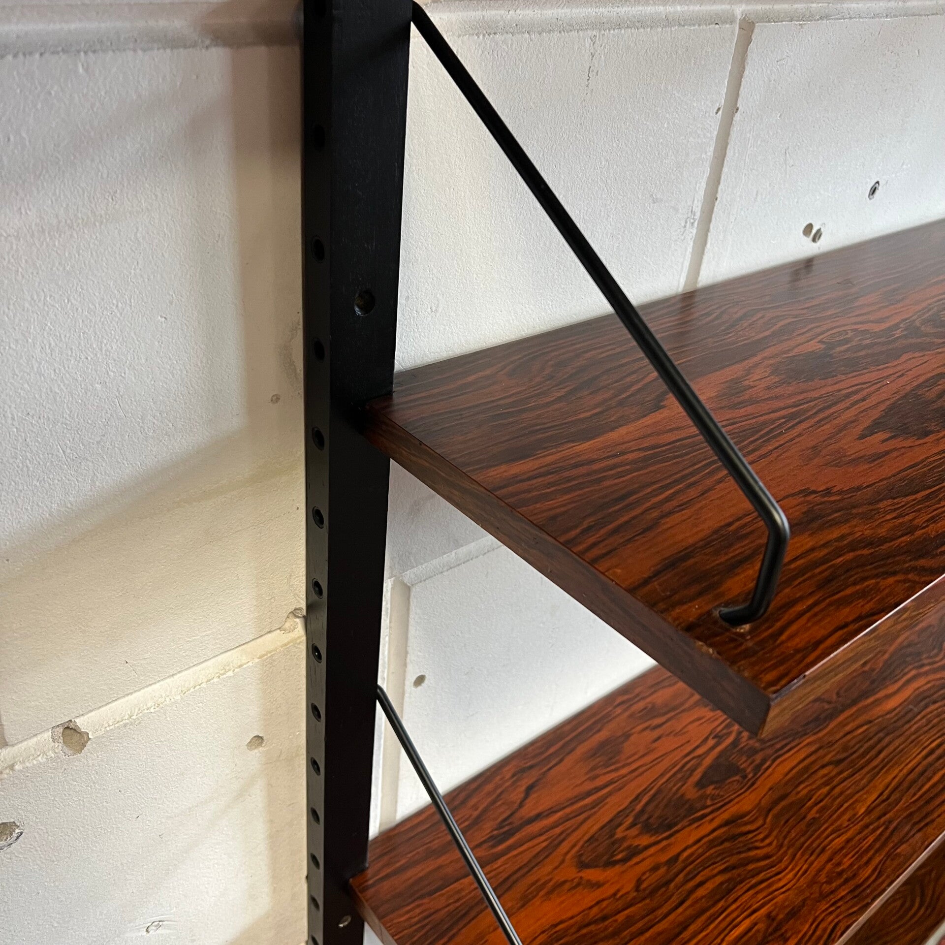 Mooi vintage wandmeubel, wall unit uitgevoerd in rosewood (fineer) met zwart metalen beugels en zwart houten wandlatten.