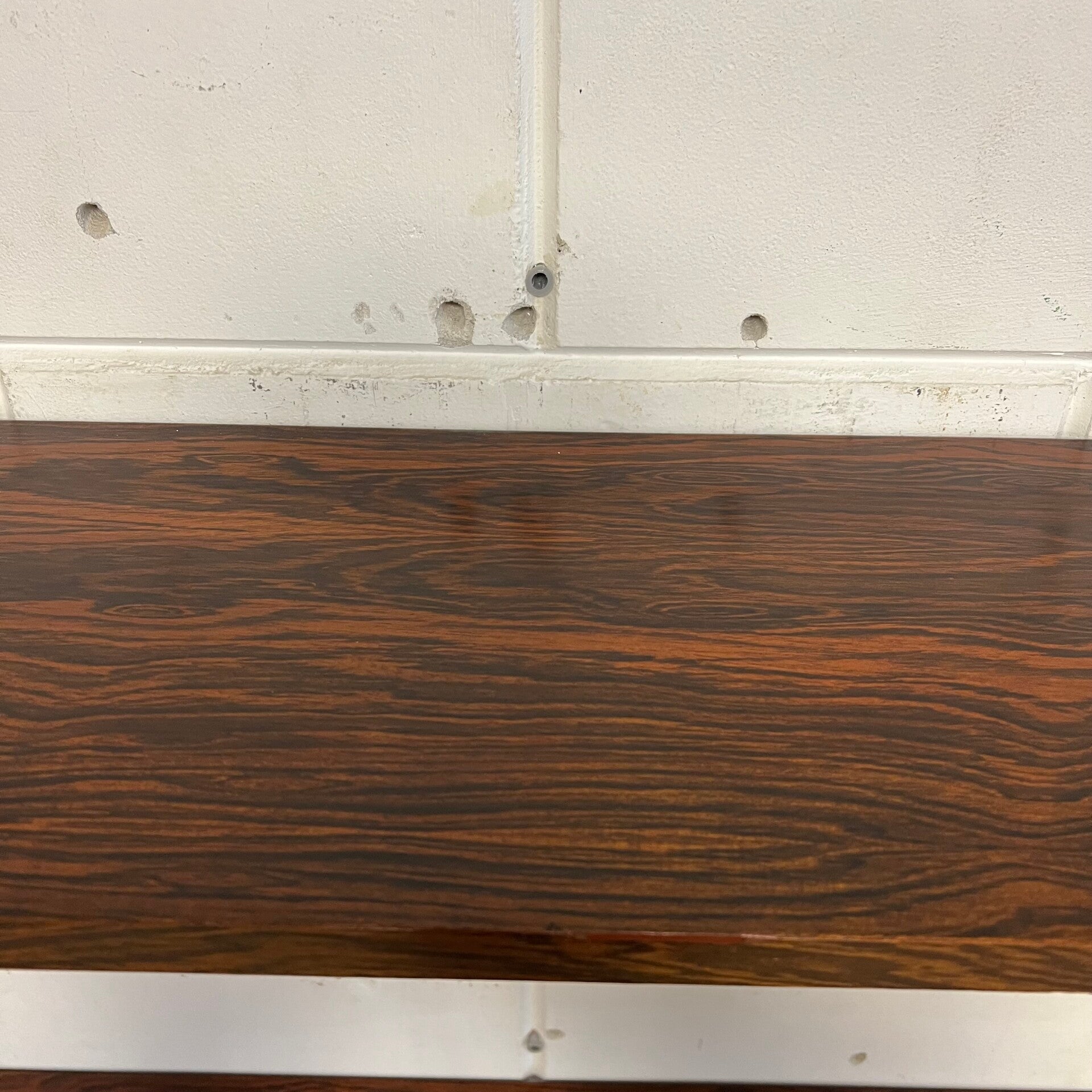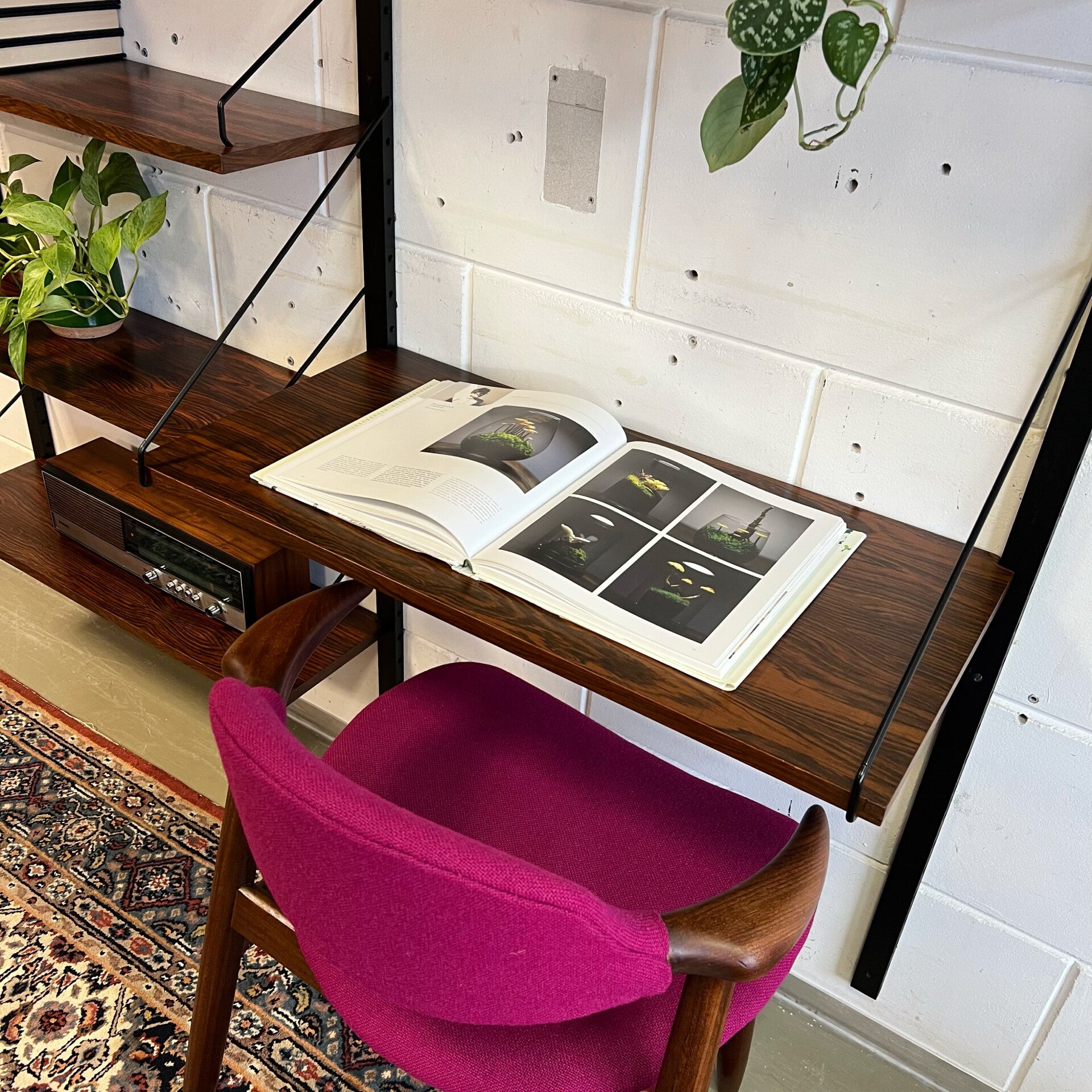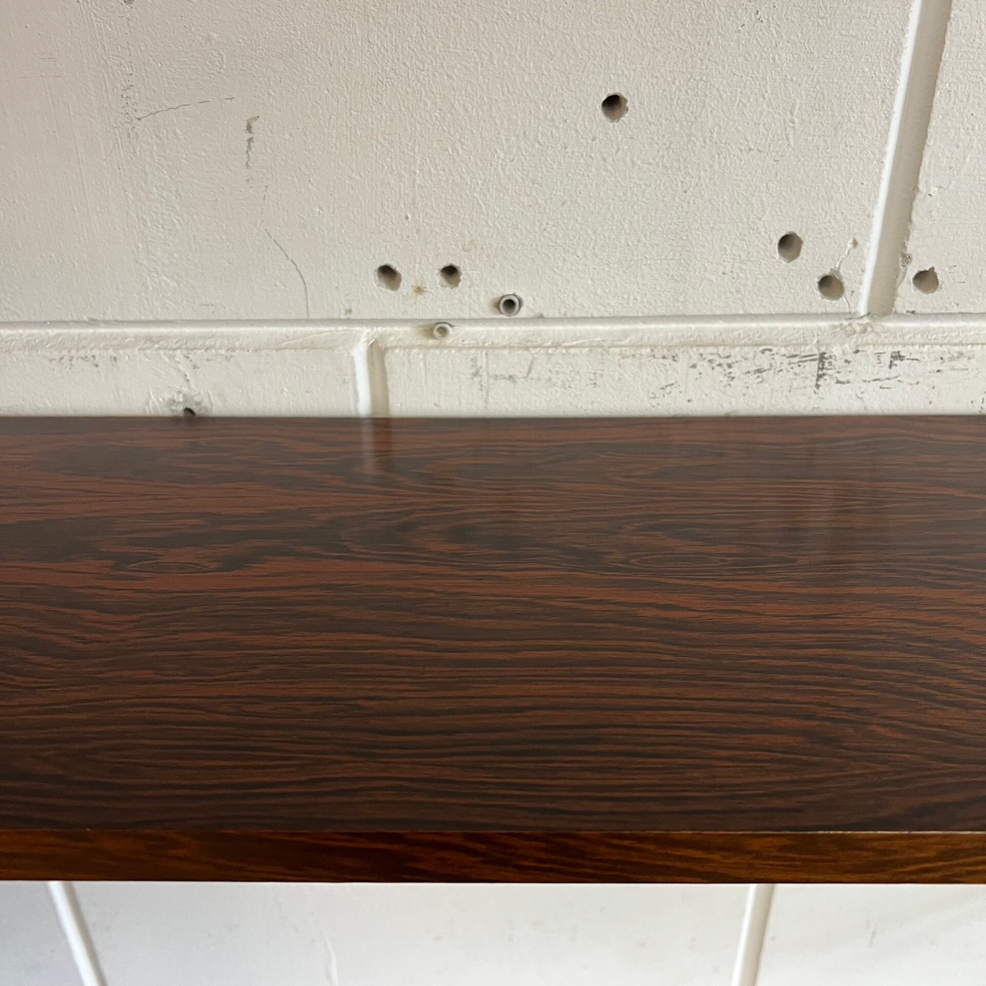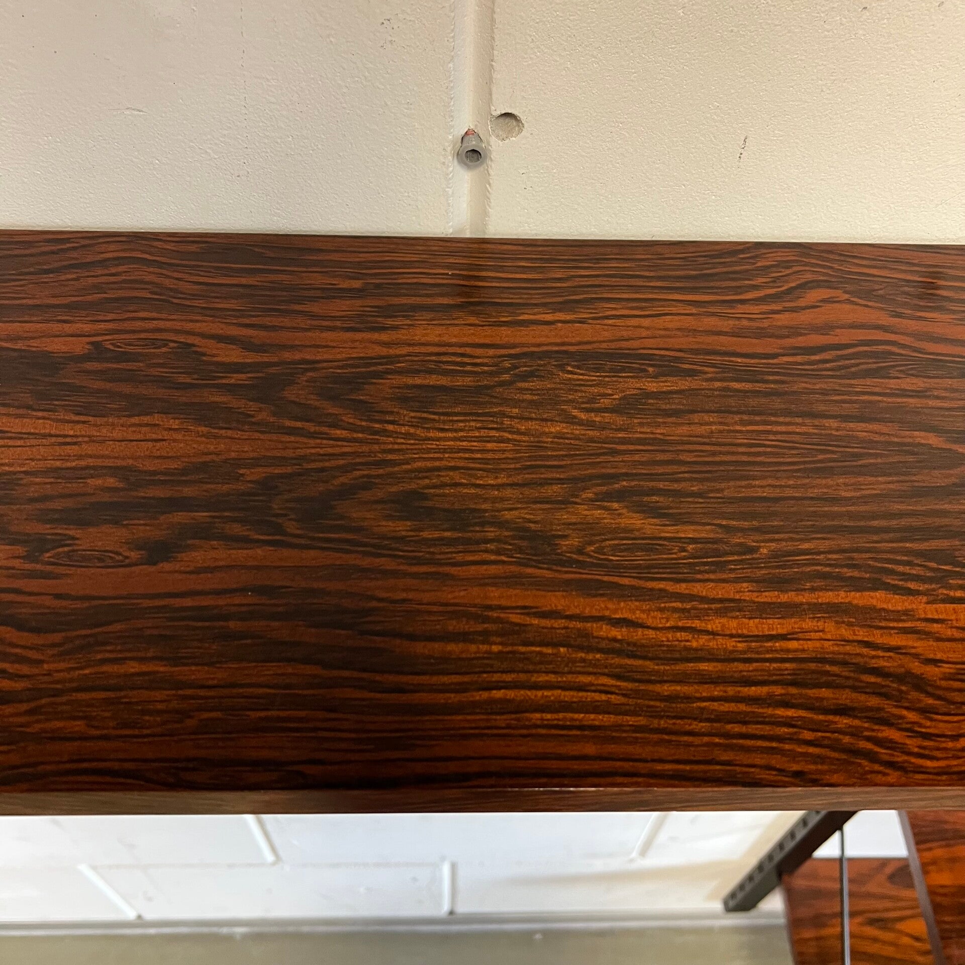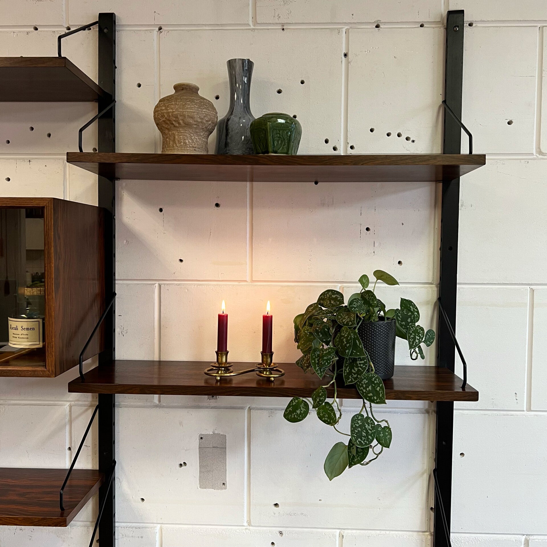 Mooi vintage wandmeubel, wall unit uitgevoerd in rosewood (fineer) met zwart metalen beugels en zwart houten wandlatten.
