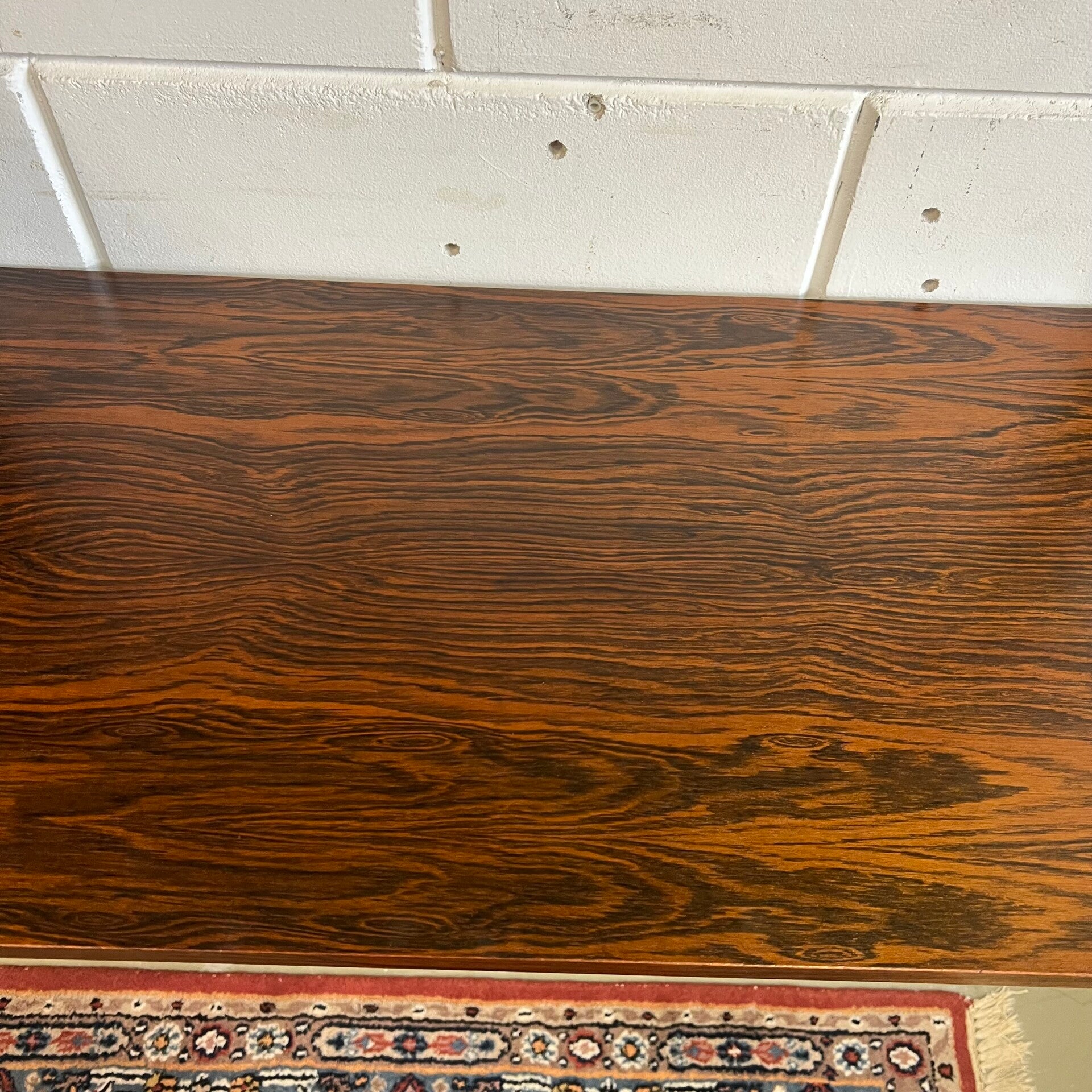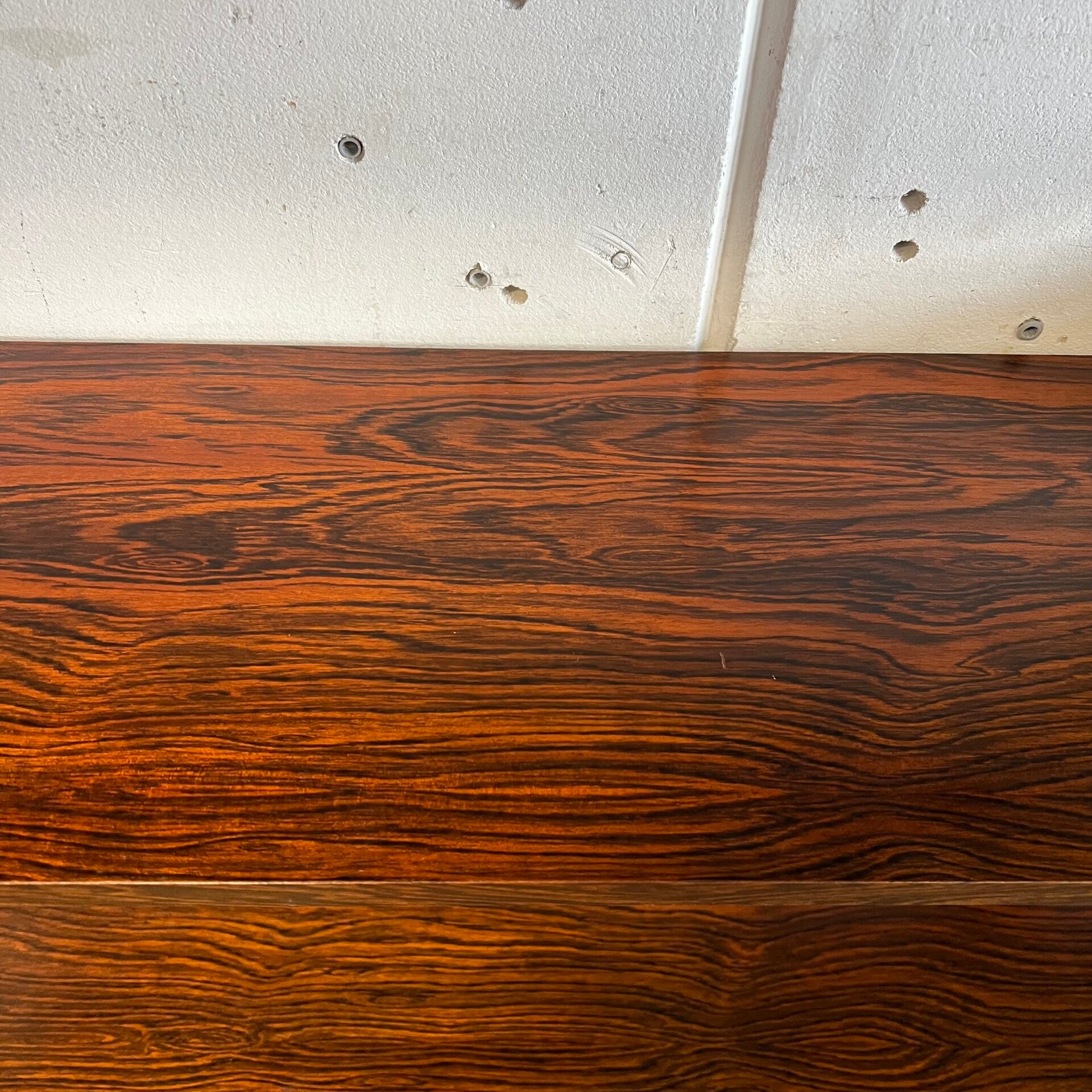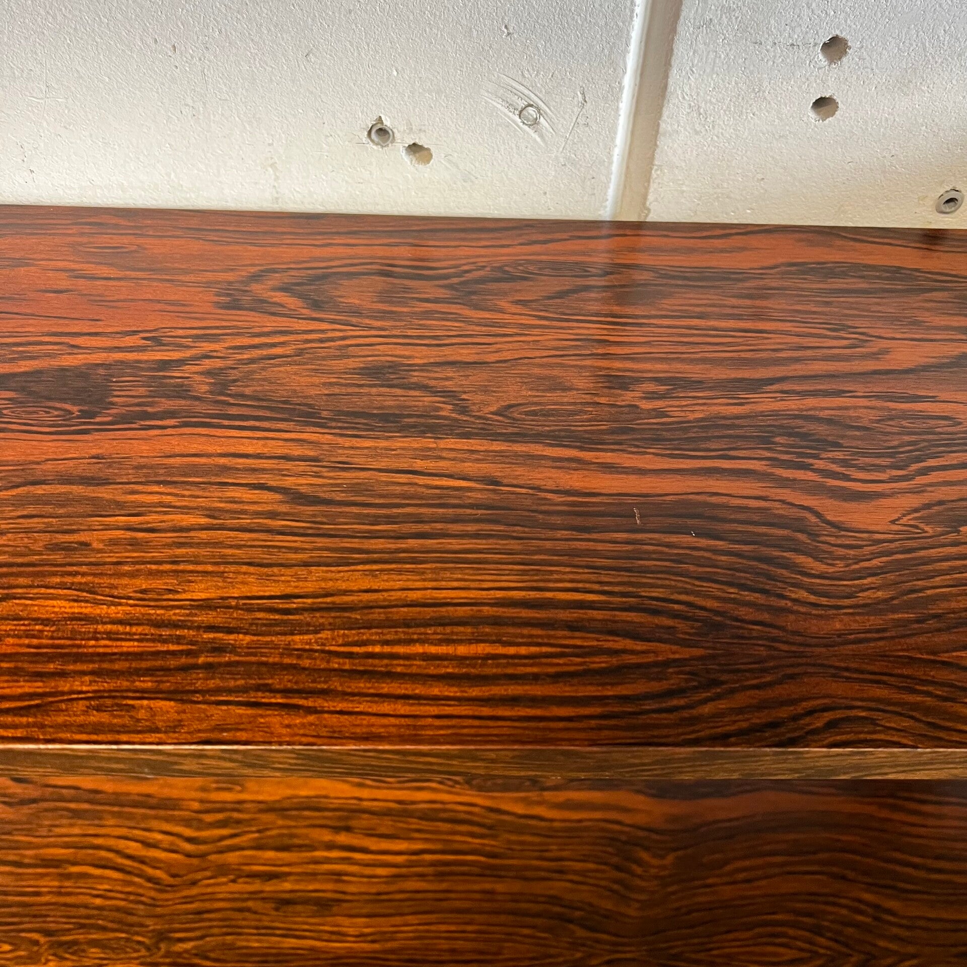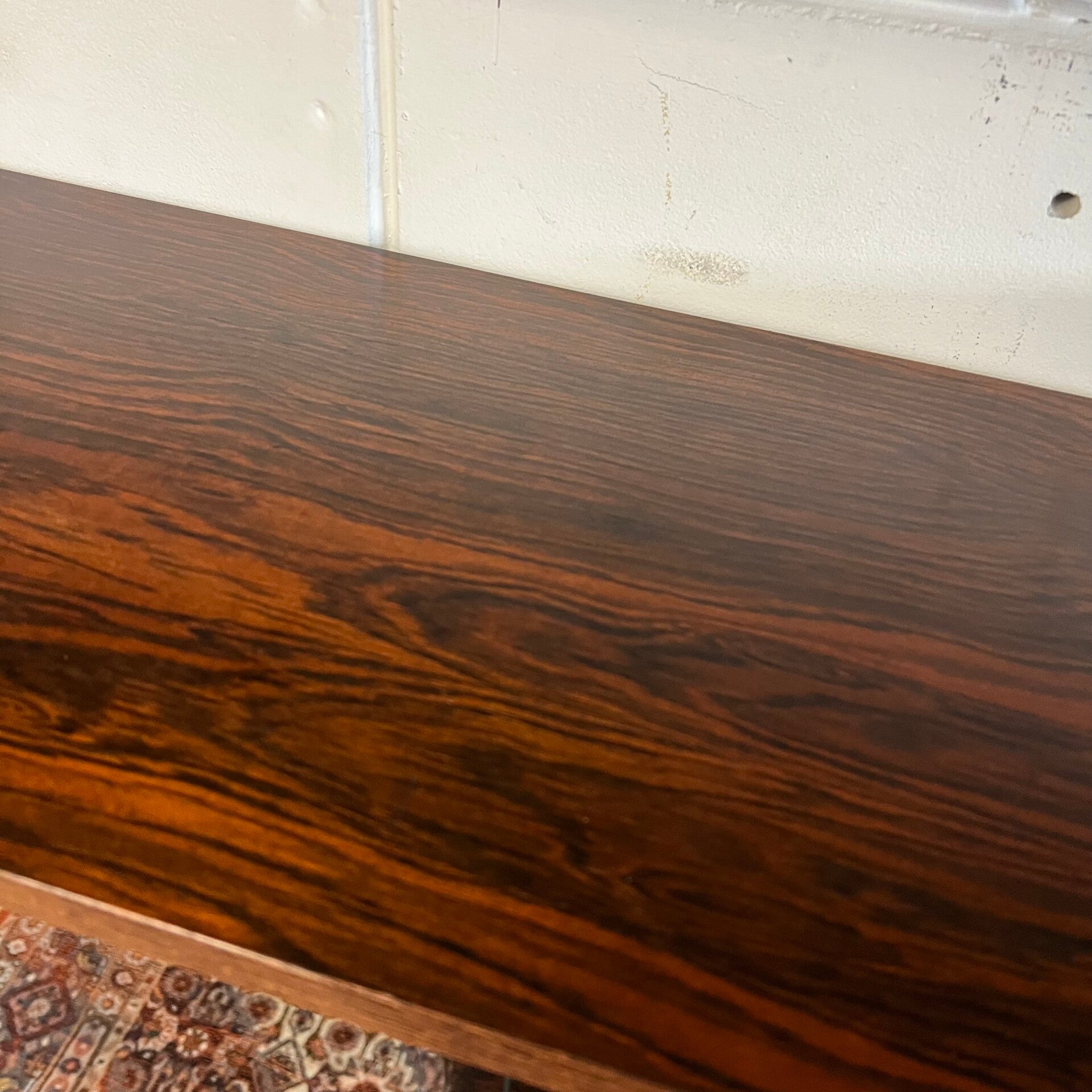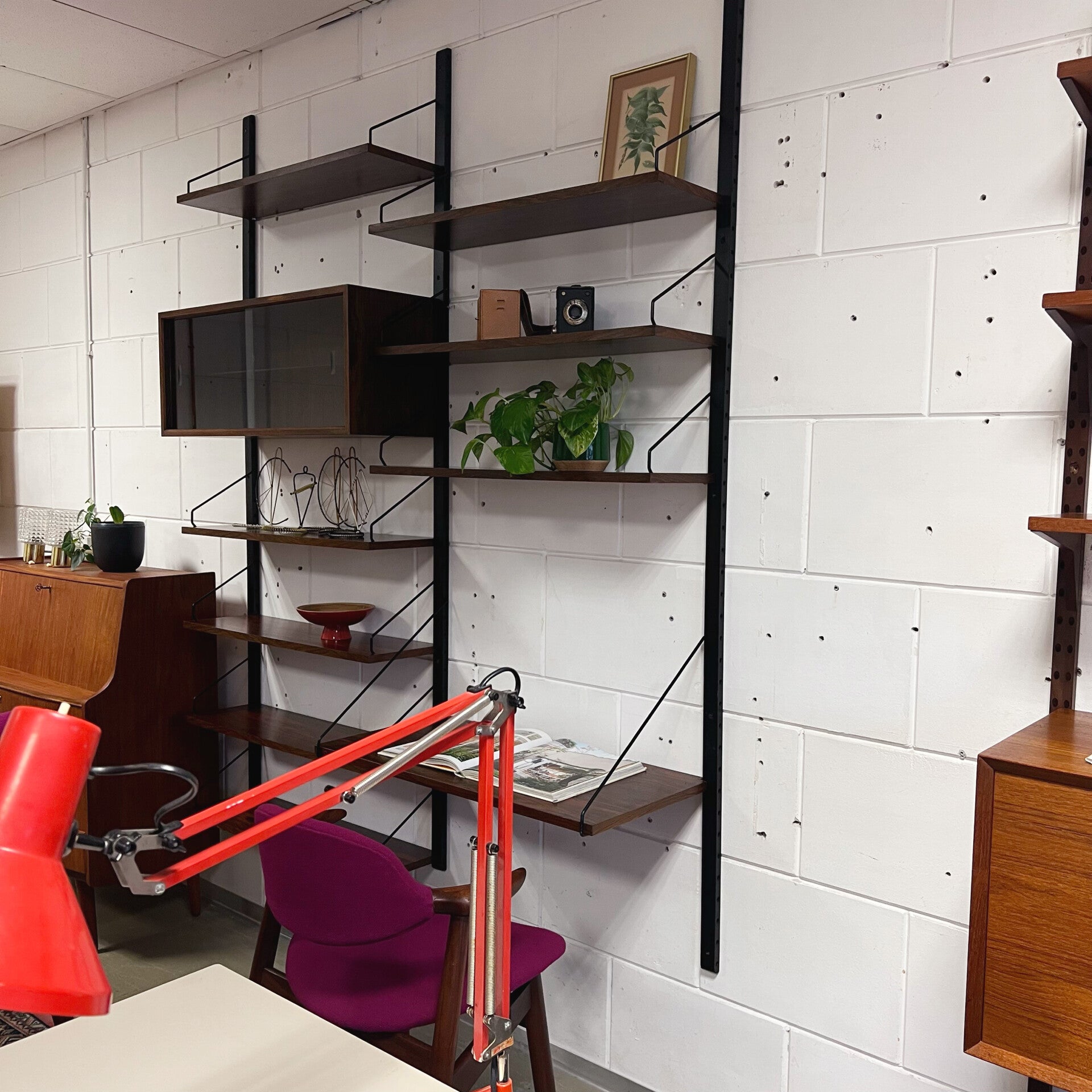 Mooi vintage wandmeubel, wall unit uitgevoerd in rosewood (fineer) met zwart metalen beugels en zwart houten wandlatten.