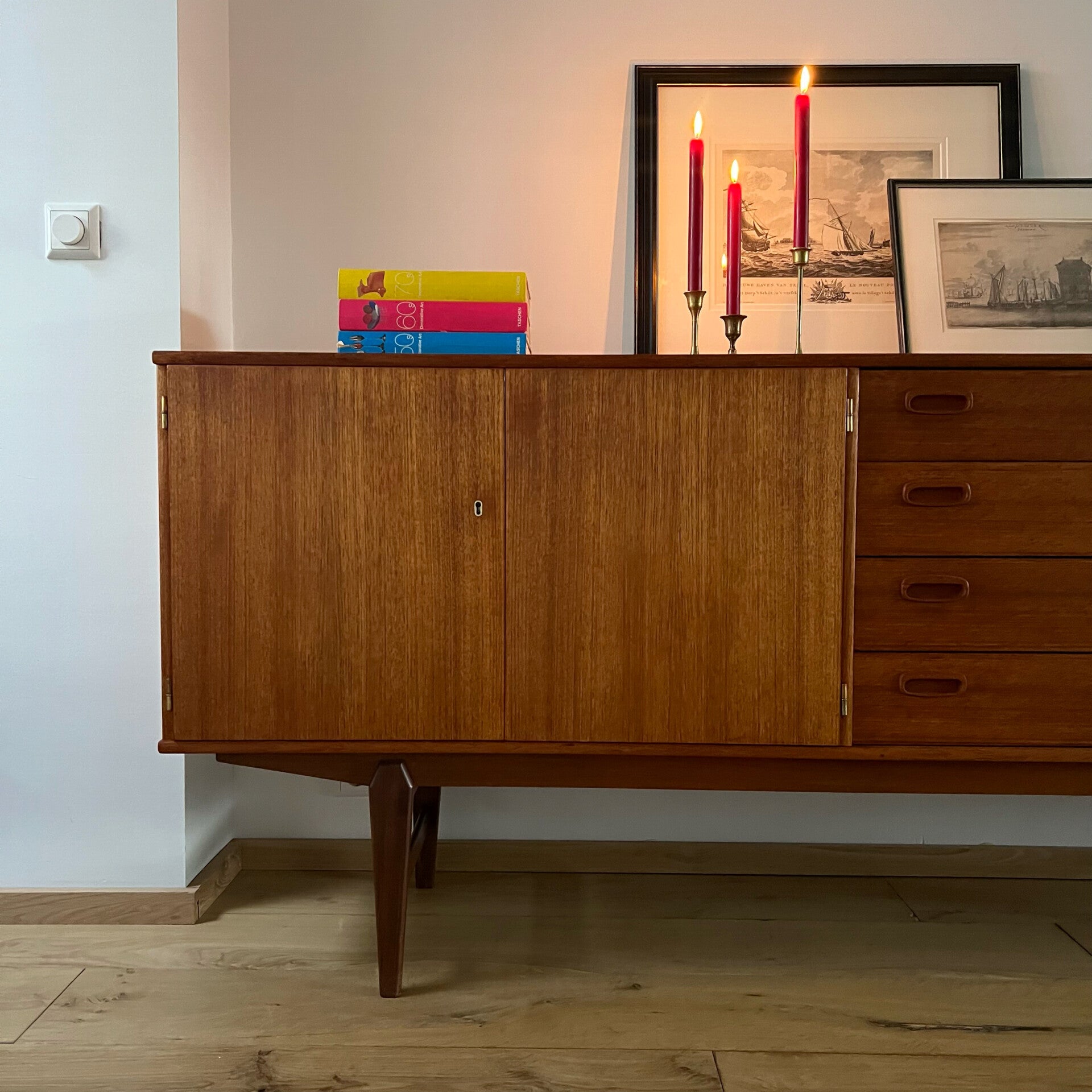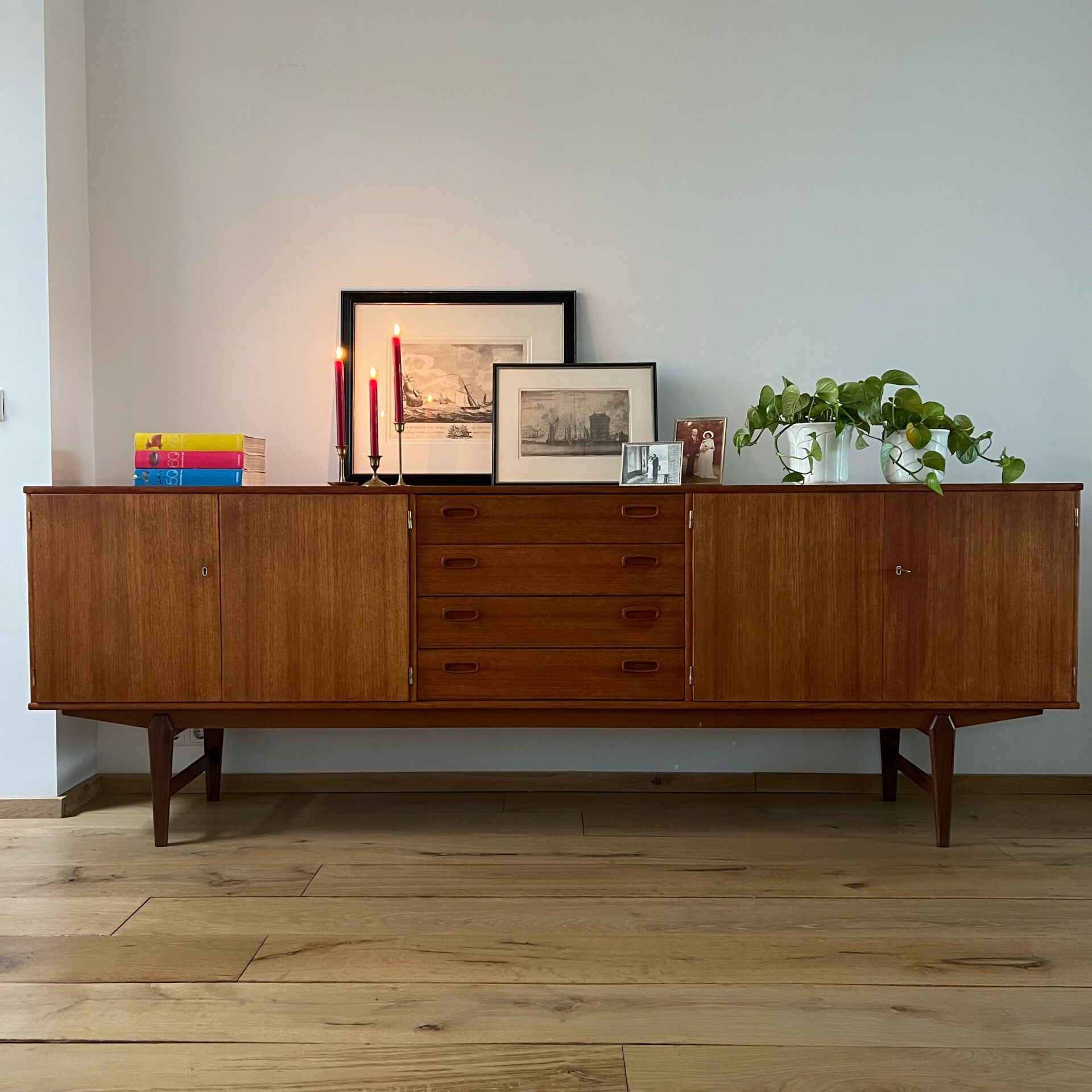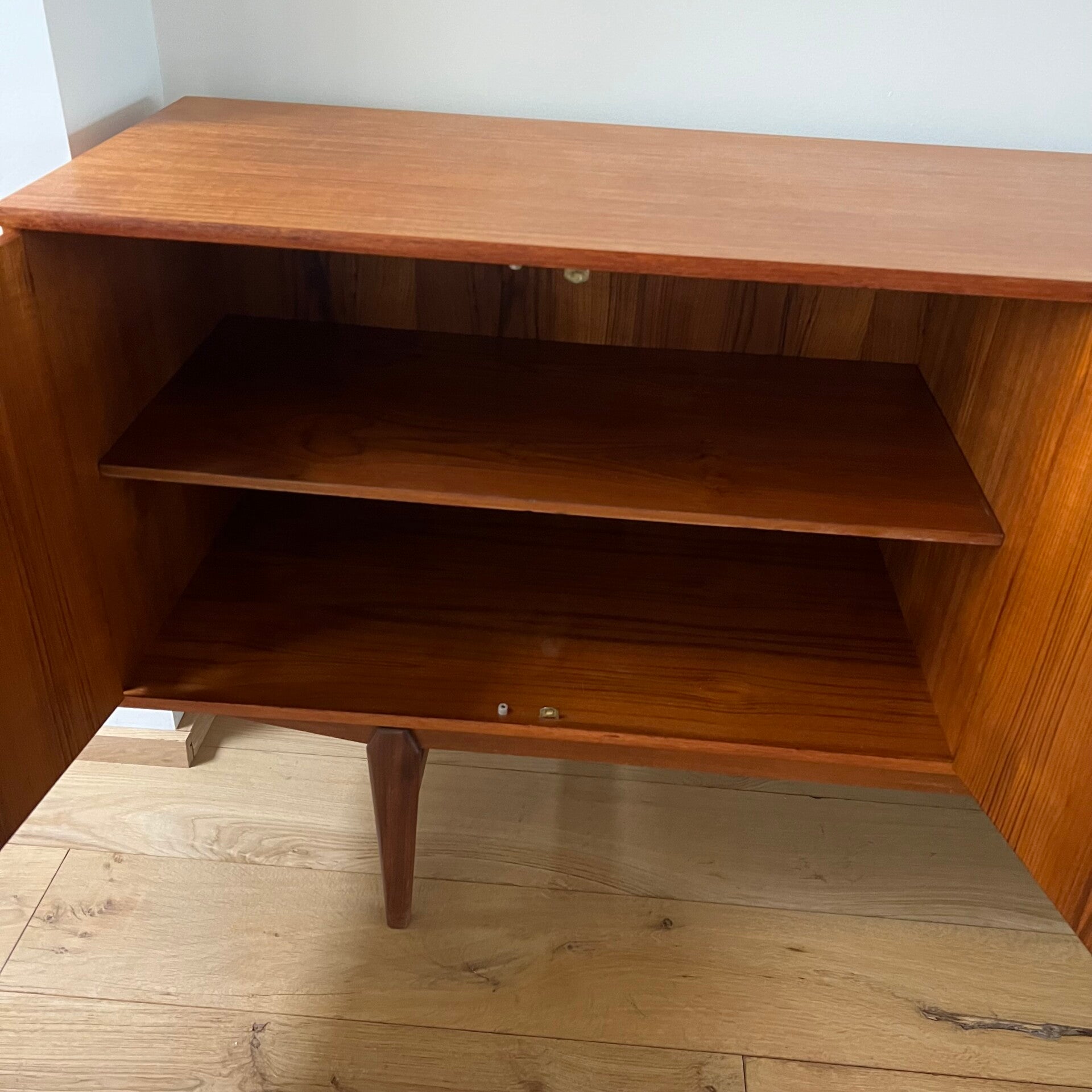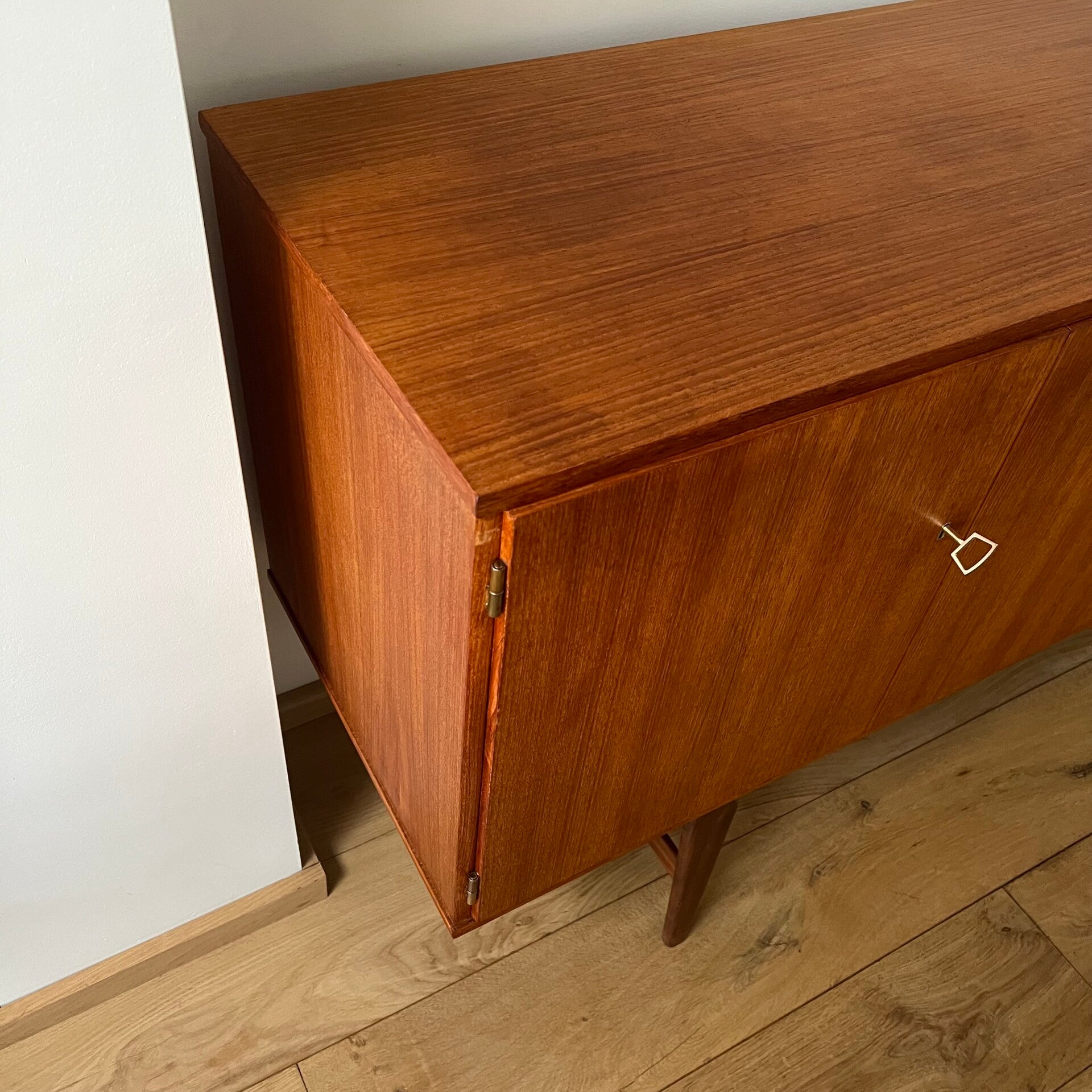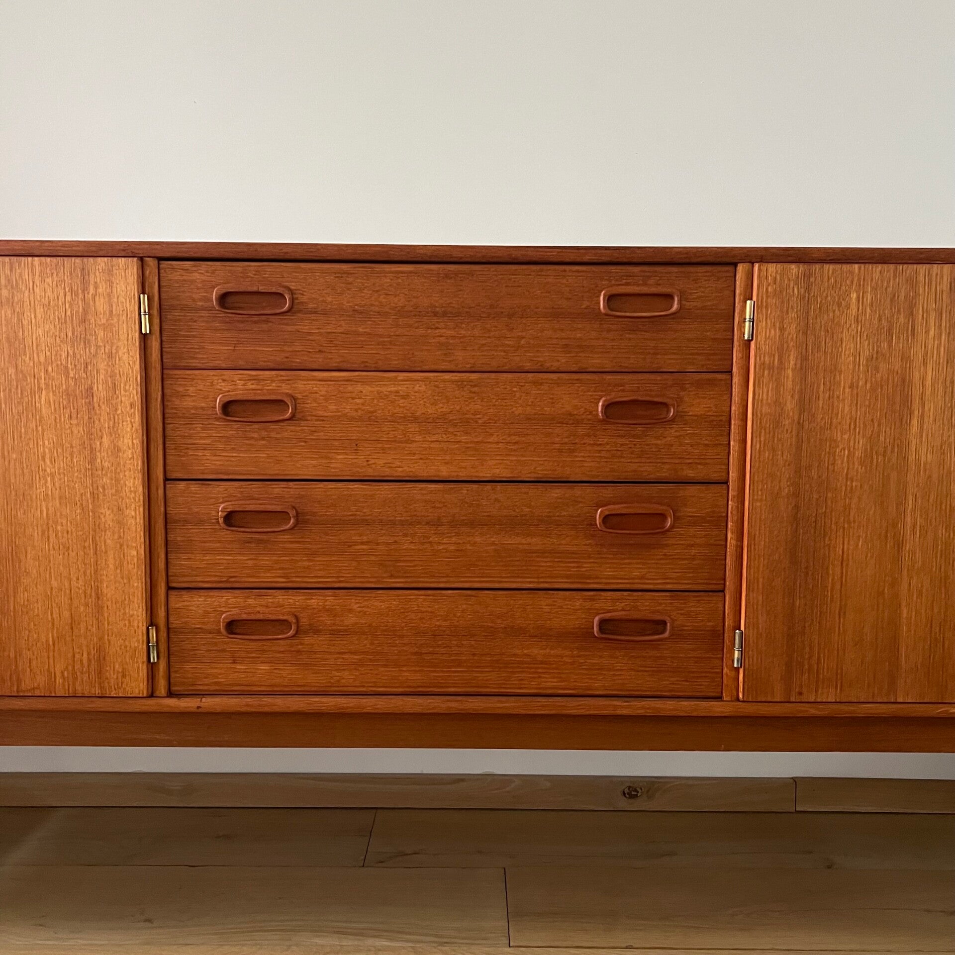 Prachtig vintage XL dressoir, uitgevoerd in teak (fineer) met massief teak onderstel.