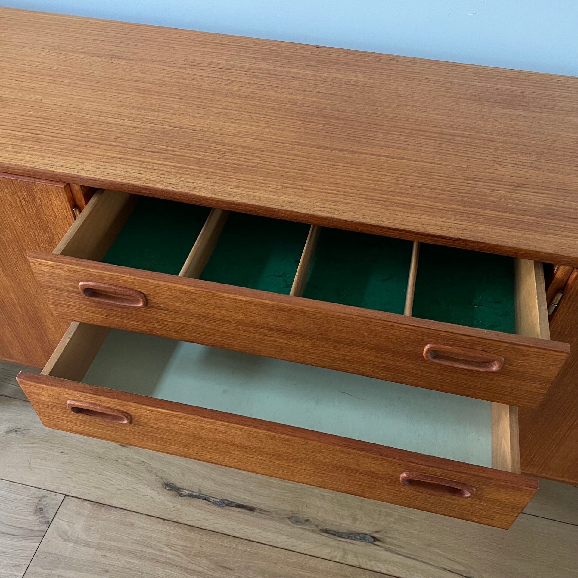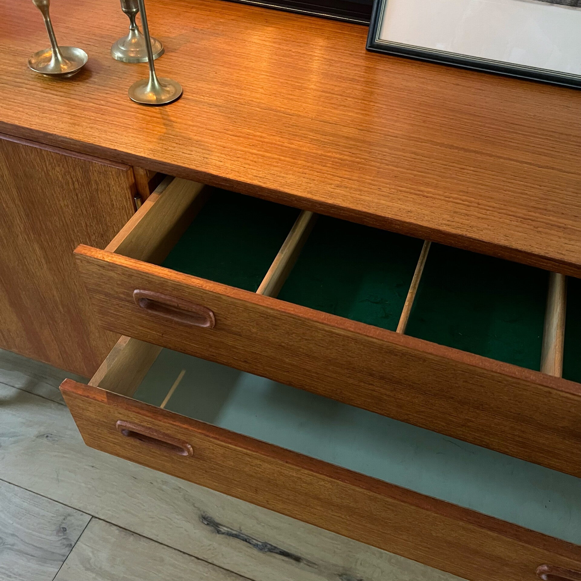 In het midden 4 ruime lades, waarvan de bovenste met vakverdeling en groen vilt.