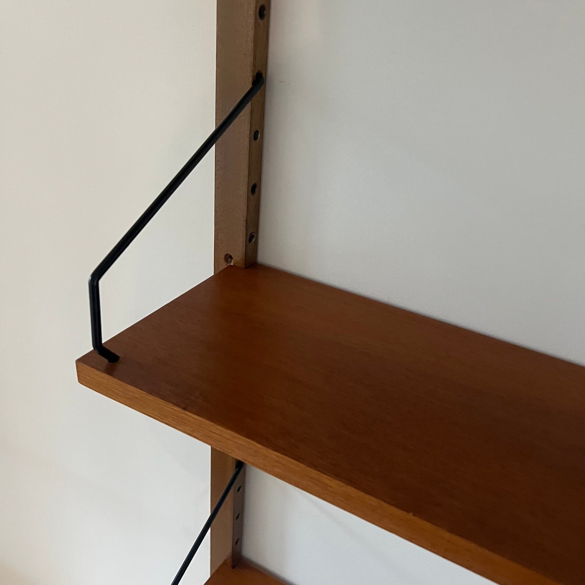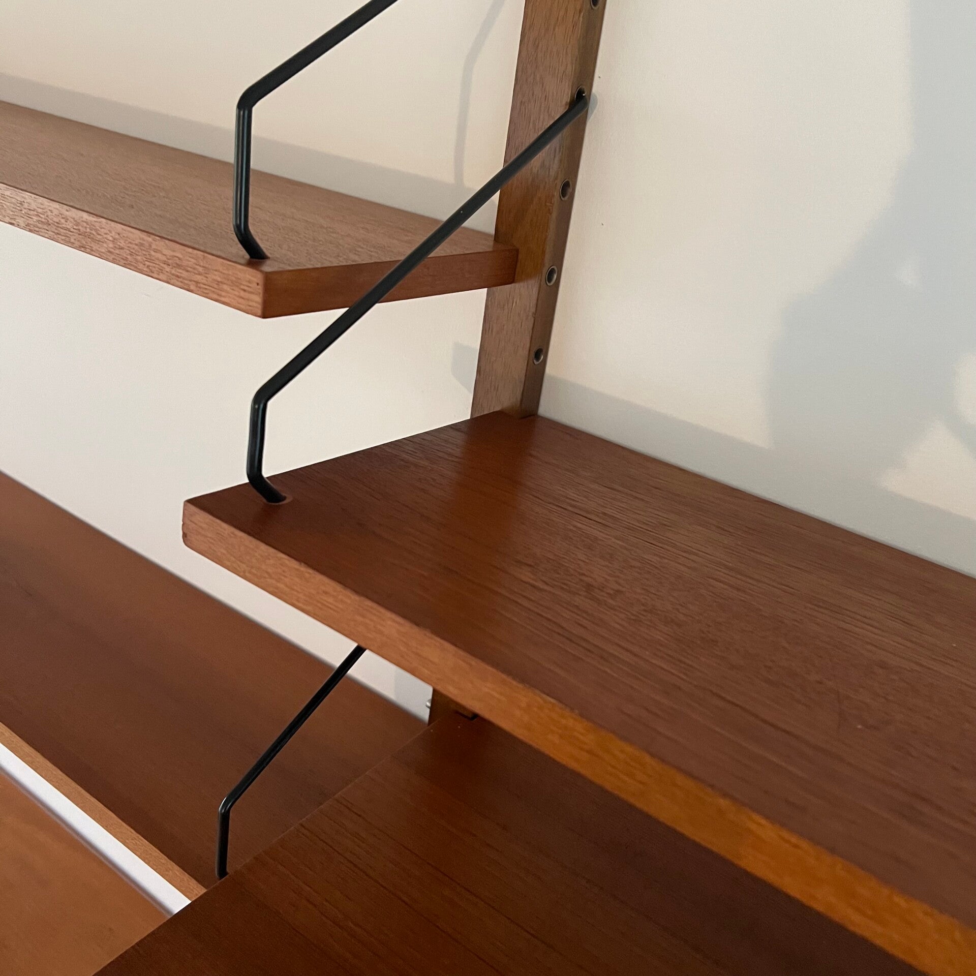 Uitgevoerd in teak (fineer) met houten wandlatten en zwart metalen beugels.