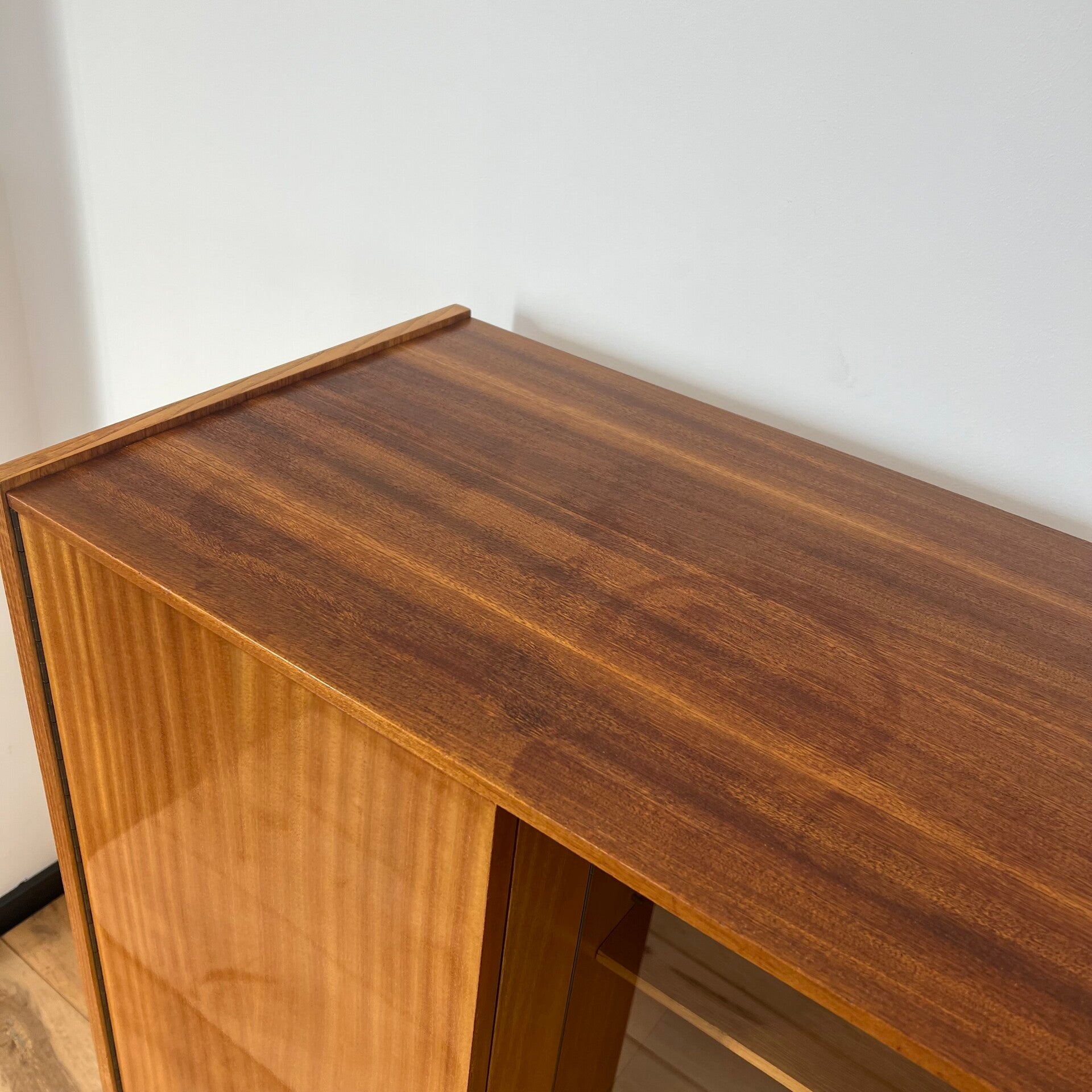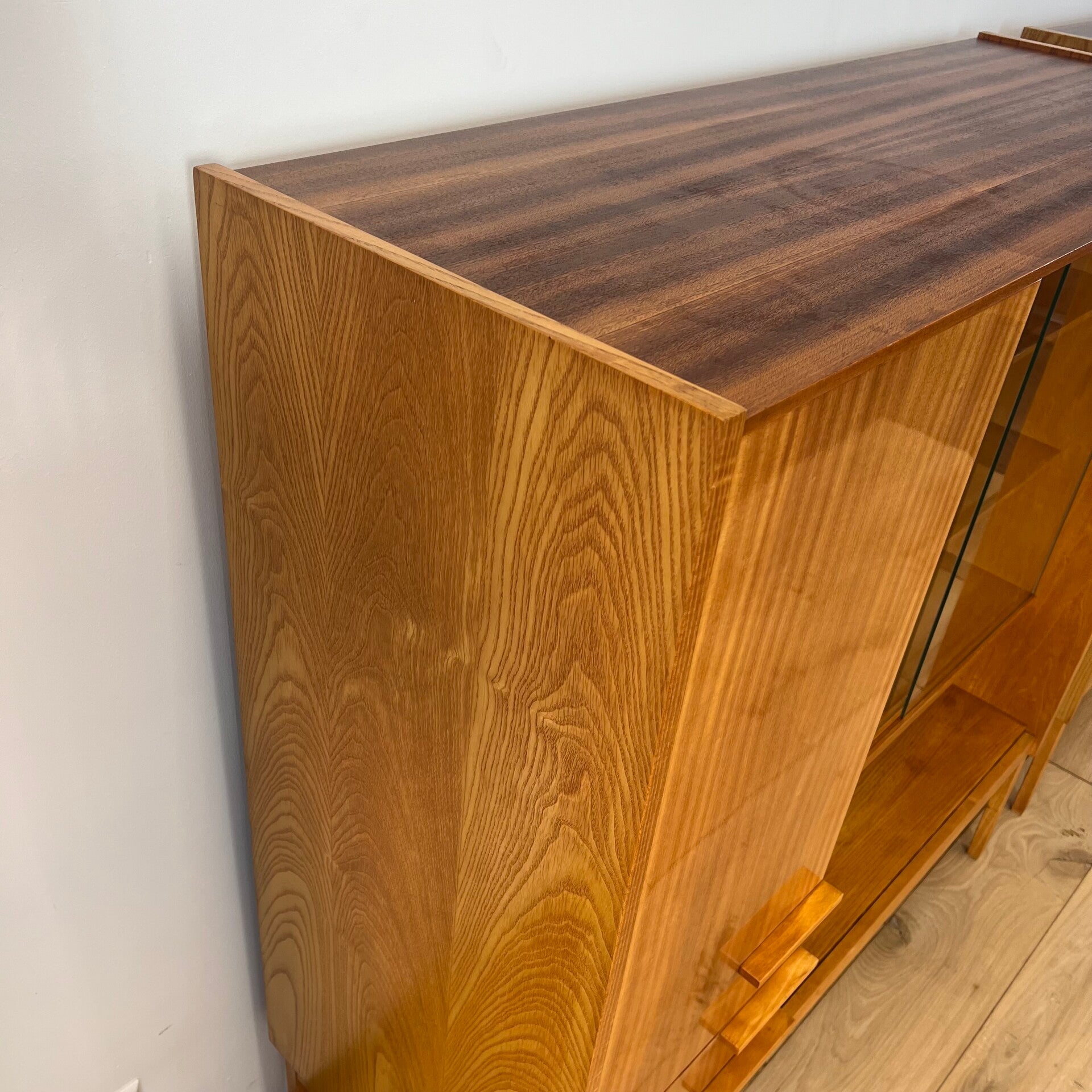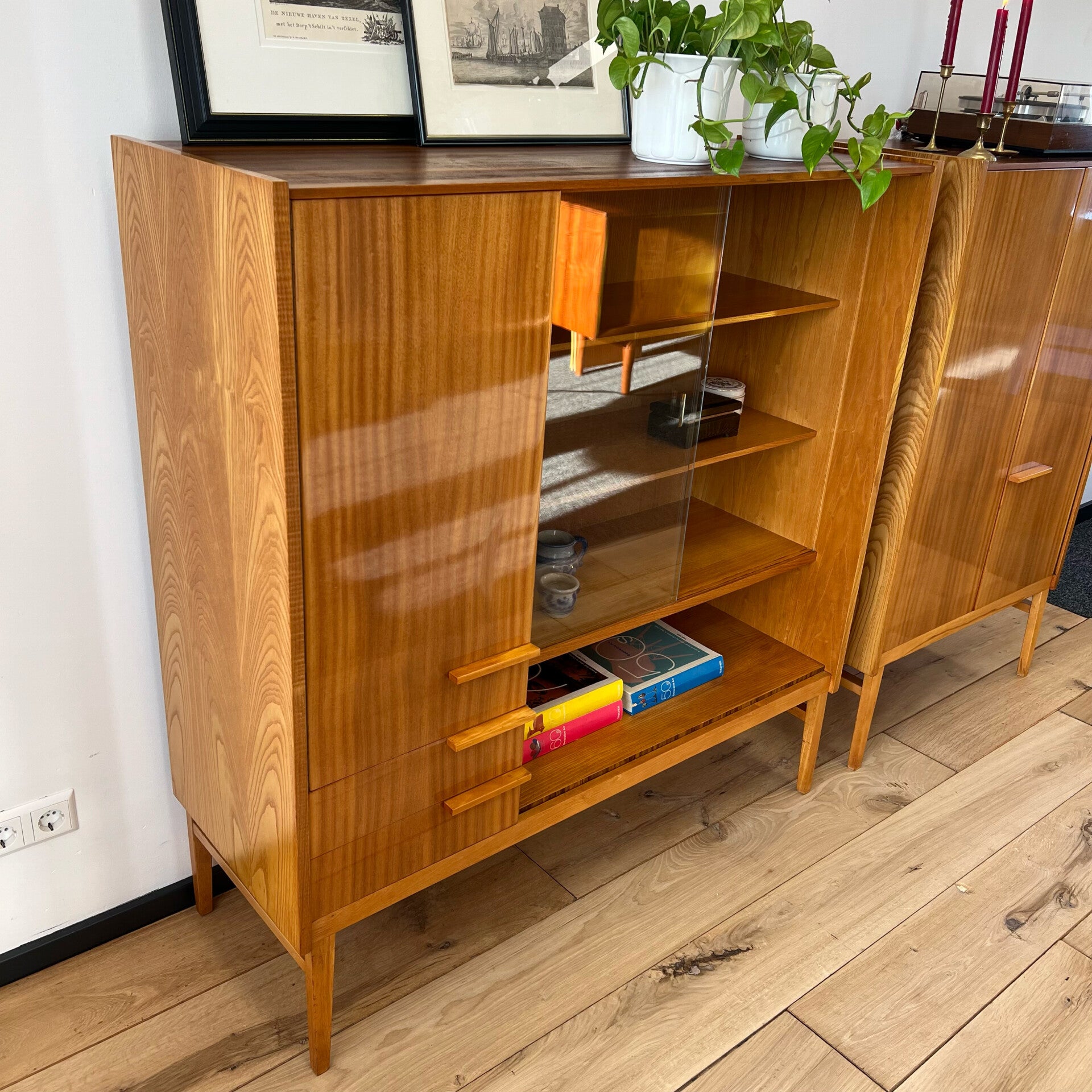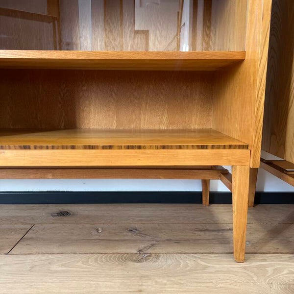Mooie vitrinekast of buffetkast, uitgevoerd in een combinatie van mahonie-, en essenhout (fineer) met leuke grepen en slanke poten.