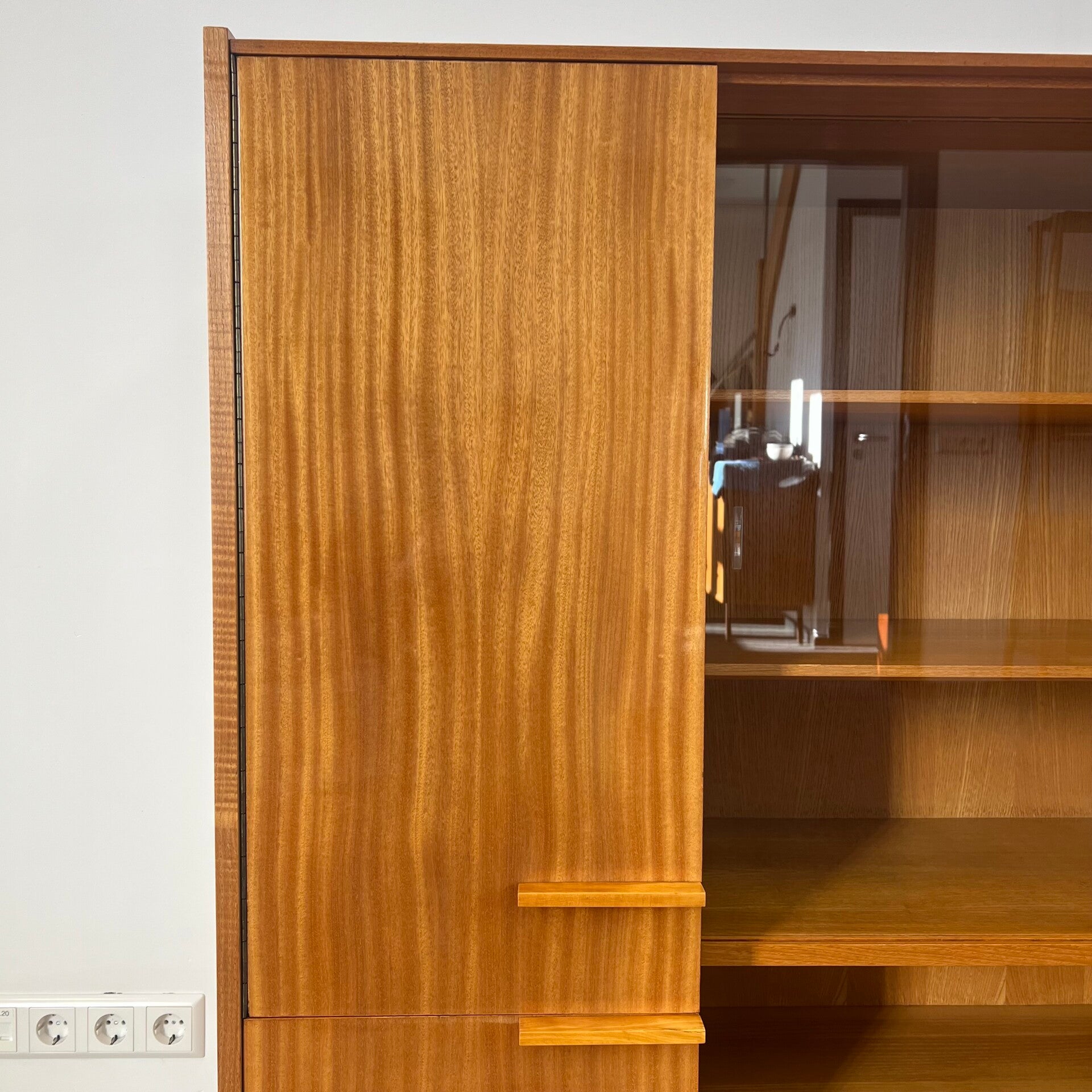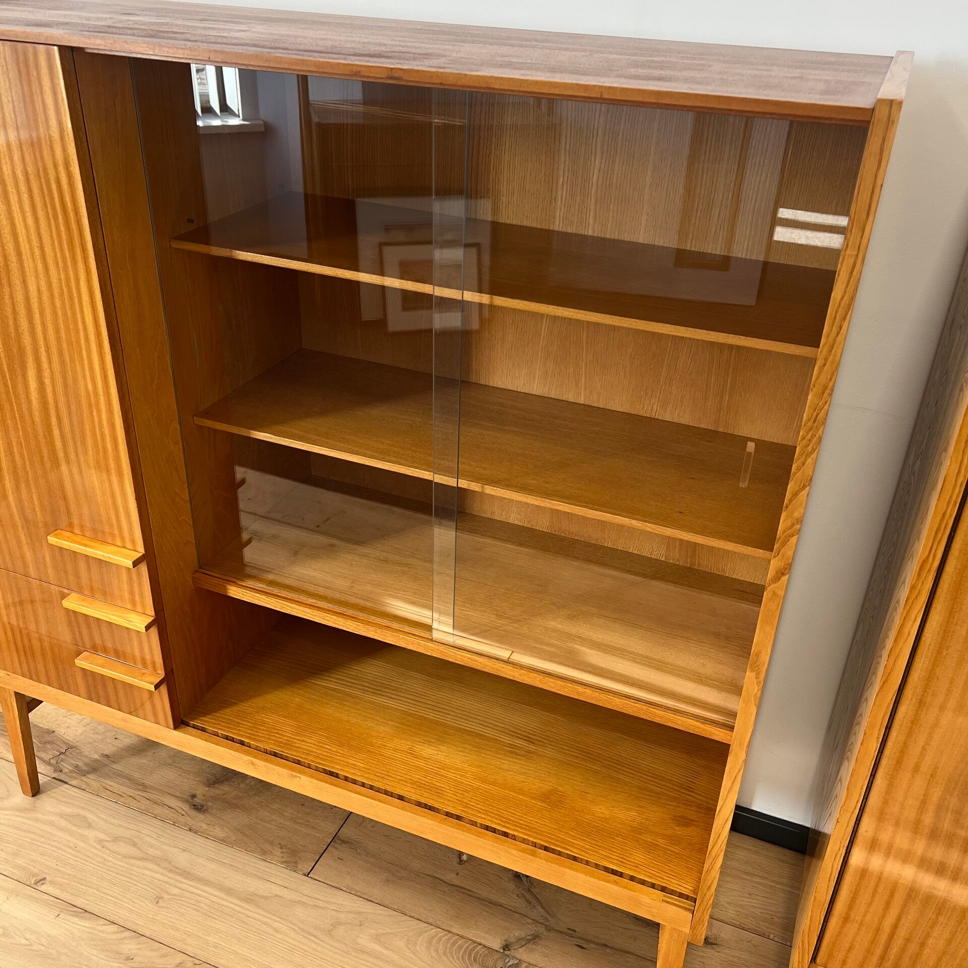 Rechts een glazen vitrinedeel met 2 glazen schuifdeuren (enkele niet opvallende chipjes) en 2 uitneembare planken.