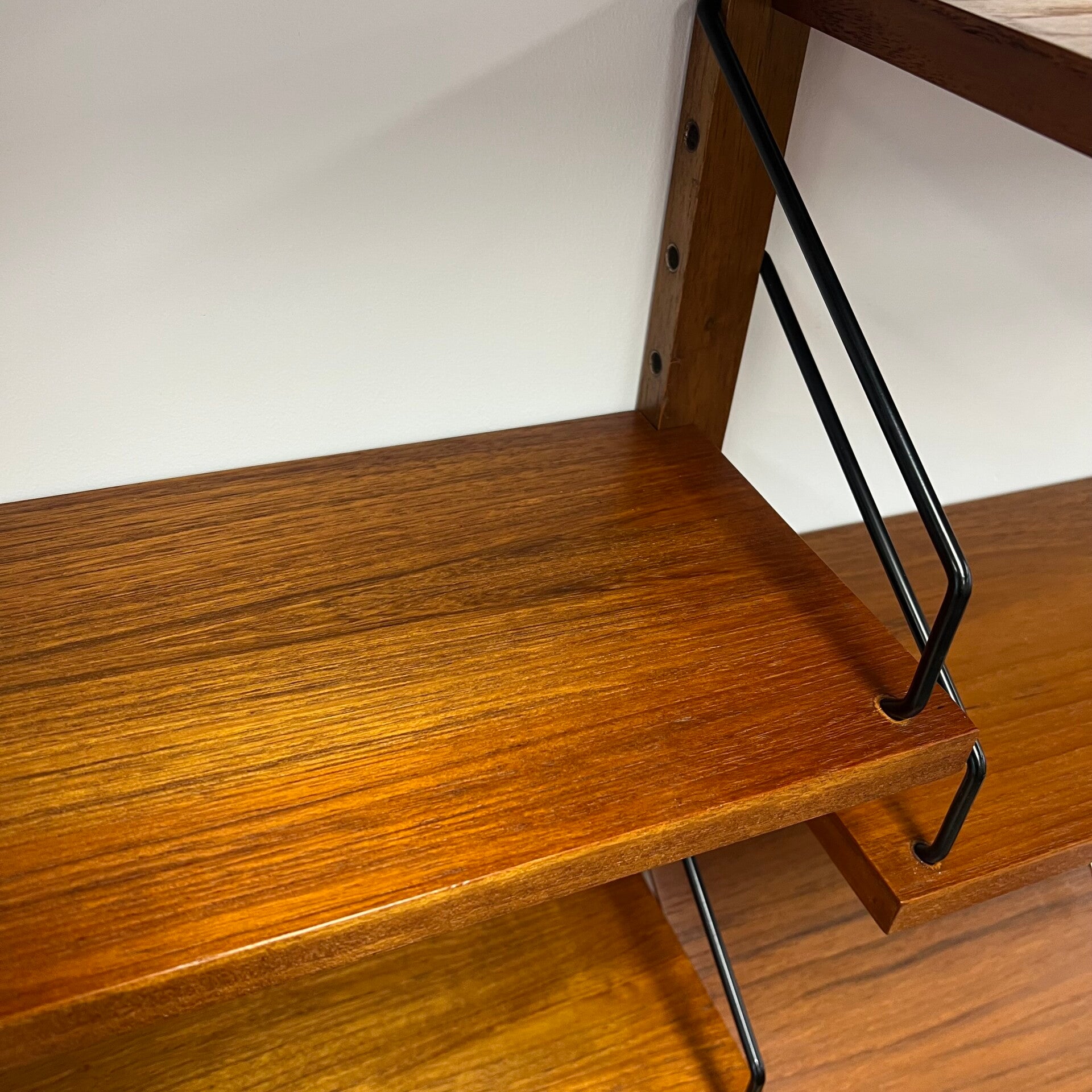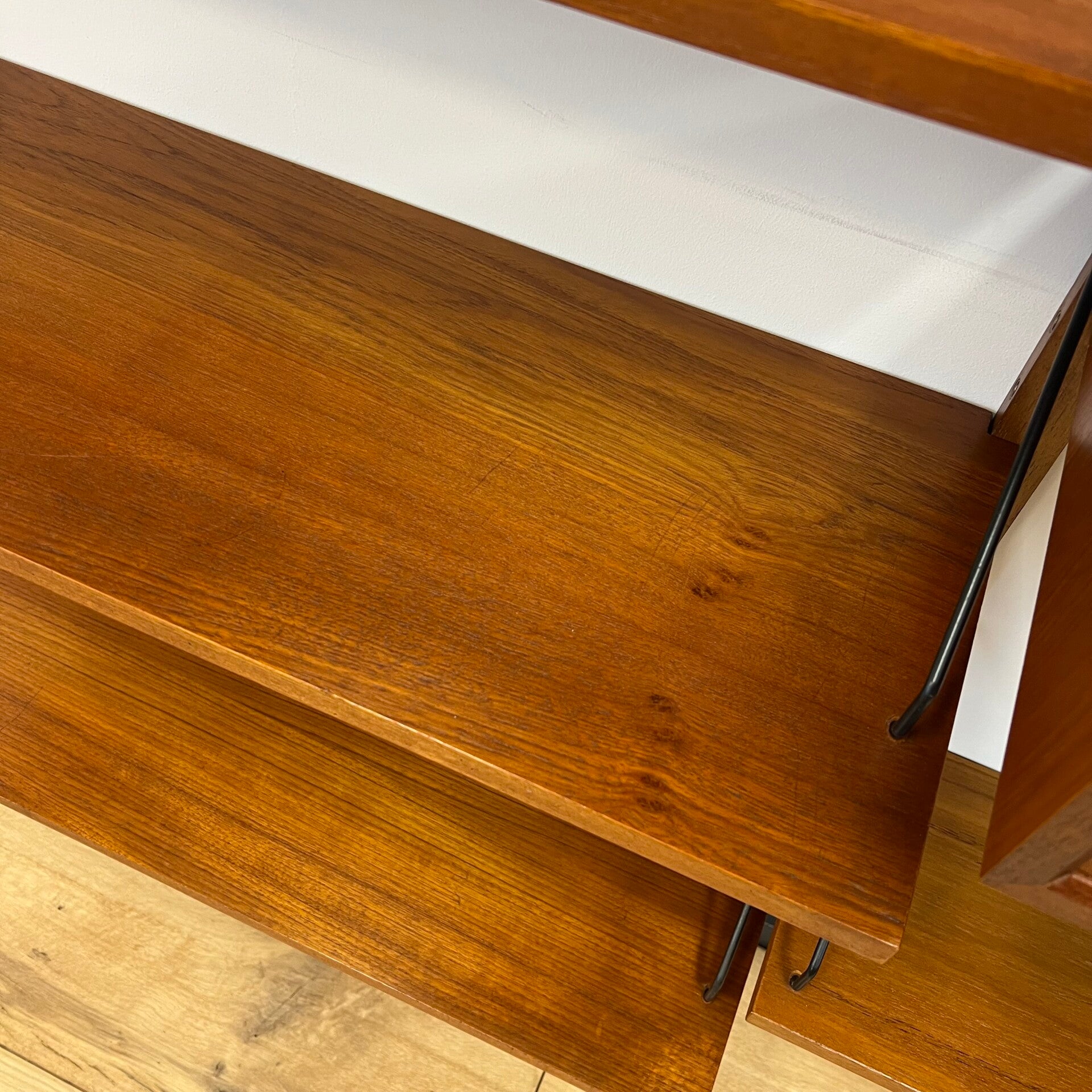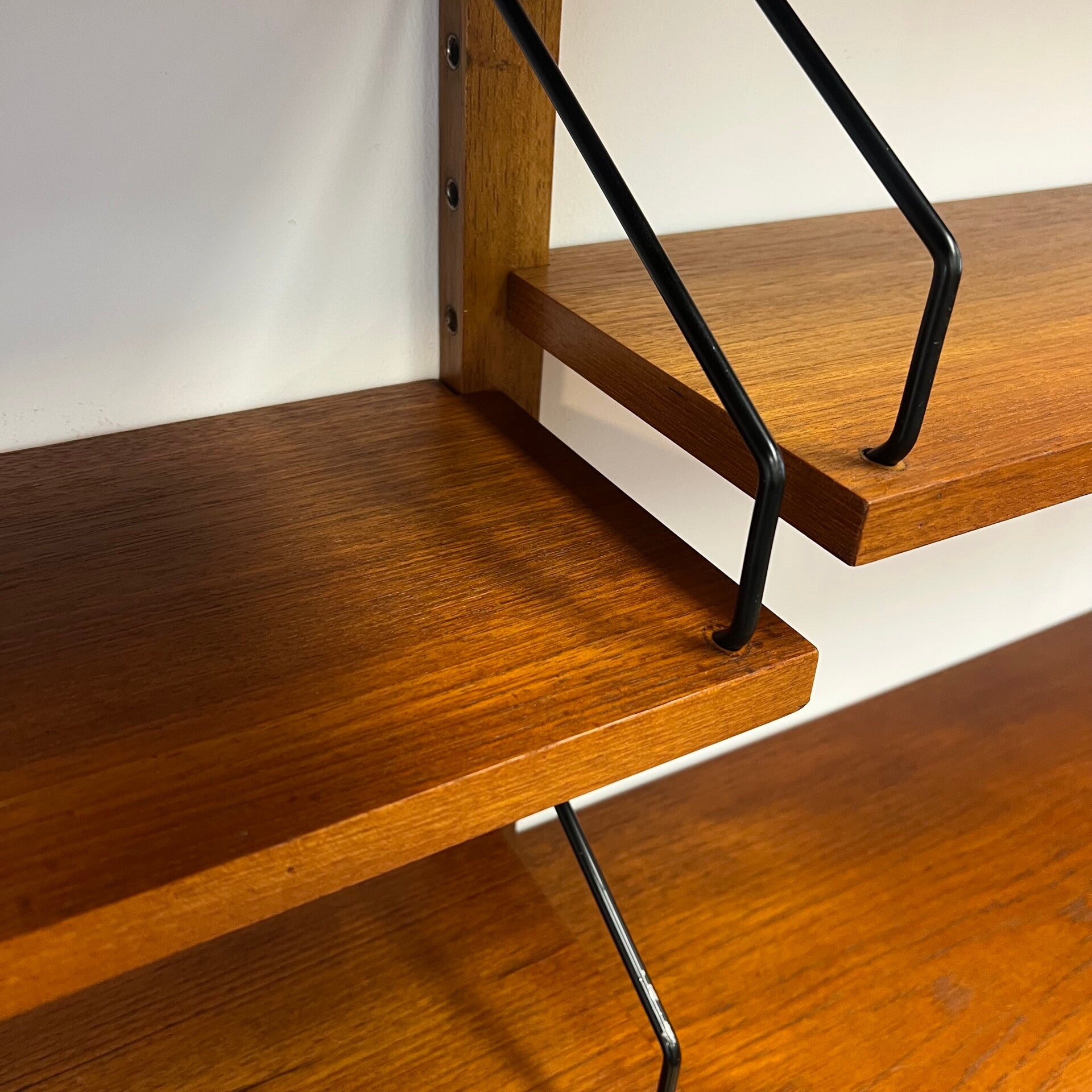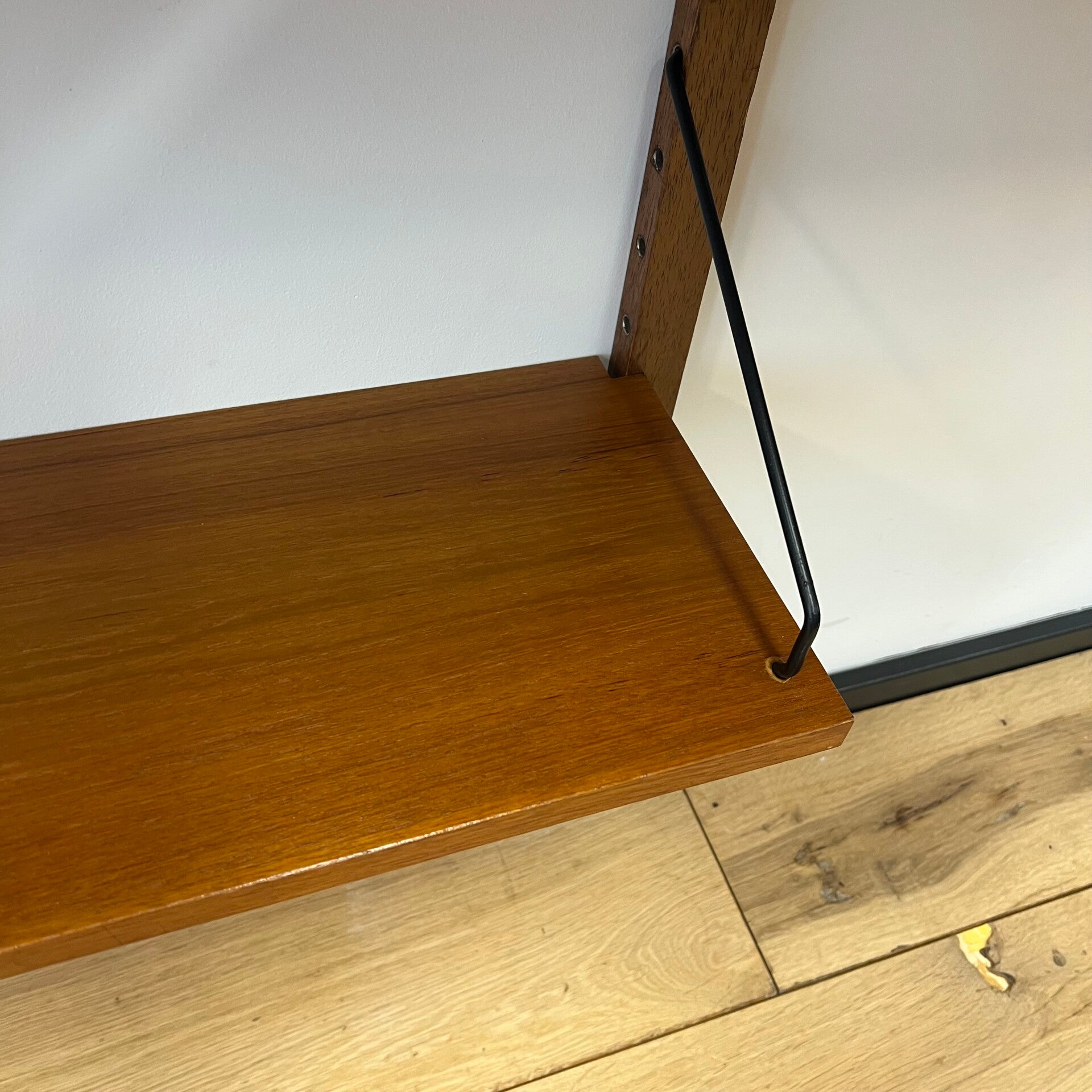 Uitgevoerd in teak (fineer) met houten wandlatten en zwart metalen beugels.