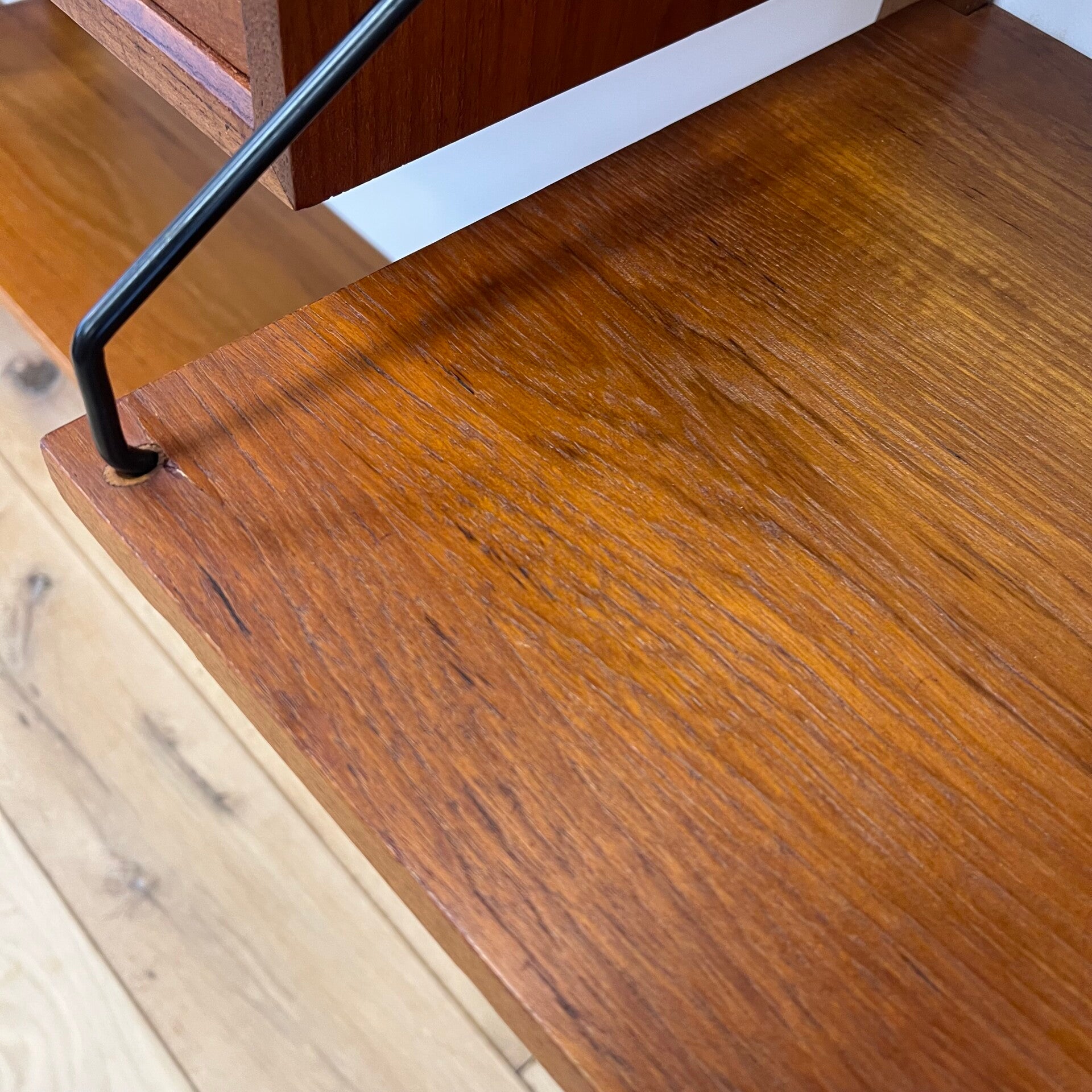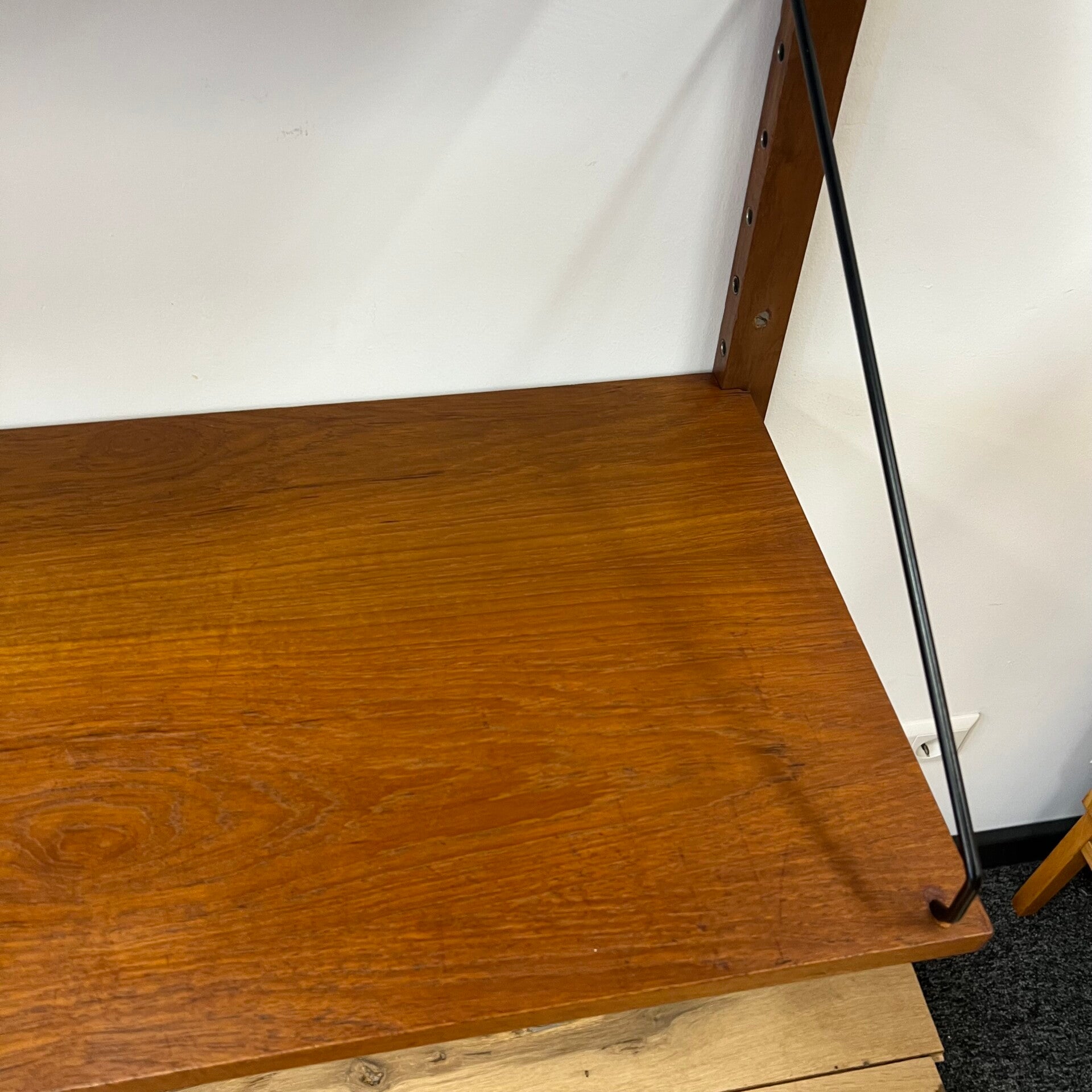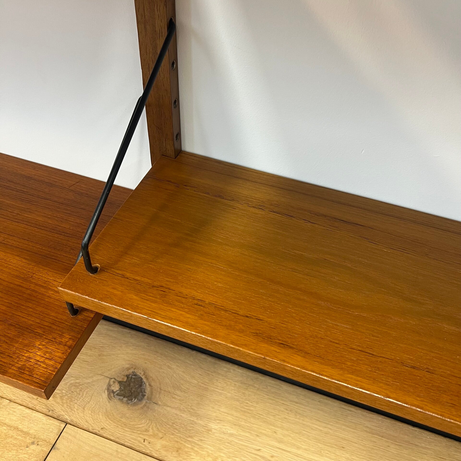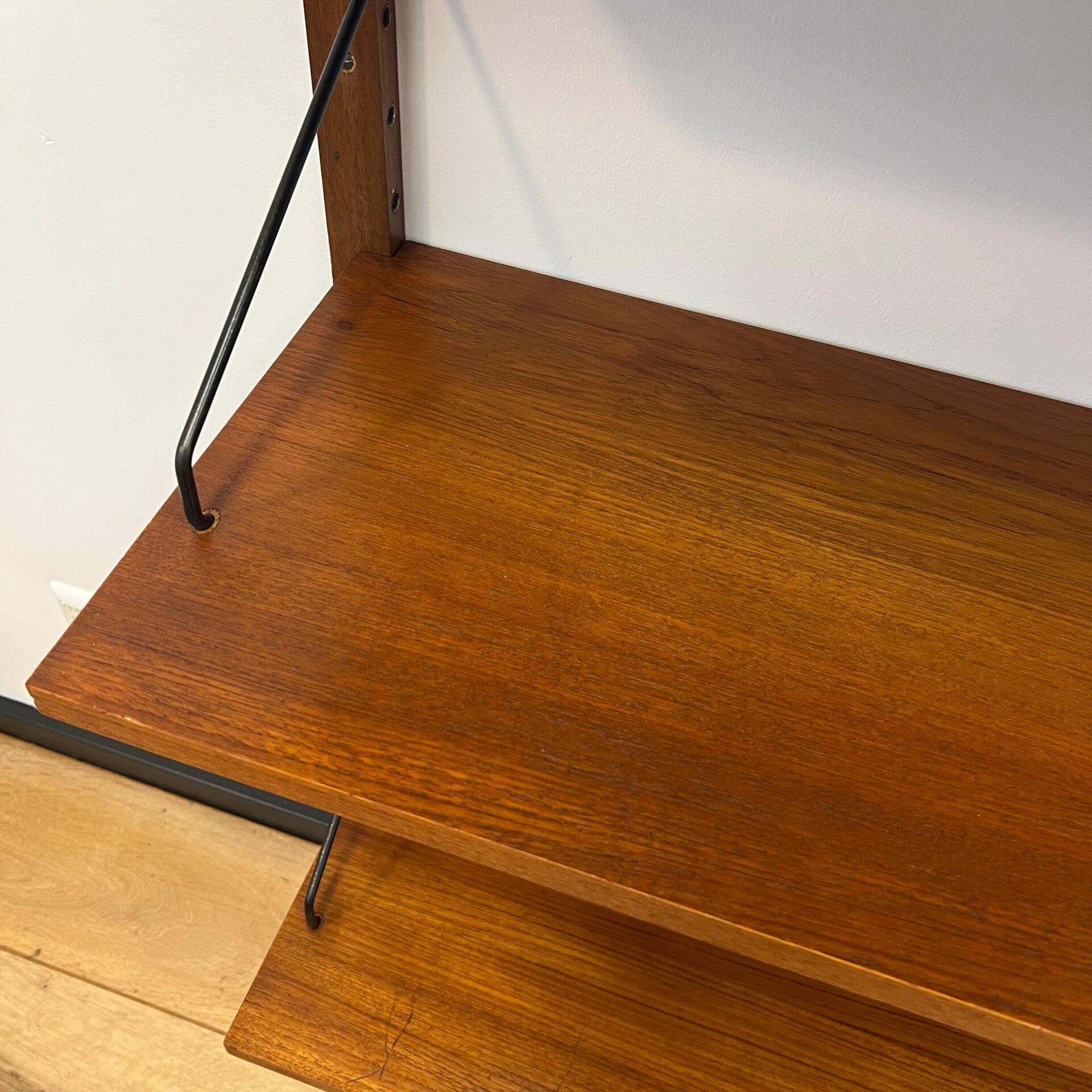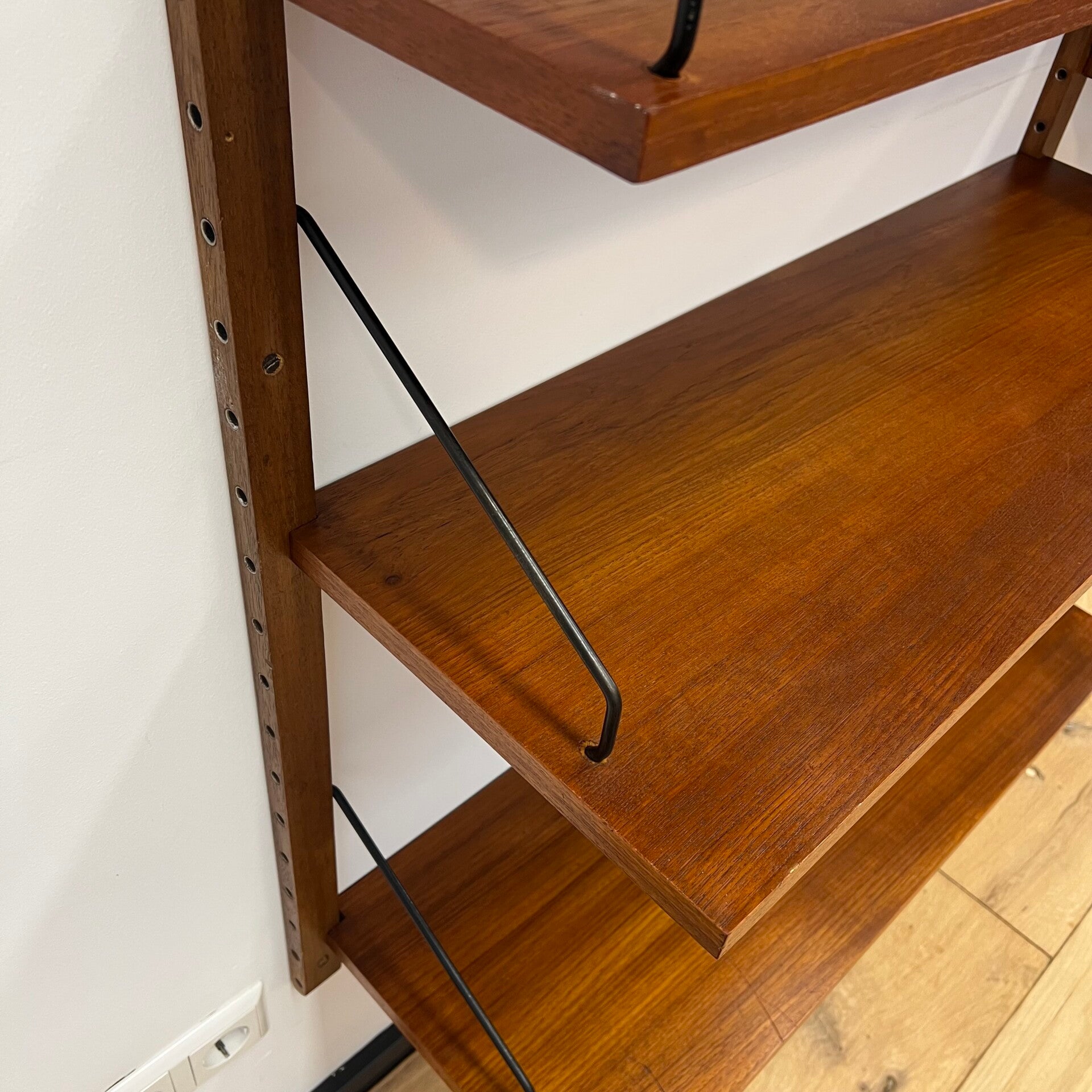 Uitgevoerd in teak (fineer) met houten wandlatten en zwart metalen beugels.