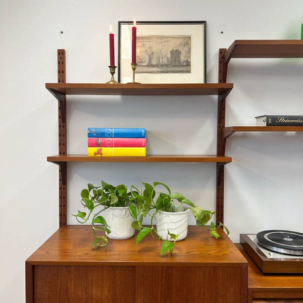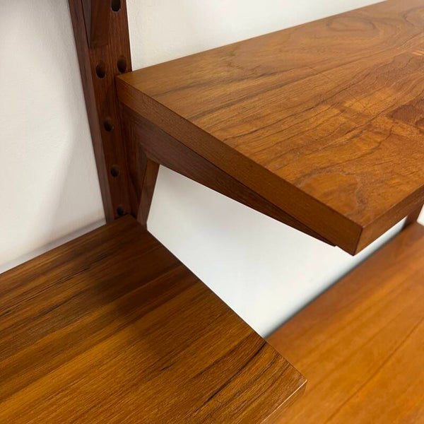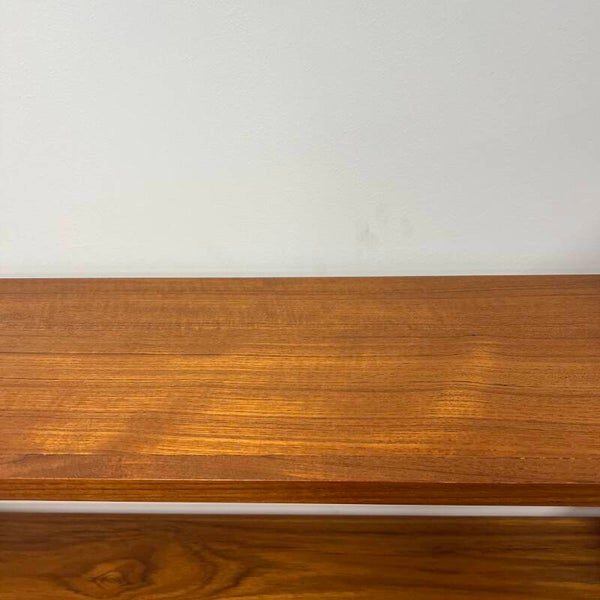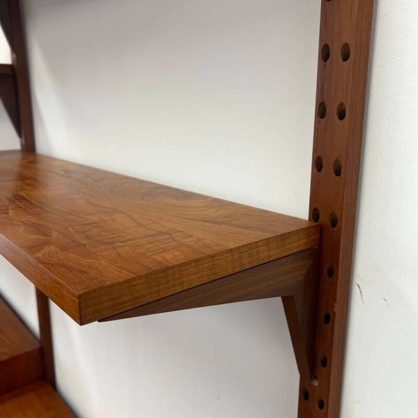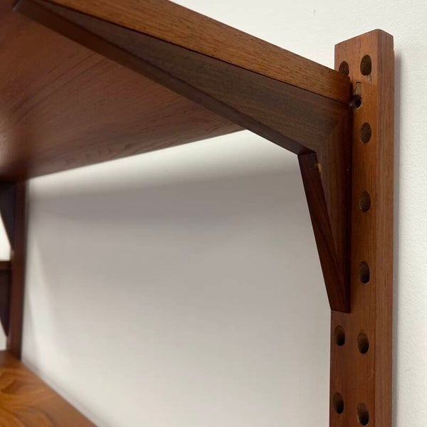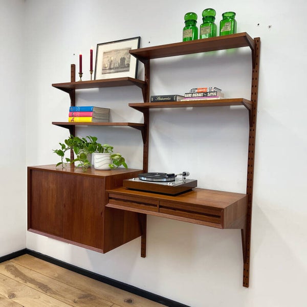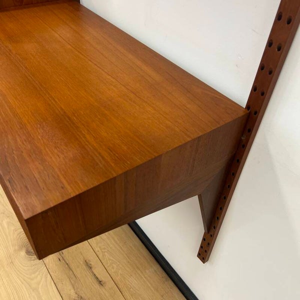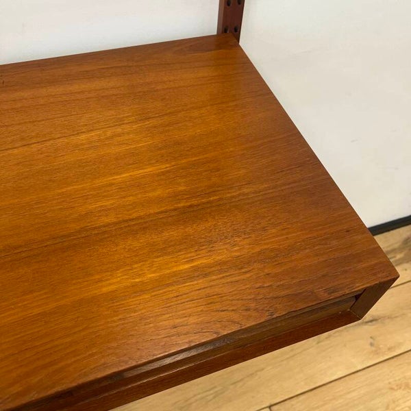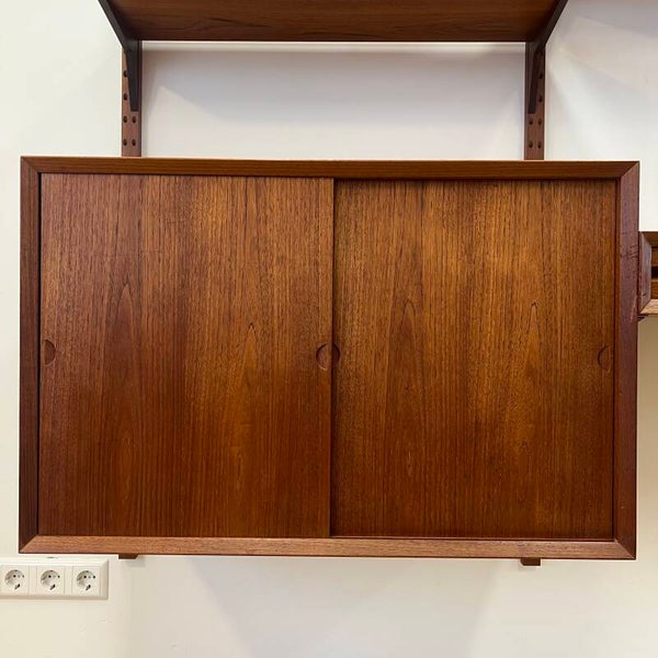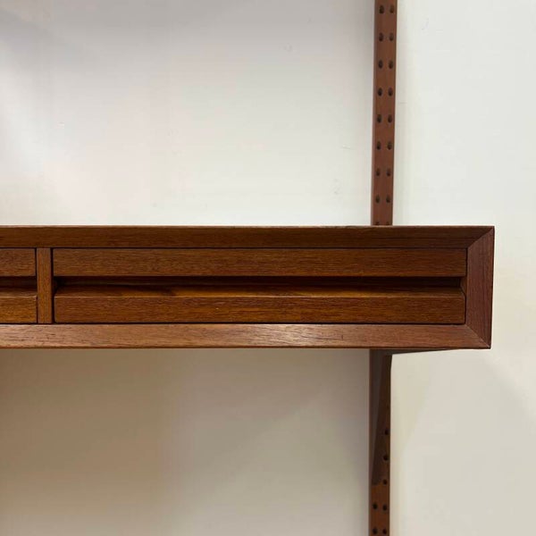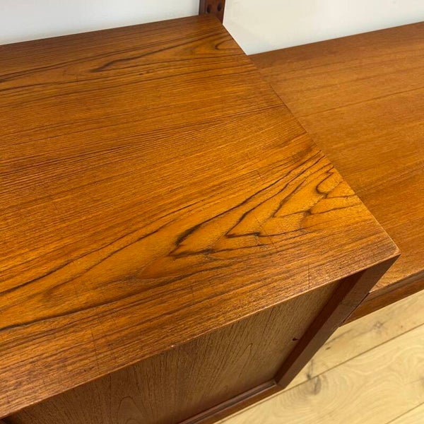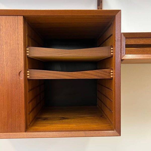Geweldig compact vintage wandmeubel, wall unit uitgevoerd in teakhout met houten dragers. De luxe versie van Cadovius!