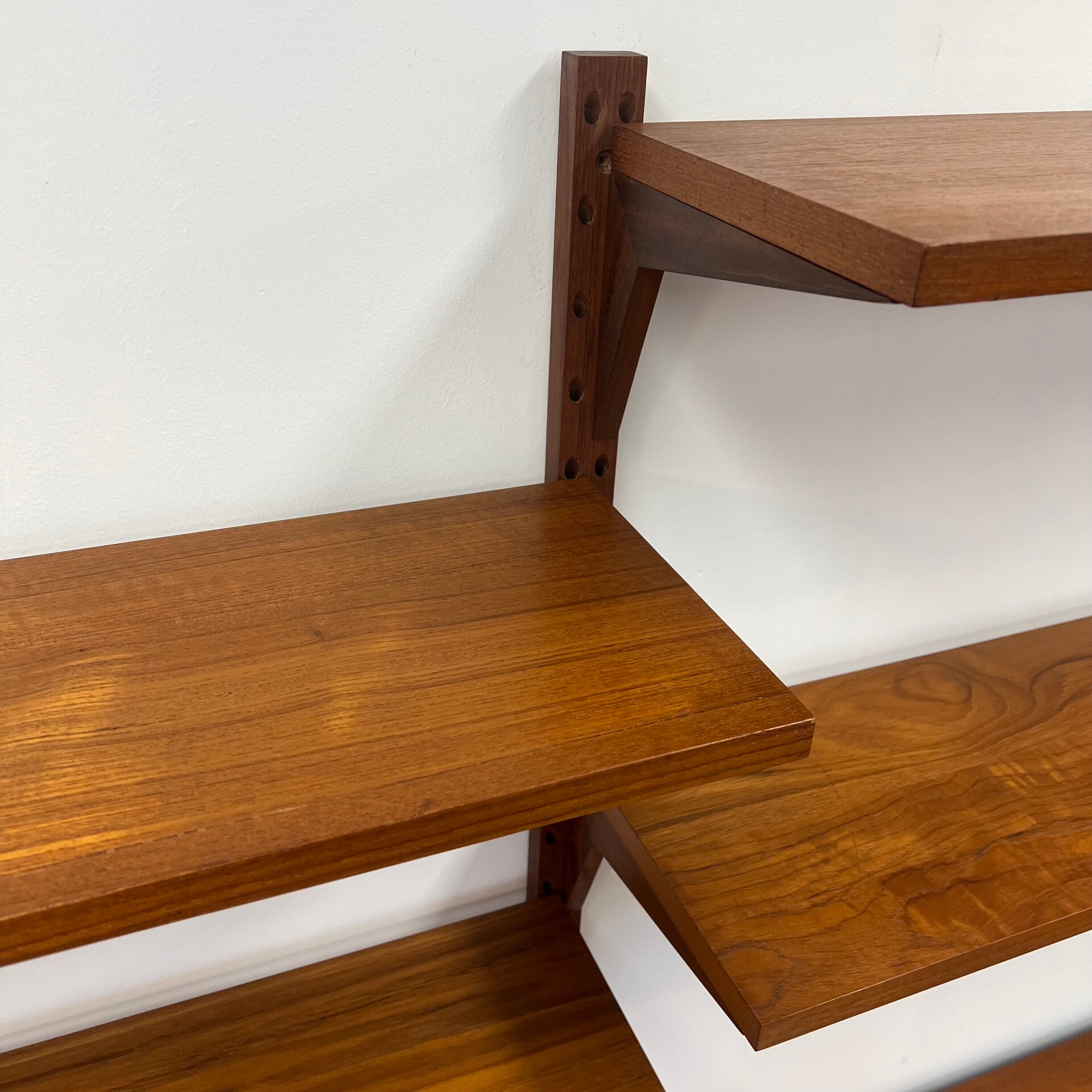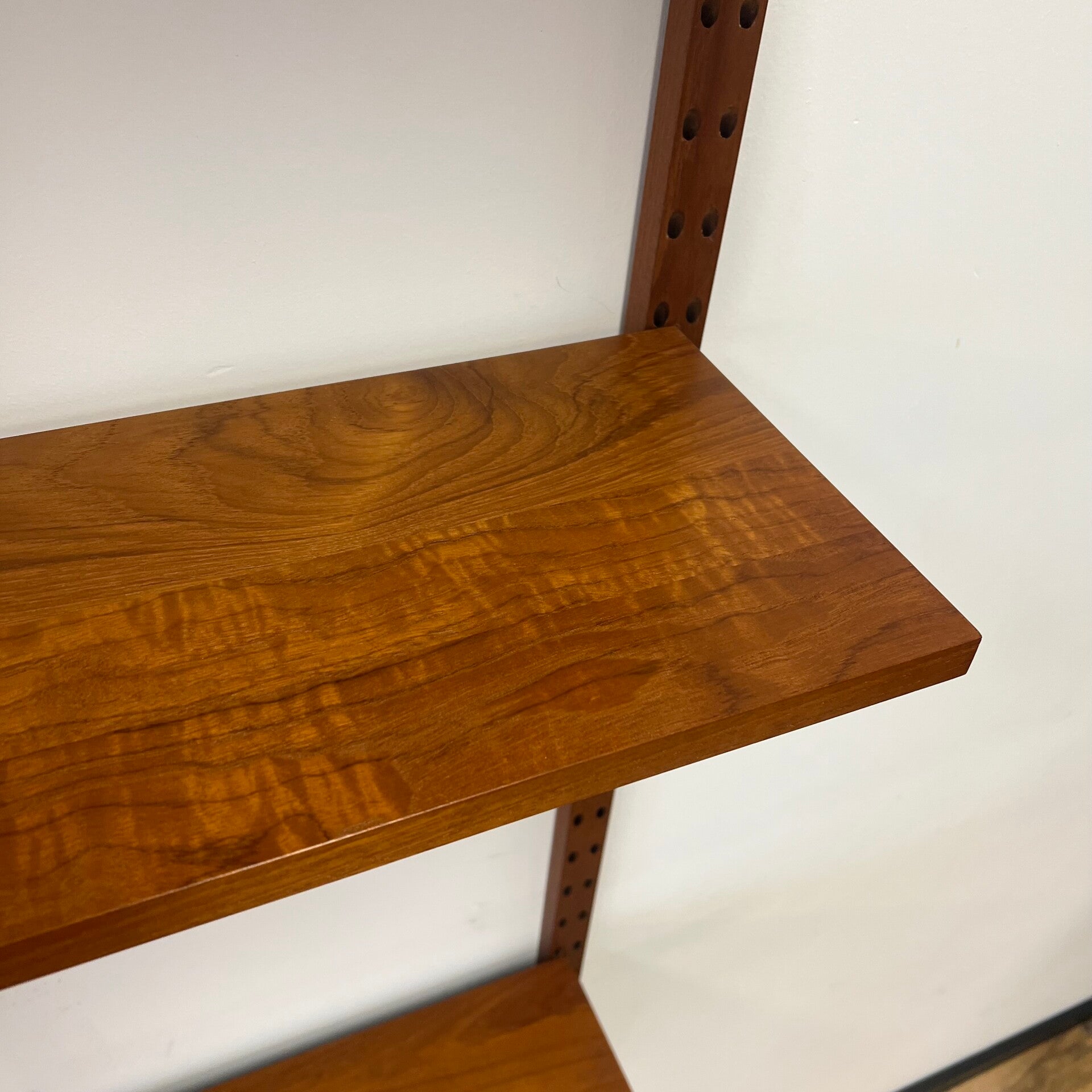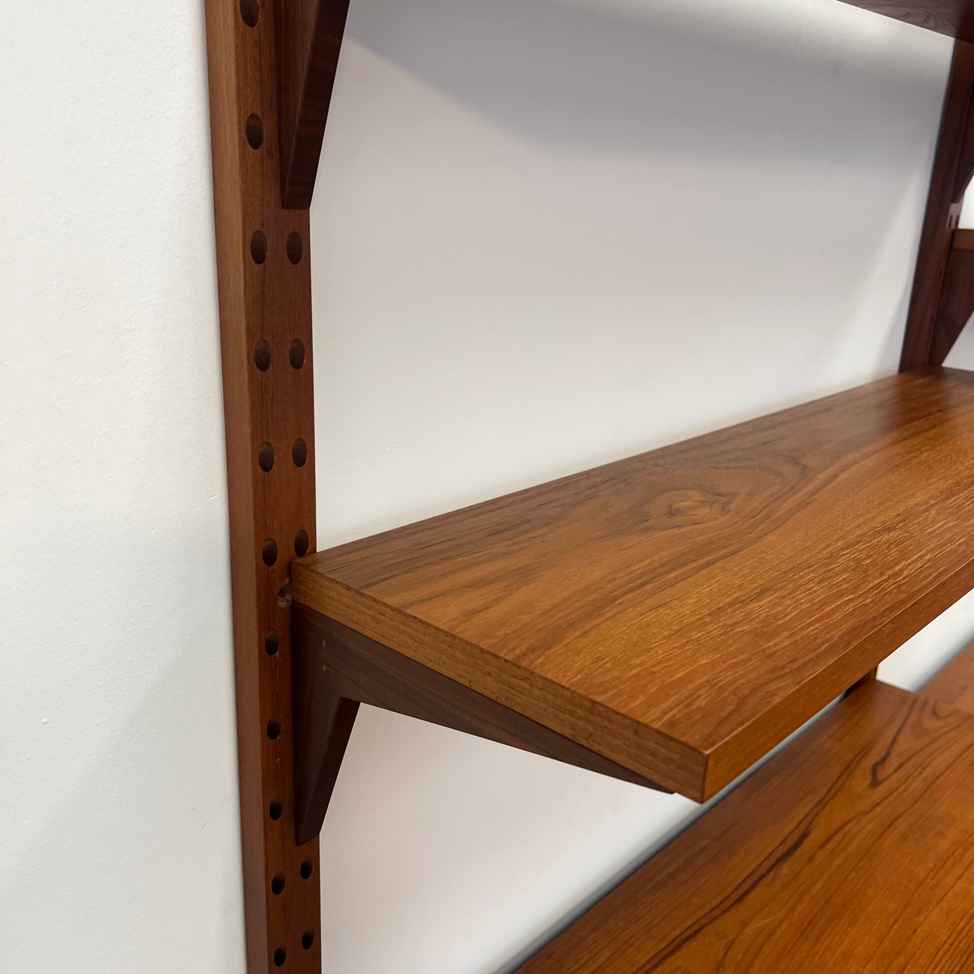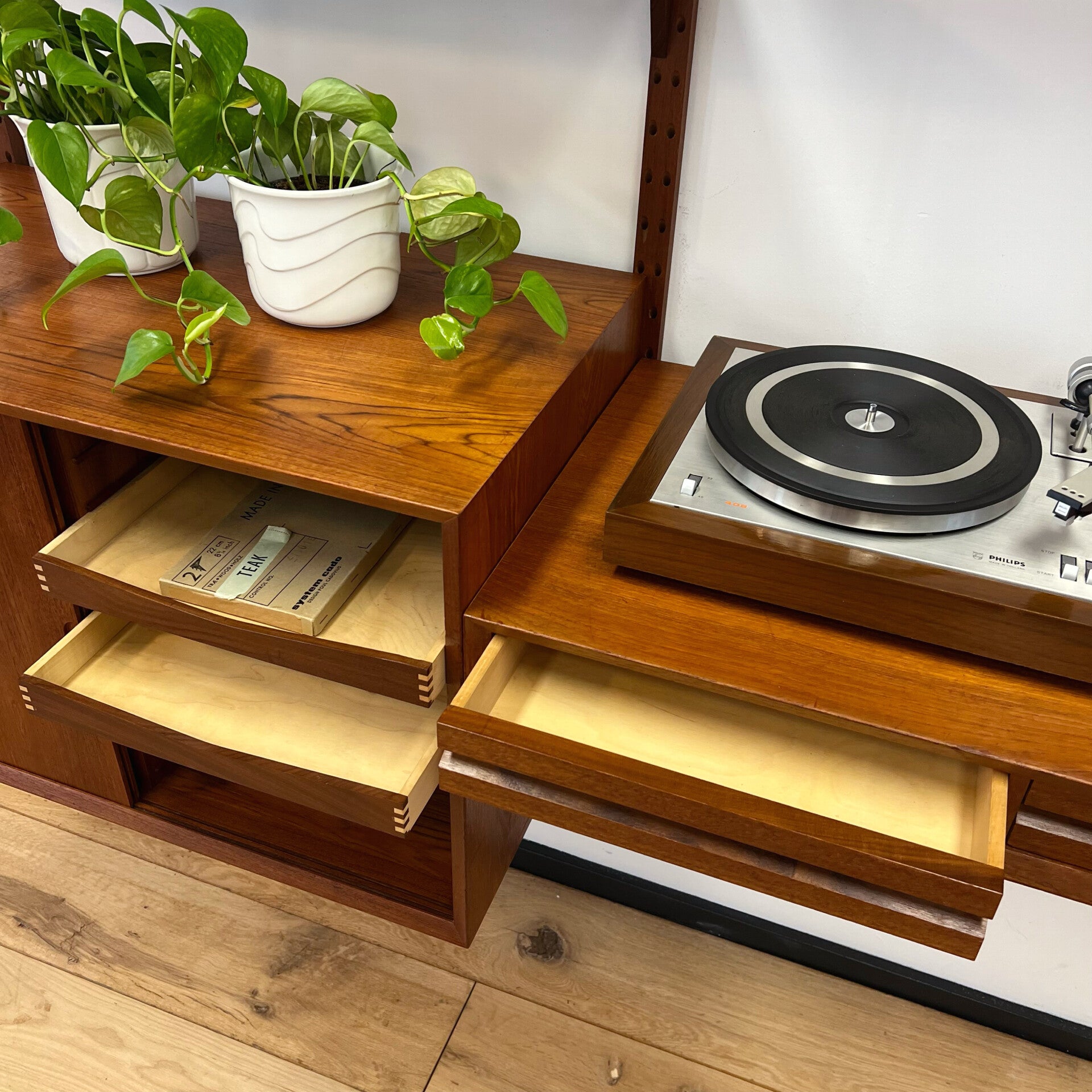 Geweldig compact vintage wandmeubel, wall unit uitgevoerd in teakhout met houten dragers. De luxe versie van Cadovius!