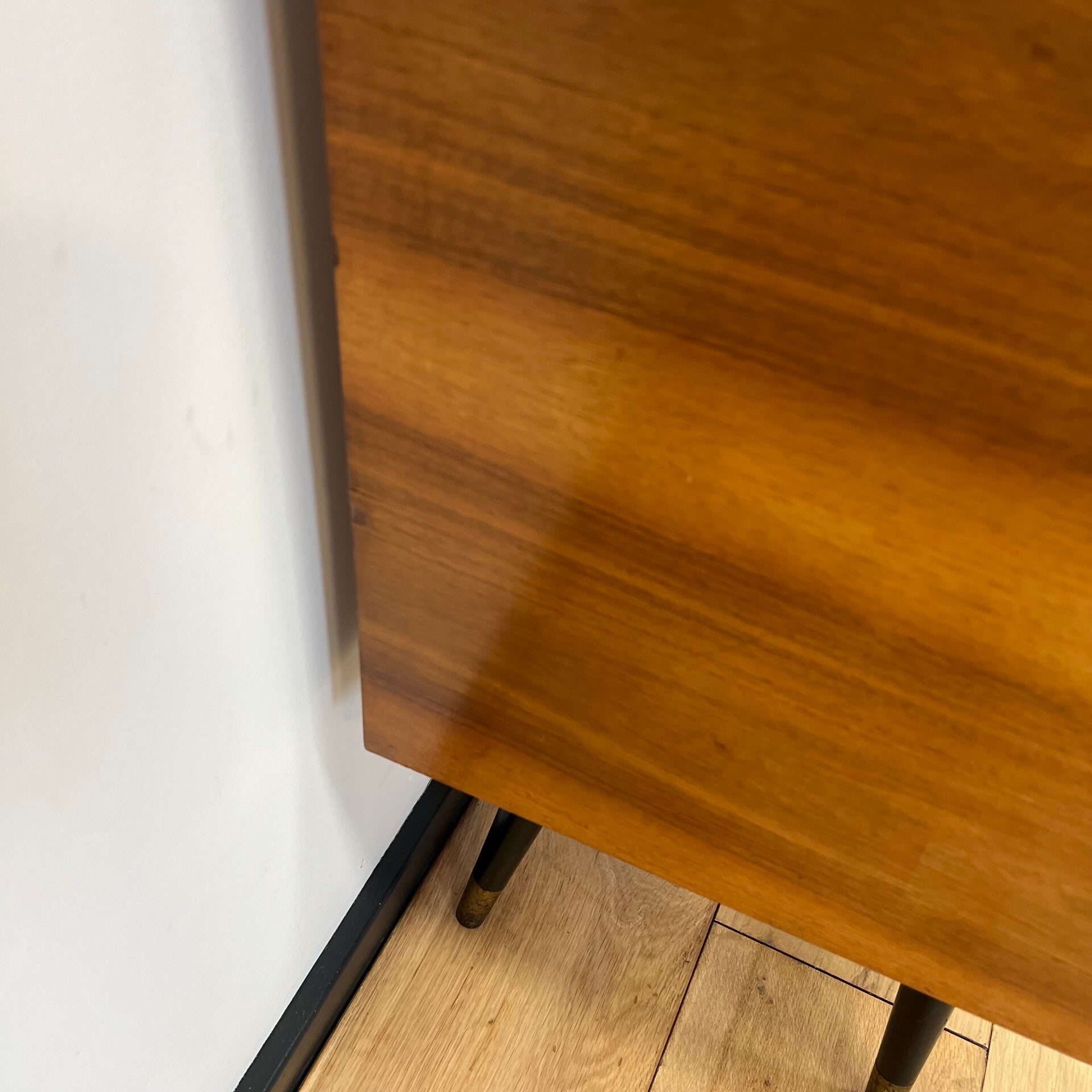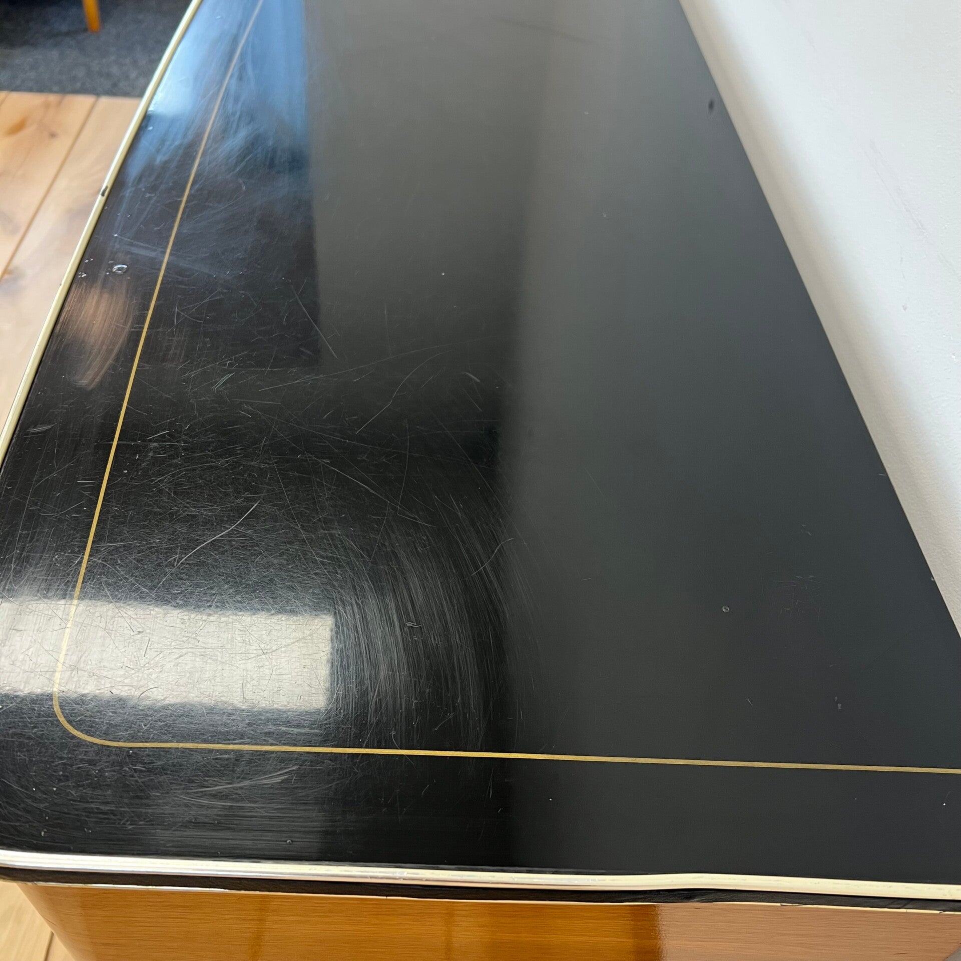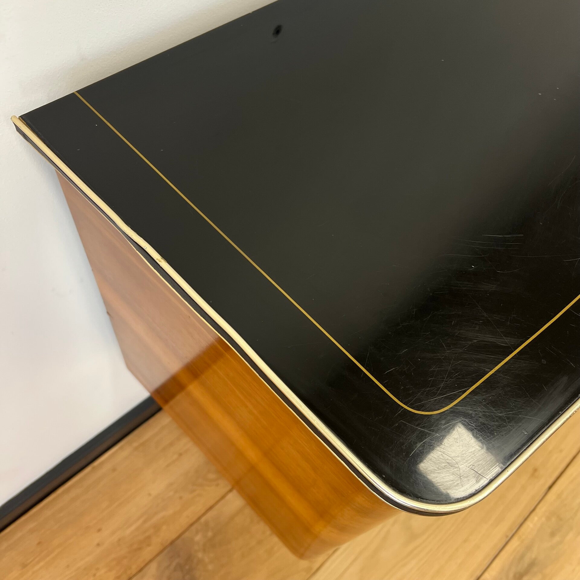 Zo is het zwarte blad behoorlijk gekrast, loopt het rechterdeurtje niet helemaal lekker en missen er een aantal messing sierstrippen op de deurtjes.
