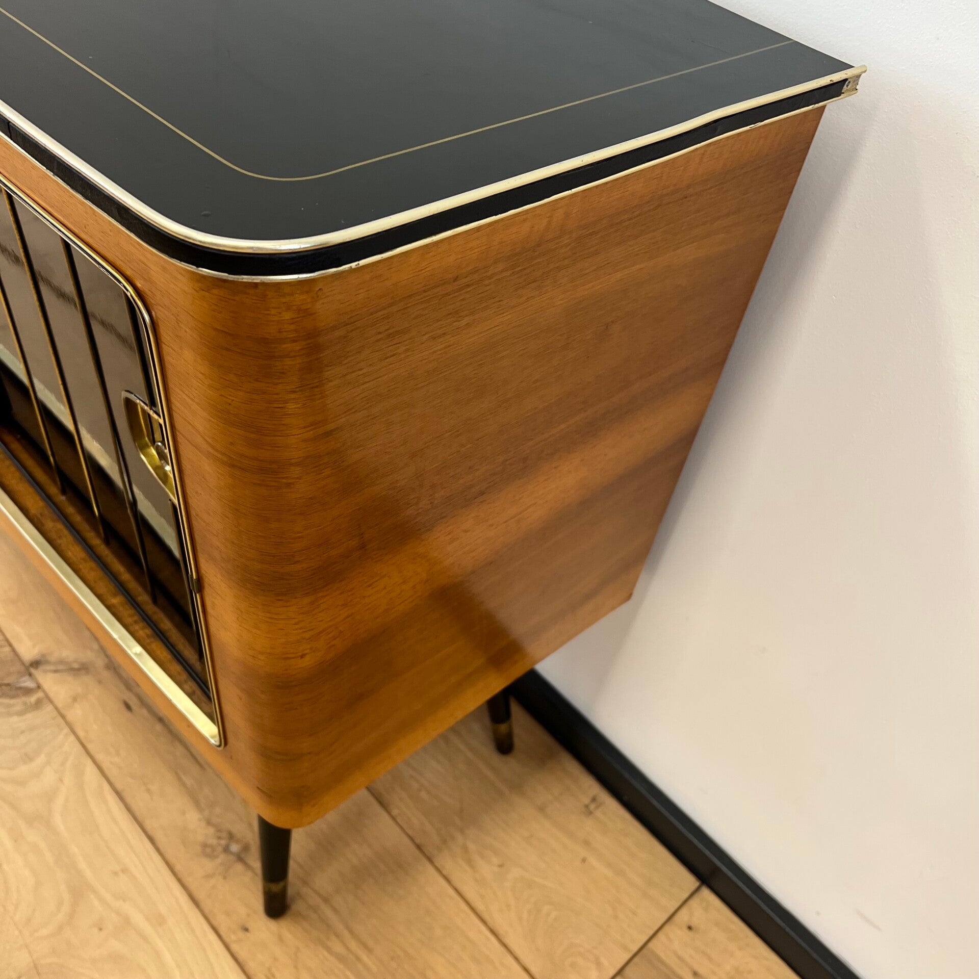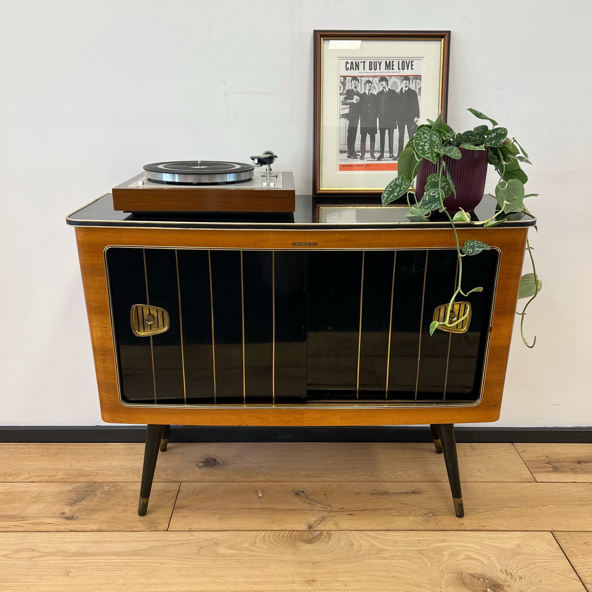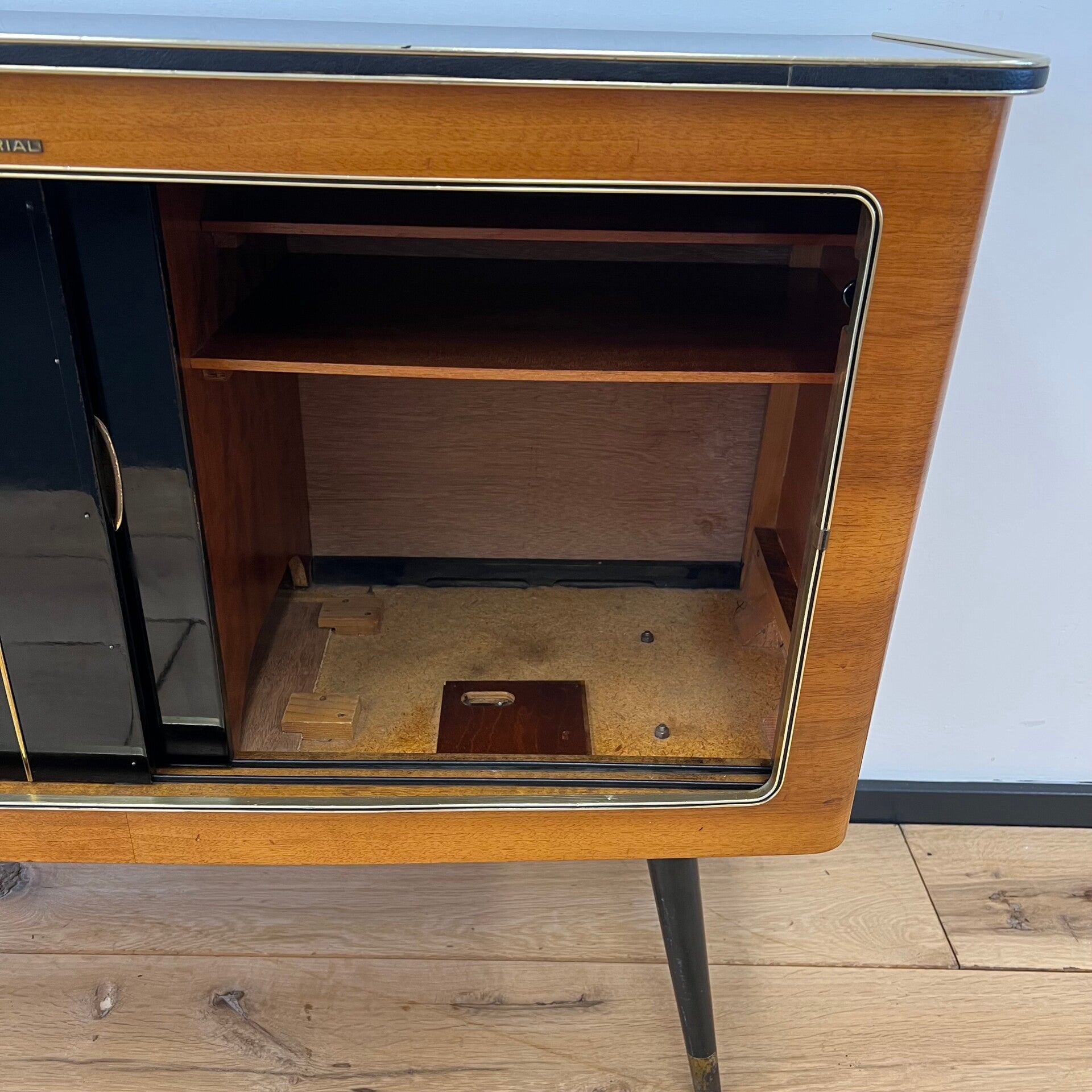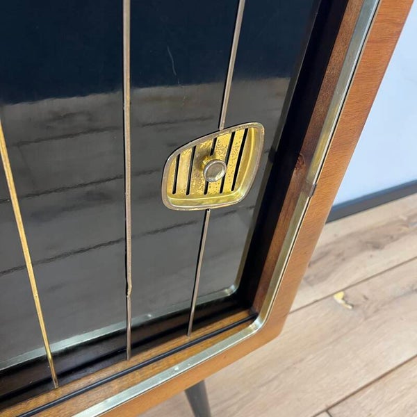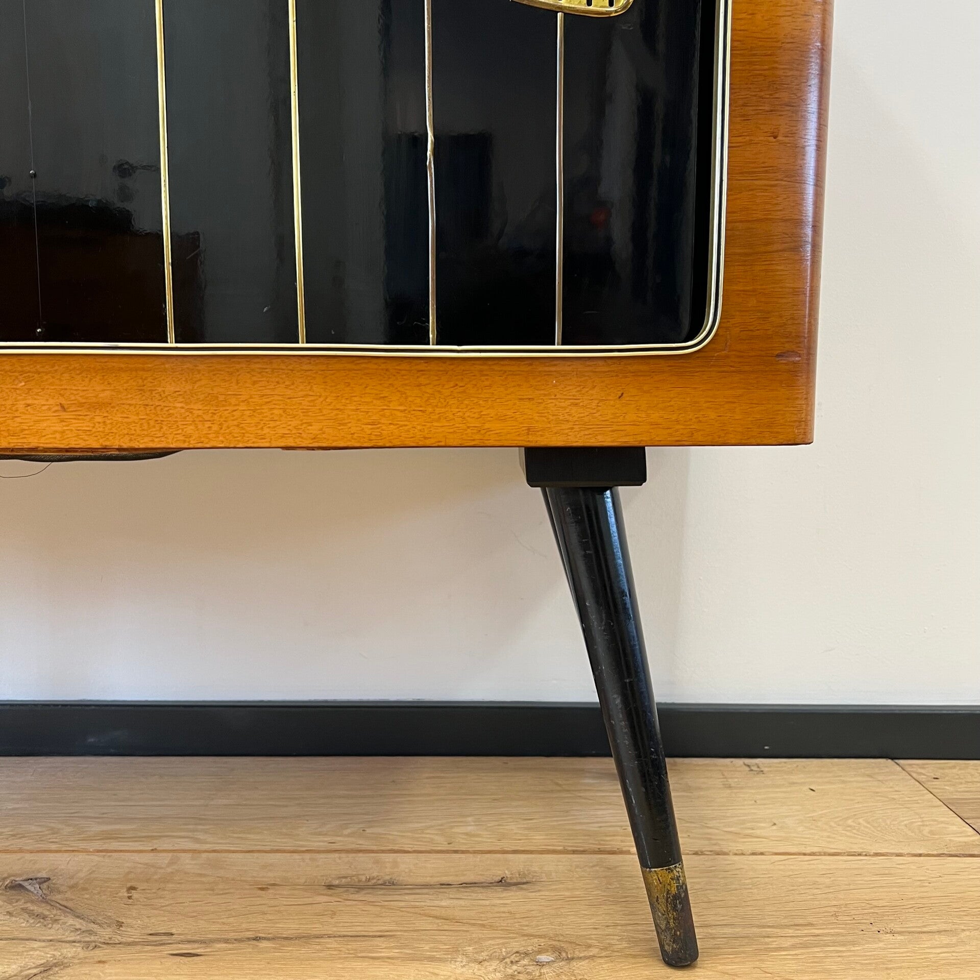 Oorspronkelijk een grammofoonmeubel-radiomeubel met ingebouwde AM-FM ontvanger en een grammofoon van Perpetuum-Ebner.