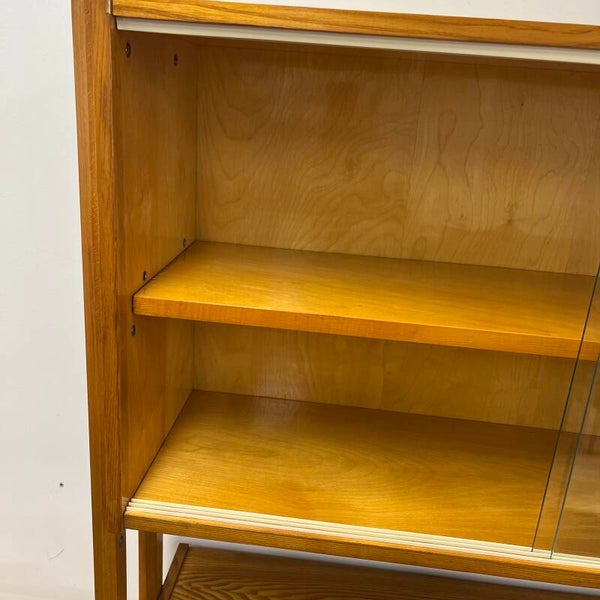 Het meubel heeft bovenin een vitrinekast met 2 glazen schuifruitjes en een uitneembare plank.