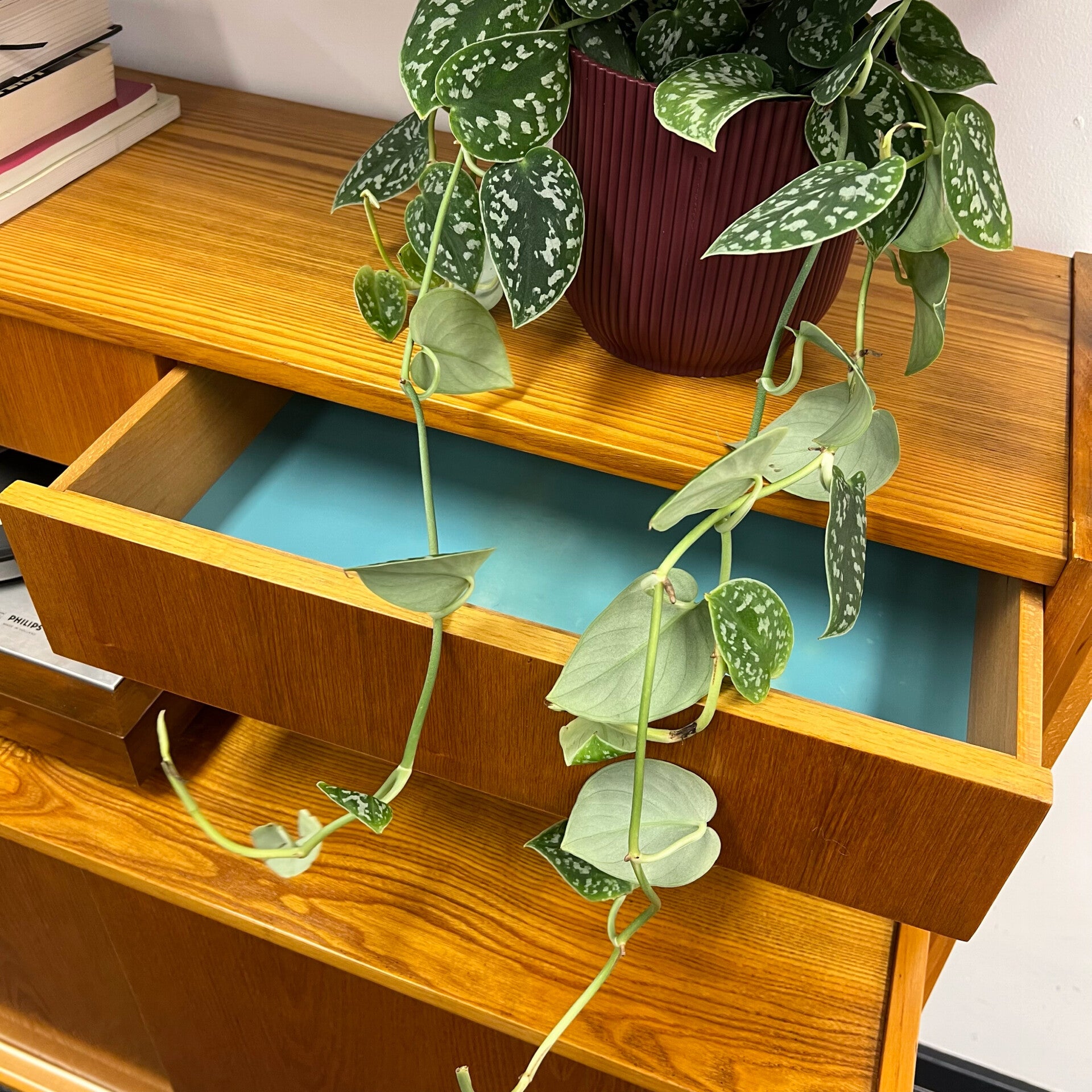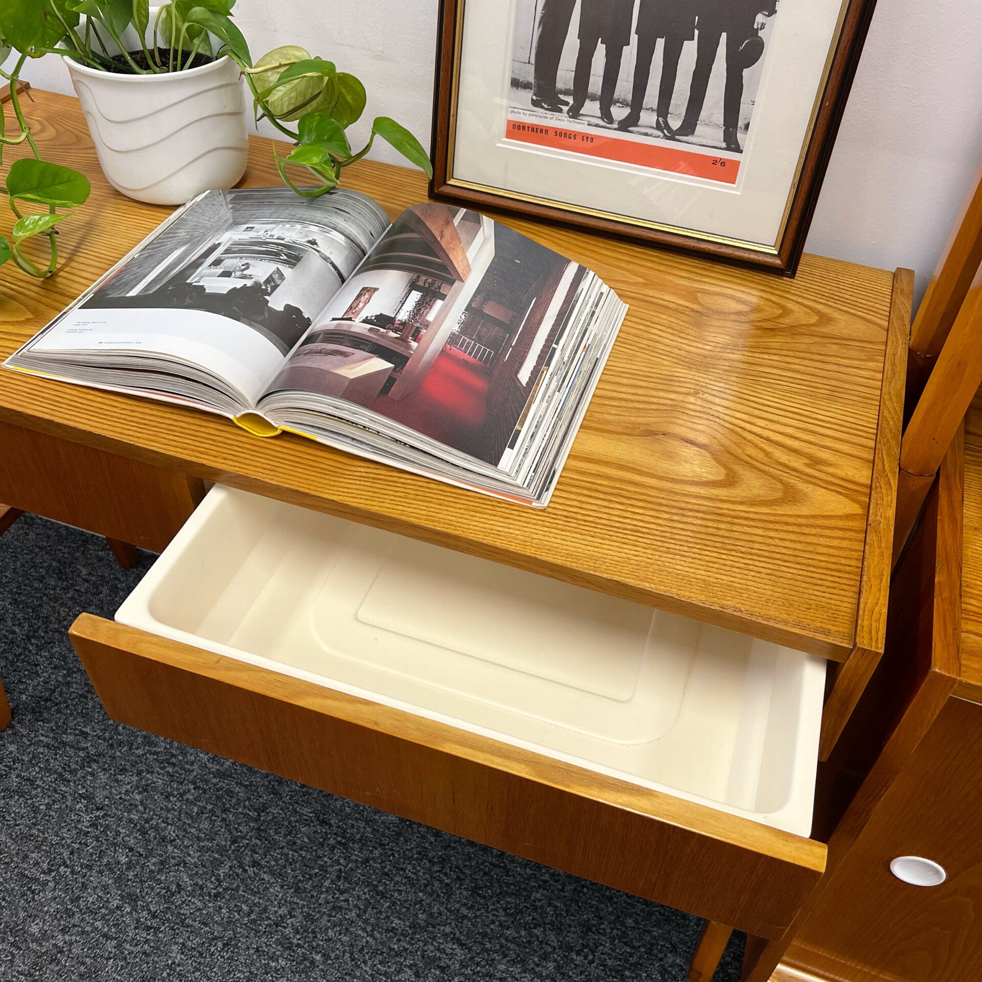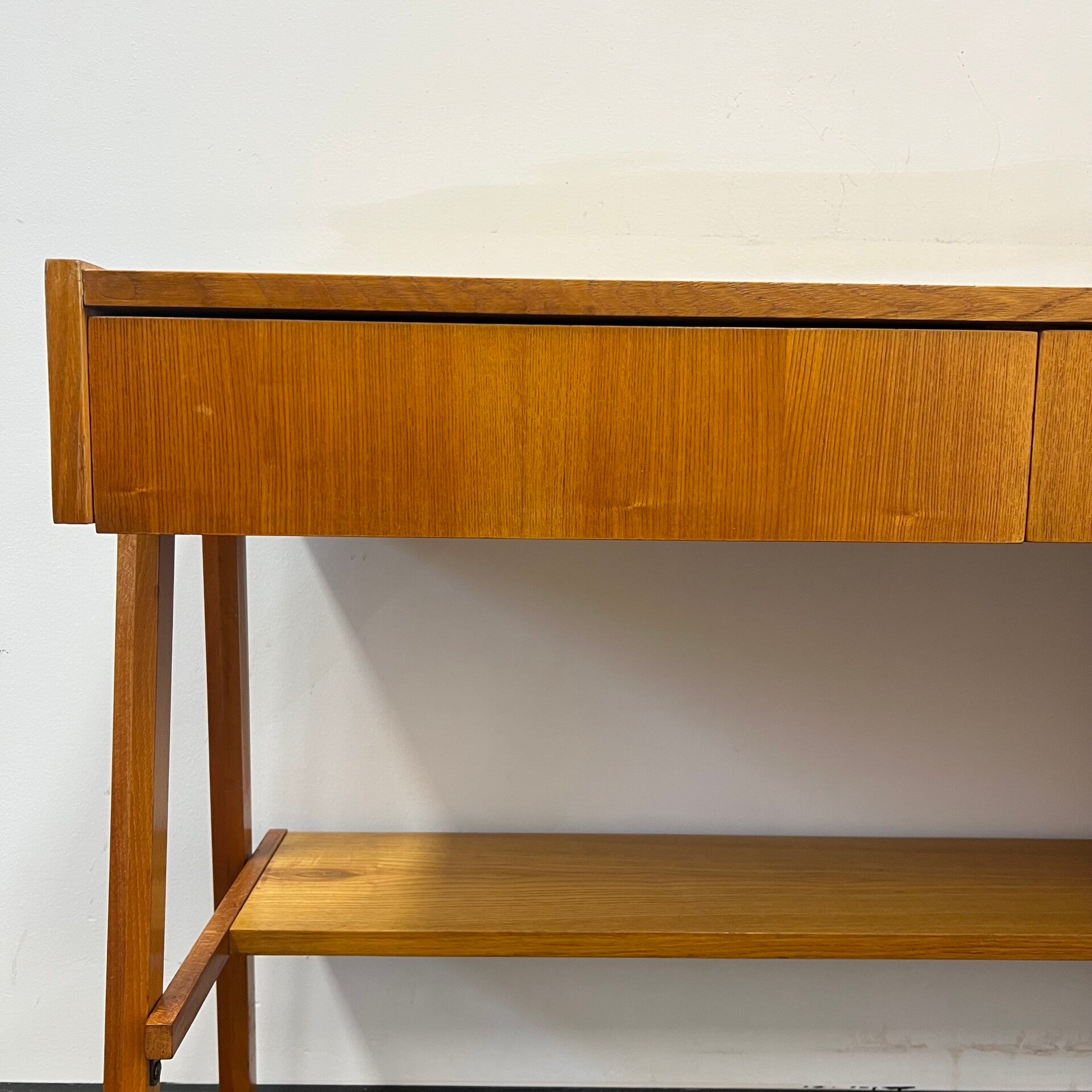 In het midden een ladeblok met 2 lades.