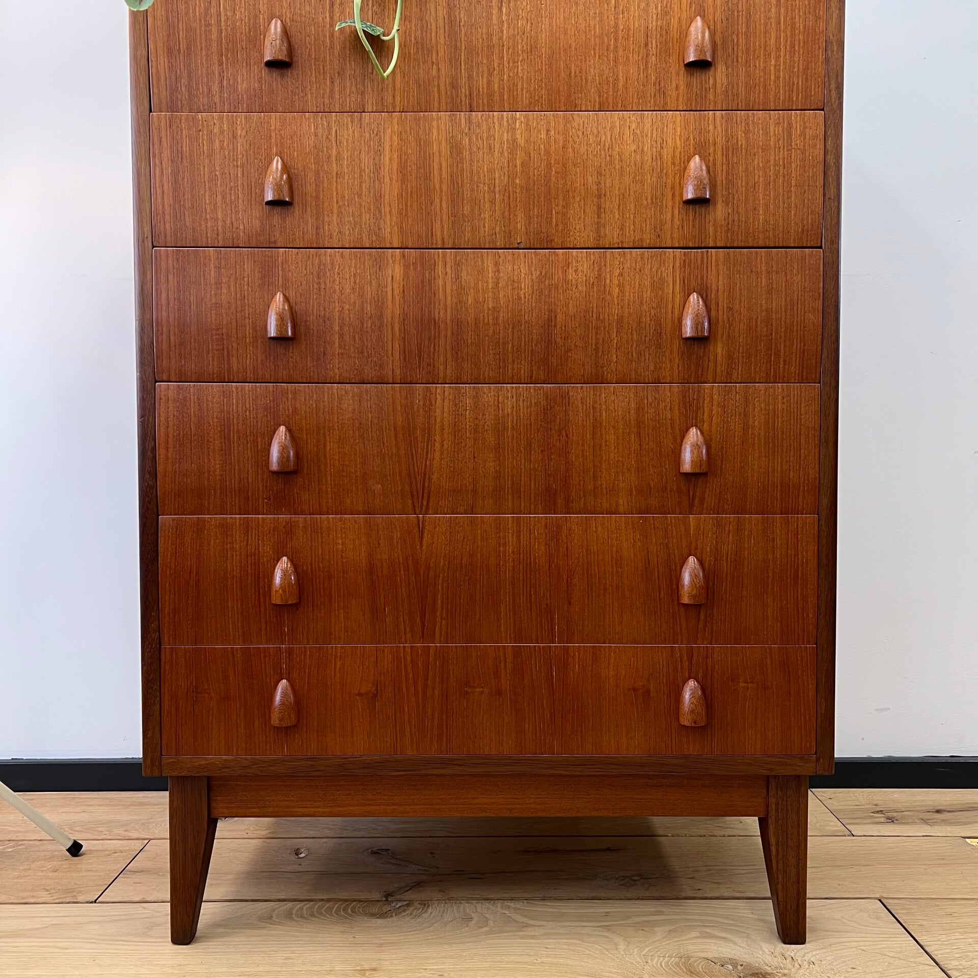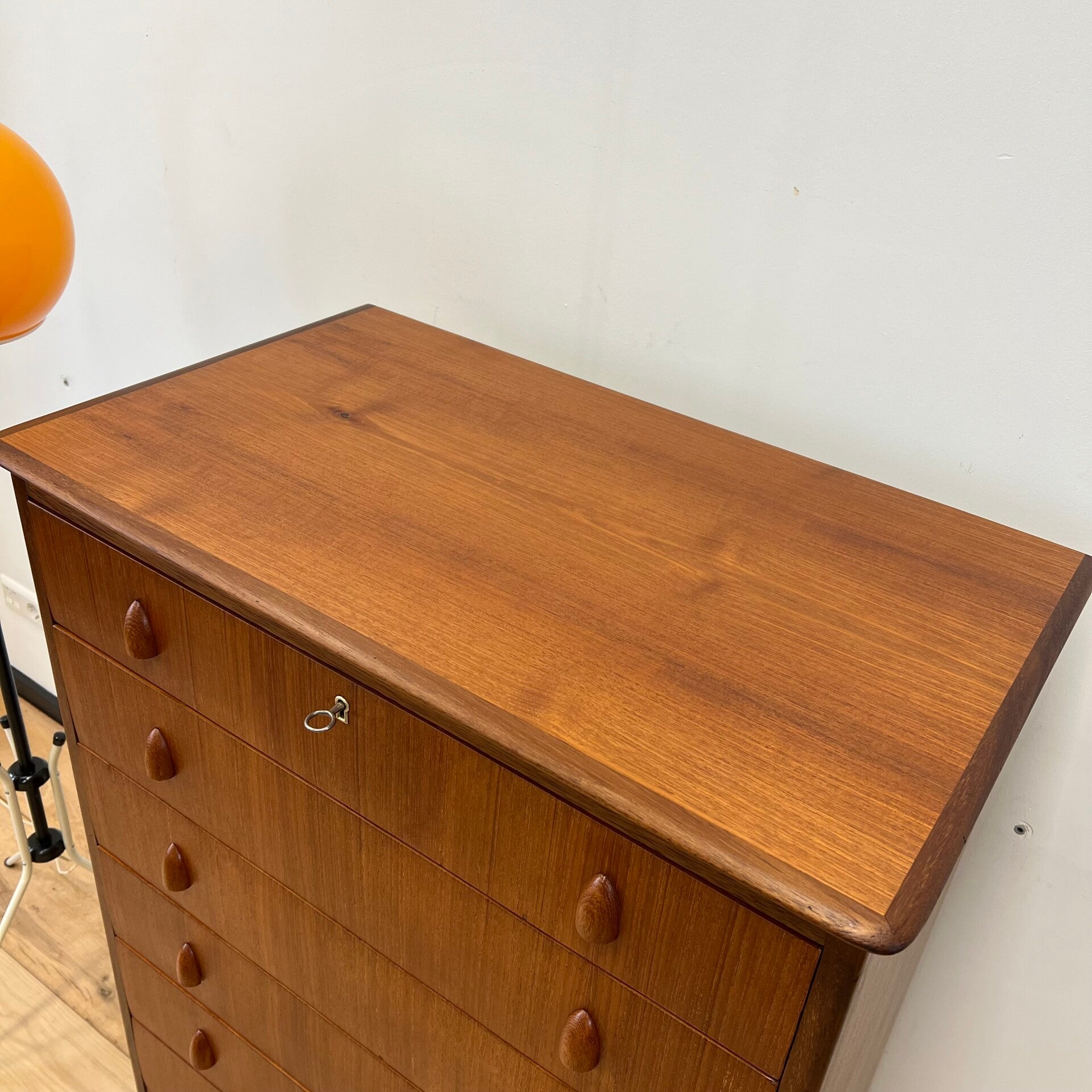 Prachtige vintage hoge ladekast, uitgevoerd in teak (fineer) met mooi gevormde handgrepen en slanke pootjes.