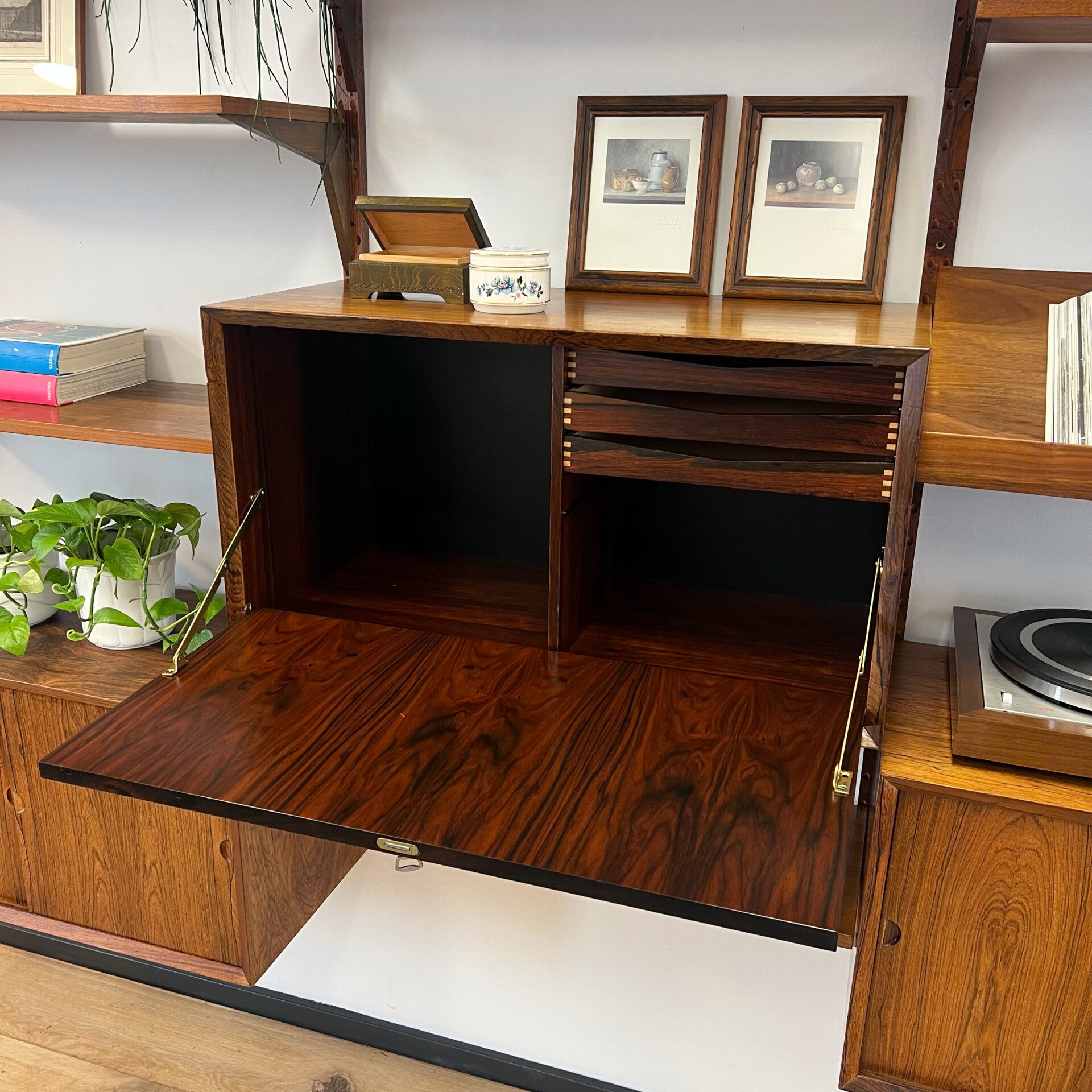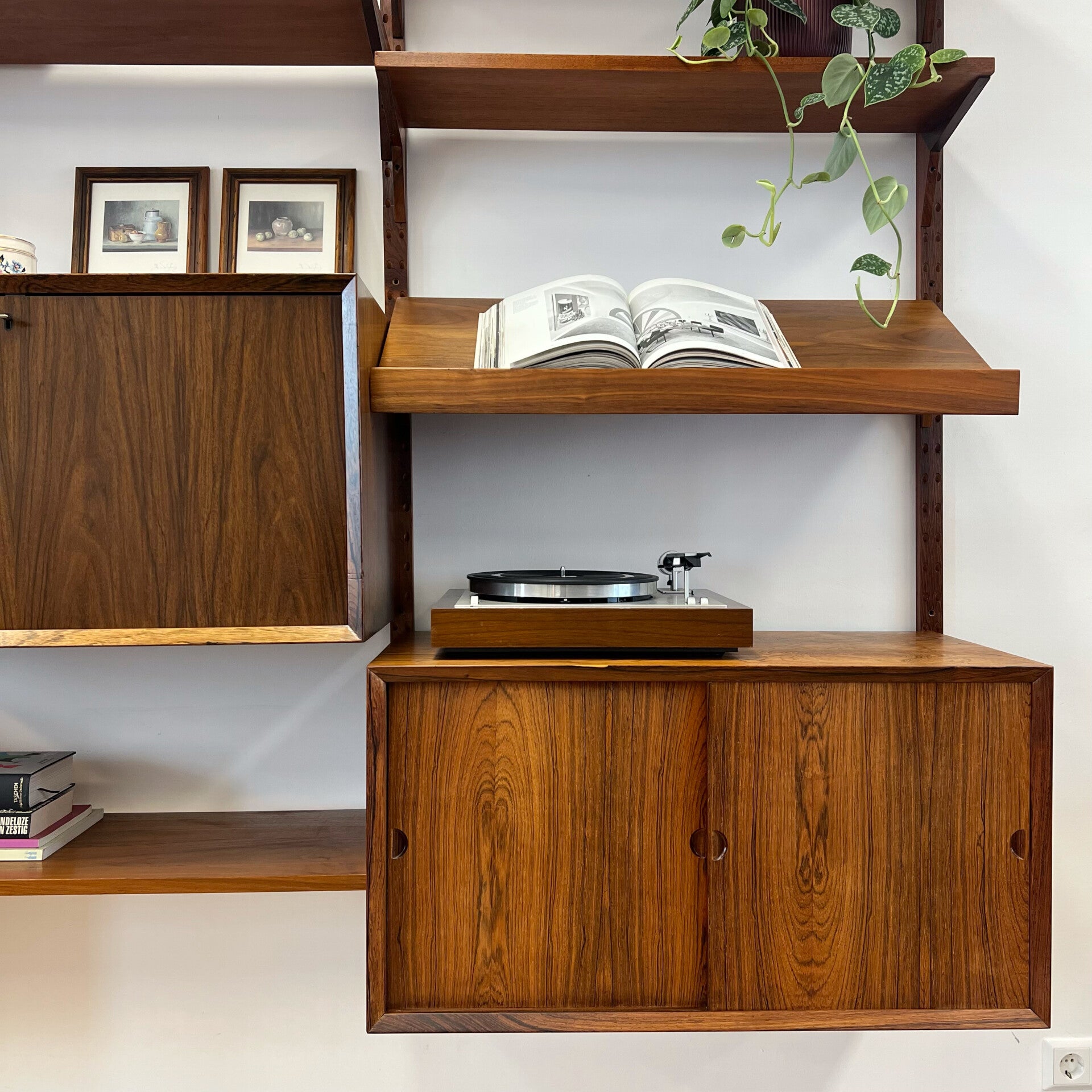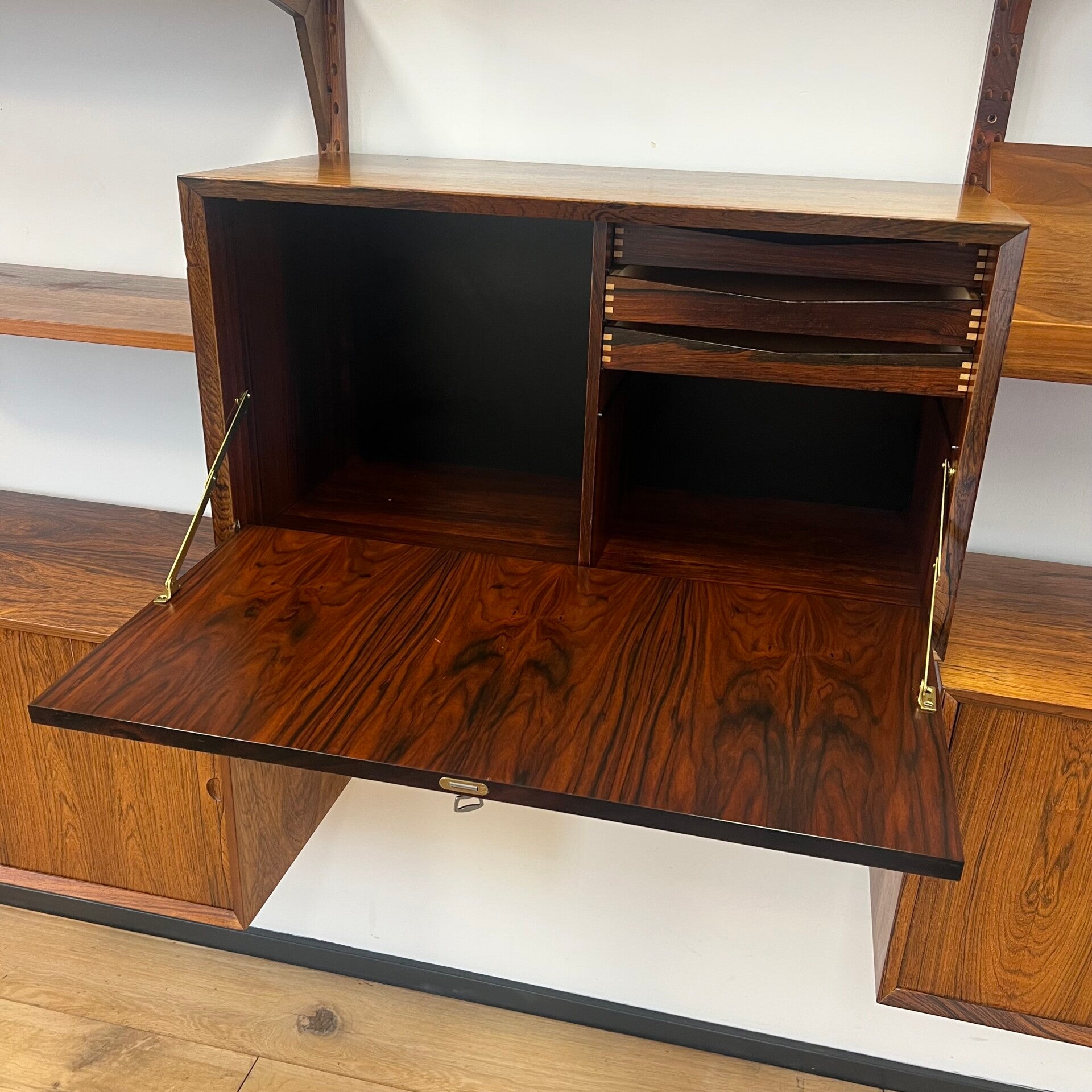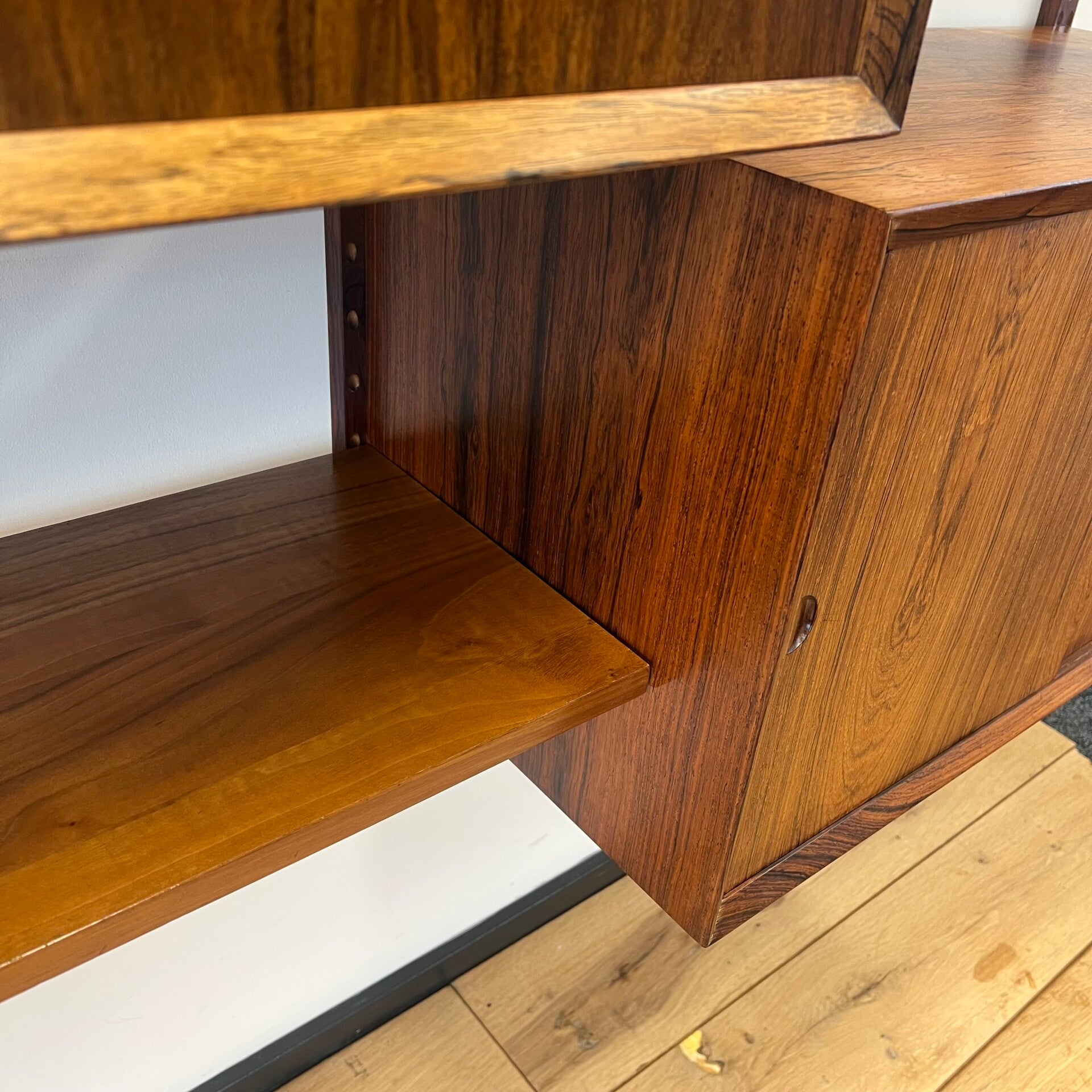 Prachtig vintage wandmeubel, wall unit uitgevoerd in palissander (+ enkele teakhouten elementen) met houten dragers en deuvels.