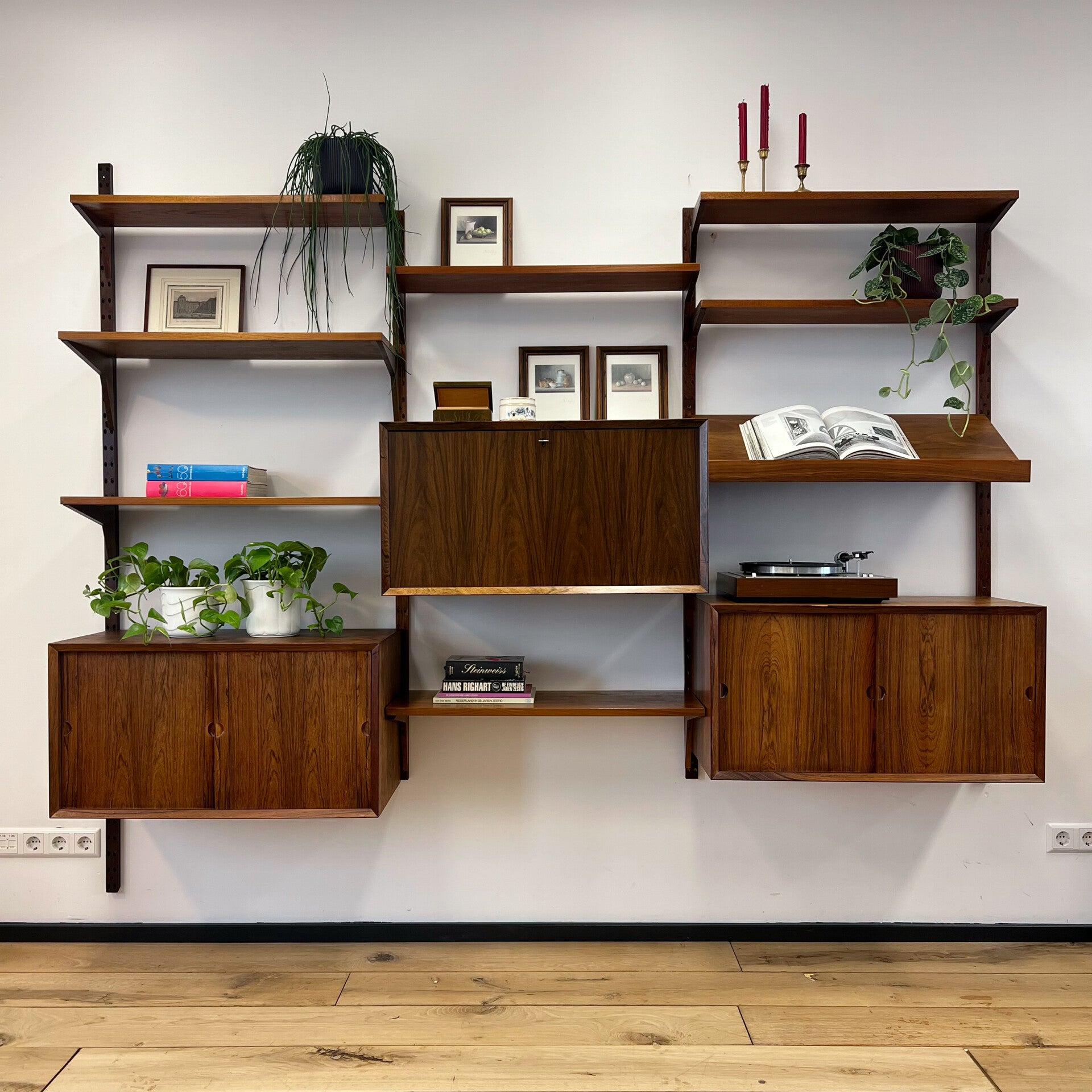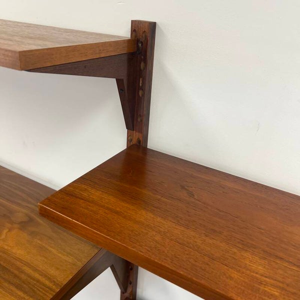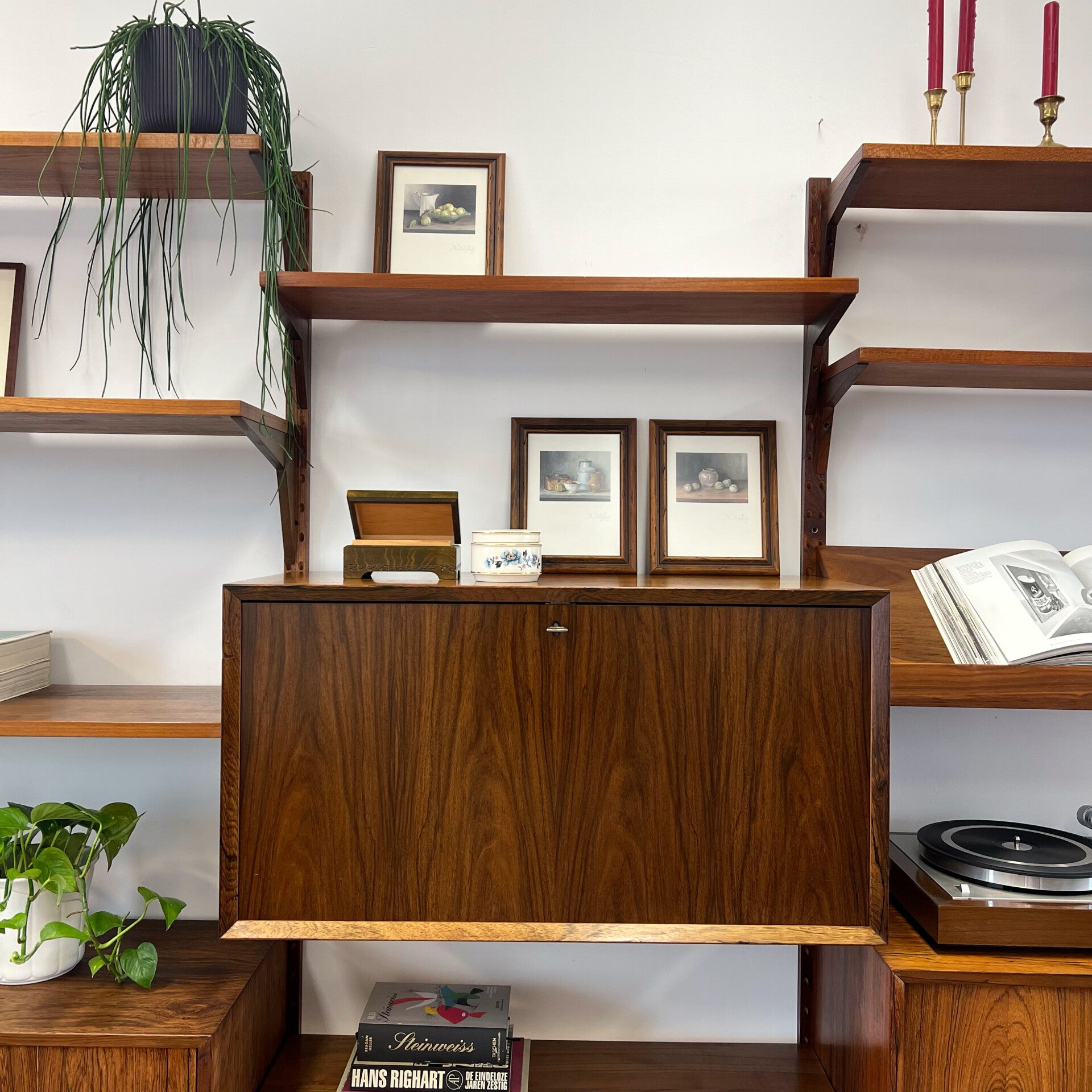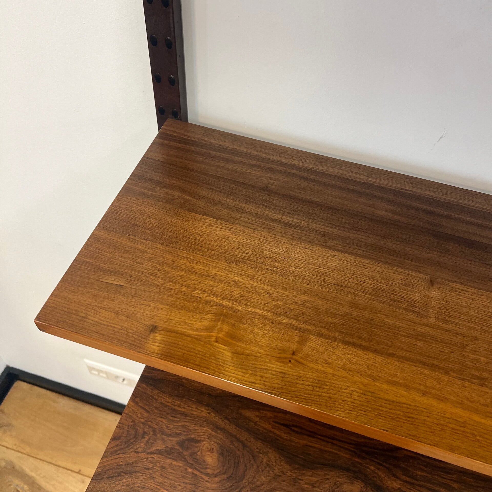 Prachtig vintage wandmeubel, wall unit uitgevoerd in palissander (+ enkele teakhouten elementen) met houten dragers en deuvels.