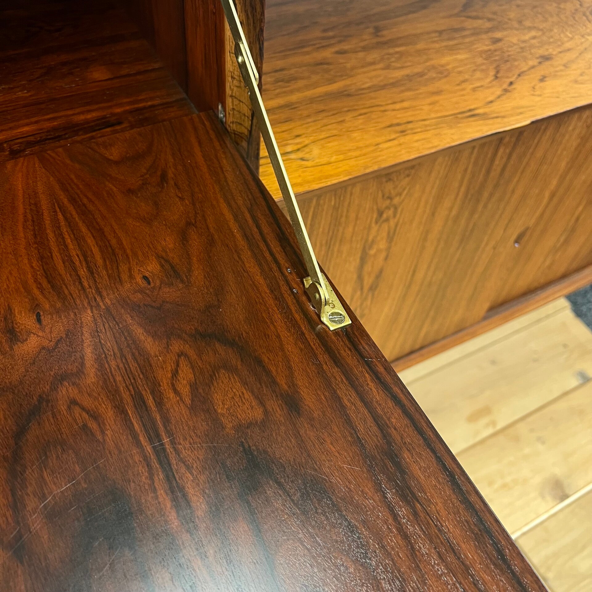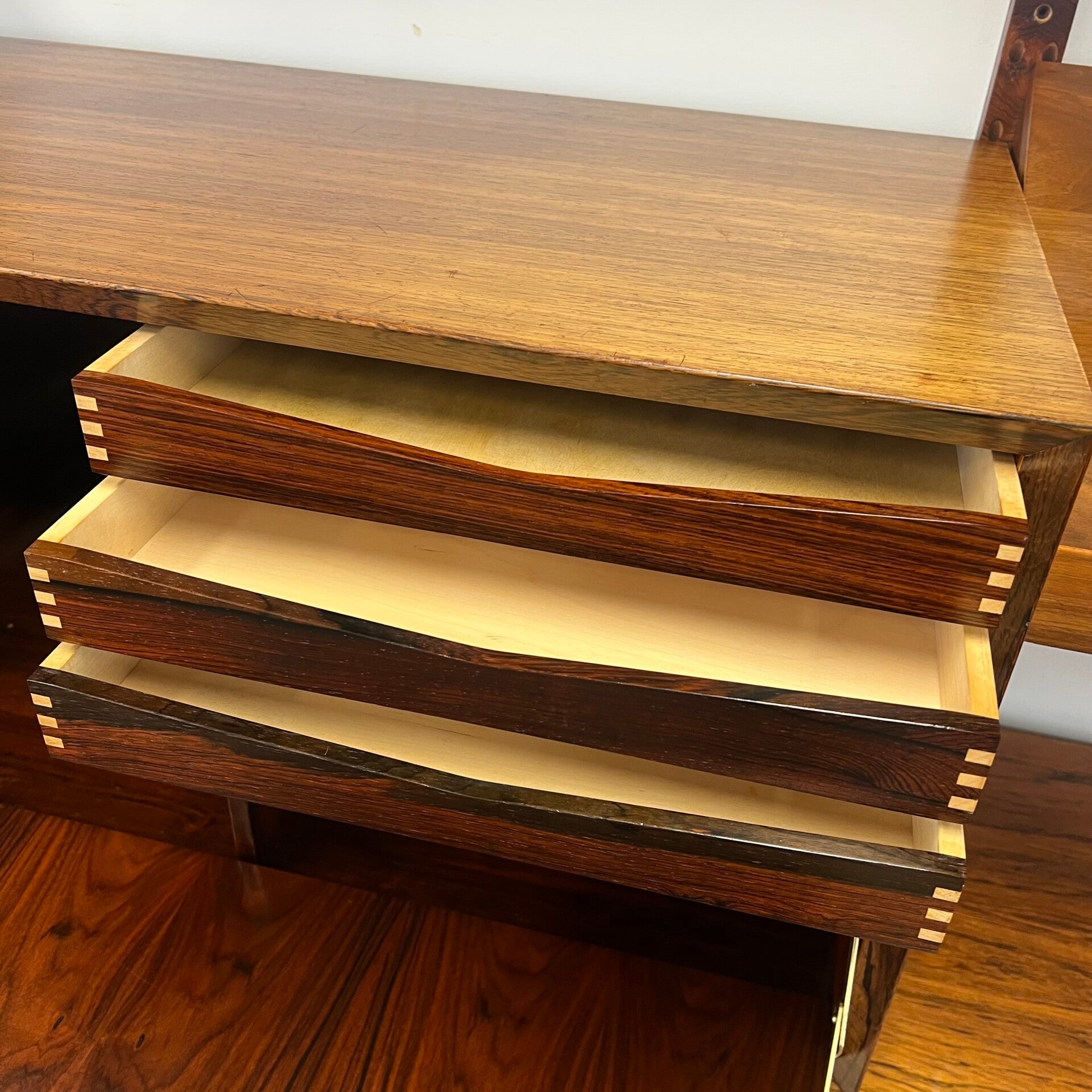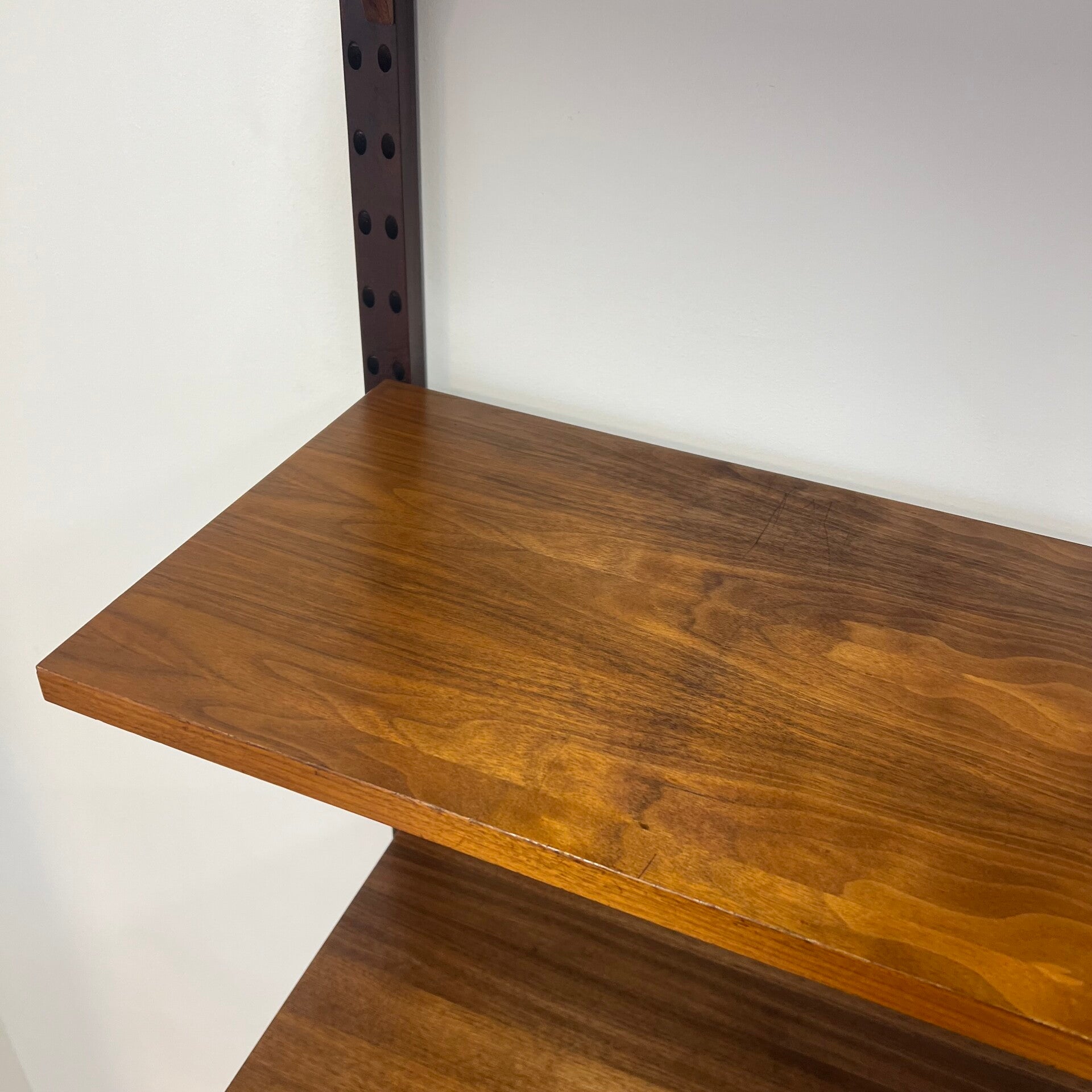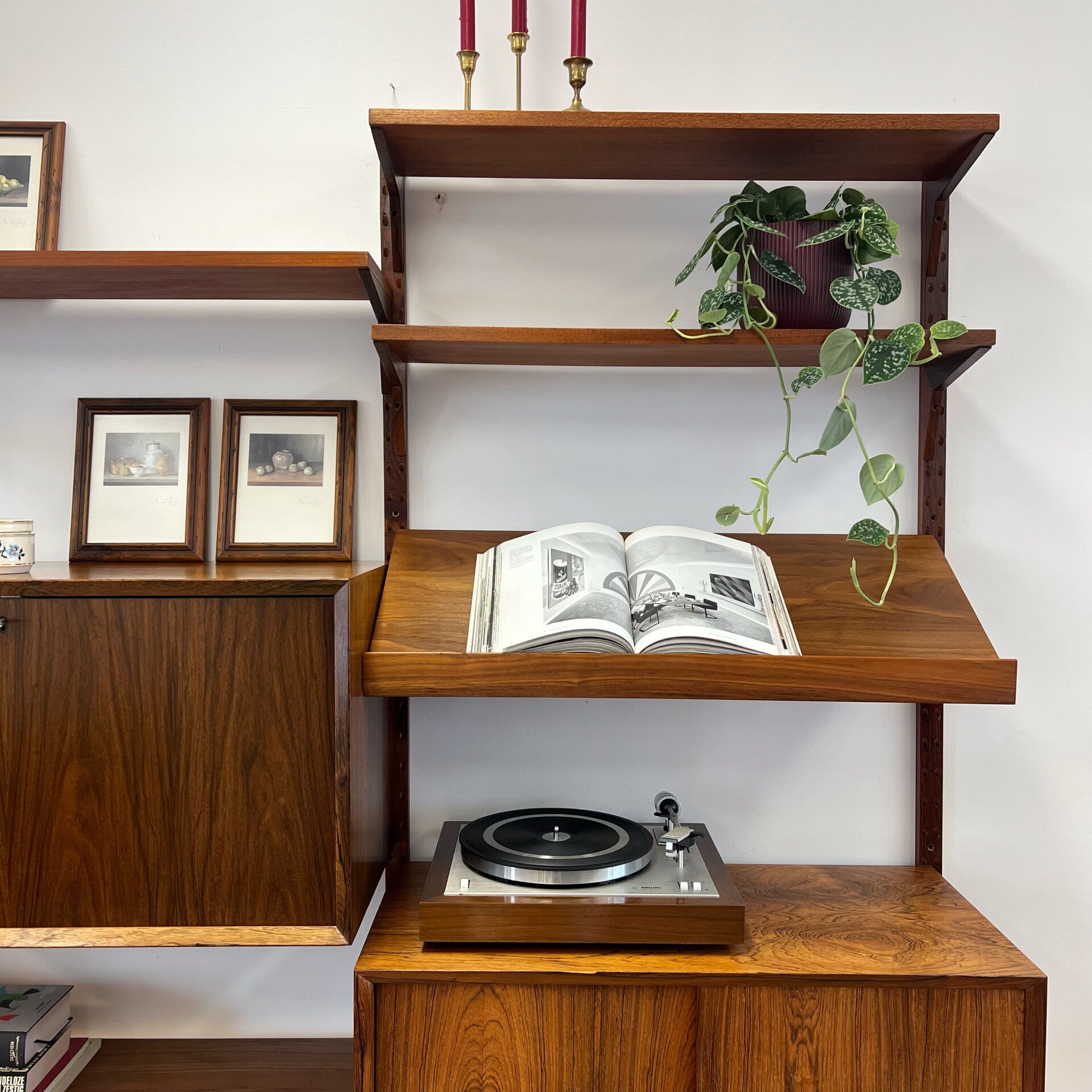Prachtig vintage wandmeubel, wall unit uitgevoerd in palissander (+ enkele teakhouten elementen) met houten dragers en deuvels.