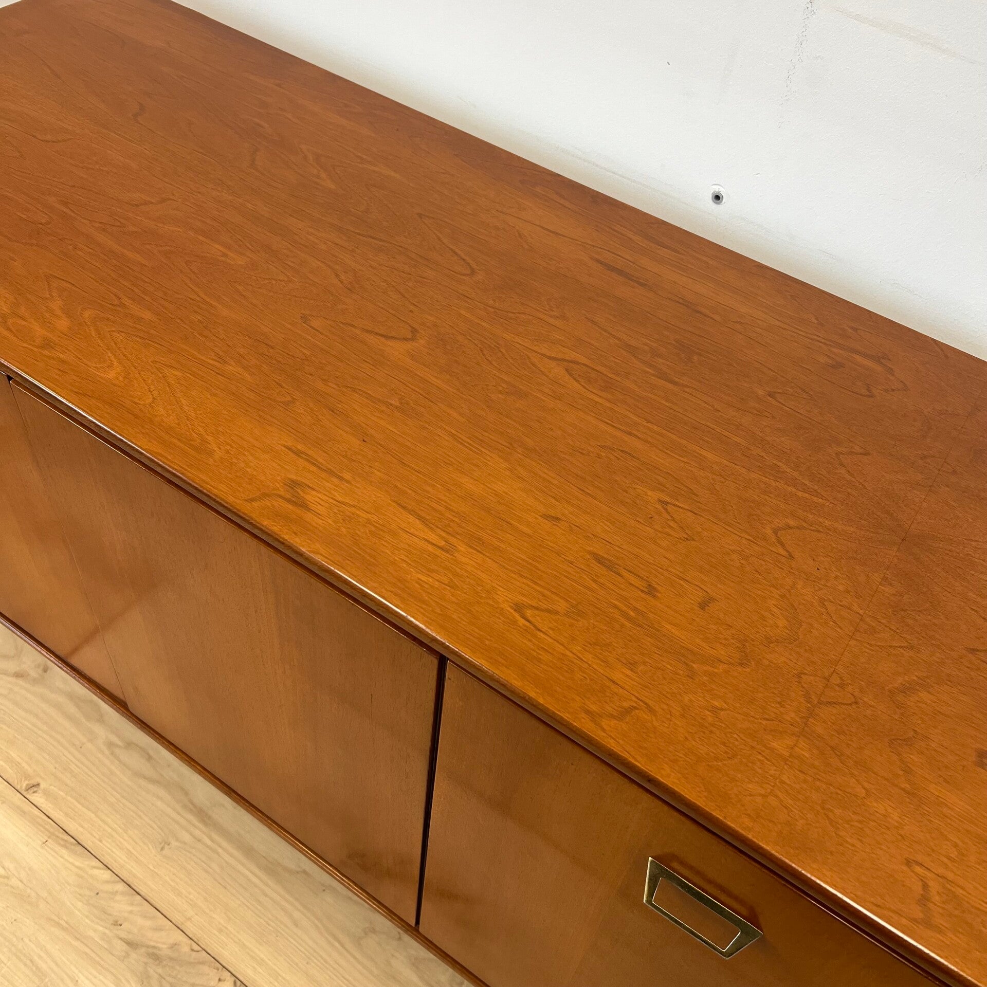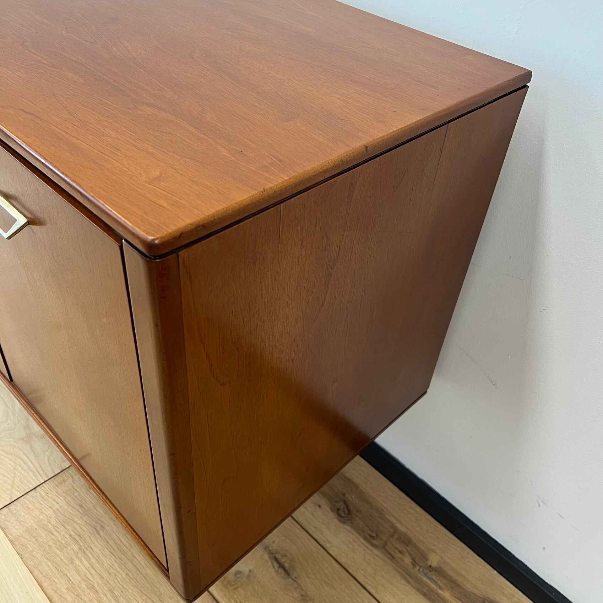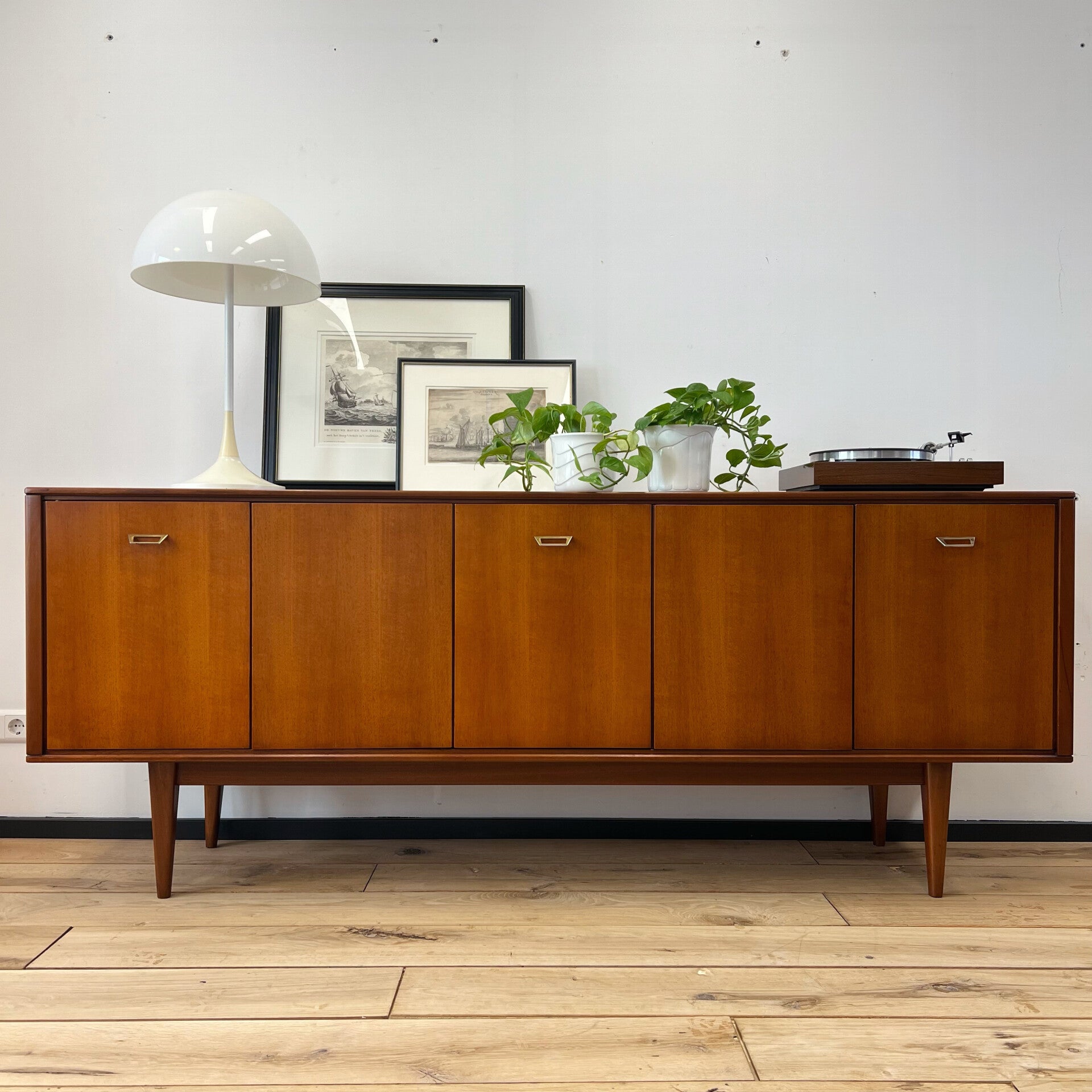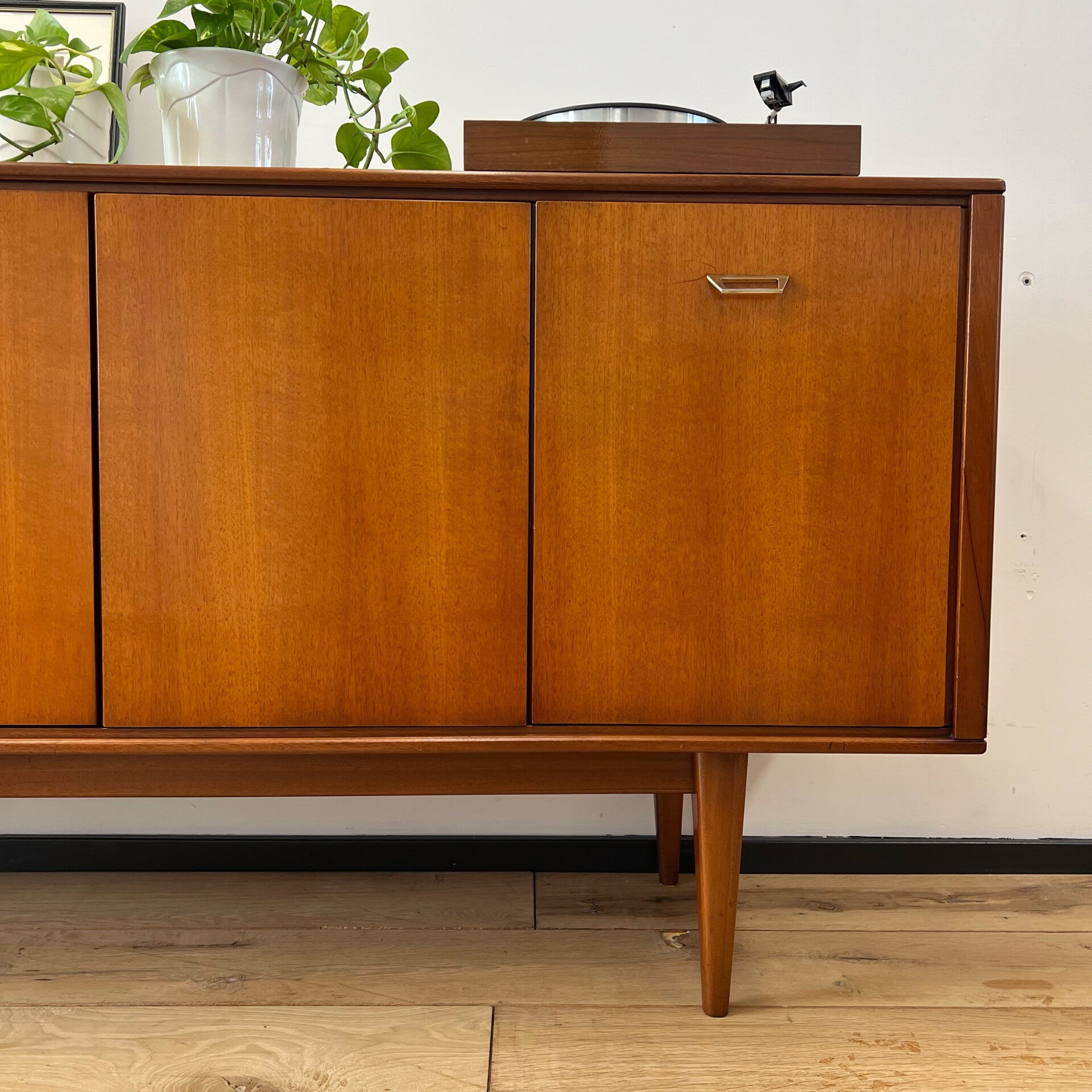 Mooi vintage dressoir, sideboard op slanke poten en prachtige originele greepjes.