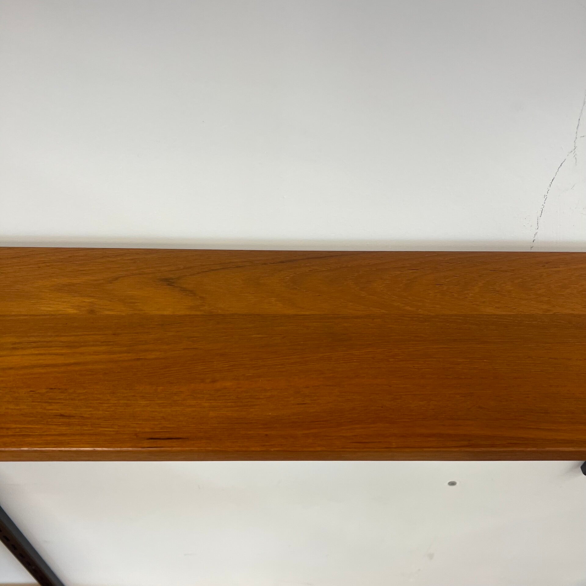 Uitgevoerd in teak met zwart metalen wandlatten.