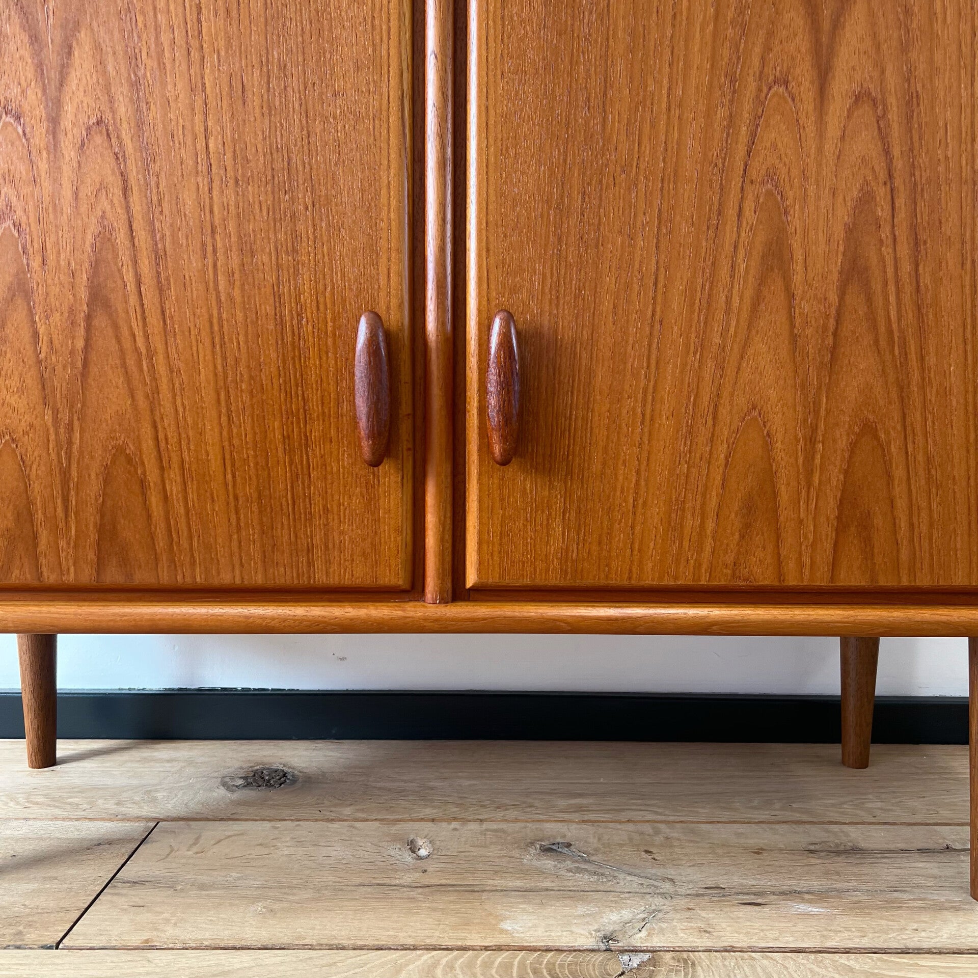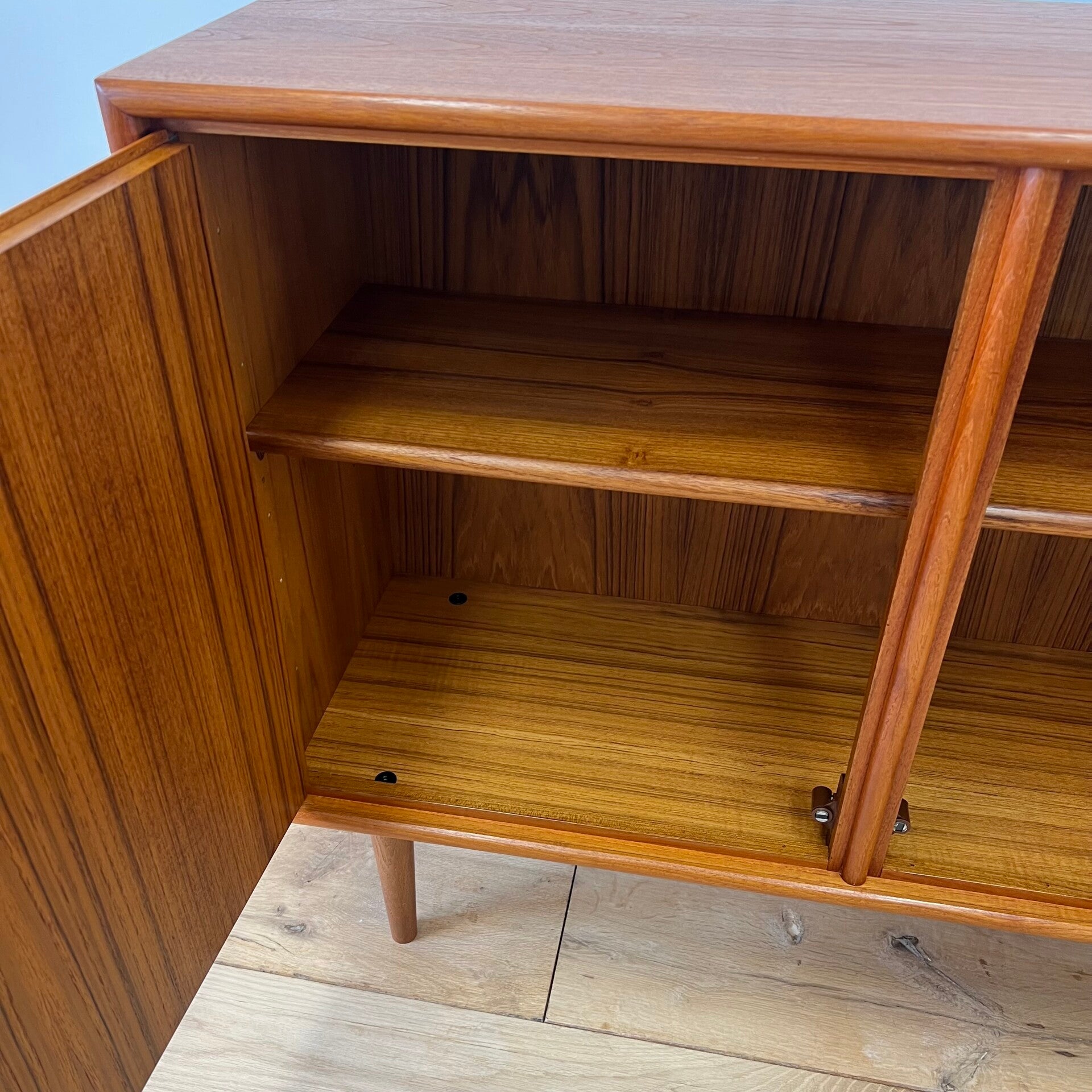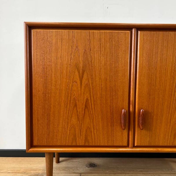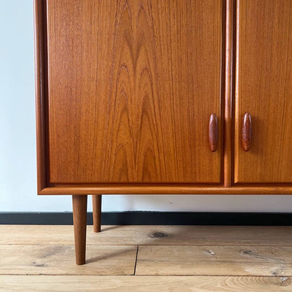 Heel mooi vintage kastje, dressoir uitgevoerd in teak en op slanke conische poten.