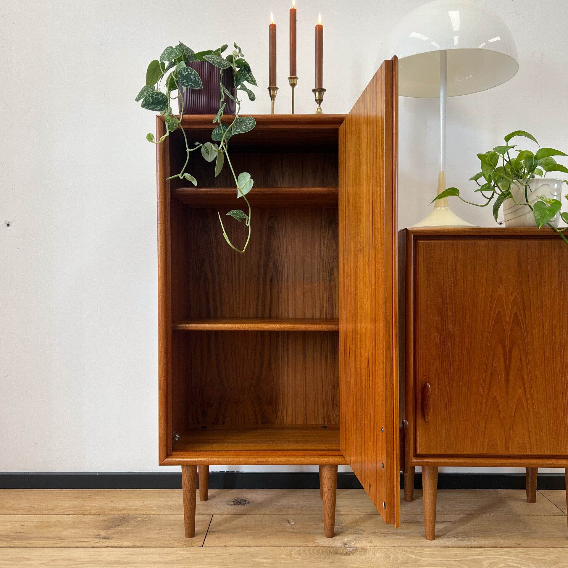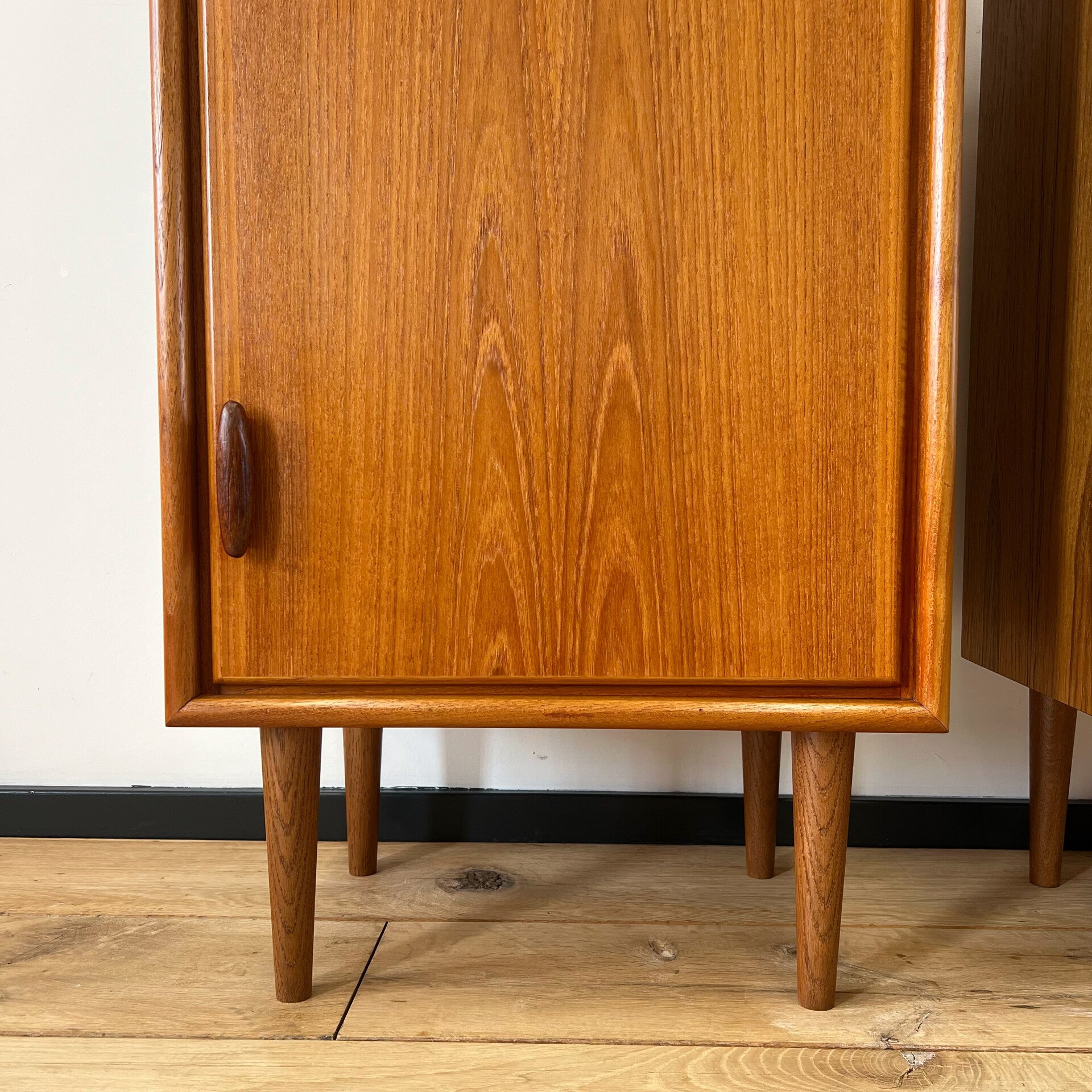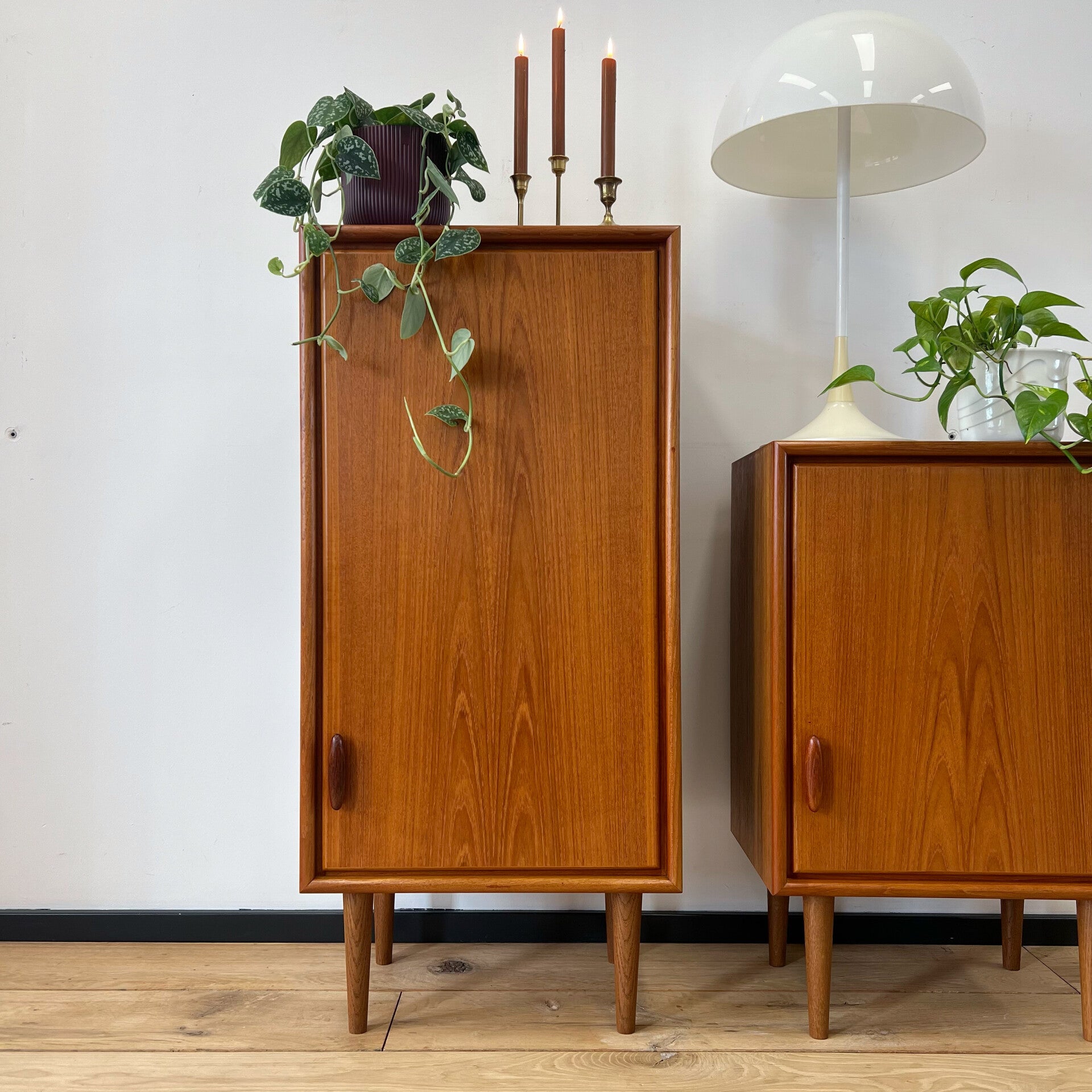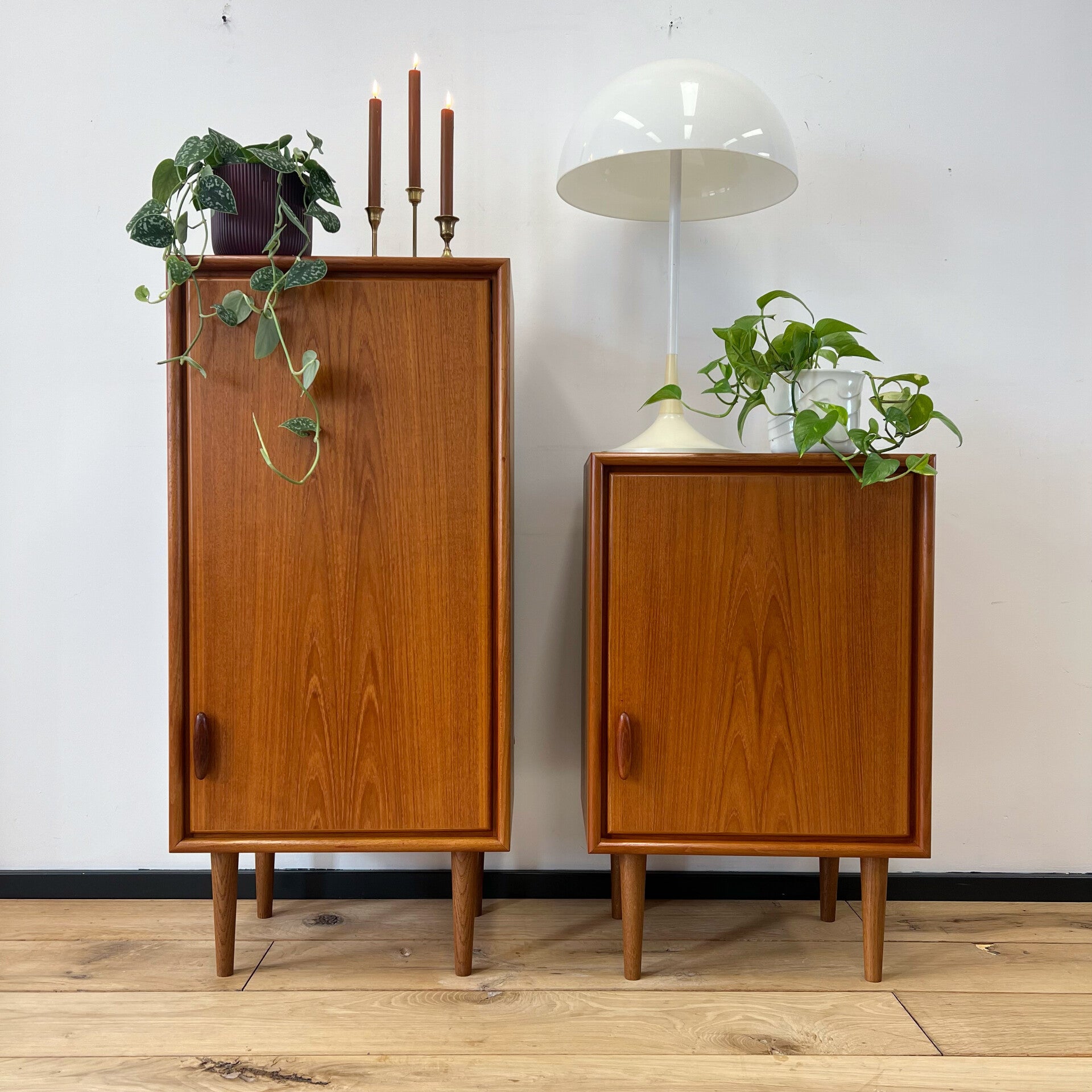 Set van 2 vintage kastjes (apart verkrijgbaar) uitgevoerd in een zware kwaliteit teak en op slanke conische poten.