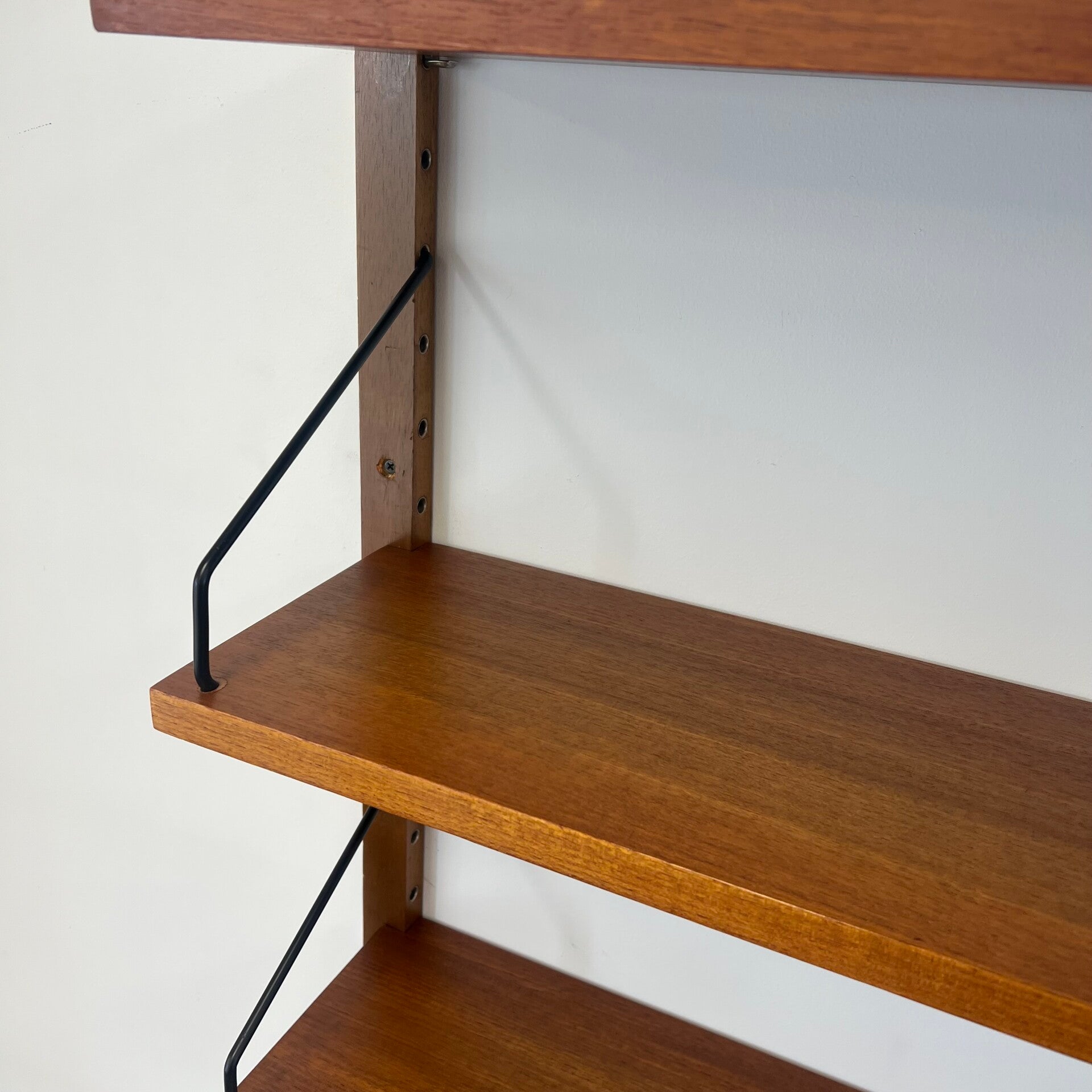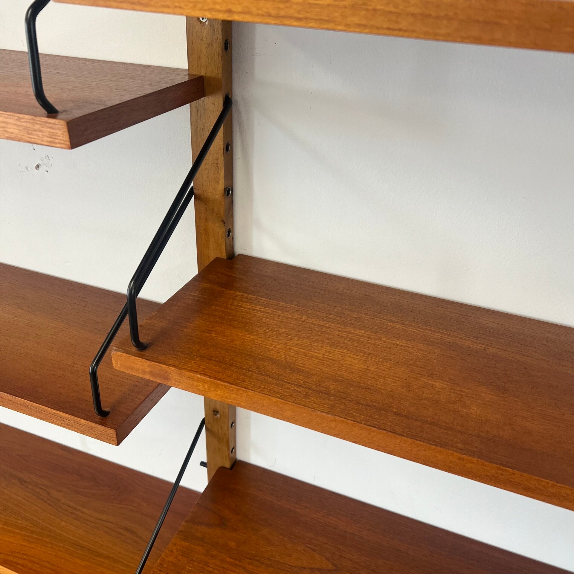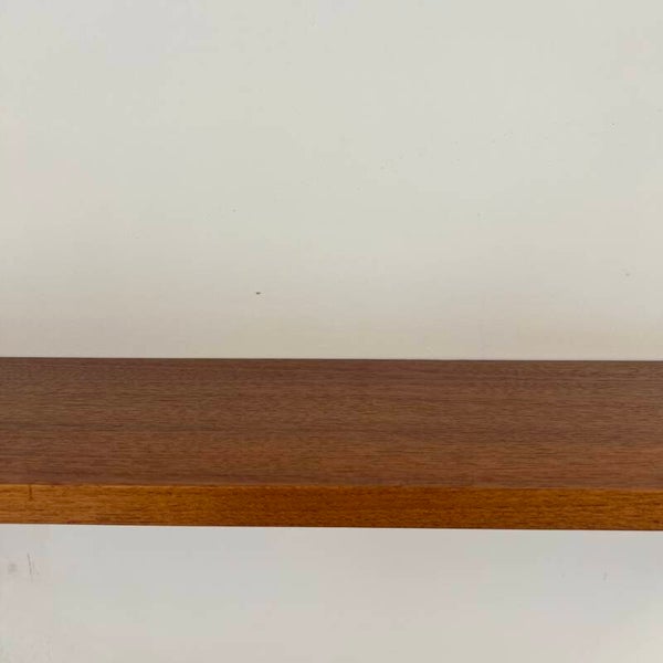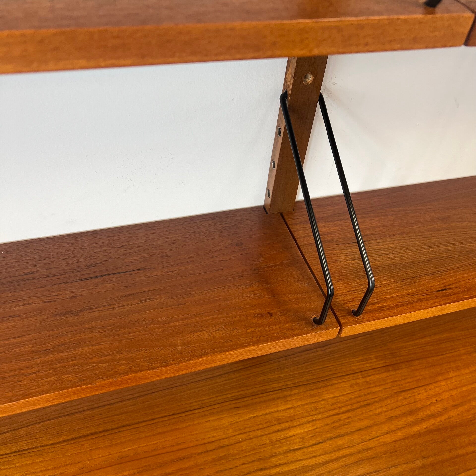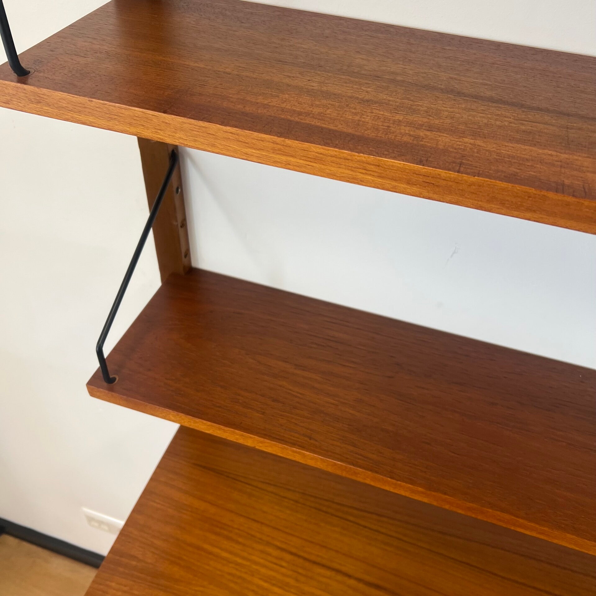 Uitgevoerd in teak (fineer) met houten wandlatten en zwart metalen beugels.