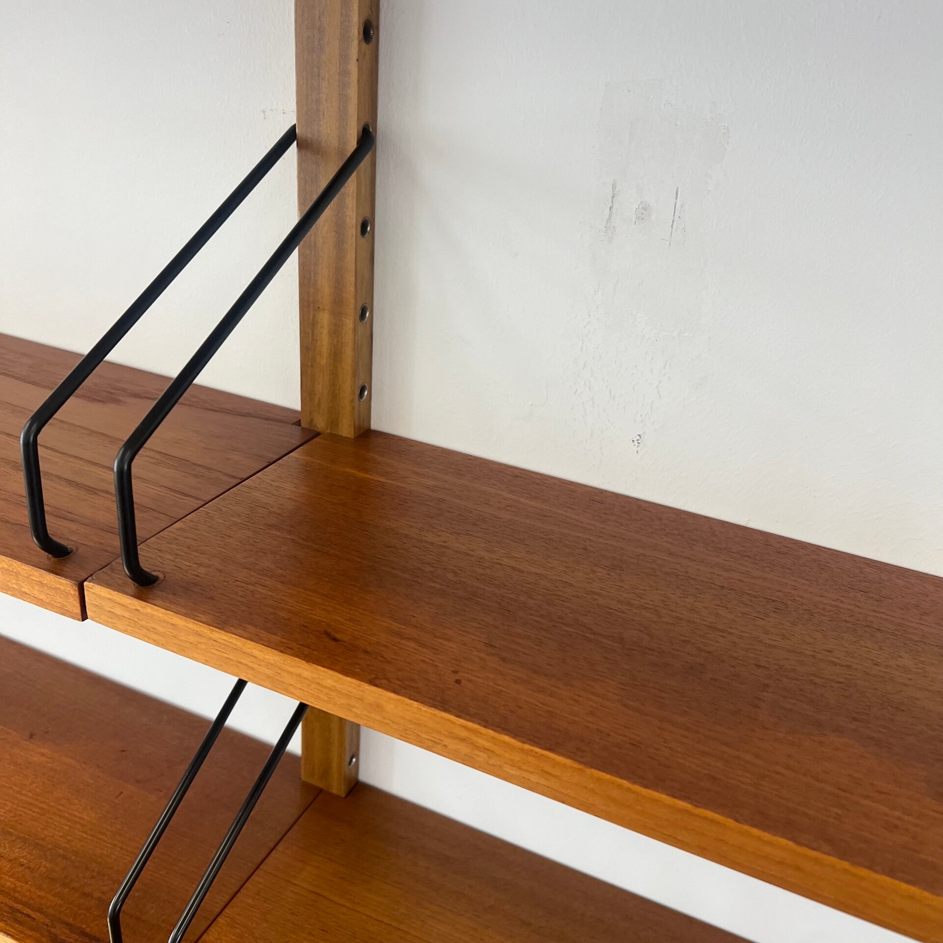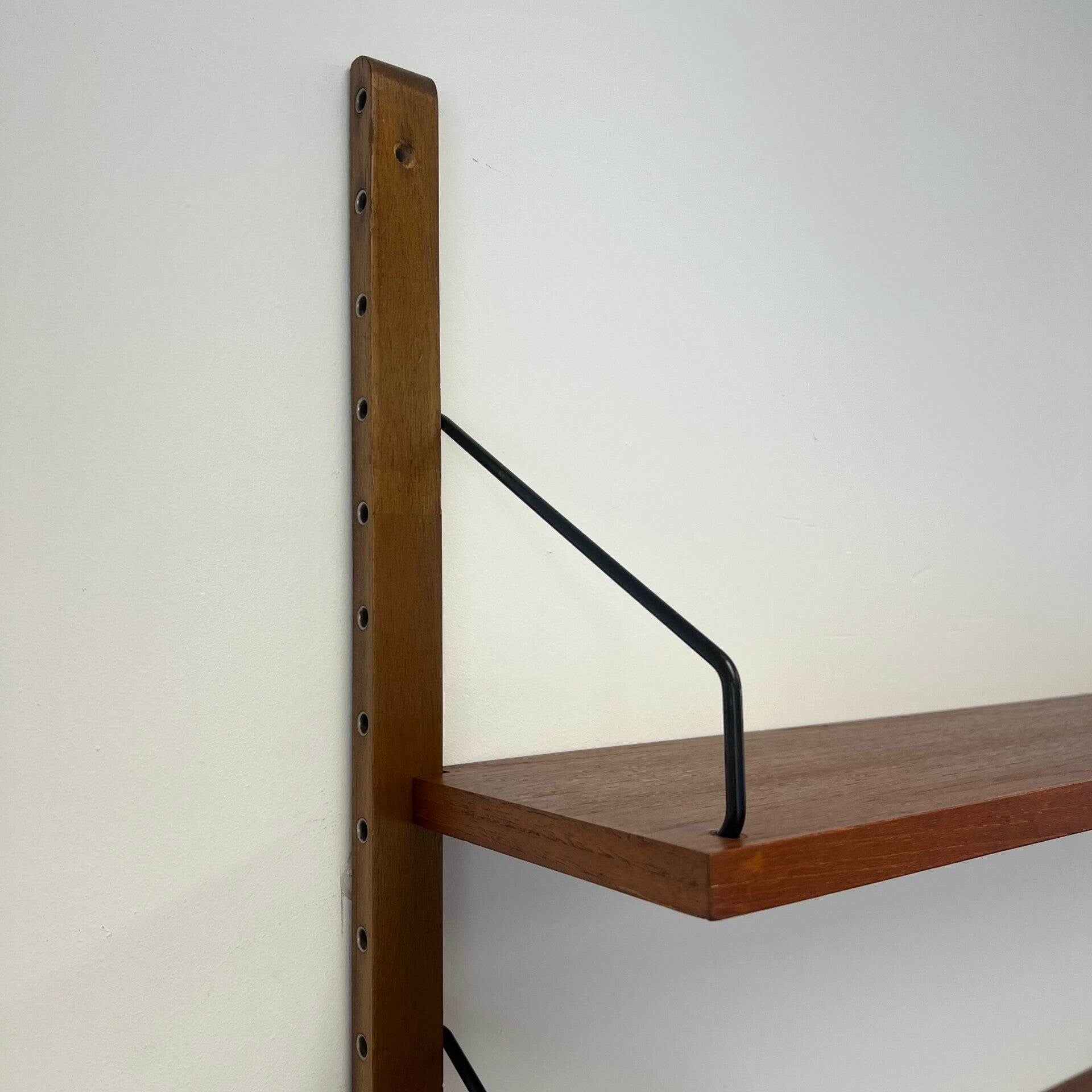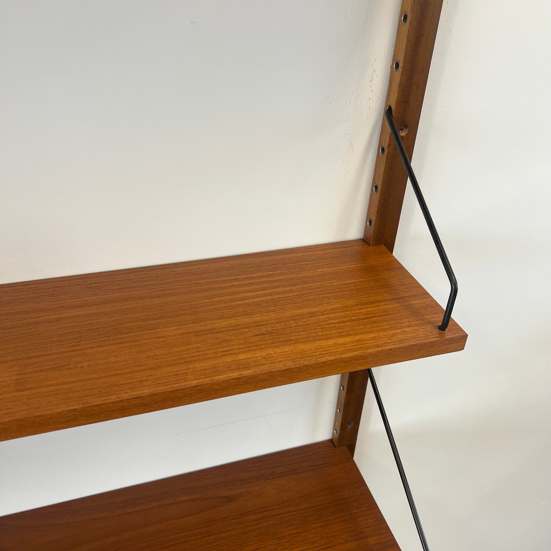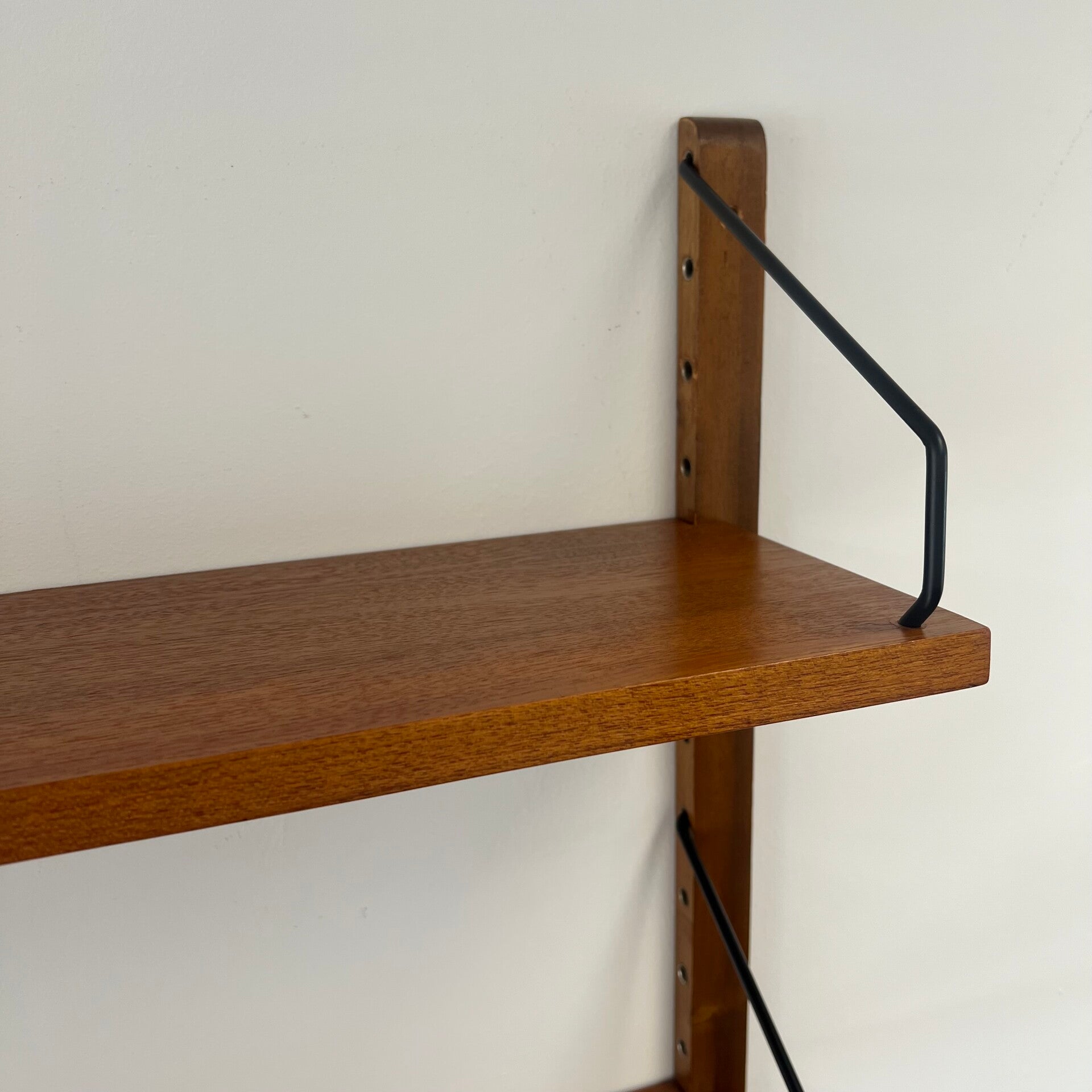Uitgevoerd in teak (fineer) met houten wandlatten en zwart metalen beugels.