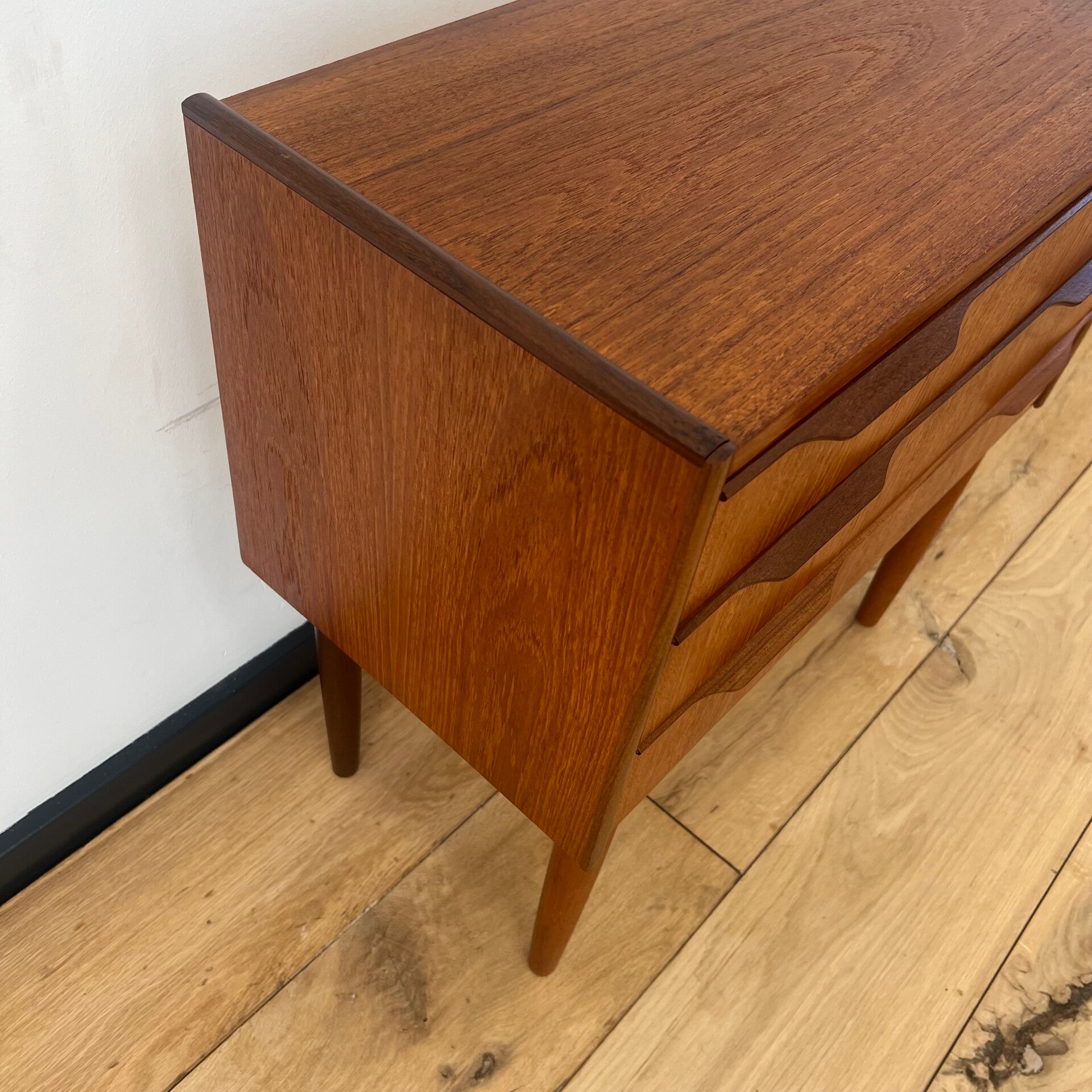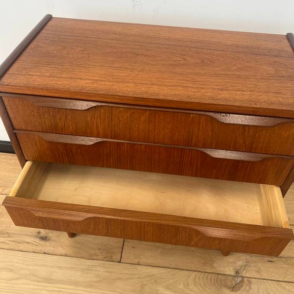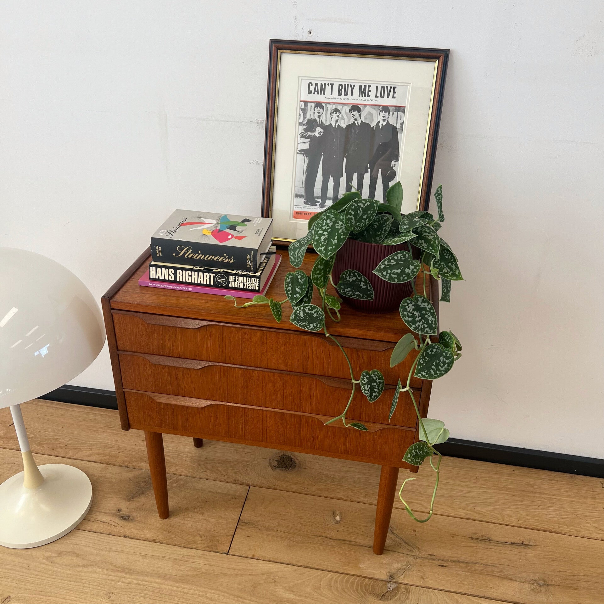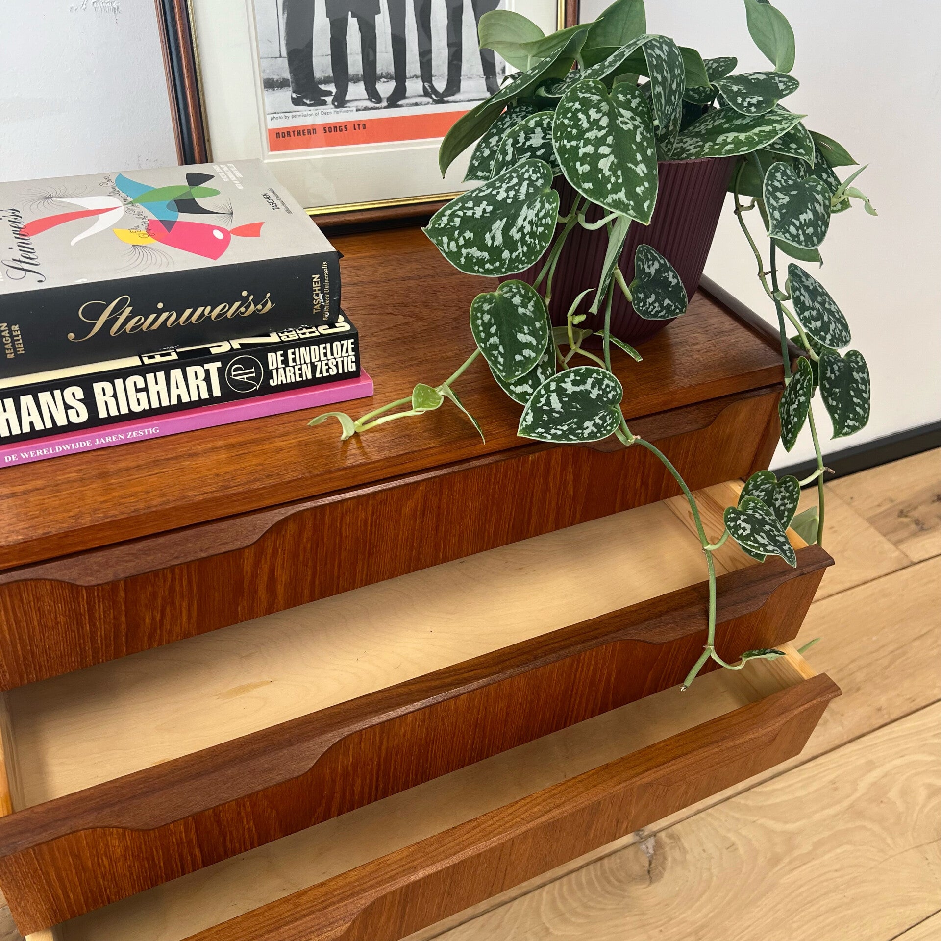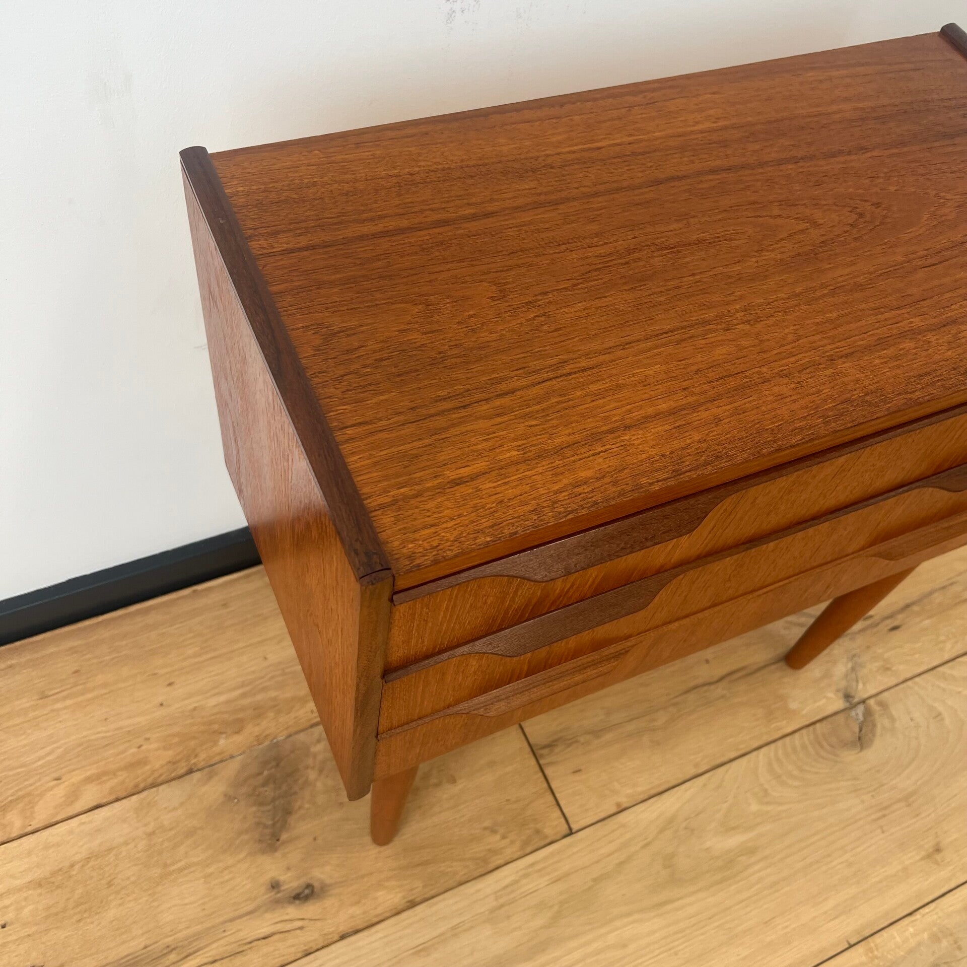 Mooi vintage ladekastje, uitgevoerd in teak (fineer) met vakkundig gevormde handgrepen en slanke conische pootjes.