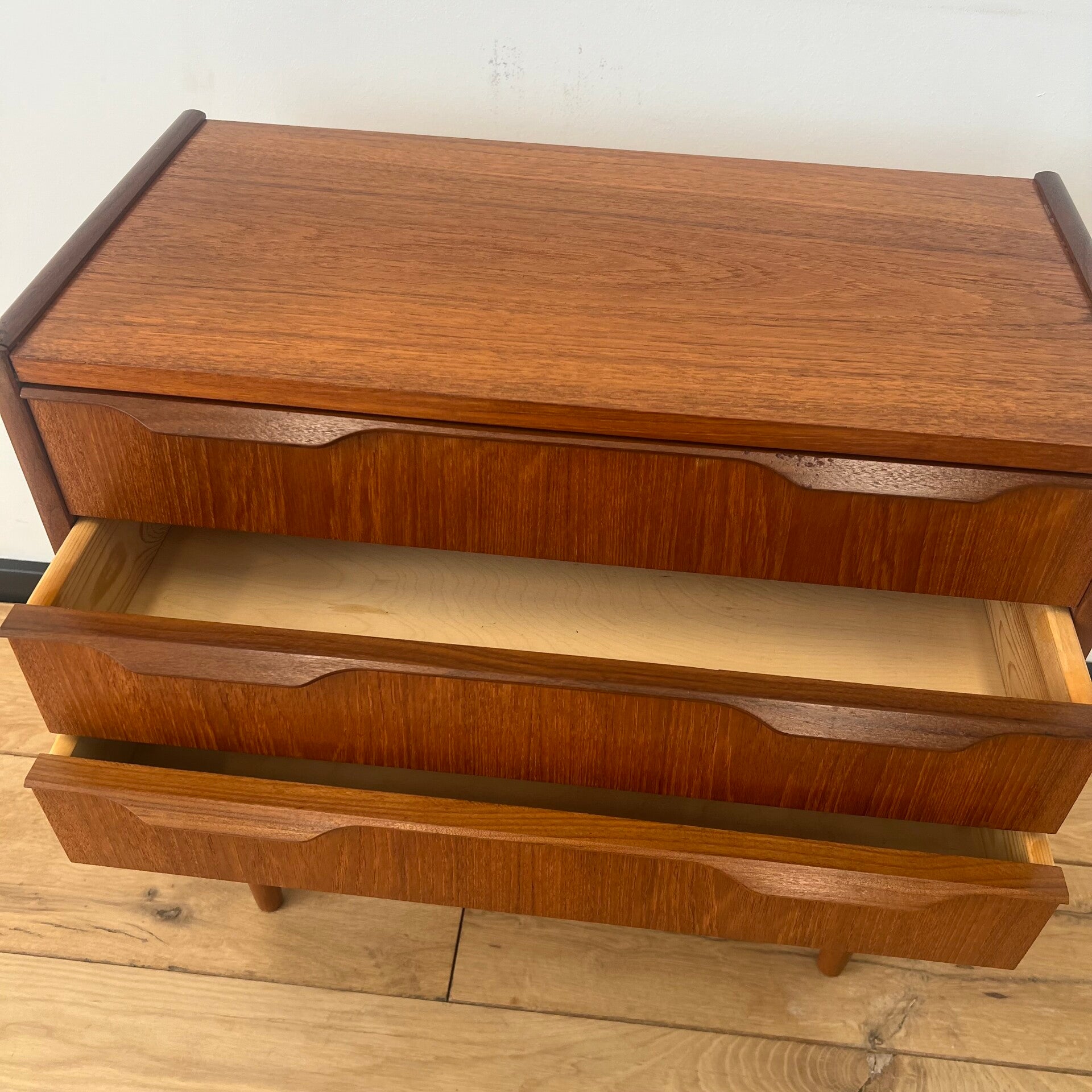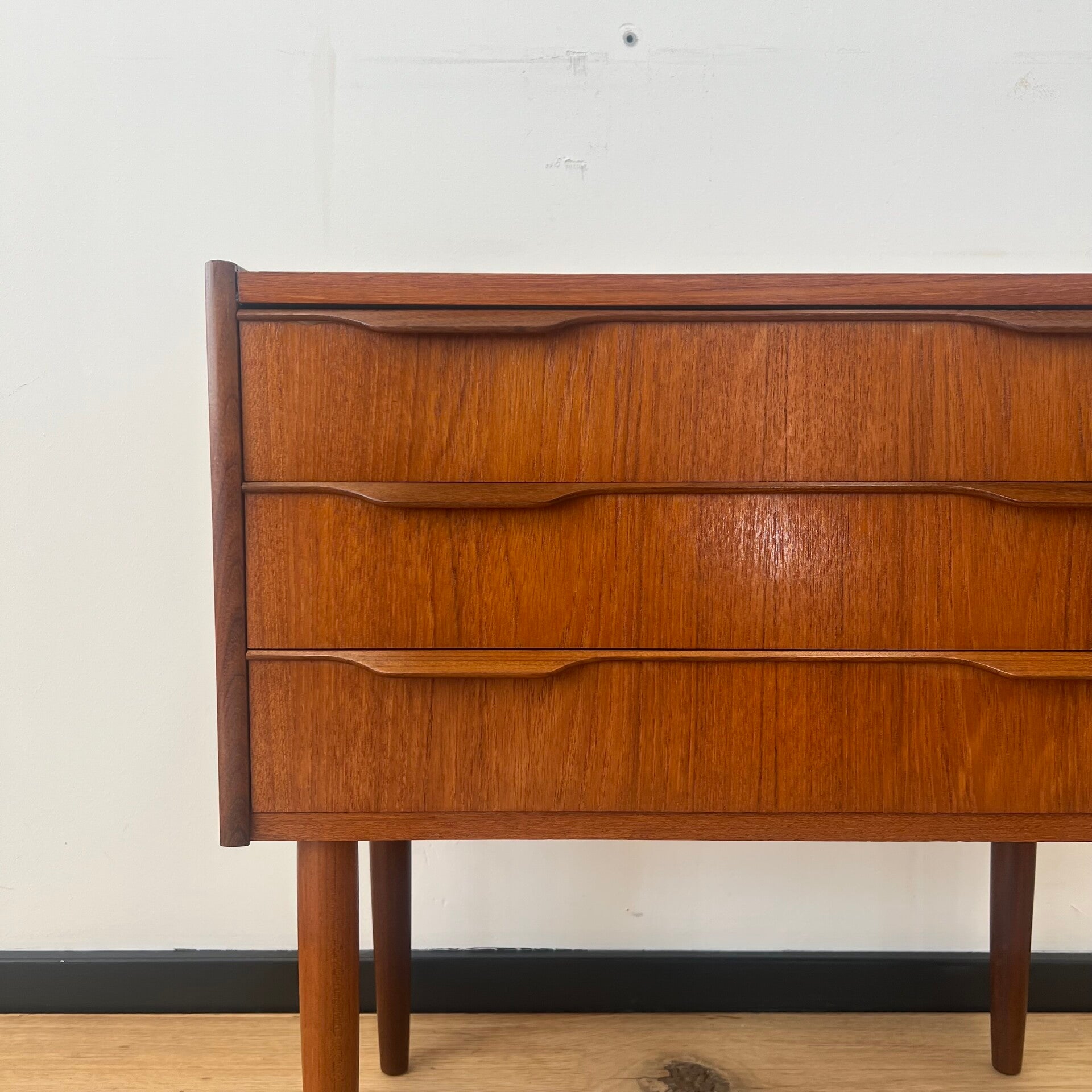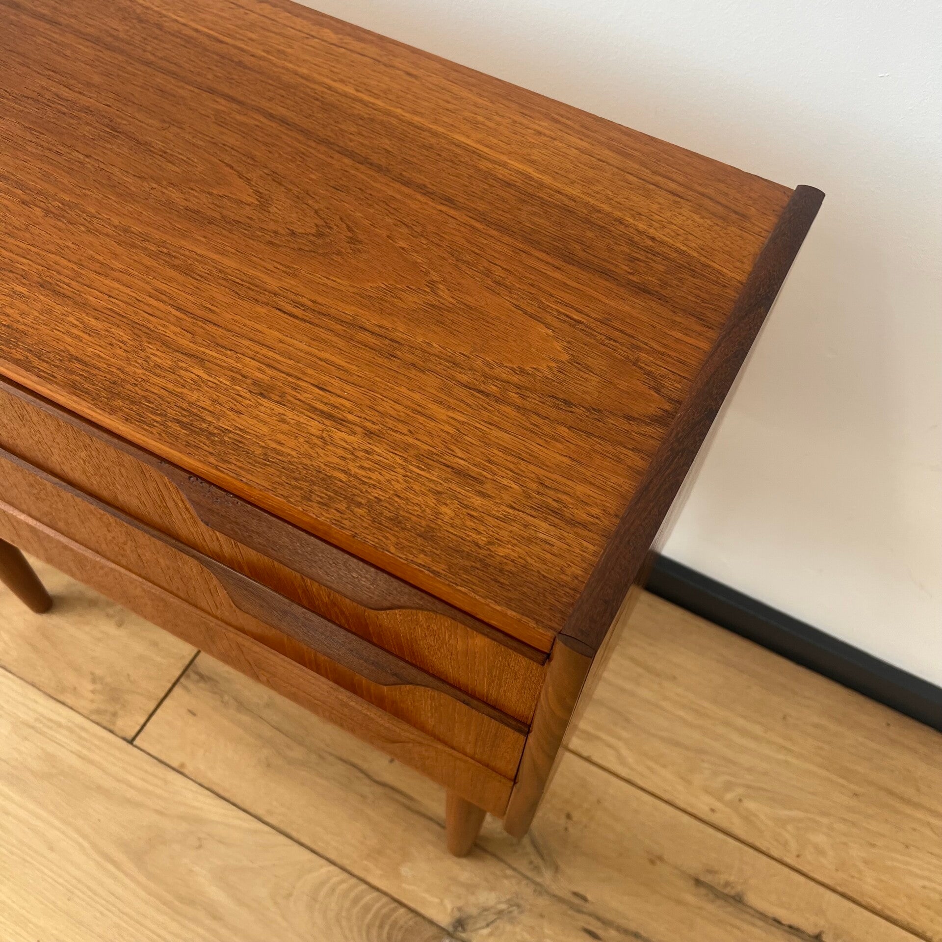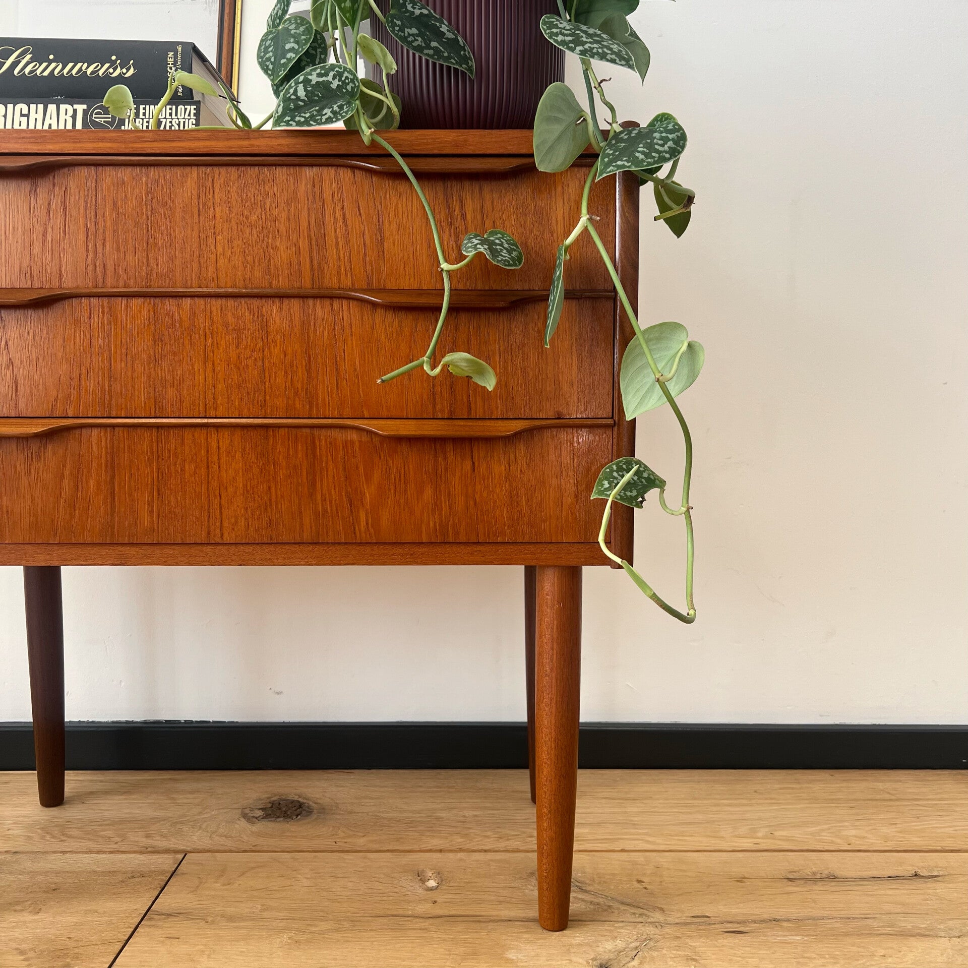 Mooi vintage ladekastje, uitgevoerd in teak (fineer) met vakkundig gevormde handgrepen en slanke conische pootjes.