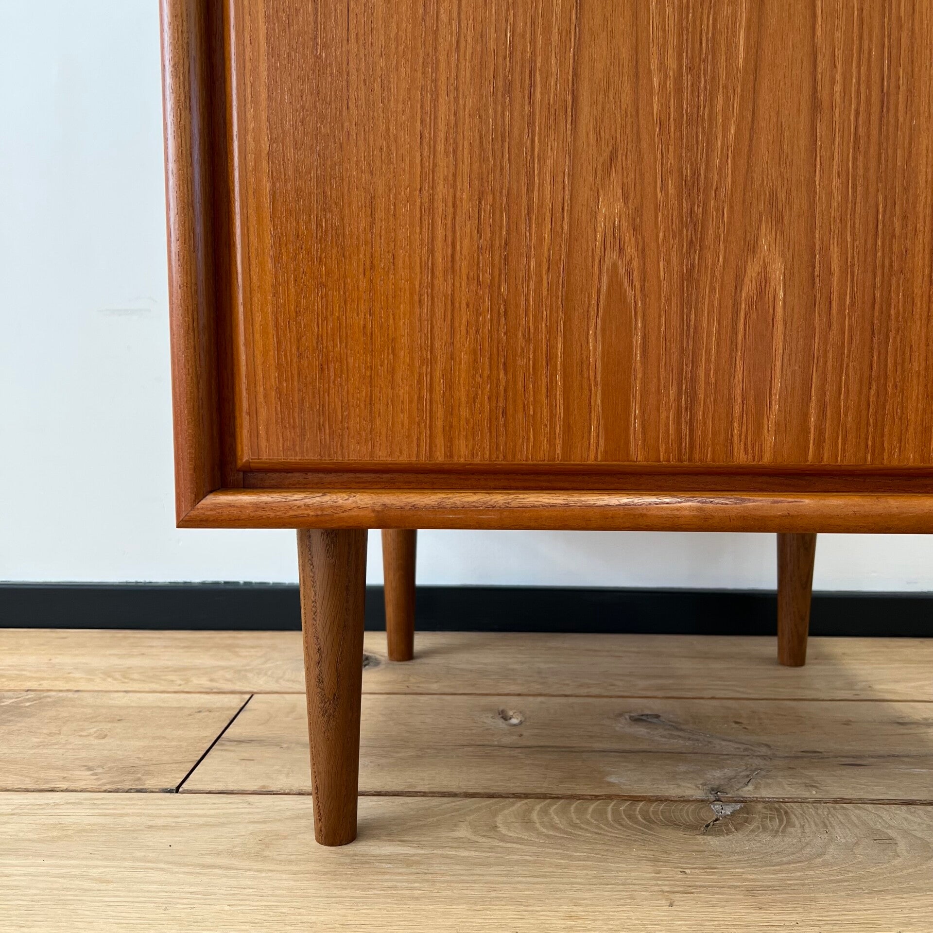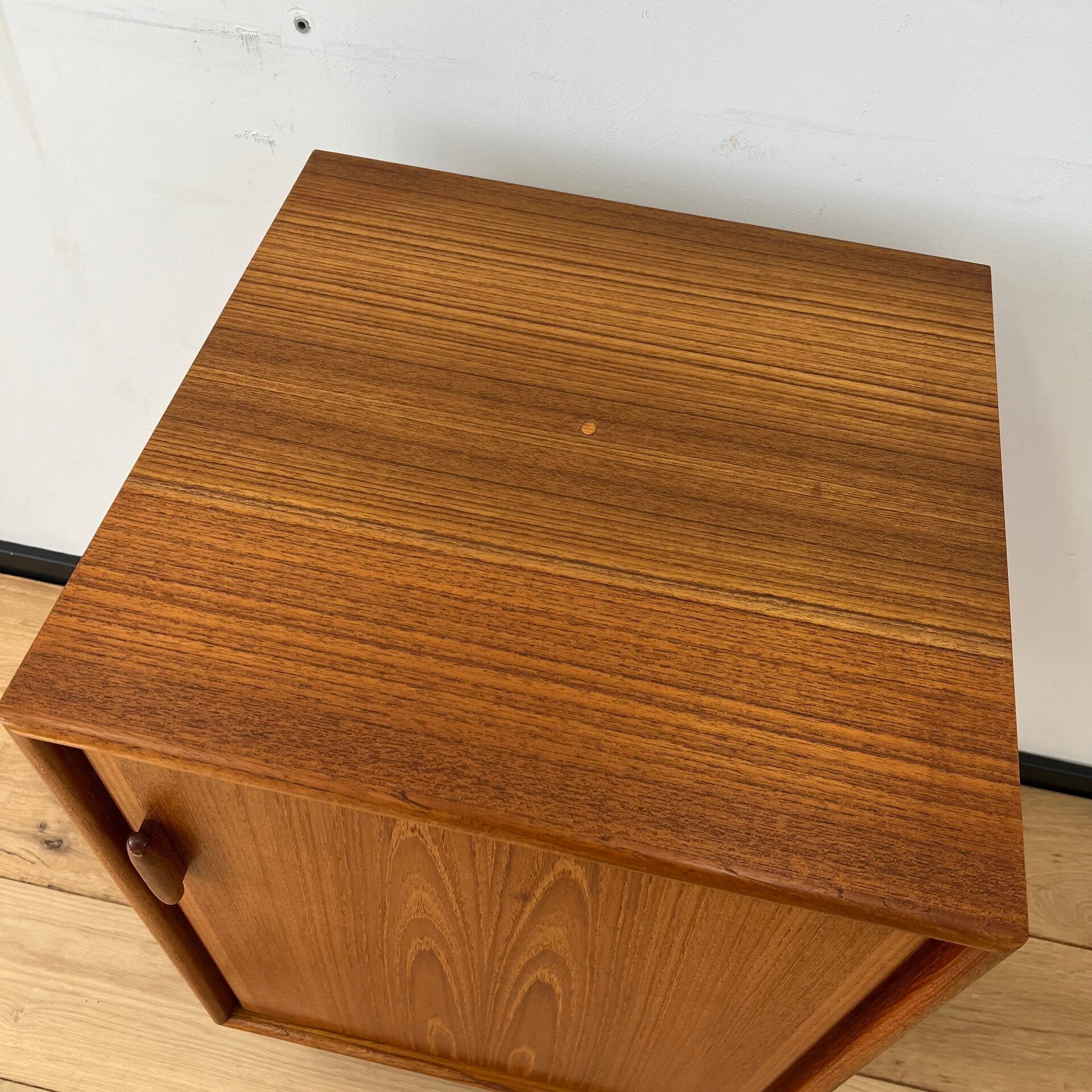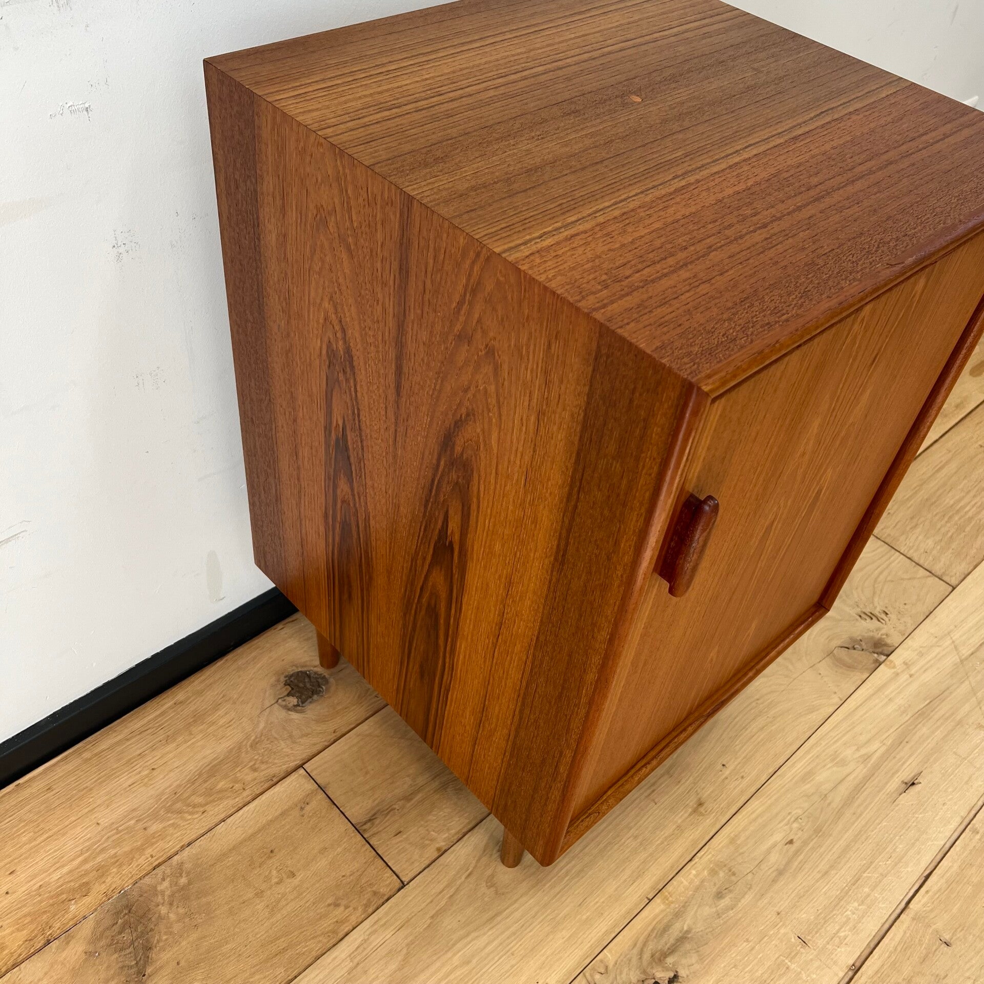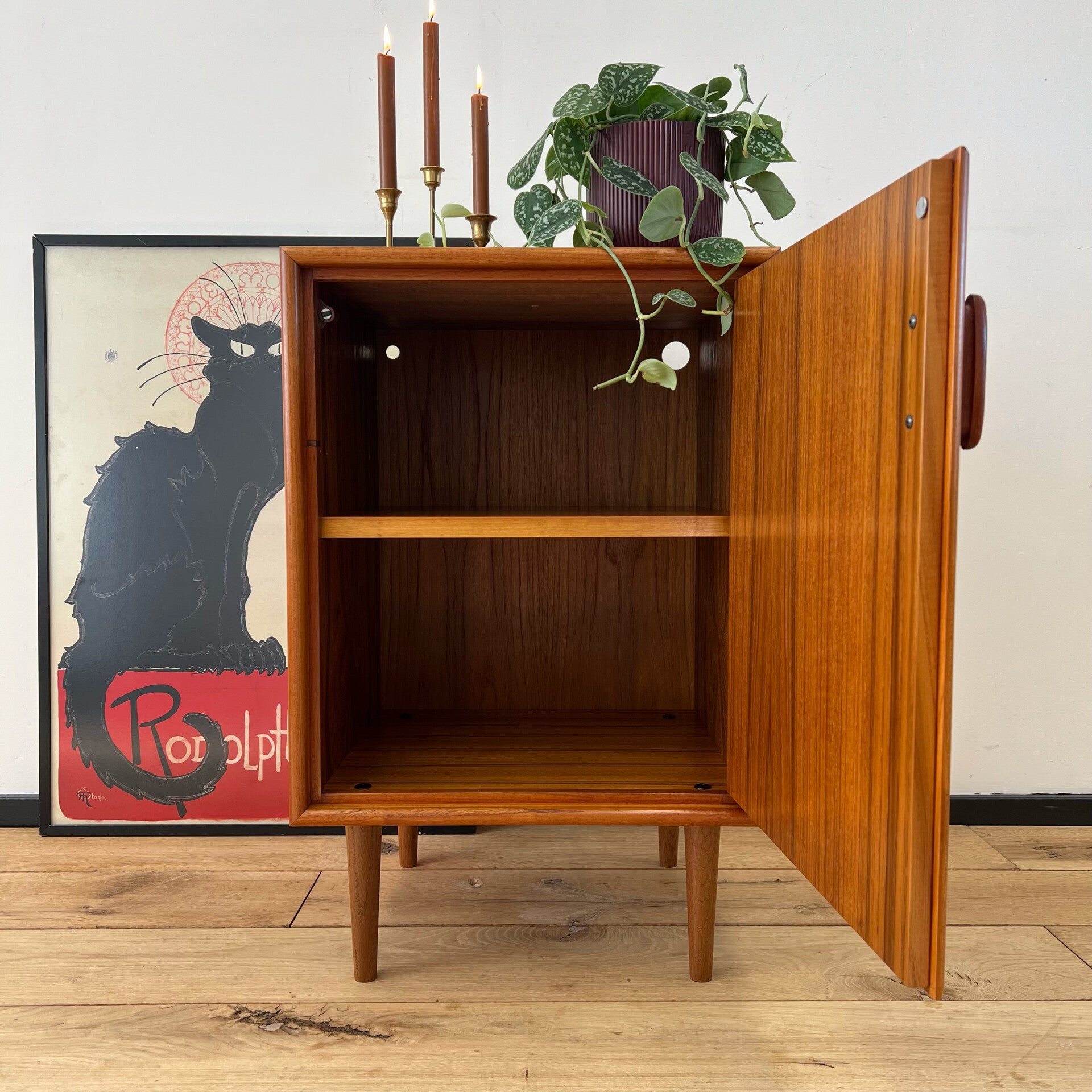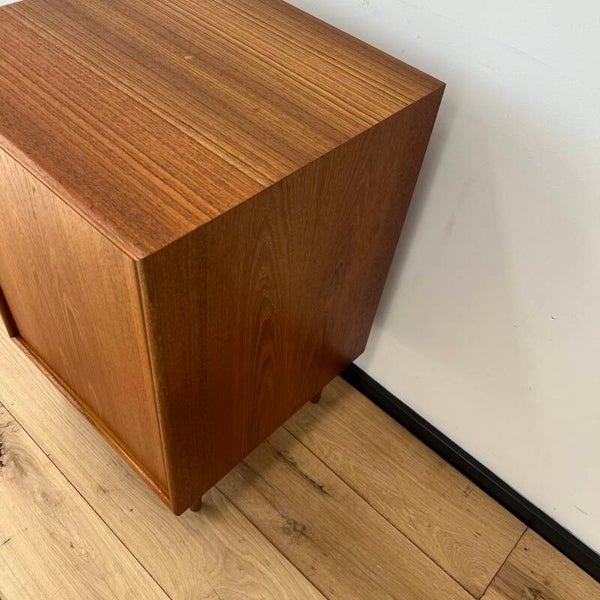 Heel mooi vintage kastje, diep model, uitgevoerd in teak en op slanke conische poten.