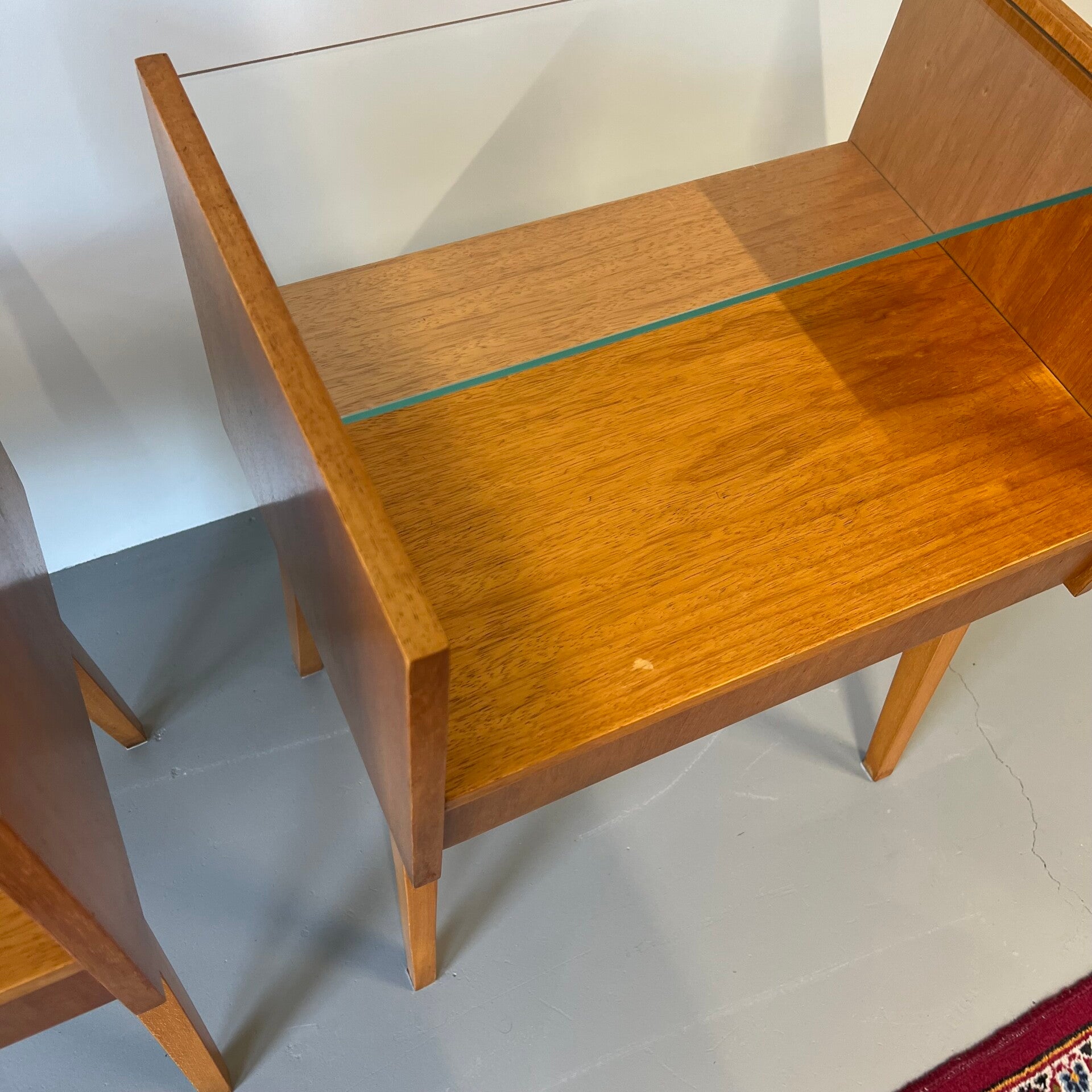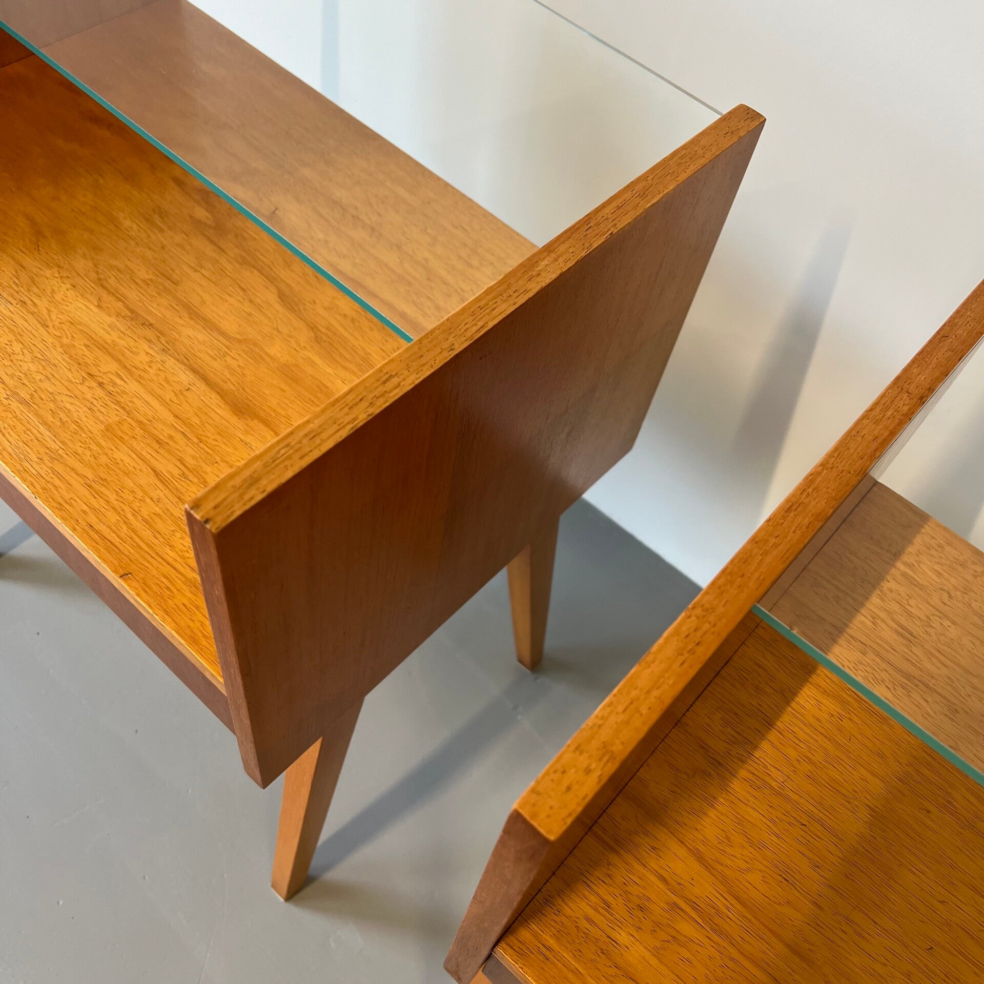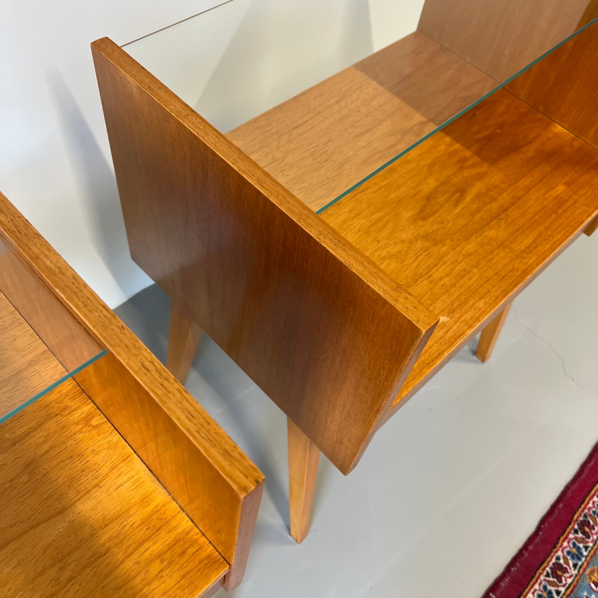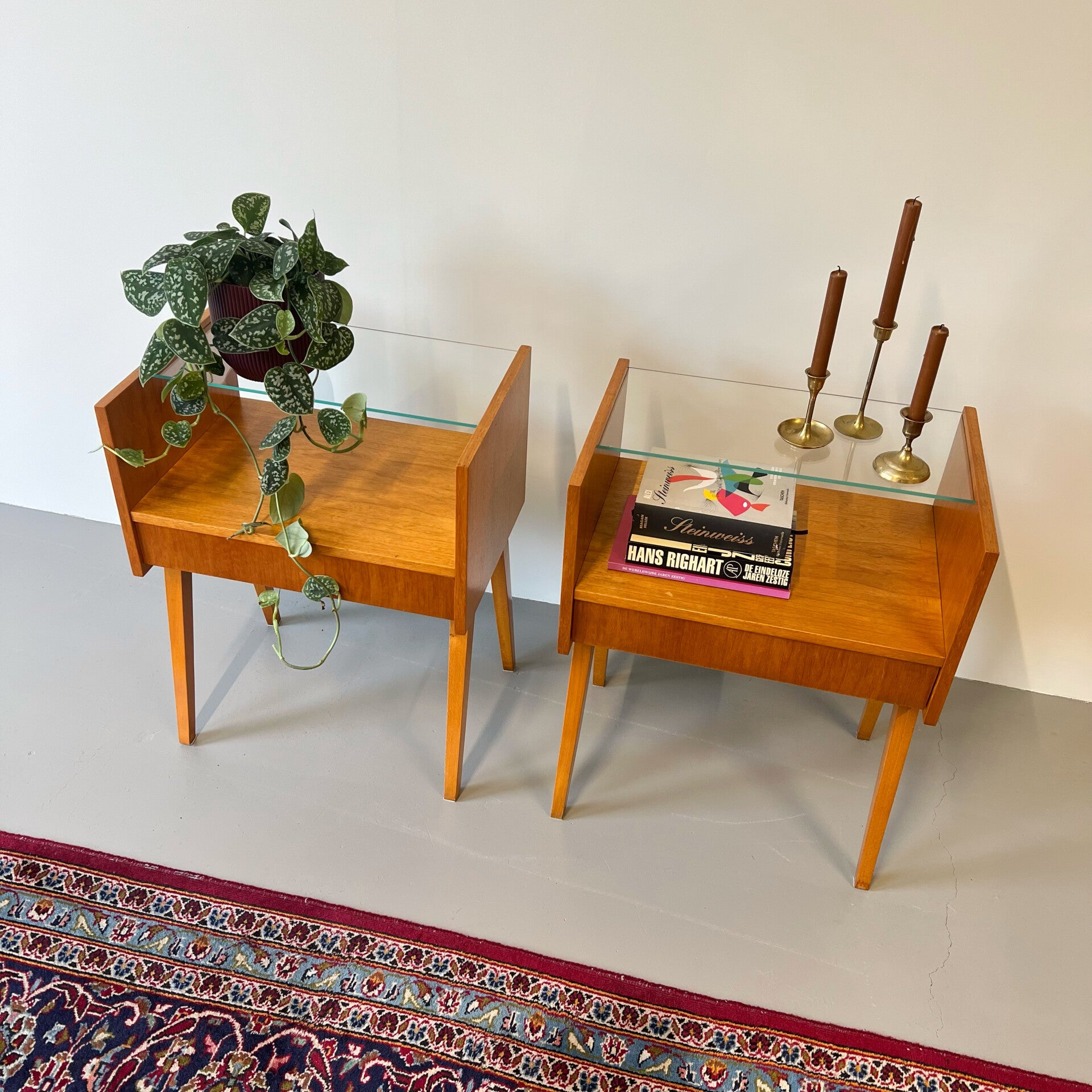 2 leuke vintage (nacht) kastjes met glazen plaat en hoge slanke poten.