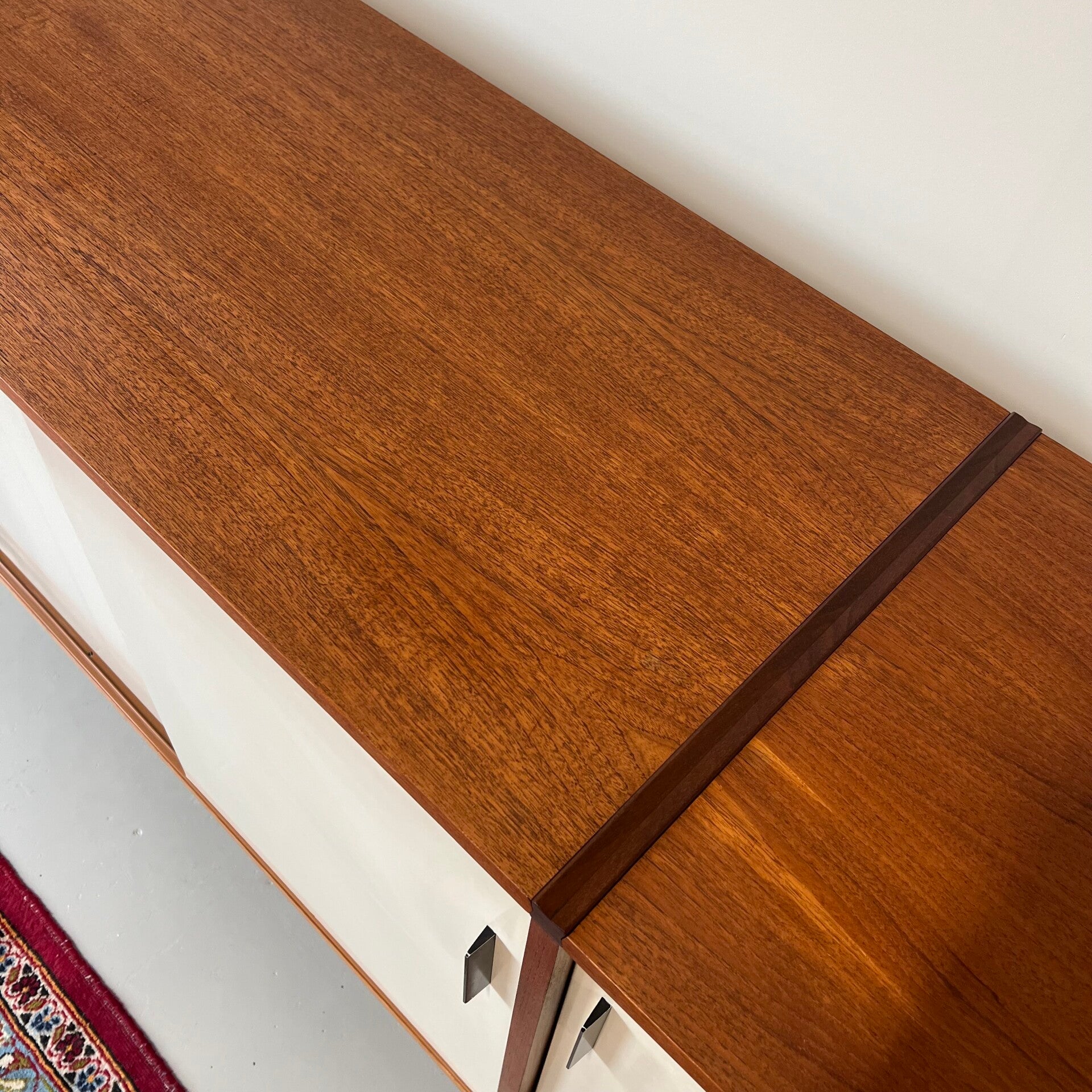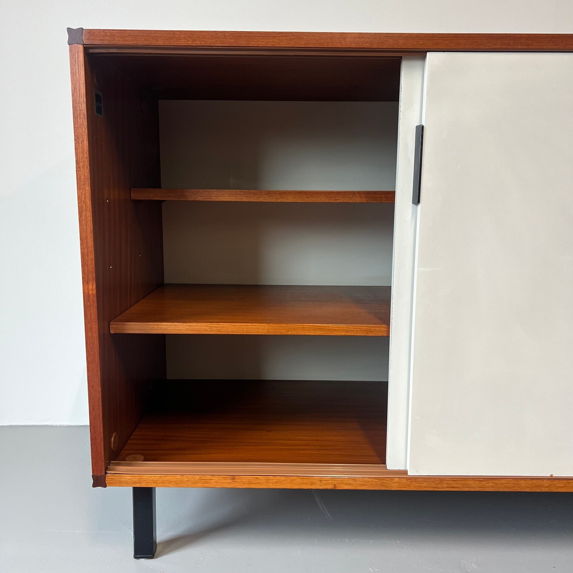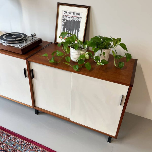 Ontworpen door de Nederlandse ontwerper Cees Braakman en uitgevoerd in teak (fineer) met witte frontjes (patina) en zwart metalen handgrepen + verstelbare pootjes.