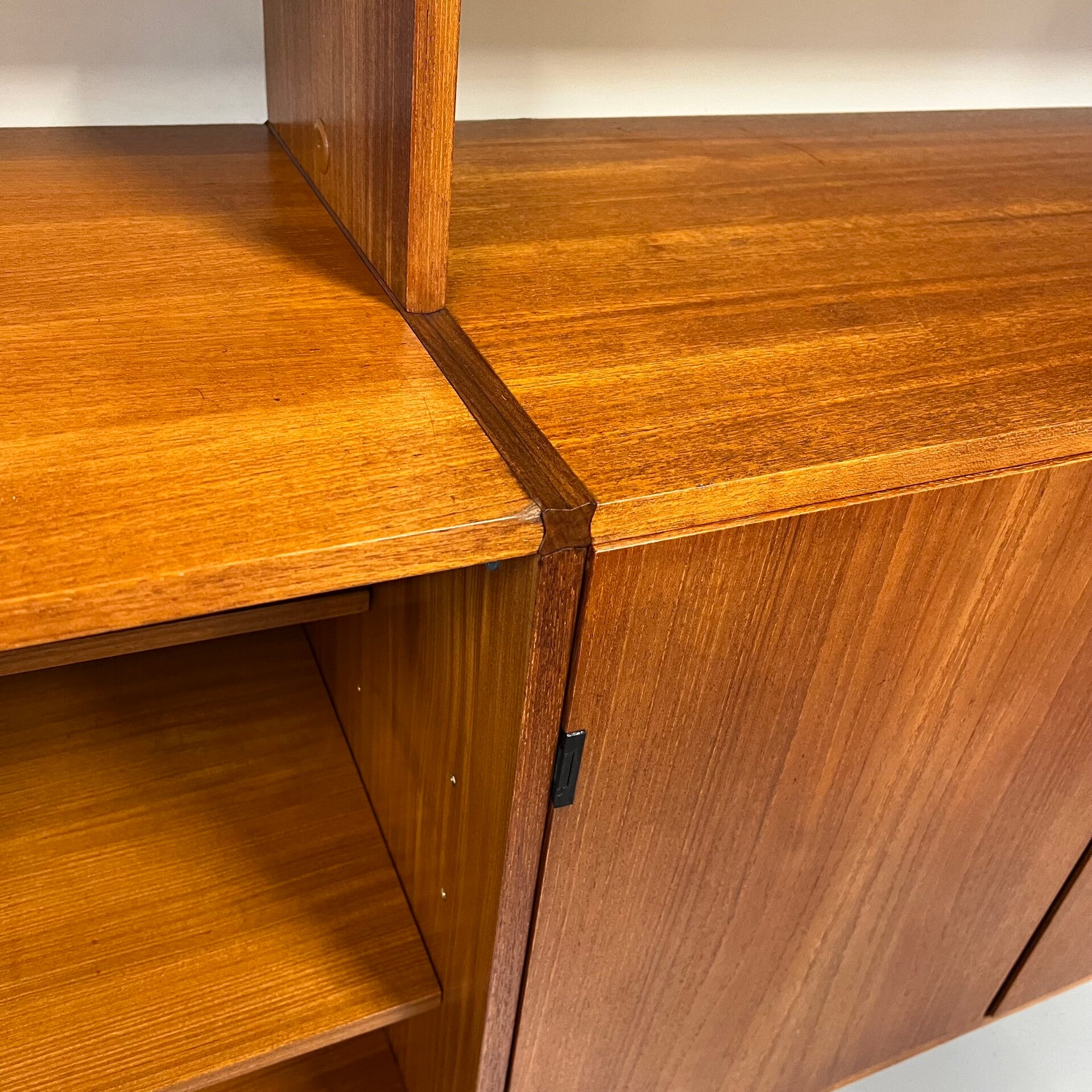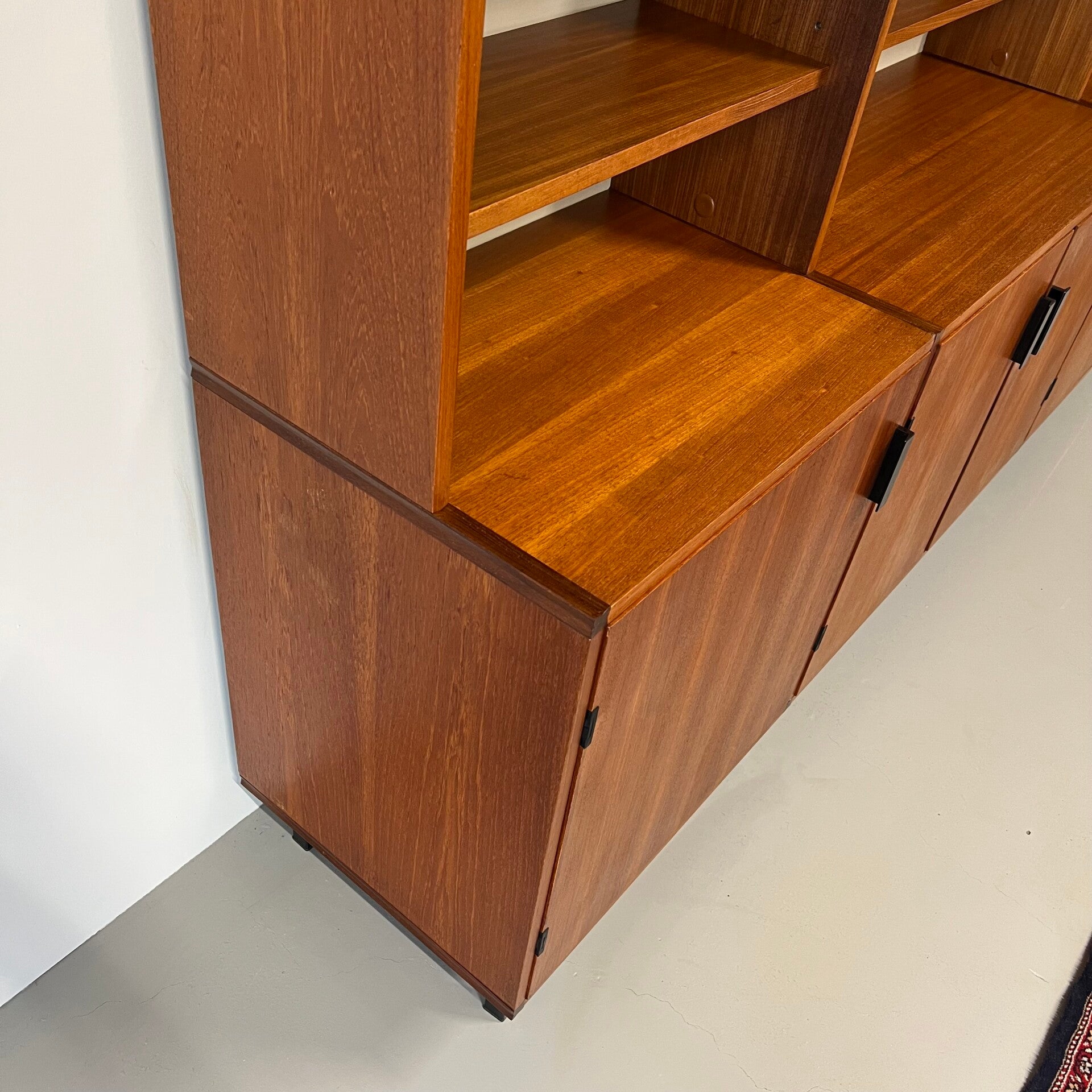 Indrukwekkend XL wandmeubel, uitgevoerd in teak (fineer) met zwarte stelpootjes en bakelieten beslag.