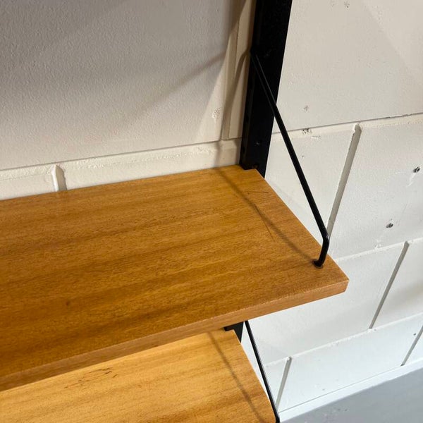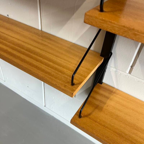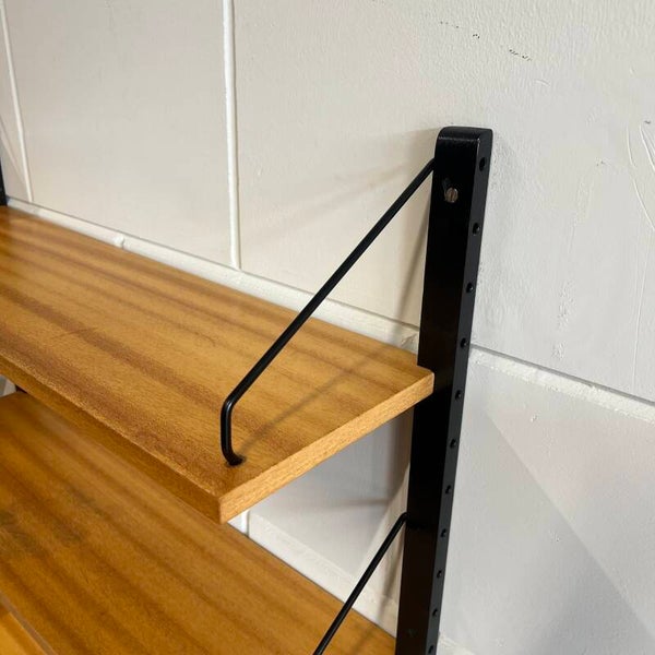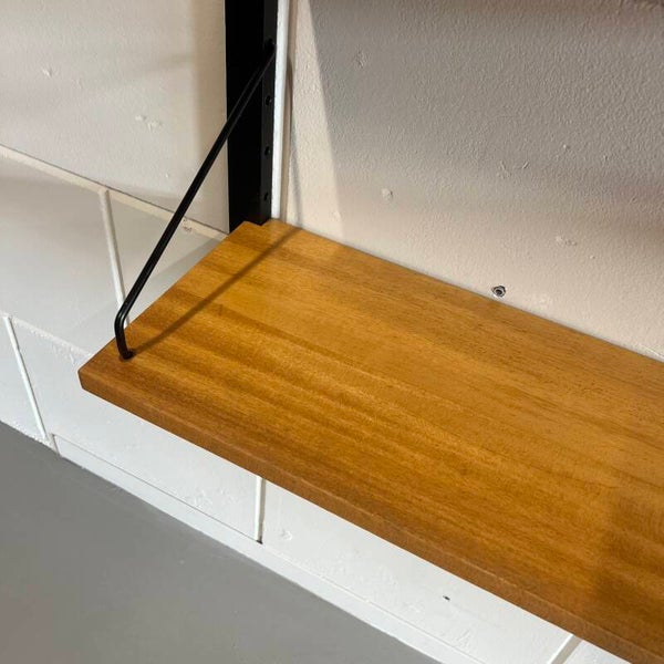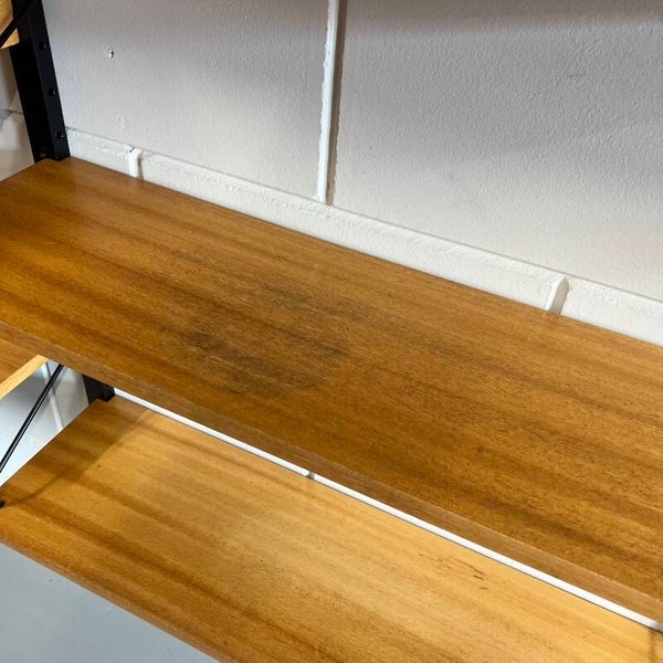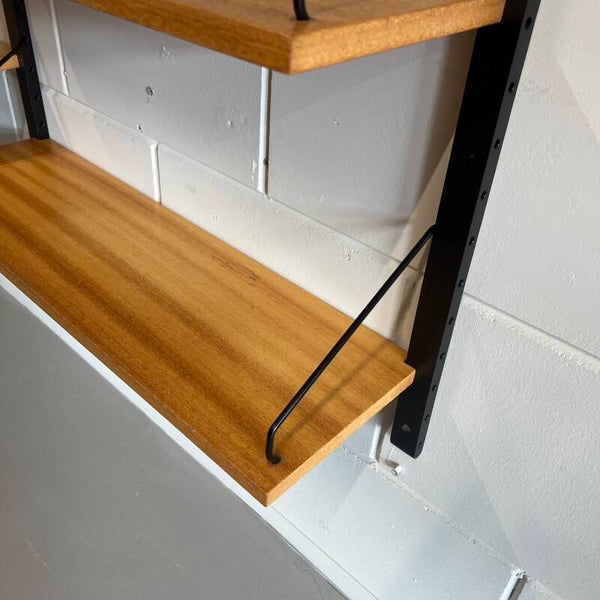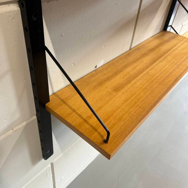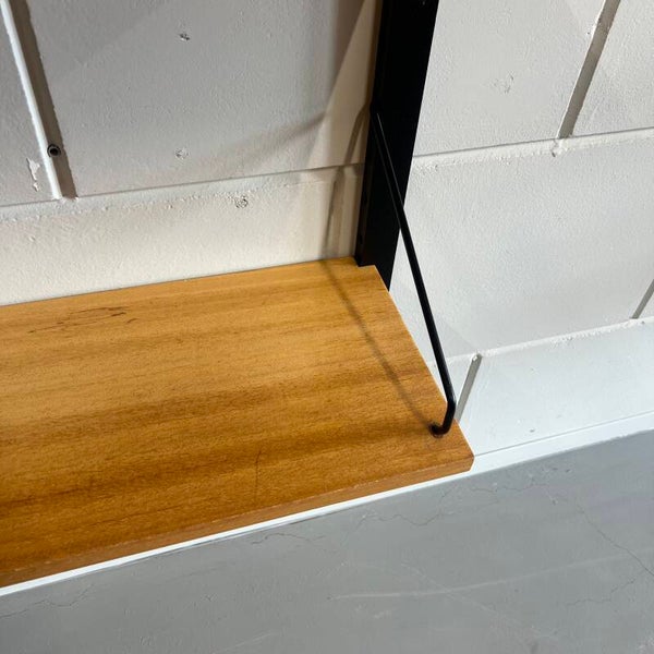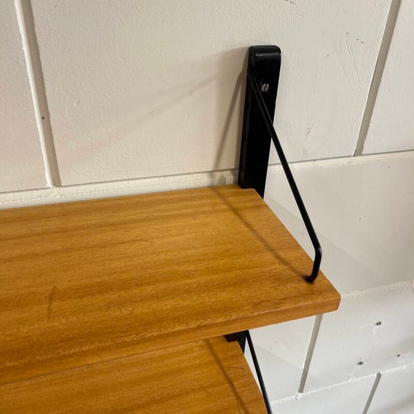Uitgevoerd in golden teak met zwart houten wandlatten (opnieuw gespoten) en zwart metalen beugels.