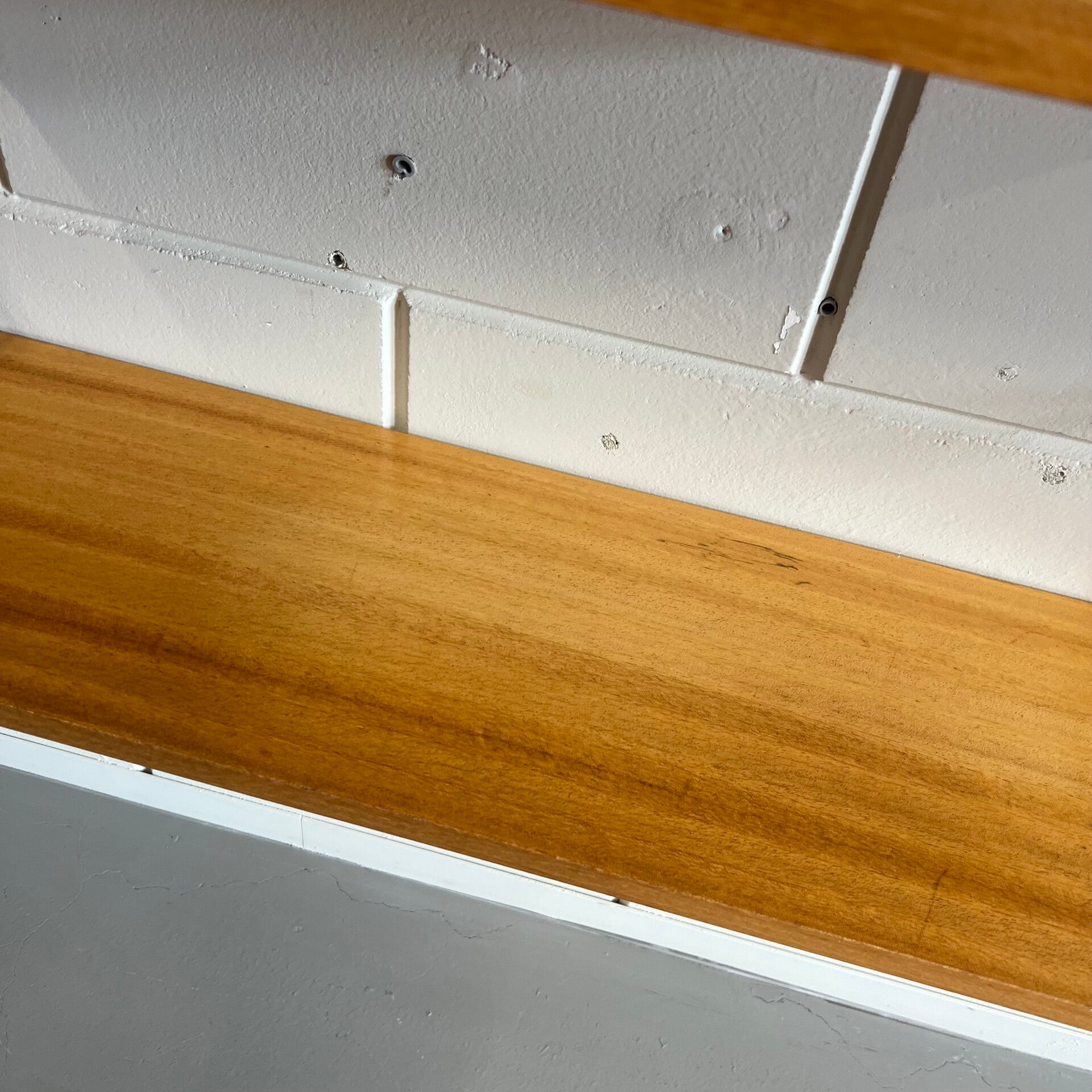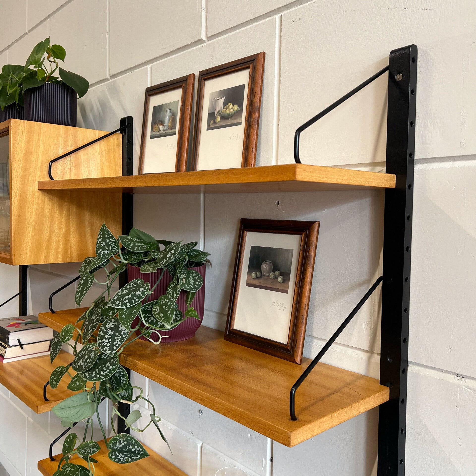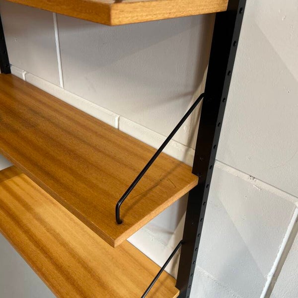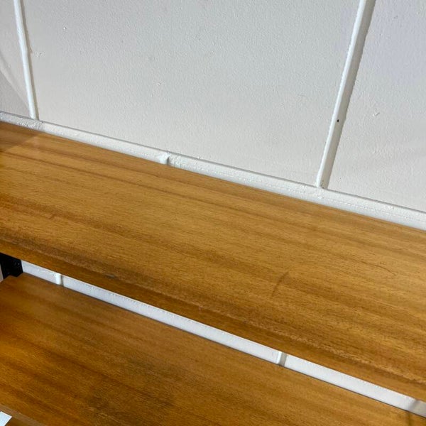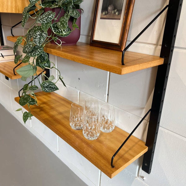 Uitgevoerd in golden teak met zwart houten wandlatten (opnieuw gespoten) en zwart metalen beugels.