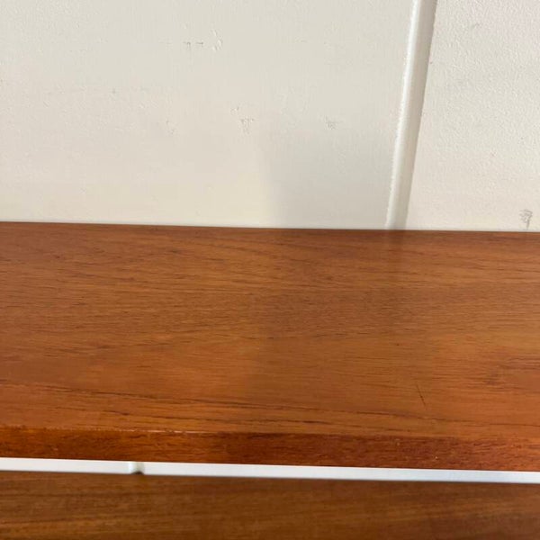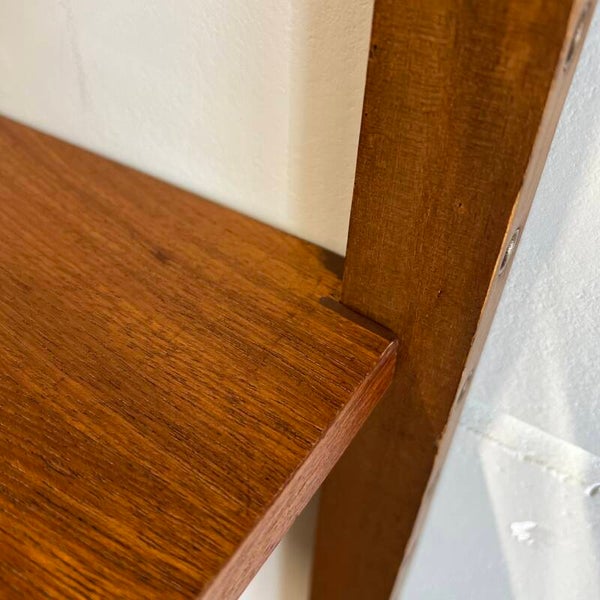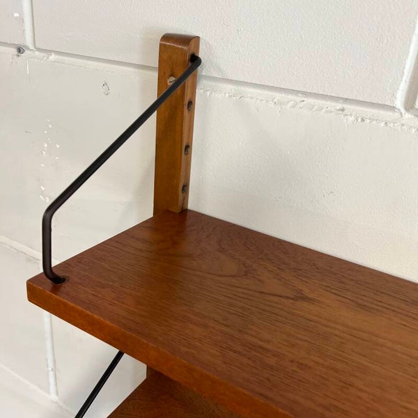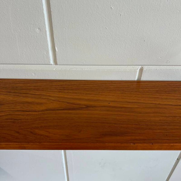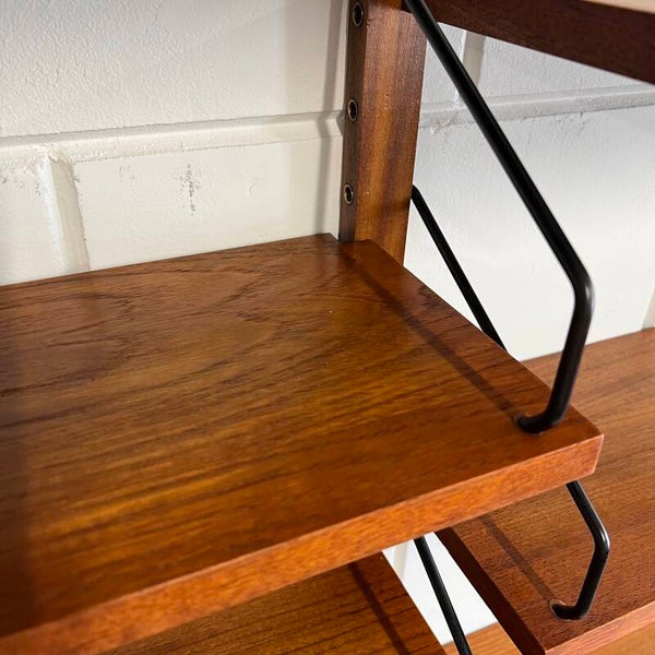 Uitgevoerd in teak (fineer) met houten wandlatten en zwart metalen beugels.