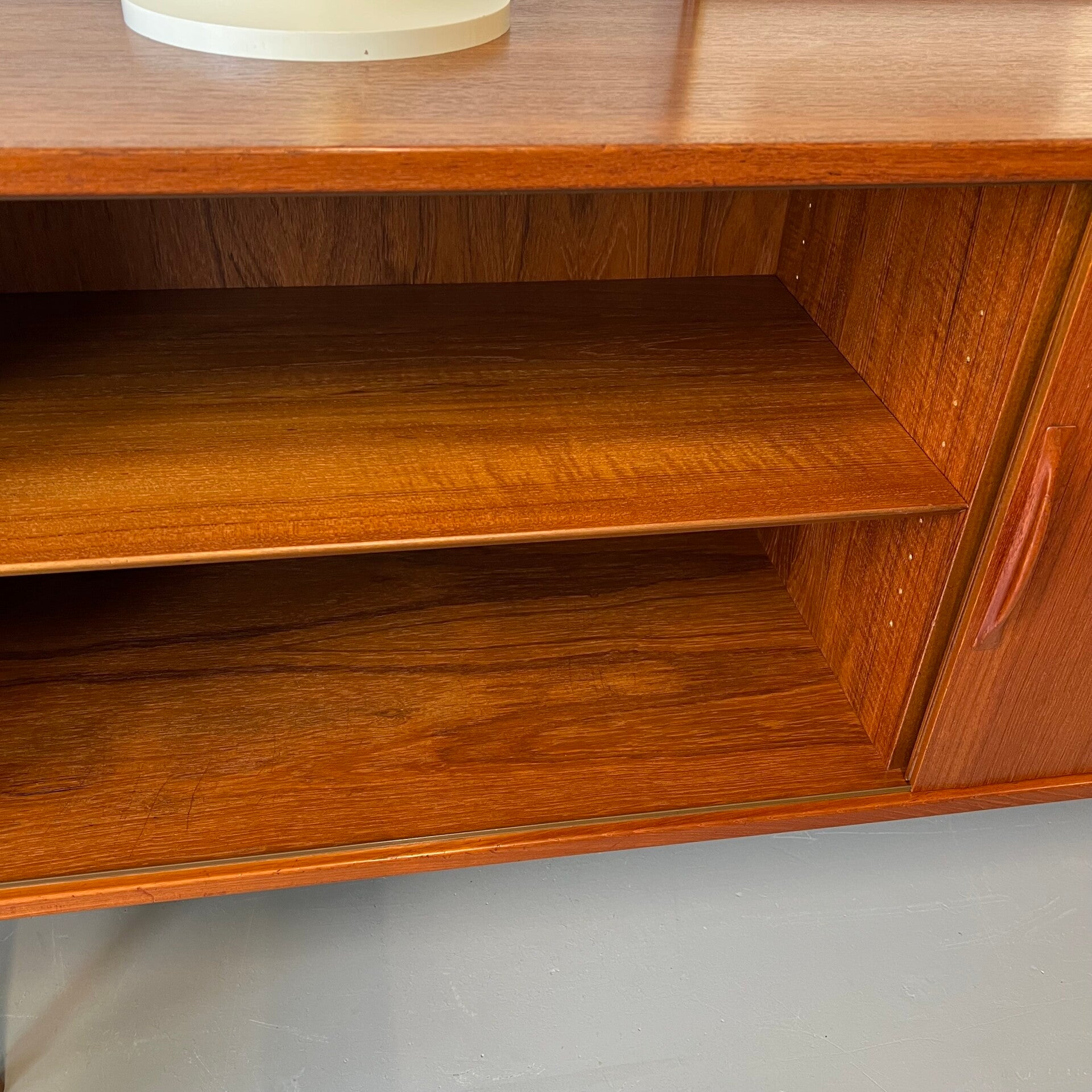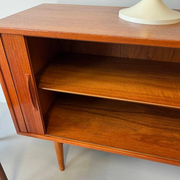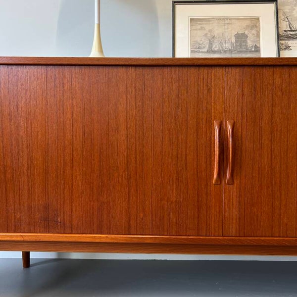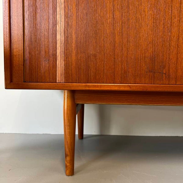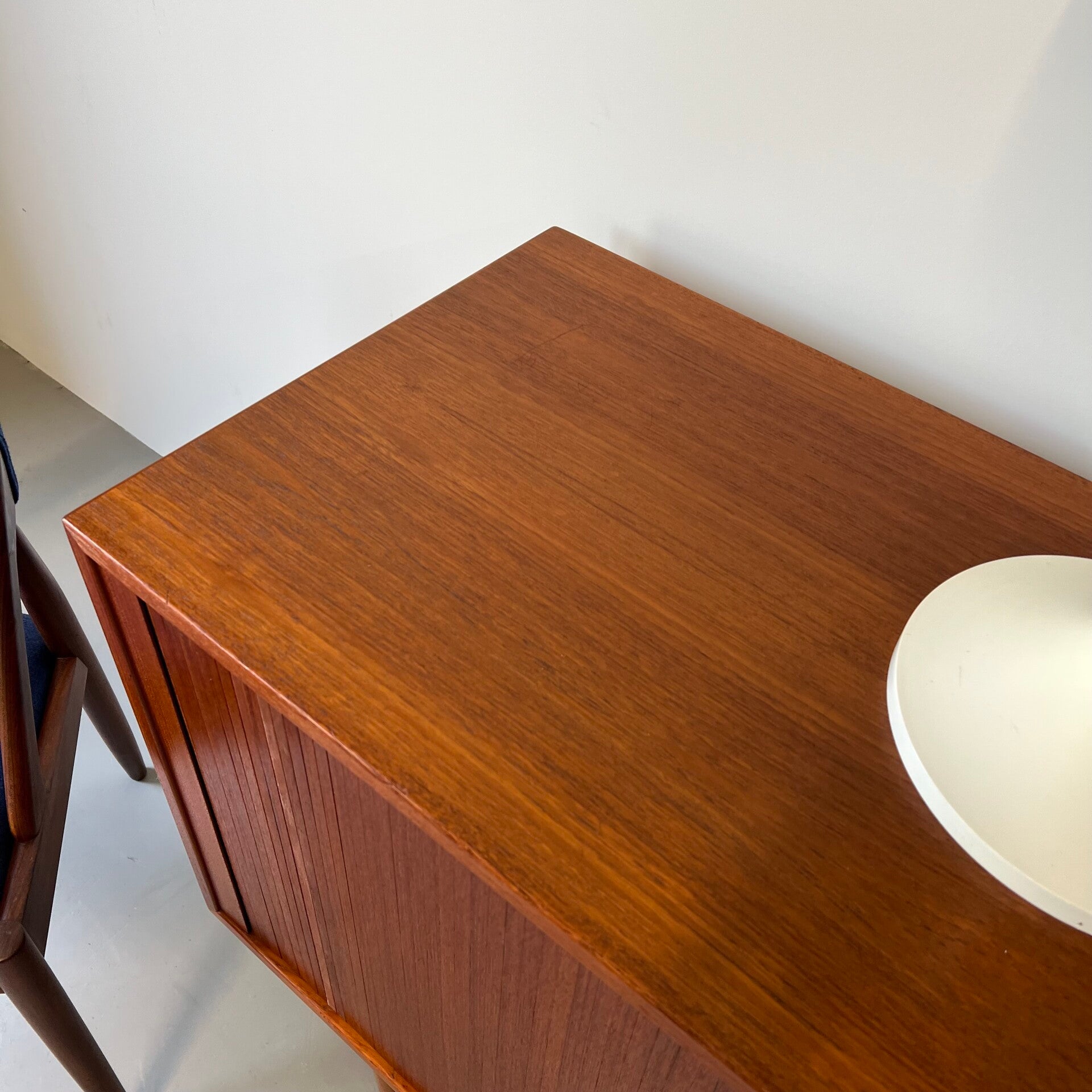 Het meubel is uitgevoerd in teak en heeft tambour roldeuren welke onzichtbaar wegschuiven naar de zijkanten van de kast.