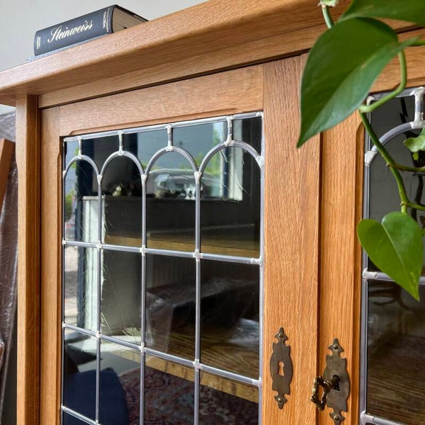 Het meubel heeft bovenin 2 paneeldeuren met slot (sleutel aanwezig). Glas in lood effect (1 ruitje zit barstje in).