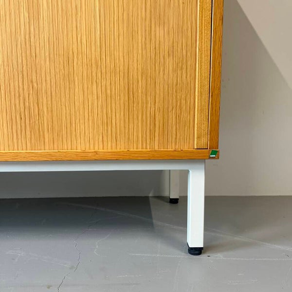 2 vintage roldeurkasten, kantoorkasten of opbergmeubels uitgevoerd in licht eiken met wit metalen stelpoten.