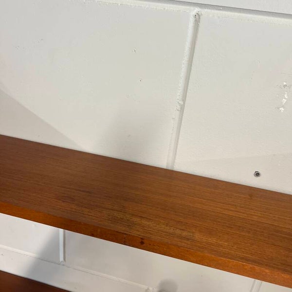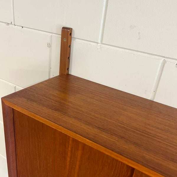 Uitgevoerd in teak (fineer) met houten wandlatten en zwart metalen beugels.