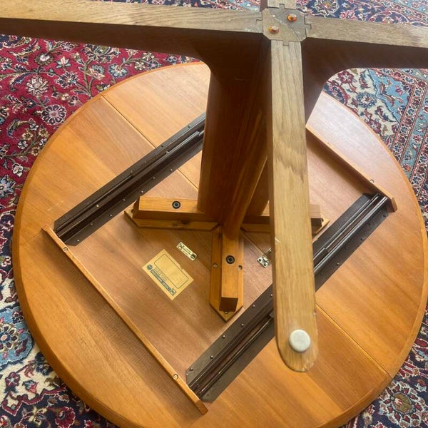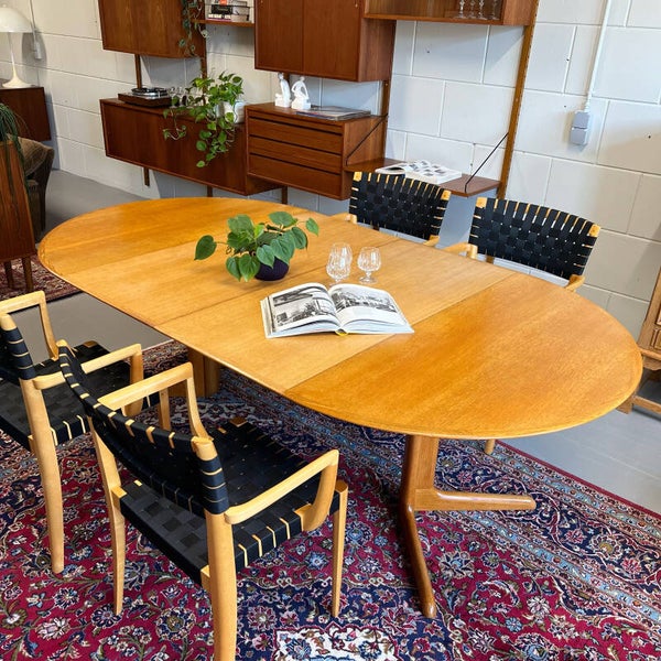 Eikenhouten Deense ronde eettafel, verlengbaar naar een lange ovaal met 2 losse verlengdelen.