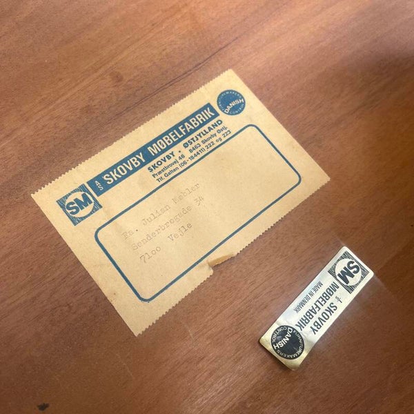 Geproduceerd door Skovby Møbelfabrik Denemarken in de jaren 60 (merkstickers aanwezig).