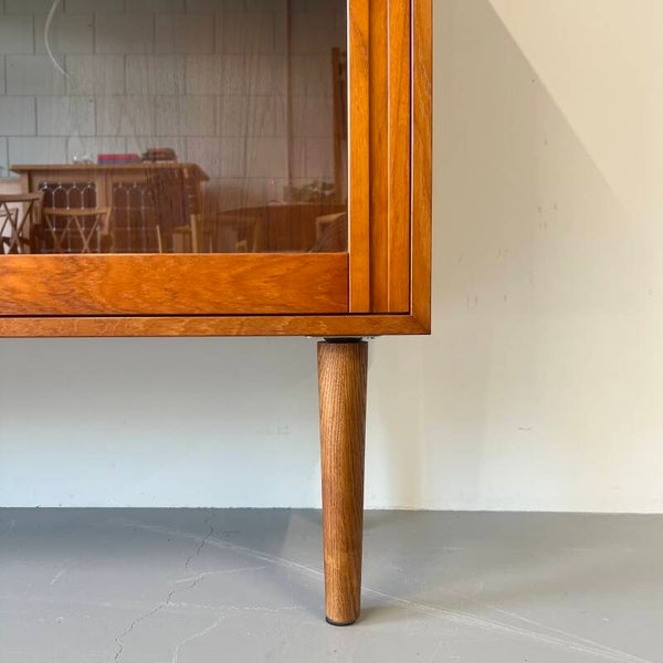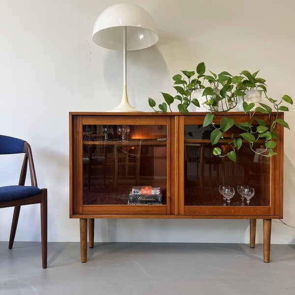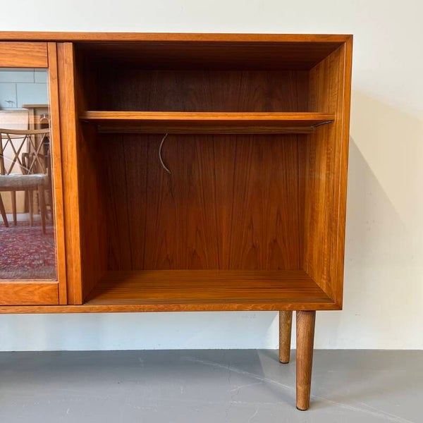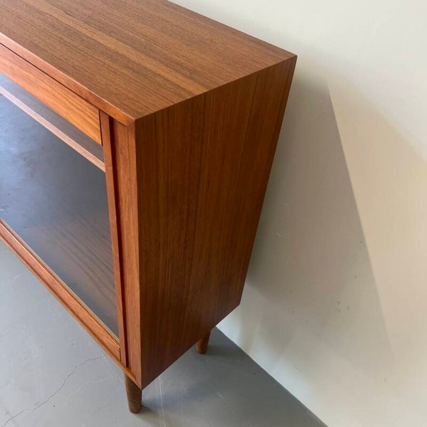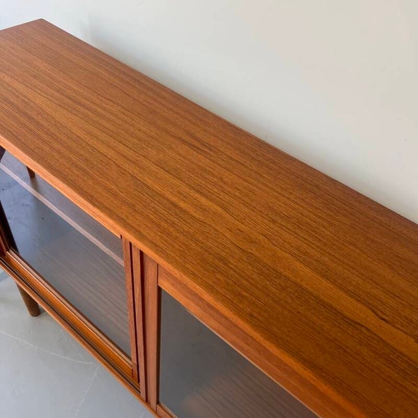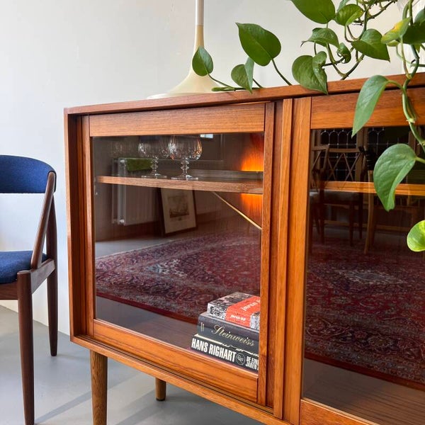 Mooie vintage vitrinekast, afkomstig uit Denemarken en uitgevoerd in teak (fineer).